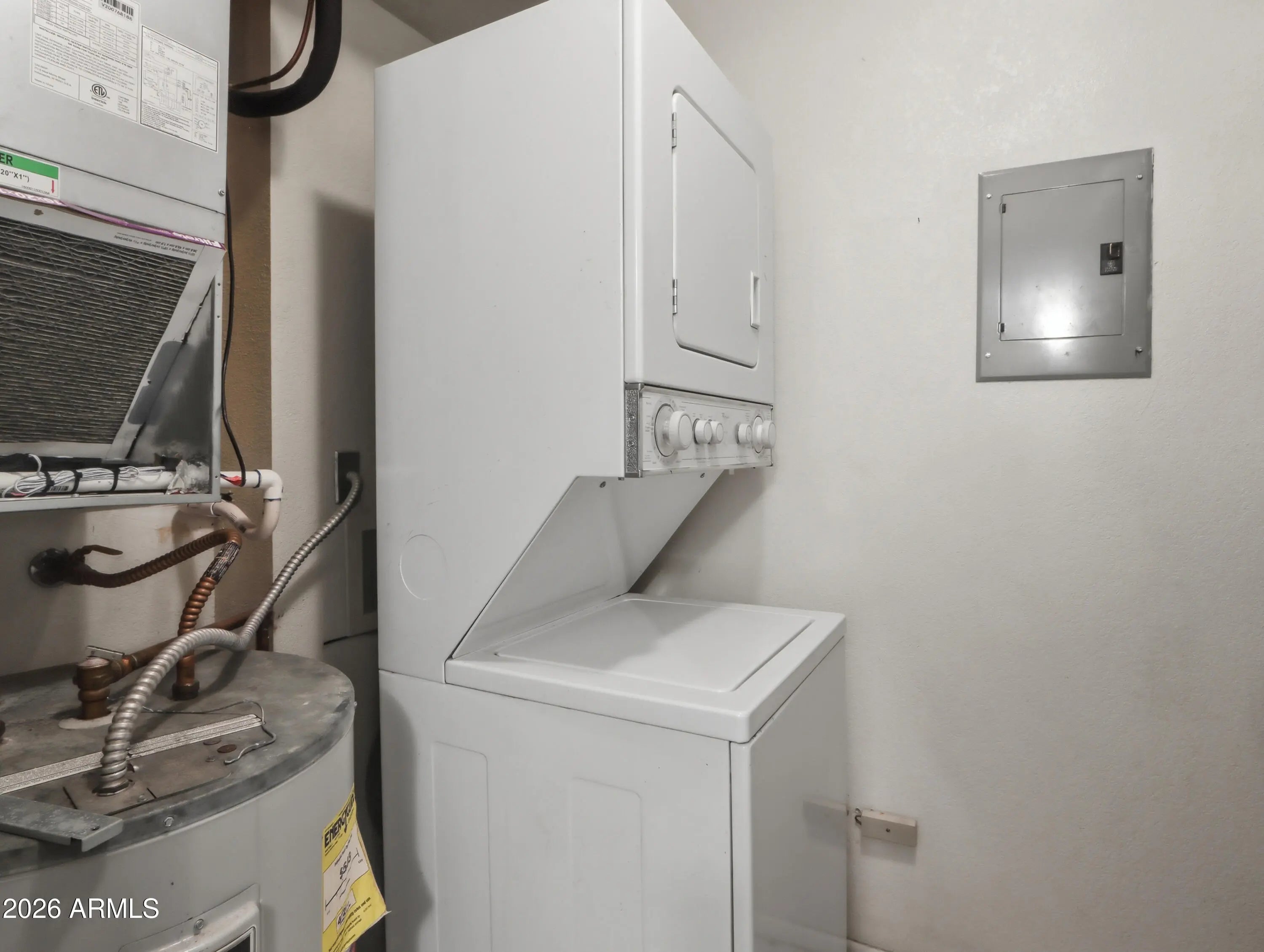 Stacked Washer/Dryer, Dryer, Washer, Refrigerator, Dishwasher, Disposal, Electric Range