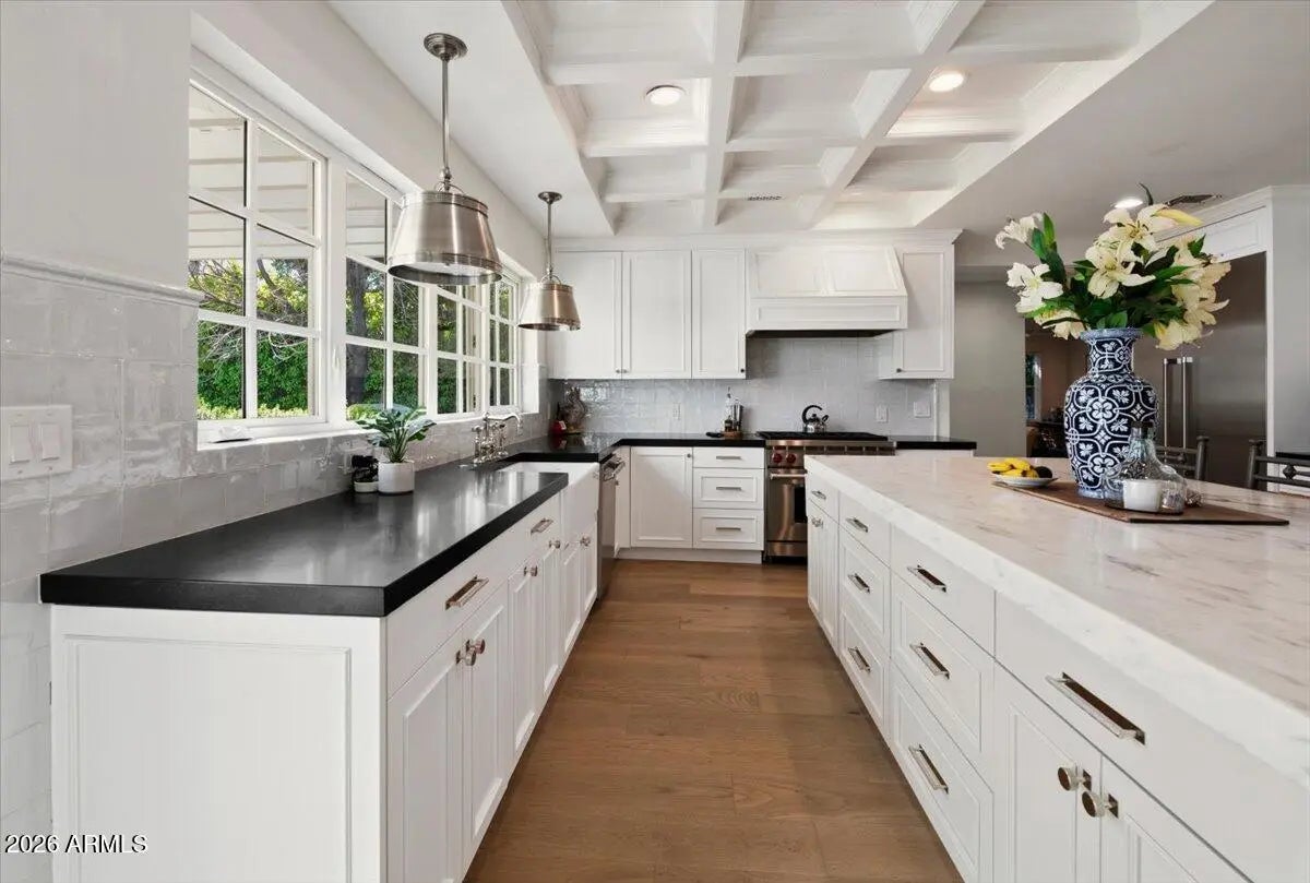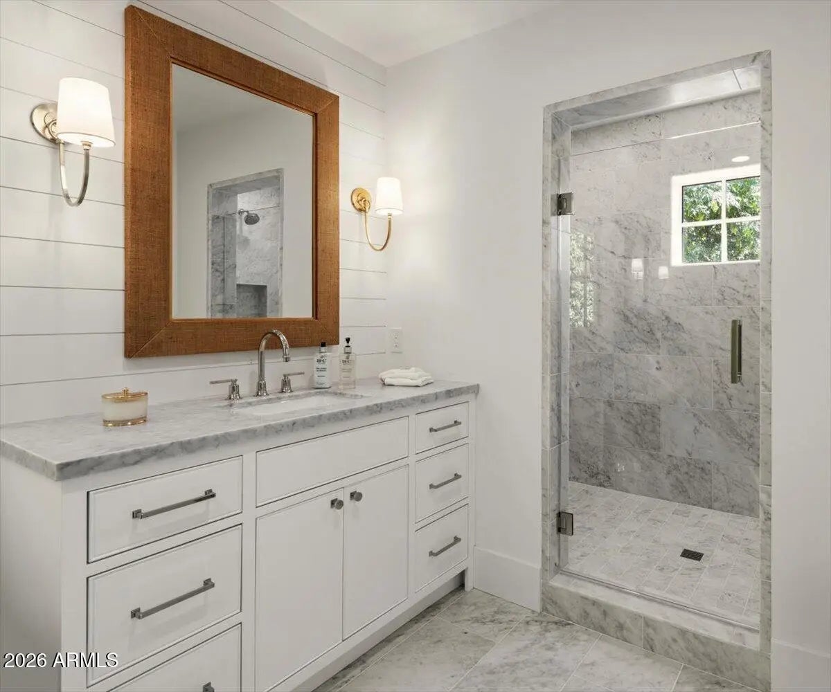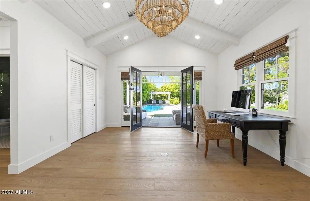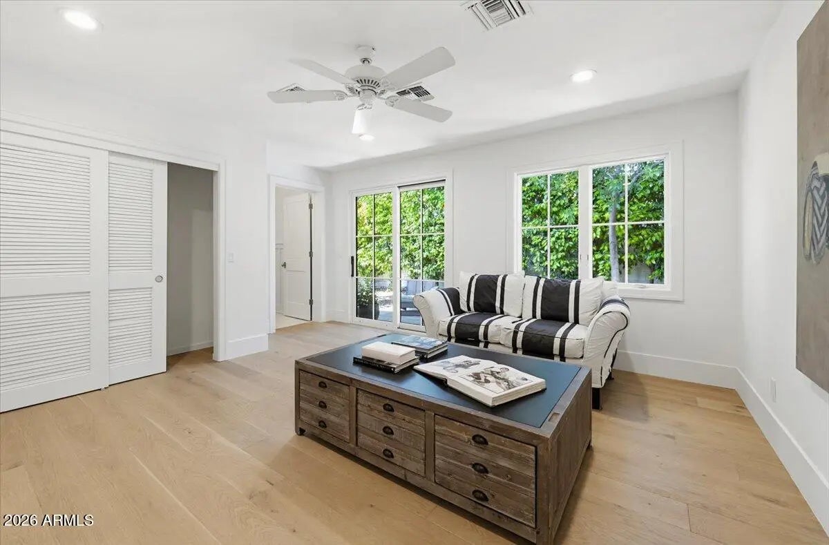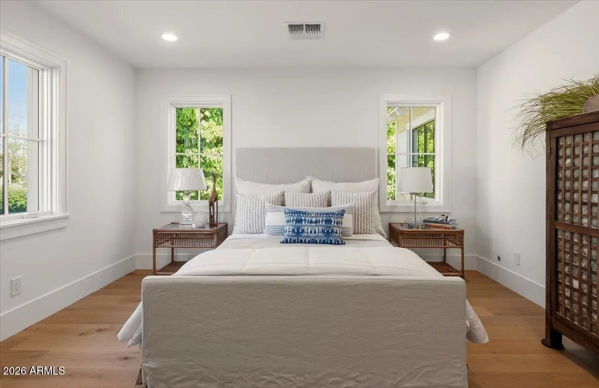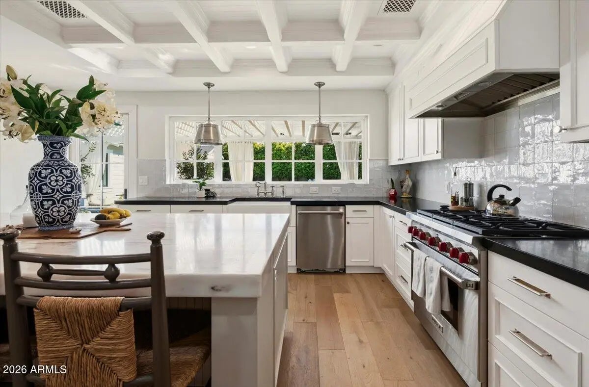 Welcome to 6141 E Calle Camelia--an exceptional Modern Coastal retreat perfectly positioned on a private half-acre lot with breathtaking Camelback Mountain views. Newly remodeled and completed in 2026, this thoughtfully designed estate blends timeless charm with elevated, resort-style living. The property features a 3,845 sq ft main residence plus a 590 sq ft guest house, offering a total of 6 bedrooms and 6.5 bathrooms, with all bedrooms ensuite--ideal for both family living and hosting guests with ease. From the moment you arrive, the home's incredible curb appeal and professionally landscaped grounds set the tone. Inside, vaulted ceilings and wide-plank wood flooring create a bright, airy ambiance, while expansive living spaces seamlessly connect indoors to out. At the heart of the home, the chef's kitchen is designed for both everyday living and entertaining, complete with a large island, abundant storage, and picturesque views overlooking the backyard oasis. The primary suite is a true retreat, featuring a spacious sitting area, direct access to the backyard, and an impressive custom closet. Step outside to experience the ultimate Arcadia lifestyle--an incredible backyard designed for gathering and relaxation. Enjoy the sparkling pool, built-in BBQ, outdoor dining areas, and a cozy outdoor fireplace, all surrounded by lush landscaping and plenty of space to roam. Additional features include an attached 2-car garage plus a detached 1-car garage, all located on a quiet, family-friendly street within the highly sought-after Hopi School District. This is more than a home--it's a lifestyle.