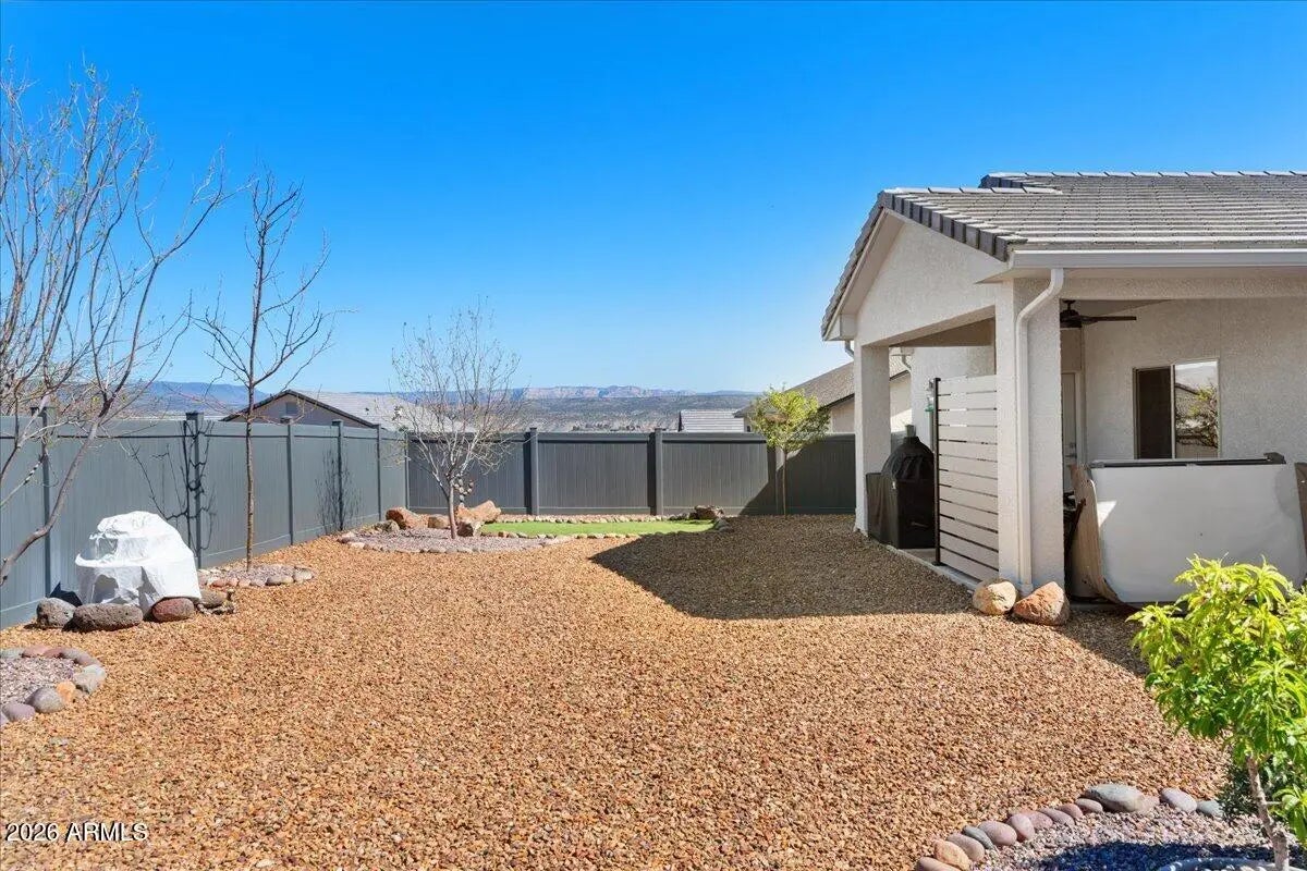 Elevated Desert Living with Panoramic Views and Exceptional Upgrades. Positioned to capture sweeping views of Sedona's iconic red rocks, Mingus Mountain, and Sycamore Canyon, this meticulously maintained residence offers a rare blend of refined design, energy efficiency, and pride of ownership. A private, view-fenced front porch welcomes you into a thoughtfully designed split floorplan, where natural light fills the home through expansive windows and transom accents. The interior showcases a cohesive, upscale aesthetic with clean lines, quality materials, and carefully curated finishes throughout. The kitchen serves as a true centerpiece--featuring solid knotty alder cabinetry with soft-close drawers, thick granite countertops and a custom tile backsplash. All new, premium Bosch stainless steel Kitchen appliance package. Functional enhancements such as staggered cabinetry, multiple Lazy Susans, and a deep basin sink with upgraded fixture provide both beauty and efficiency. The primary suite offers a relaxing retreat, highlighted by a spacious walk-in shower with penny tile flooring and a waterfall showerhead. Both bathrooms are appointed with executive-height vanities, custom wood-wrapped mirrors, upgraded plumbing fixtures, and additional storage. Throughout the home, attention to detail is evident in the luxury vinyl plank flooring, two-tone paint, paneled interior doors, whole-house shutters, and thoughtfully placed lighting. Distinctive design elements--including a frosted glass barn door and custom floating shelves--add character while maintaining a clean, modern feel. Built with quality 2x6 construction, the home is designed for long-term efficiency and performance. Features include a 3.48 kW owned solar system, HERS rating of 14 means super Low Utility Bills. (The Water Bill is Higher than the Electric!) EPA Indoor airPLUS certification, tankless gas water heater, and comprehensive water systems including a Nuvo softener, reverse osmosis, and whole-house filtration. Additional highlights include a Wirsbo plumbing system and built-in fire sprinkler system. Outdoor living is equally impressive. The expansive backyard offers mature shade trees, lush turf, and ample space to relax or entertain--all set against a backdrop of panoramic views. A gas stub for grilling and prewiring for a hot tub enhance the space's versatility. A rare opportunity to own a move-in ready home that seamlessly combines quality construction, elevated finishes, and unforgettable views.