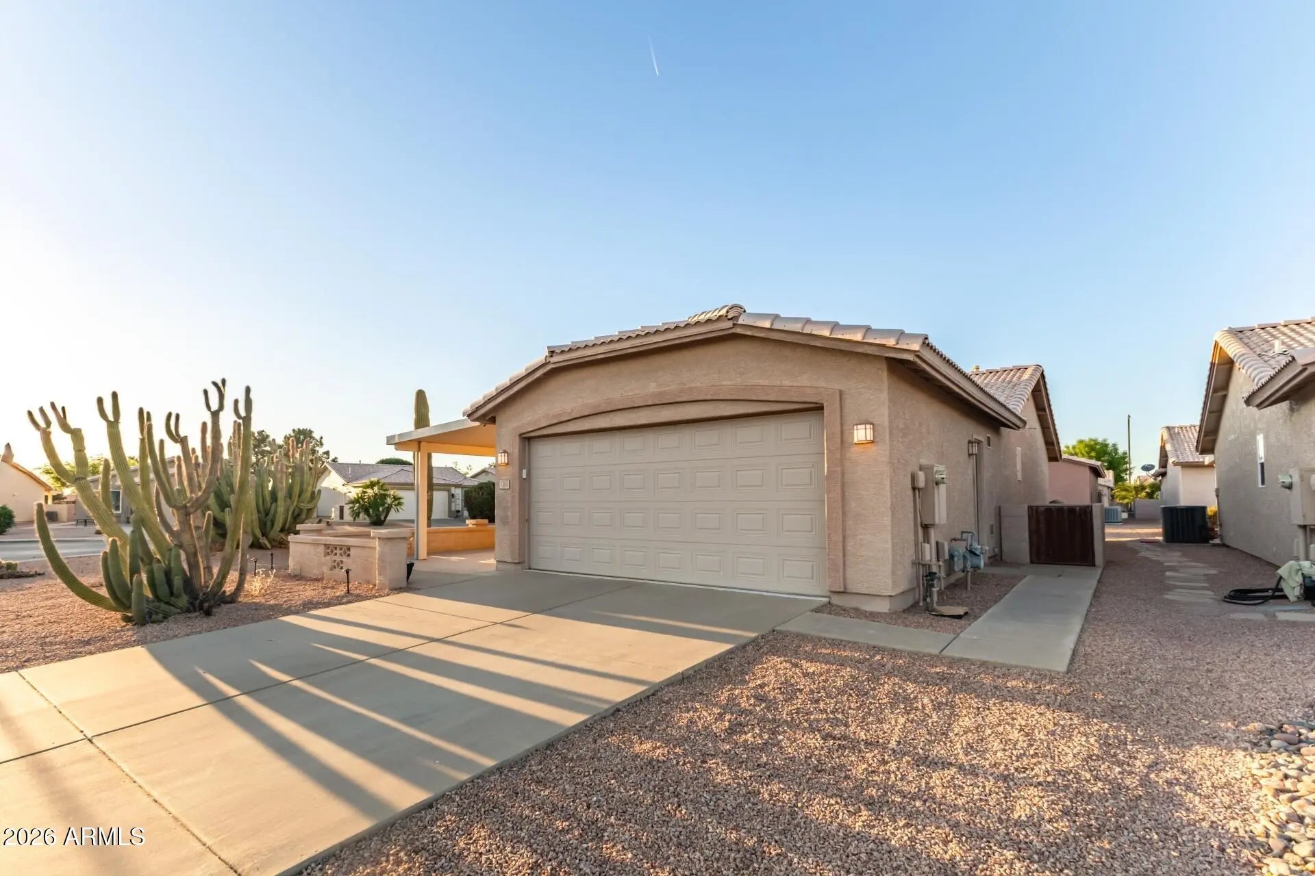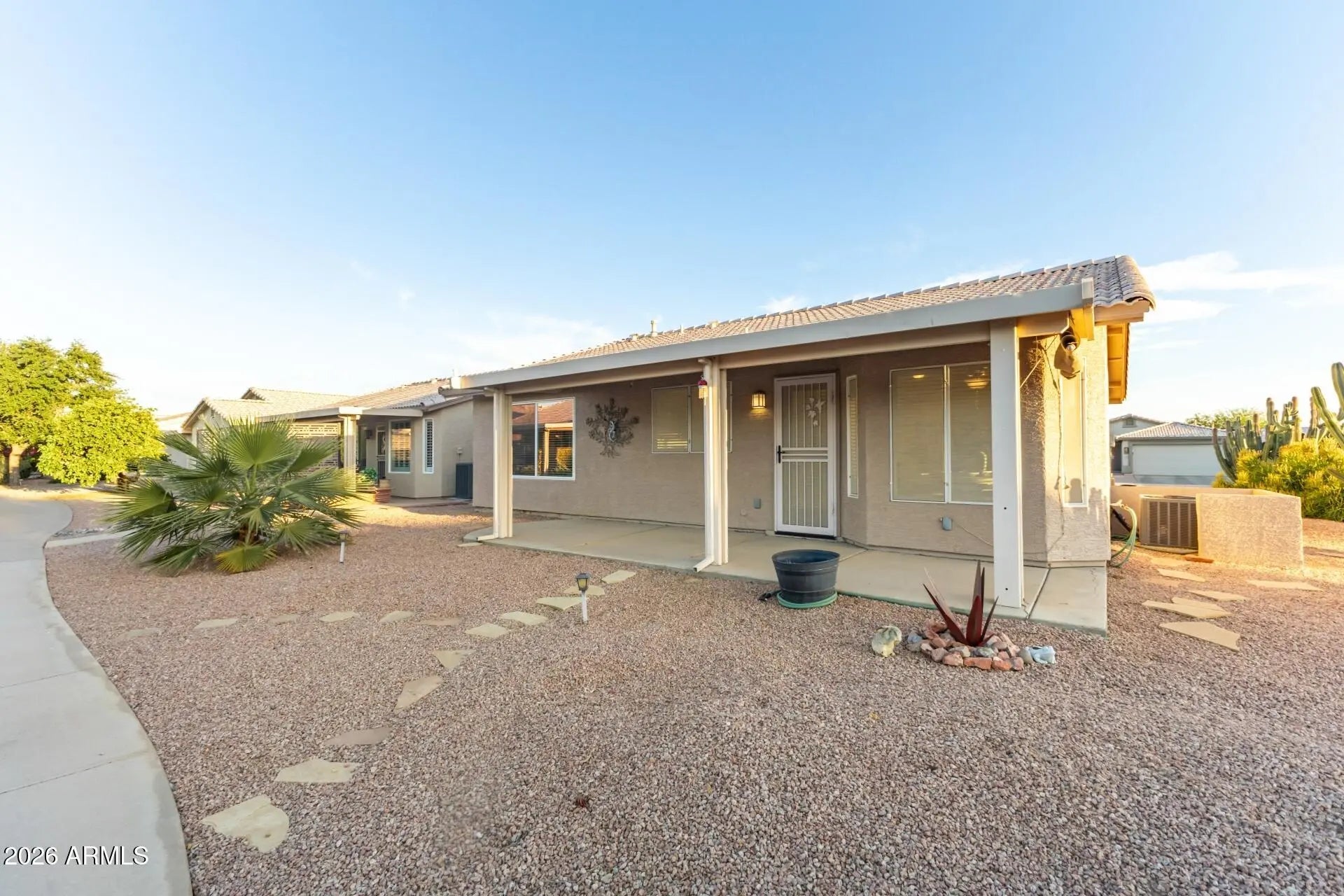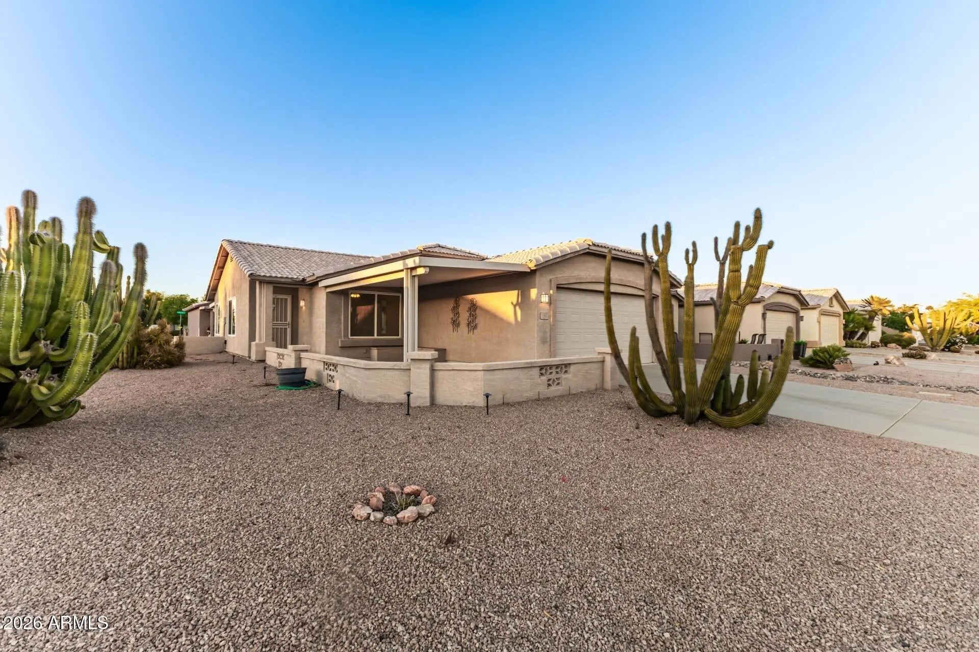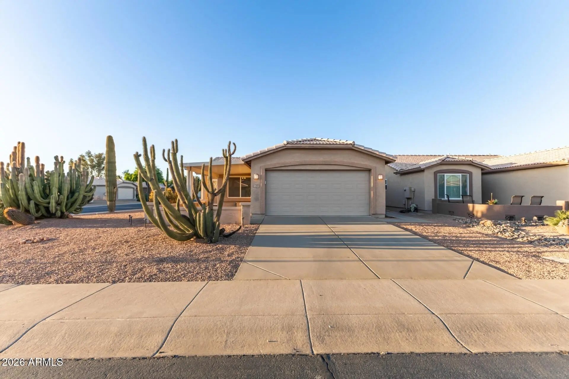Don't miss this beautiful home in the sought-after gated golf course 55 plus community of Springfield! Perfectly situated on a desirable corner lot, this property features a spacious front patio--perfect for enjoying Arizona's stunning sunsets--along with a covered back patio ideal for relaxing or entertaining year-round. Step inside to discover great curb appeal complemented by a 2-car garage and mature desert landscaping. The inviting interior features a bright living and dining area with vaulted ceilings, tile flooring throughout, and fresh neutral interior paint ready for your personal decor. The kitchen is well laid out with ample cabinet space, a pantry, and convenient access to the backyard, offering great functionality and an opportunity for future updates to make it your own. Residents of Springfield enjoy a guard-gated golf course community with beautifully maintained grounds, walking paths, clubhouse, fitness center, heated pool and spa, and a full calendar of social activities. Homes in Springfield don't last--schedule your private showing today and come see the potential and charm this home has to offer!