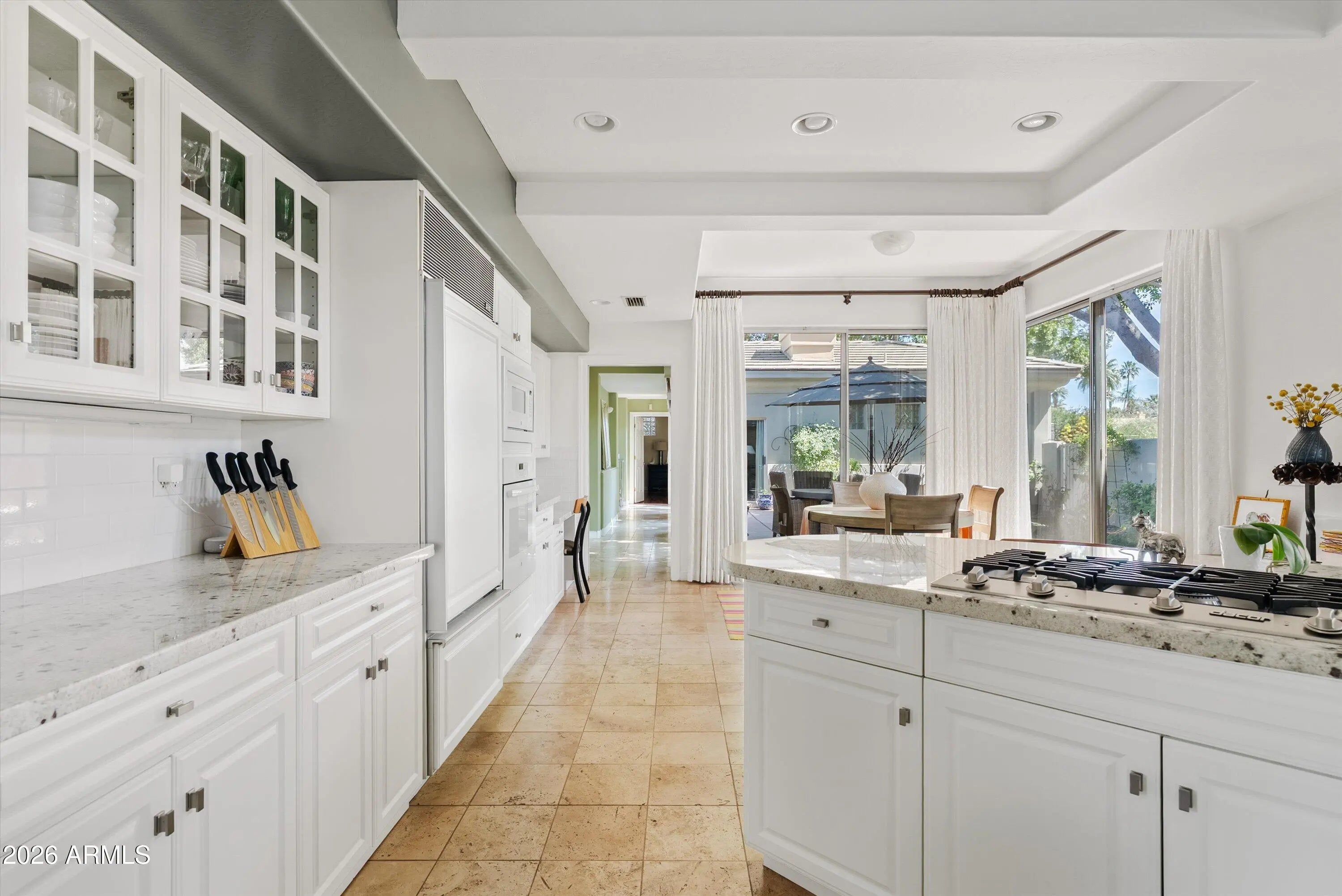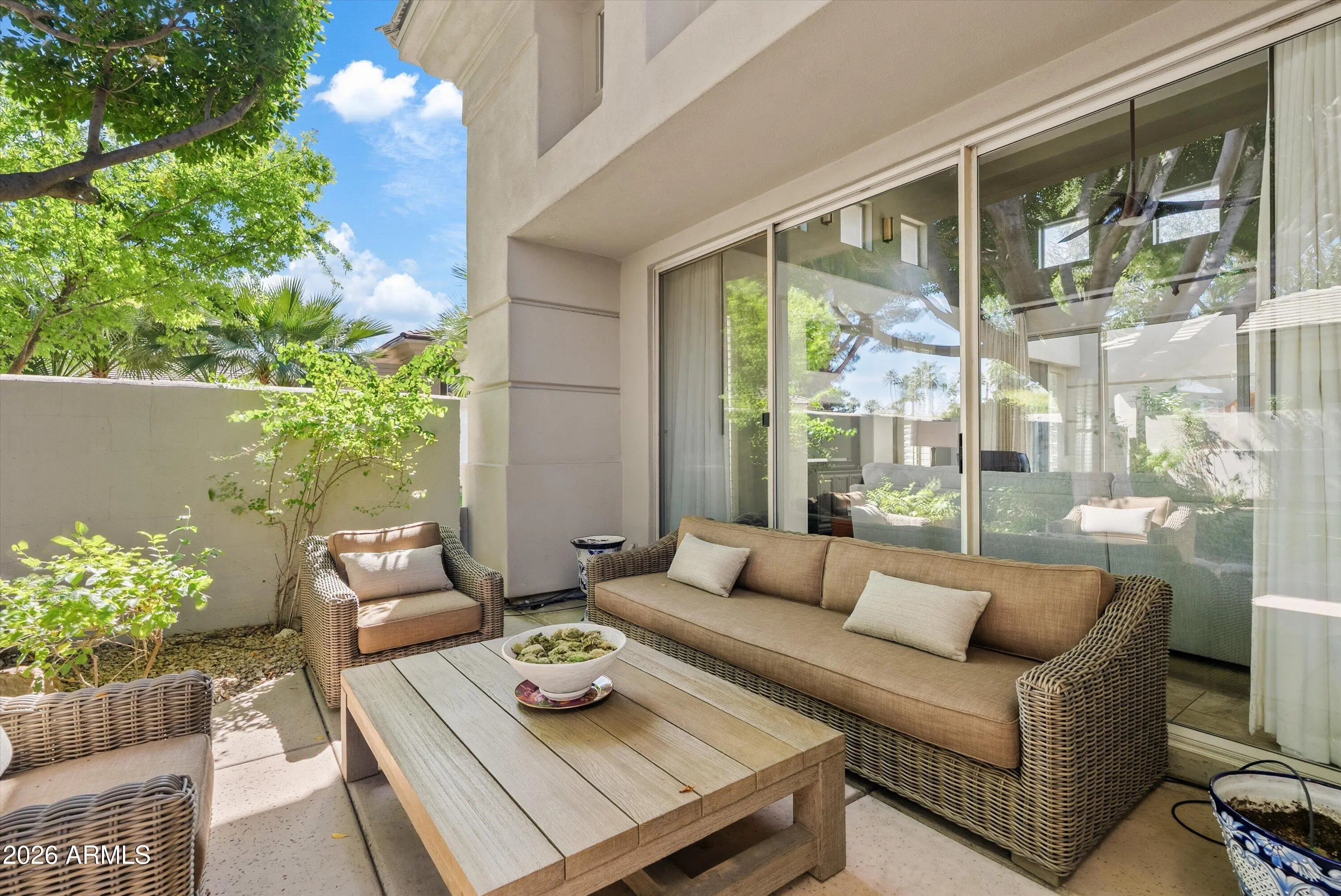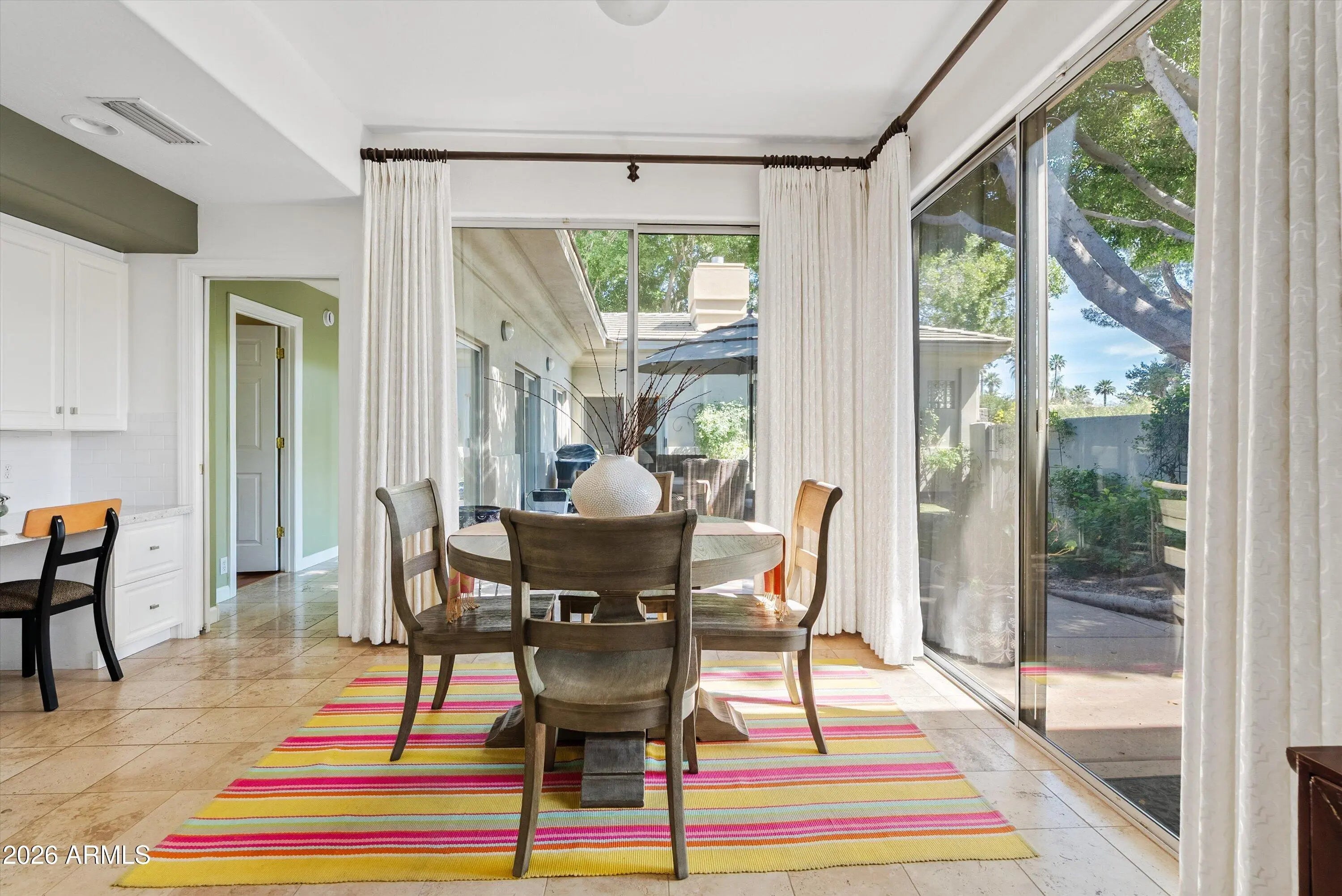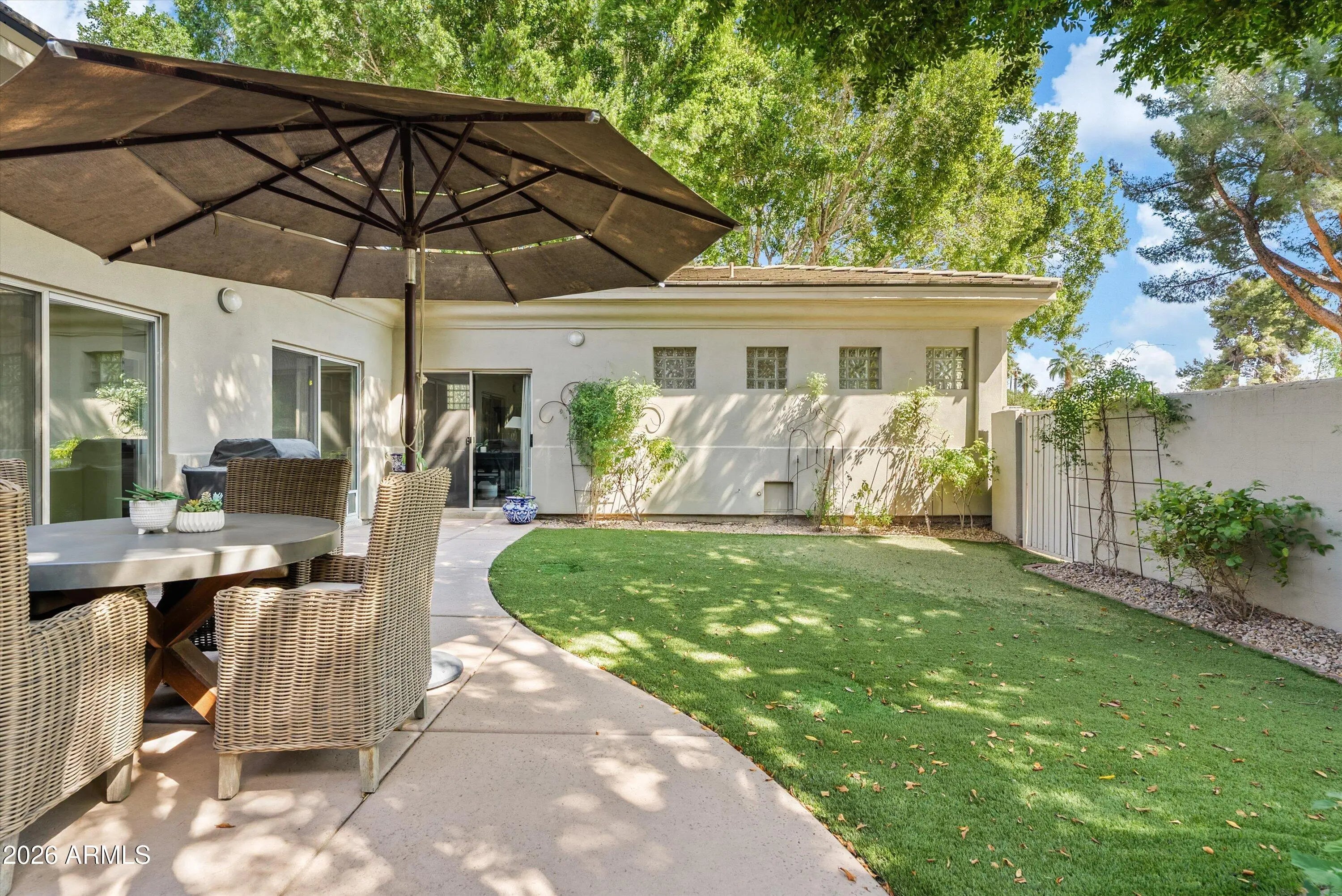Beautifully designed custom 4 bed + loft | 4 bath North Central residence ideally located just steps from the iconic Murphy Bridle Path. This elegant home showcases timeless finishes and thoughtful detail throughout, including stunning travertine marble flooring in the entry, kitchen, dining area, laundry room, and bathrooms, along with matching travertine bathroom countertops. The spacious living room is centered around a striking gas fireplace, creating a warm and inviting atmosphere, while high-end custom drapery, plantation shutters, and vaulted ceilings enhance the home's bright and open feel. The gourmet kitchen is a chef's dream, featuring granite countertops, a gas range, Sub-Zero refrigerator, tall white cabinetry, a built-in desk, and a charming breakfast nook. This residence offers exceptional indoor-outdoor living with multiple inviting spaces, including a private courtyard with a serene fountain, as well as additional fountains at the front entry, front patio, and back patio--adding to the home's tranquil ambiance. Lush common area grass borders the property, creating a peaceful and picturesque setting, all while situated on a secluded street. A truly distinctive property offering character, comfort, and an unbeatable North Central location near the Bridle Path and some of Phoenix's most beloved local hot spots.