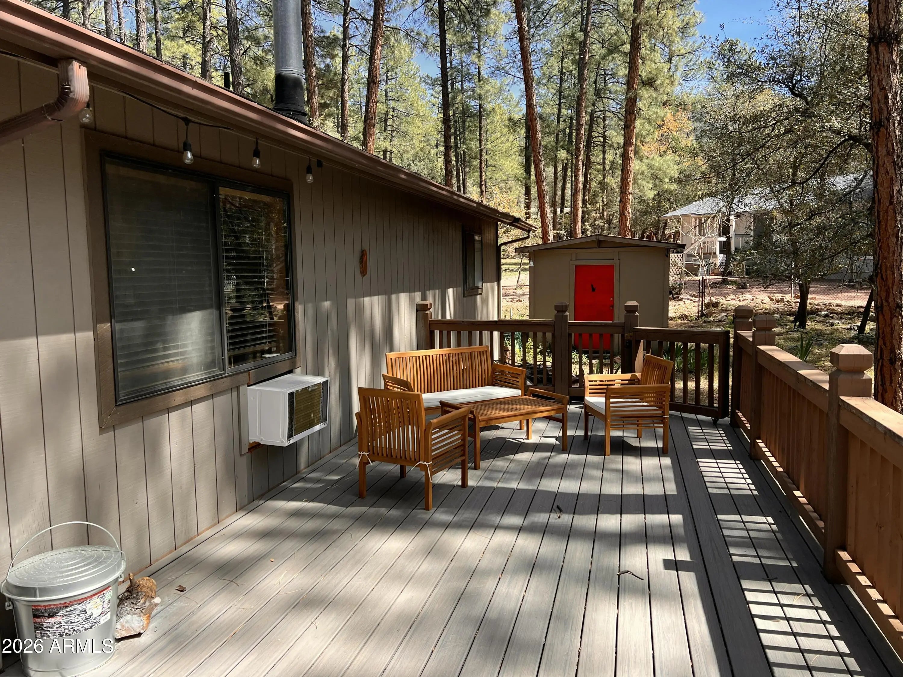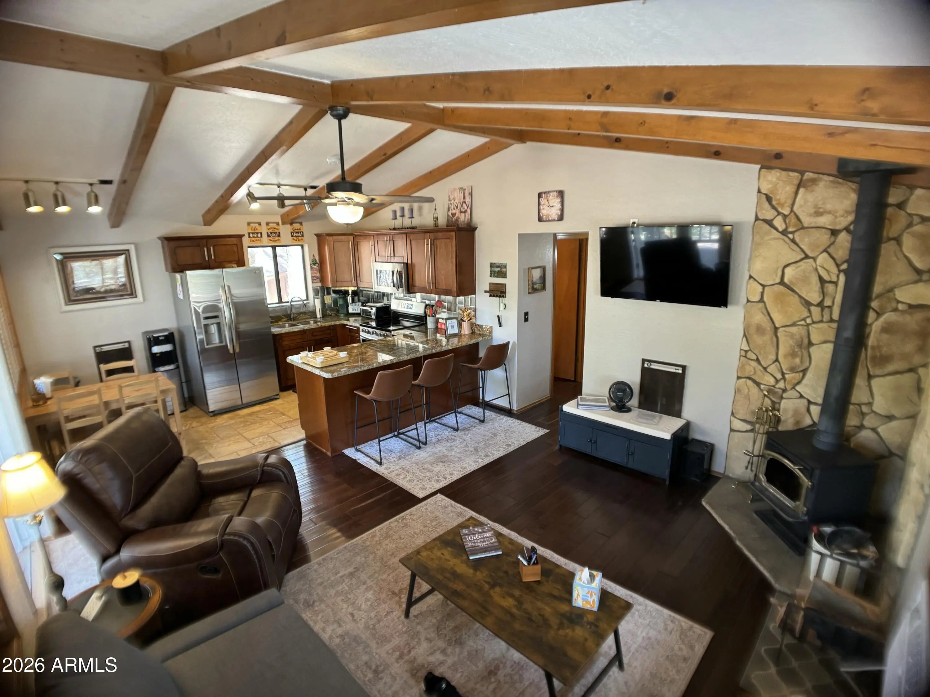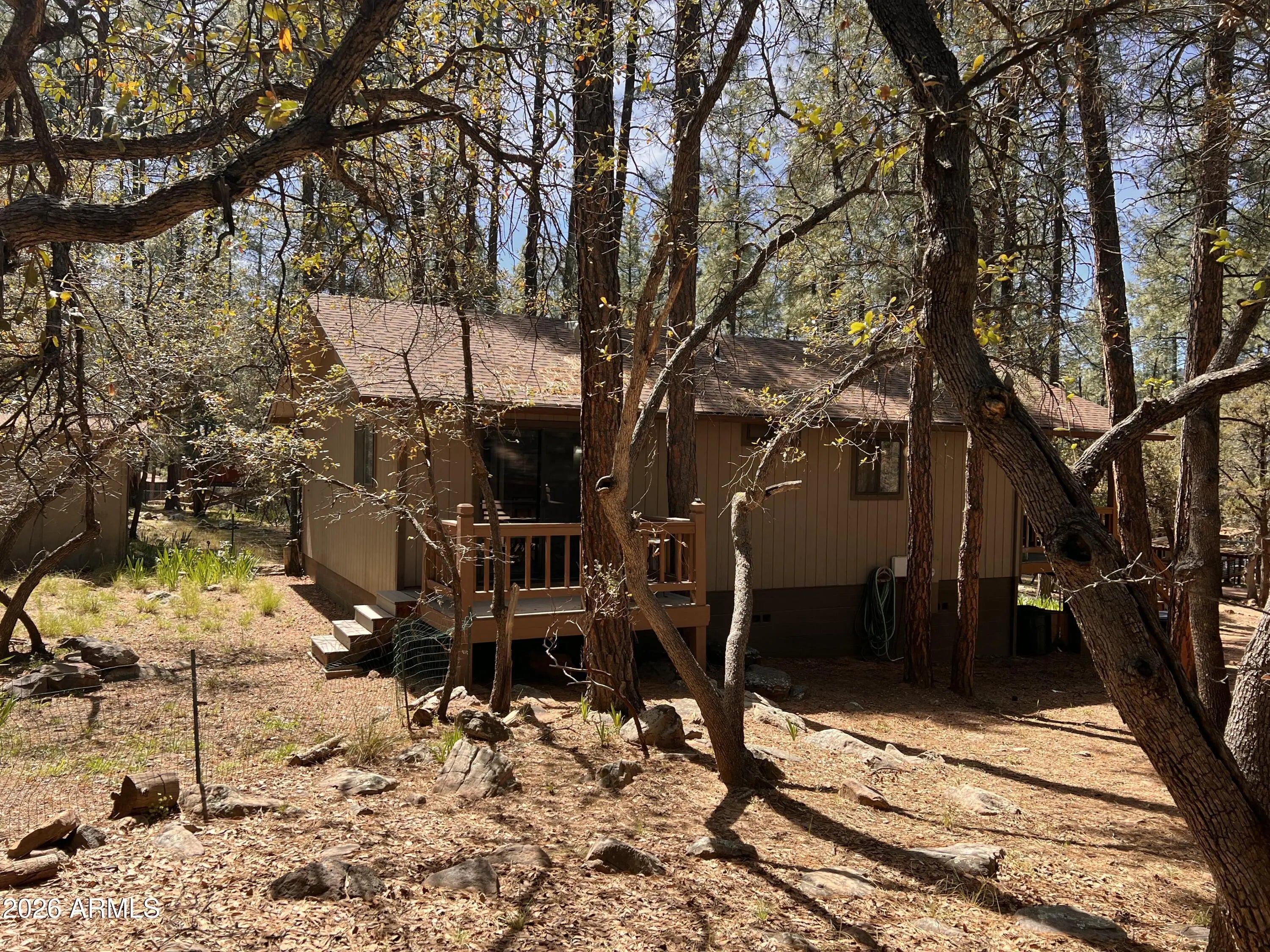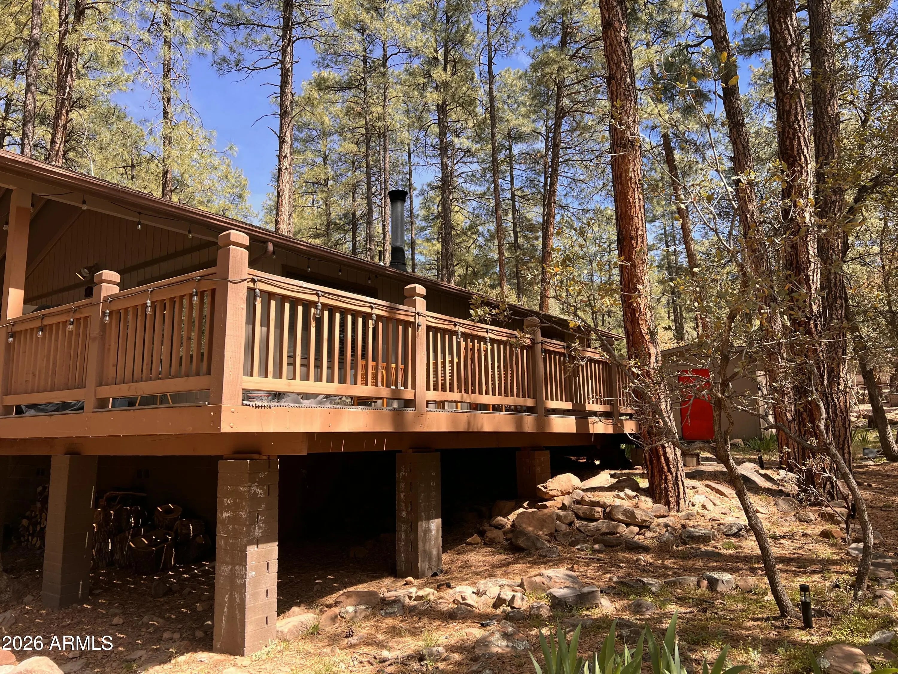 Set in the quiet beauty of Pine, this 2-bedroom cabin offers the perfect mix of cozy mountain character and thoughtful updates. Step inside to a warm and welcoming living space highlighted by dramatic vaulted ceilings, striking exposed beams, and a wood-burning stove surrounded by natural stone--ideal for relaxing after a day in the fresh mountain air. Wood-look engineered flooring runs throughout, adding both durability and style. The kitchen has been tastefully refreshed with granite countertops, stainless steel appliances, and plenty of space to cook, gather, and entertain. Outside, enjoy peaceful mornings and cool evenings on the covered front porch or the large wrap-around side deck, all surrounded by towering pines and scenic mountain views. Nature is right at your doorstep, with... frequent visits from elk, deer, and other local wildlife. There's also a spacious garage/shed for your gear and toys, plus an additional storage shed for convenience. Even better--most furnishings are included, making this an easy, turnkey escape to the mountains.