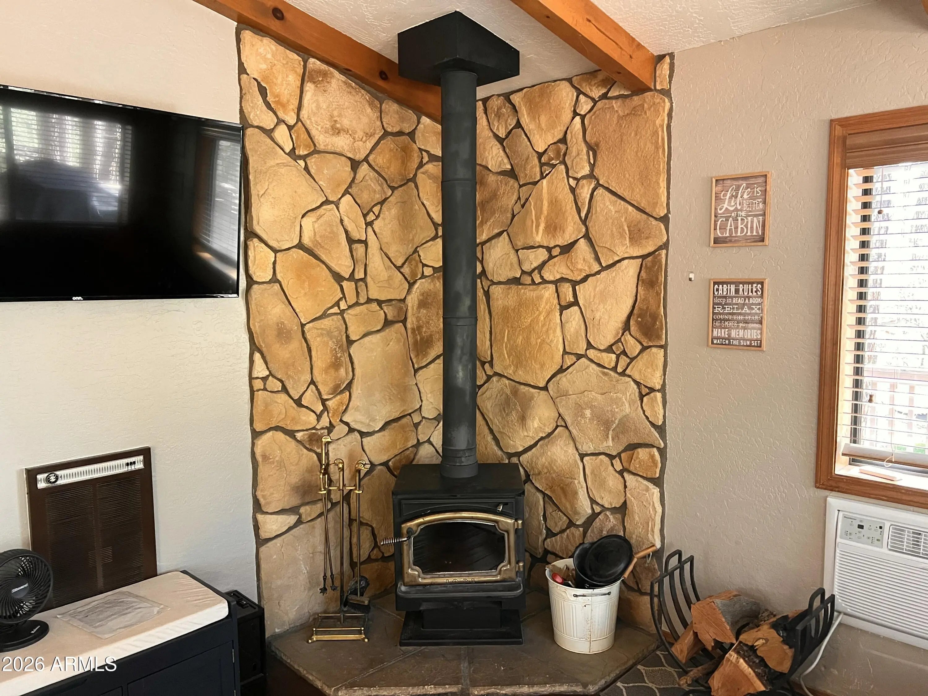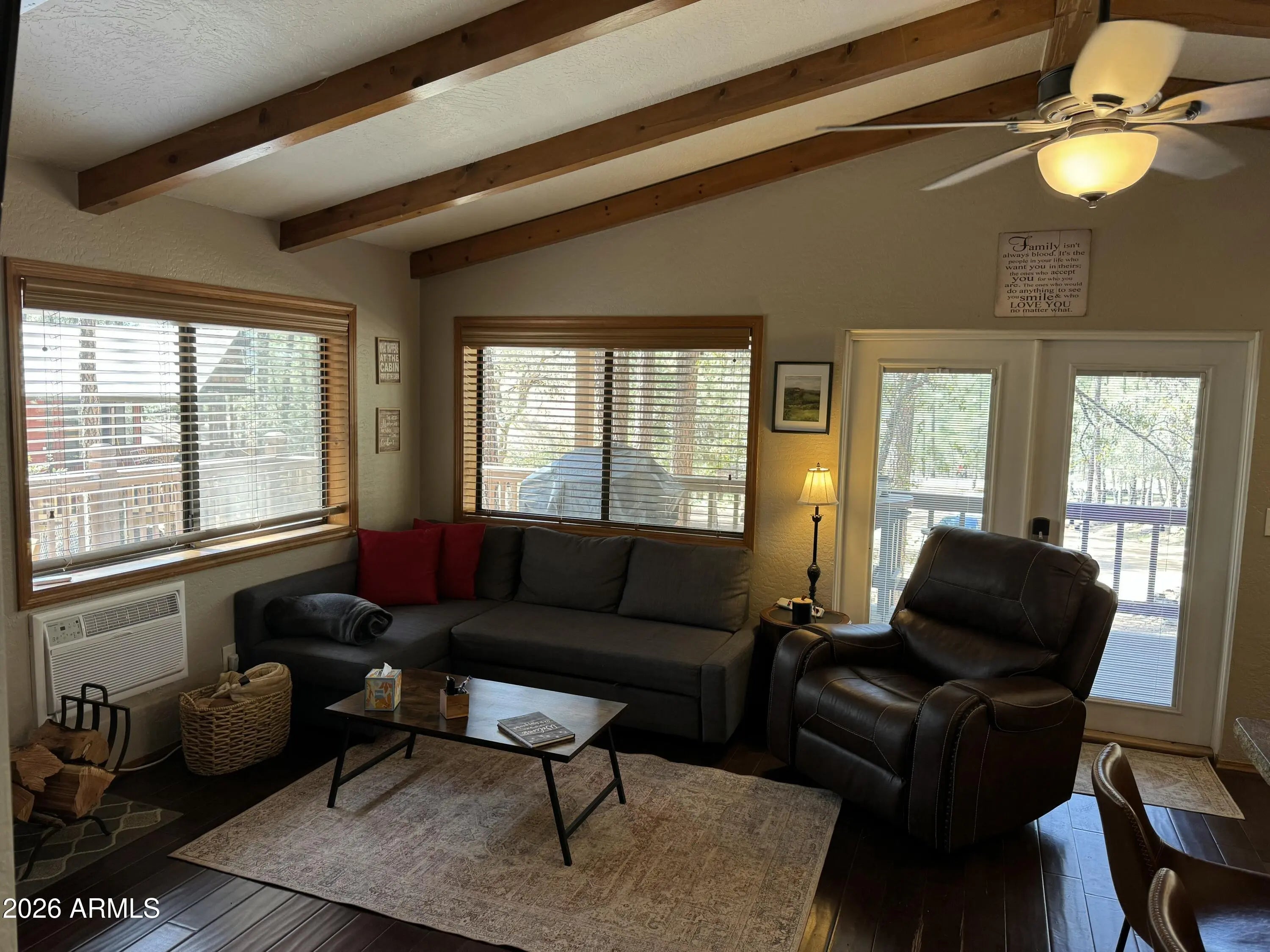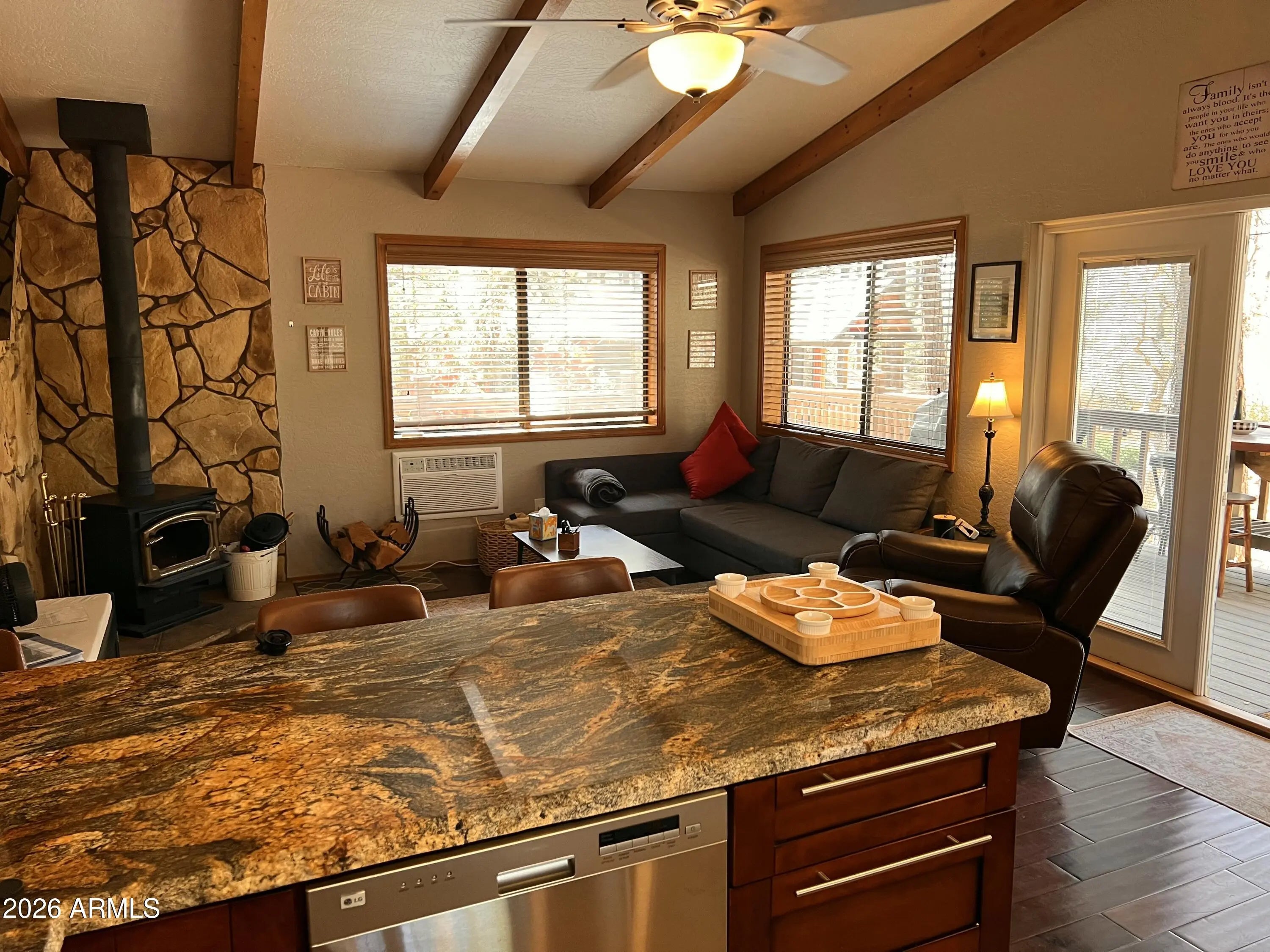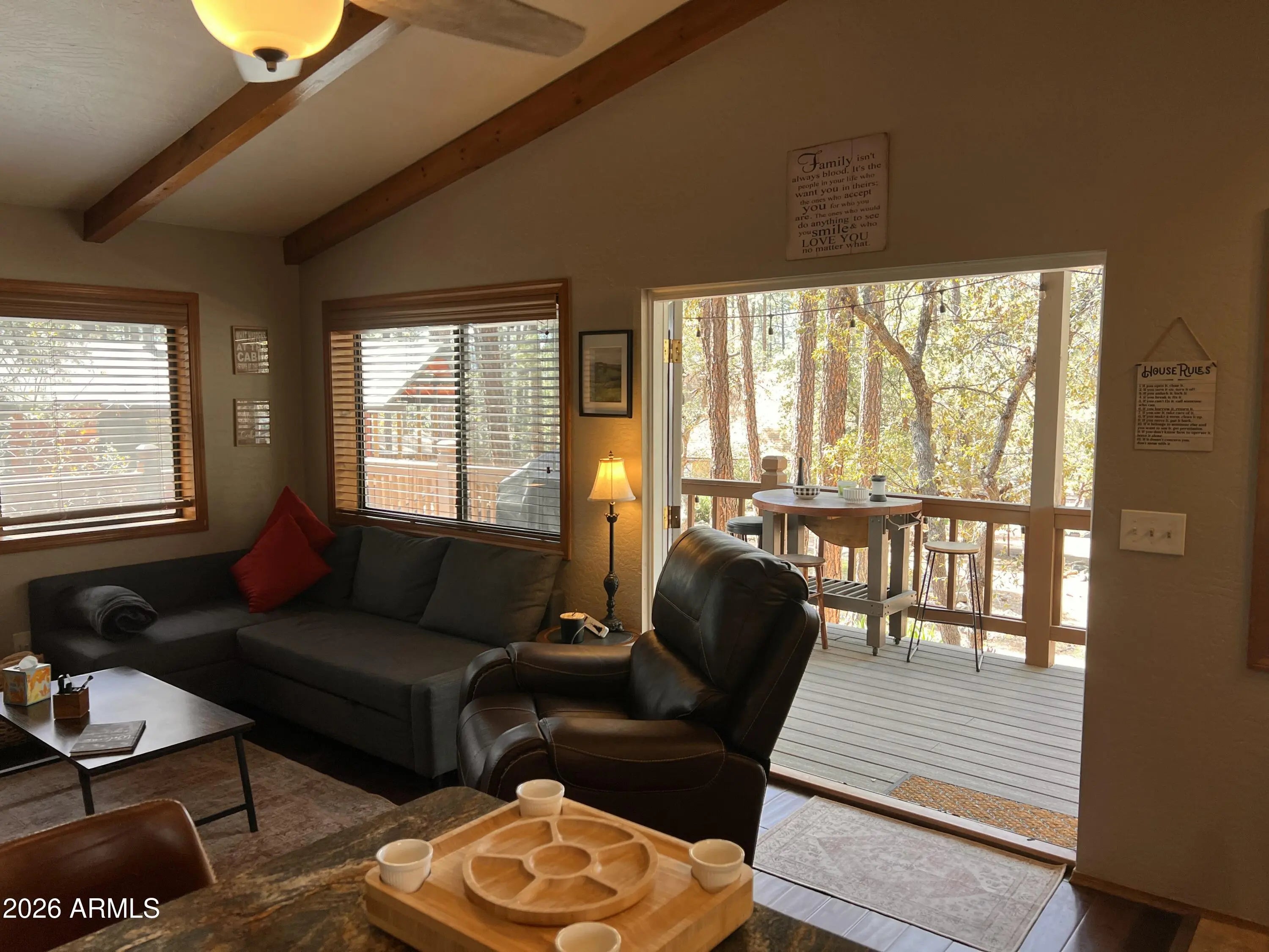 Set in the quiet beauty of Pine, this 2-bedroom cabin offers the perfect mix of cozy mountain character and thoughtful updates. Step inside to a warm and welcoming living space highlighted by dramatic vaulted ceilings, striking exposed beams, and a wood-burning stove surrounded by natural stone--ideal for relaxing after a day in the fresh mountain air. Wood-look engineered flooring runs throughout, adding both durability and style. The kitchen has been tastefully refreshed with granite countertops, stainless steel appliances, and plenty of space to cook, gather, and entertain. Outside, enjoy peaceful mornings and cool evenings on the covered front porch or the large wrap-around side deck, all surrounded by towering pines and scenic mountain views. Nature is right at your doorstep, with... frequent visits from elk, deer, and other local wildlife. There's also a spacious garage/shed for your gear and toys, plus an additional storage shed for convenience. Even better--most furnishings are included, making this an easy, turnkey escape to the mountains.