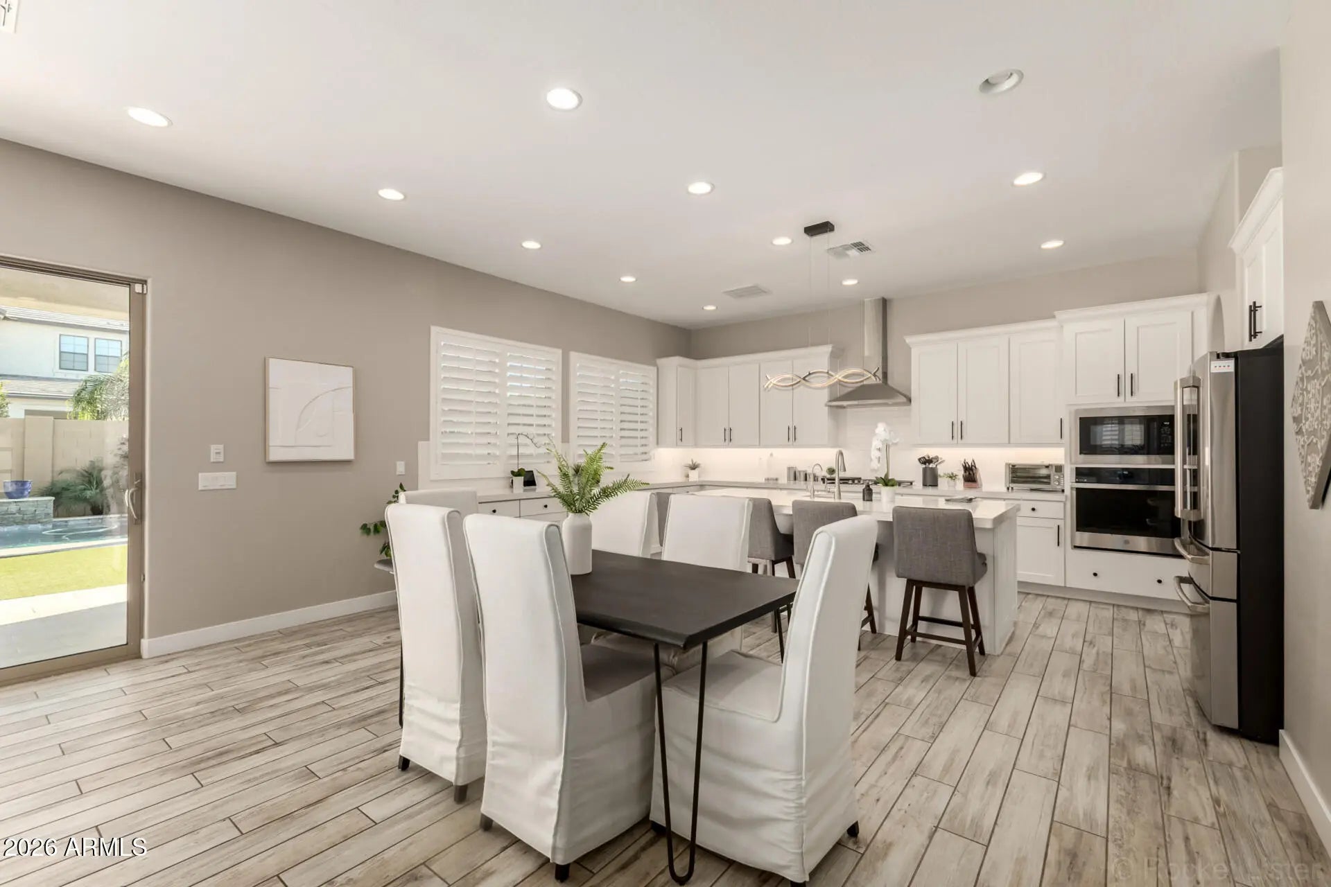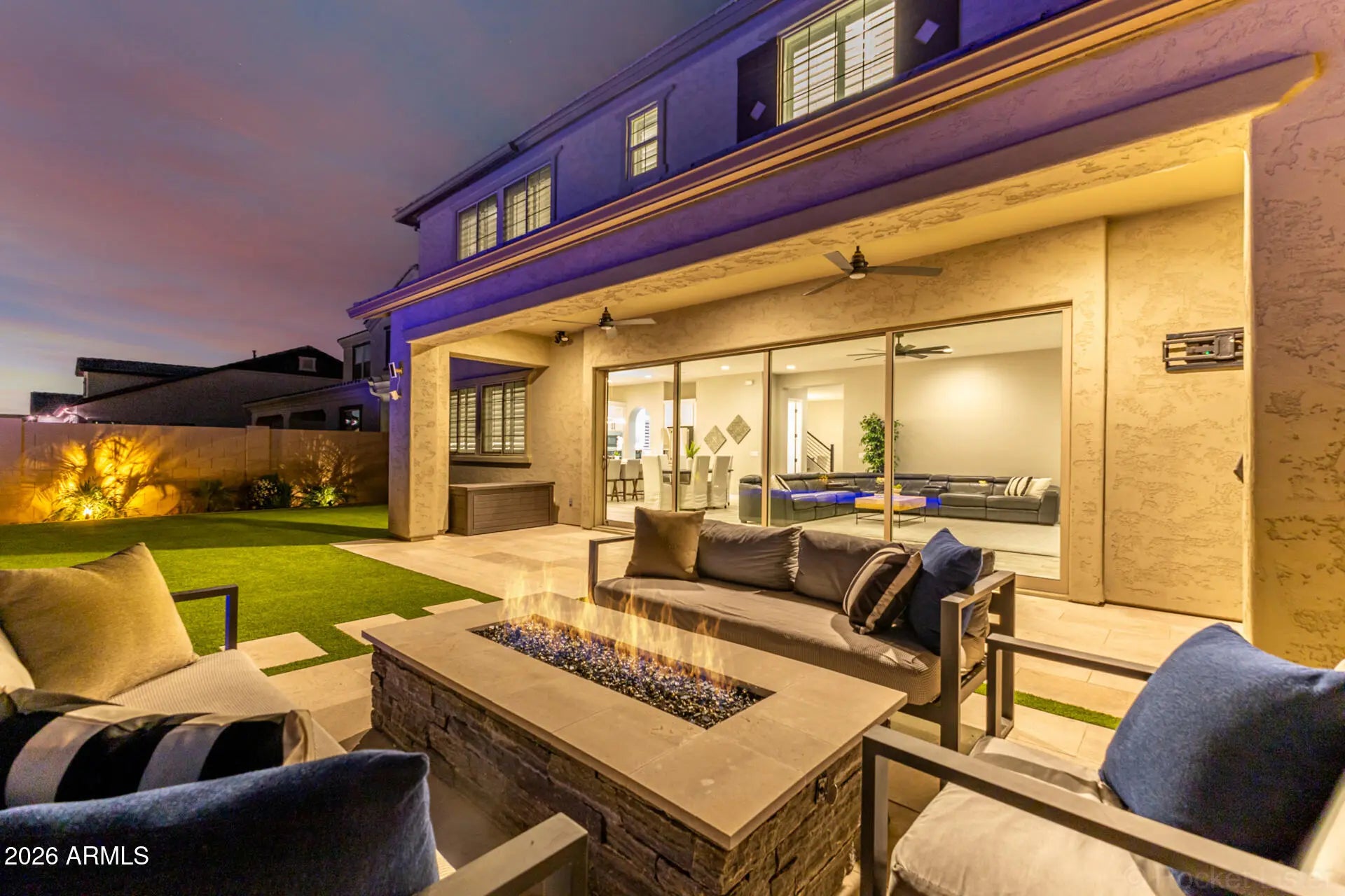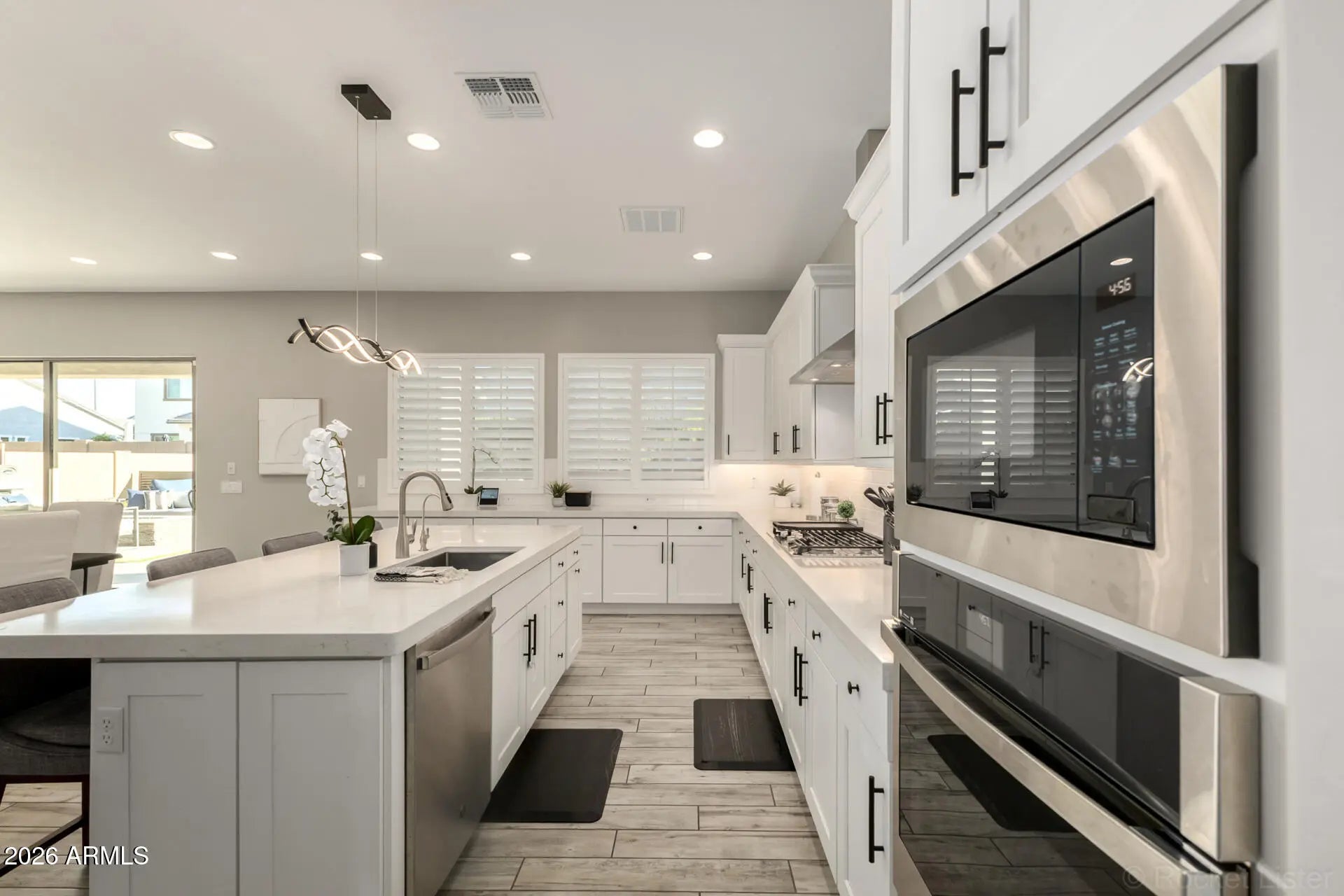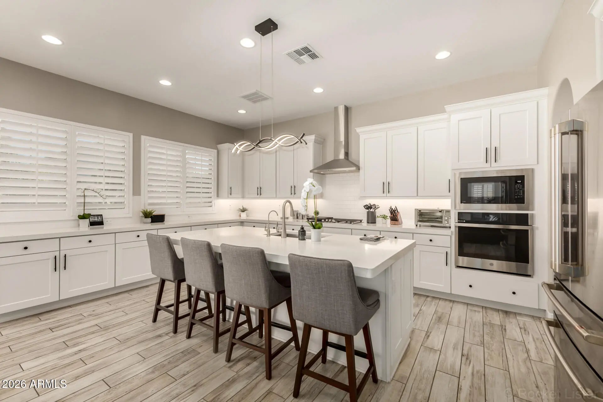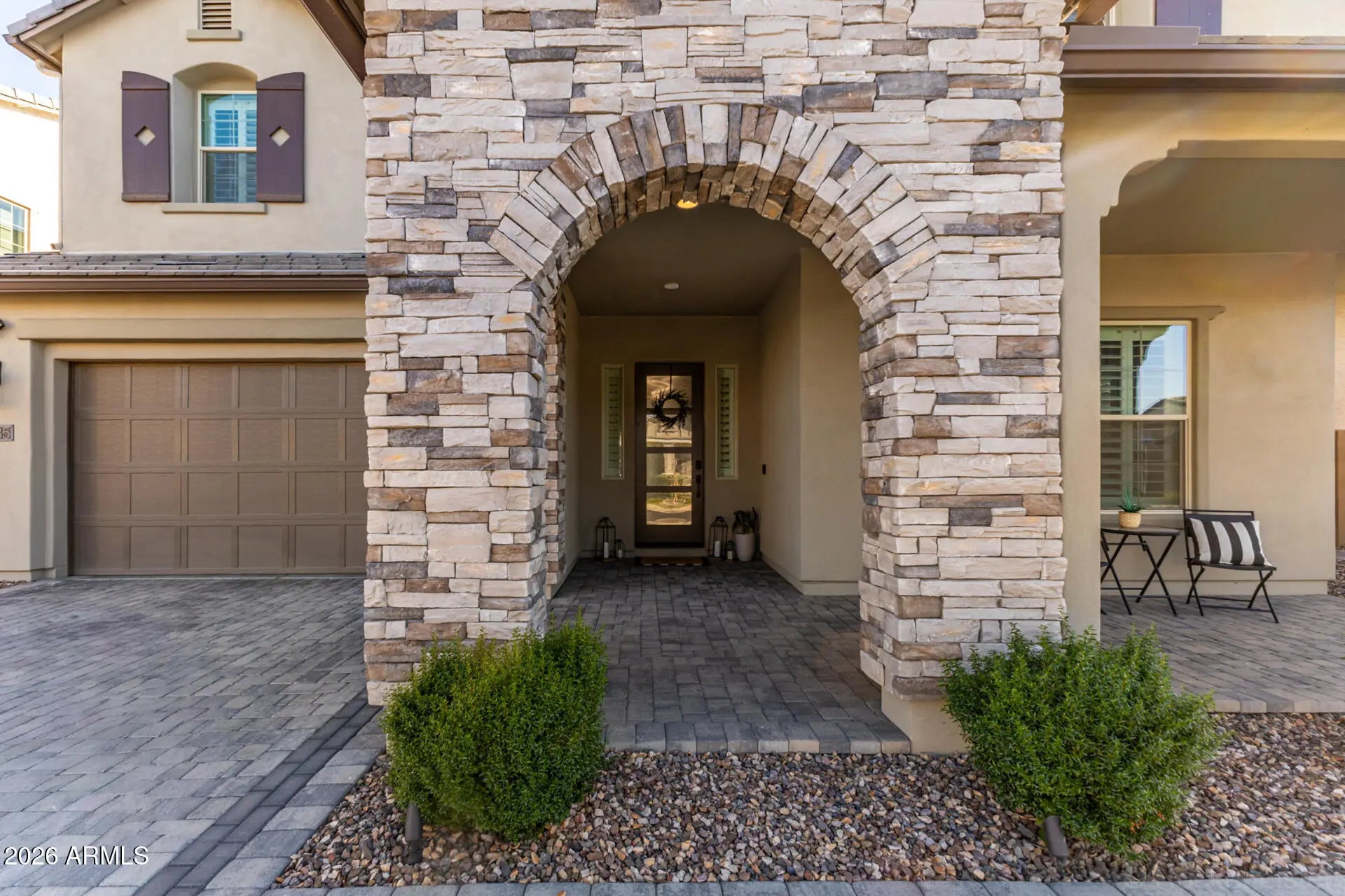 Some homes check all the boxes... this one raises the standard. Perfectly positioned in the heart of Gilbert within the highly sought-after gated community of Stratford Estates, this stunning 5+ bedroom, 4.5 bathroom luxury home offers the ideal blend of elegance, functionality, and true Arizona indoor-outdoor living... all just minutes from San Tan Village, Mercy Gilbert Medical Center, and the 202 Freeway. From the moment you arrive, you'll feel the difference. Beautiful stone and iron gated entrances welcome you into a community designed for connection, featuring three lush parks complete with outdoor kitchens, fire pits, playgrounds, and sport courts. Inside, the home is light-filled, open, and thoughtfully designed. Wood-look tile flooring, custom lighting, and elevated finishes... create a warm yet sophisticated feel throughout the main living spaces. The heart of the home... a show-stopping chef's kitchen featuring a massive quartz island, custom white cabinetry, built-in stainless steel appliances, a butler's pantry, and an additional walk-in pantry... designed for both everyday living and effortless entertaining. The flexible floor plan offers a dedicated downstairs den perfect for a home office, while upstairs you'll find a spacious loft ideal for a media room, playroom, or teen retreat. The primary suite is a true sanctuary... oversized, serene, and beautifully appointed with expansive walk-in closets, dual vanities, a soaking tub, and a separate glass-enclosed shower. One of the standout features... a direct connection from one of the primary closets into the oversized laundry room, creating a thoughtful and highly functional everyday luxury. Upstairs living is thoughtfully designed with two bedrooms sharing a hall bath, while an additional two bedrooms enjoy their own private bathroom... creating ideal separation and comfort for family or guests. And then... the moment that truly sets this home apart...A dramatic 20-foot stacking glass wall opens completely to a resort-style backyard, creating a seamless indoor-outdoor experience that defines Arizona living at its finest. The backyard is an entertainer's dream... featuring a covered patio, outdoor fireplace, built-in grill, beverage fridge, ceiling fans, and a stunning pool with stone-stacked waterfall, baja step, water features, and a heated spa. Additional highlights include a 4-car tandem garage, paver driveway, fresh interior and exterior paint, custom shutters and blinds, and upgraded hardware throughout. This is more than a home... it's a lifestyle. And opportunities like this in Stratford Estates don't come often.