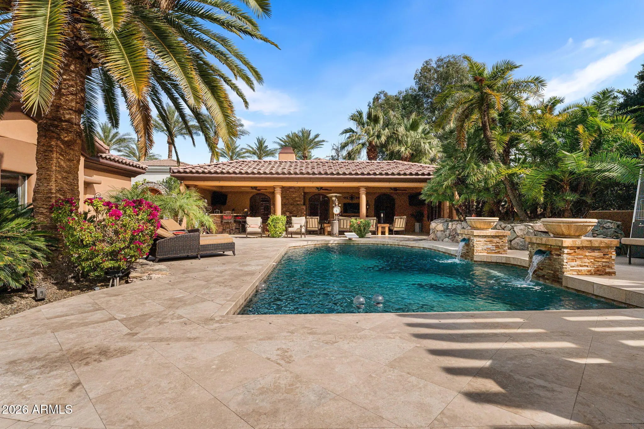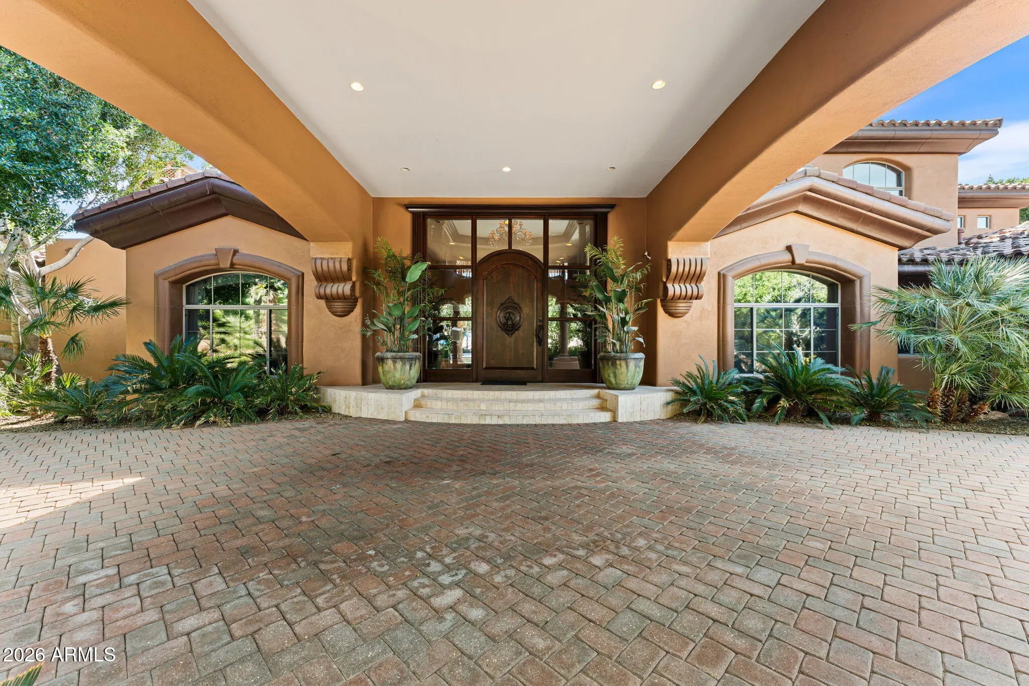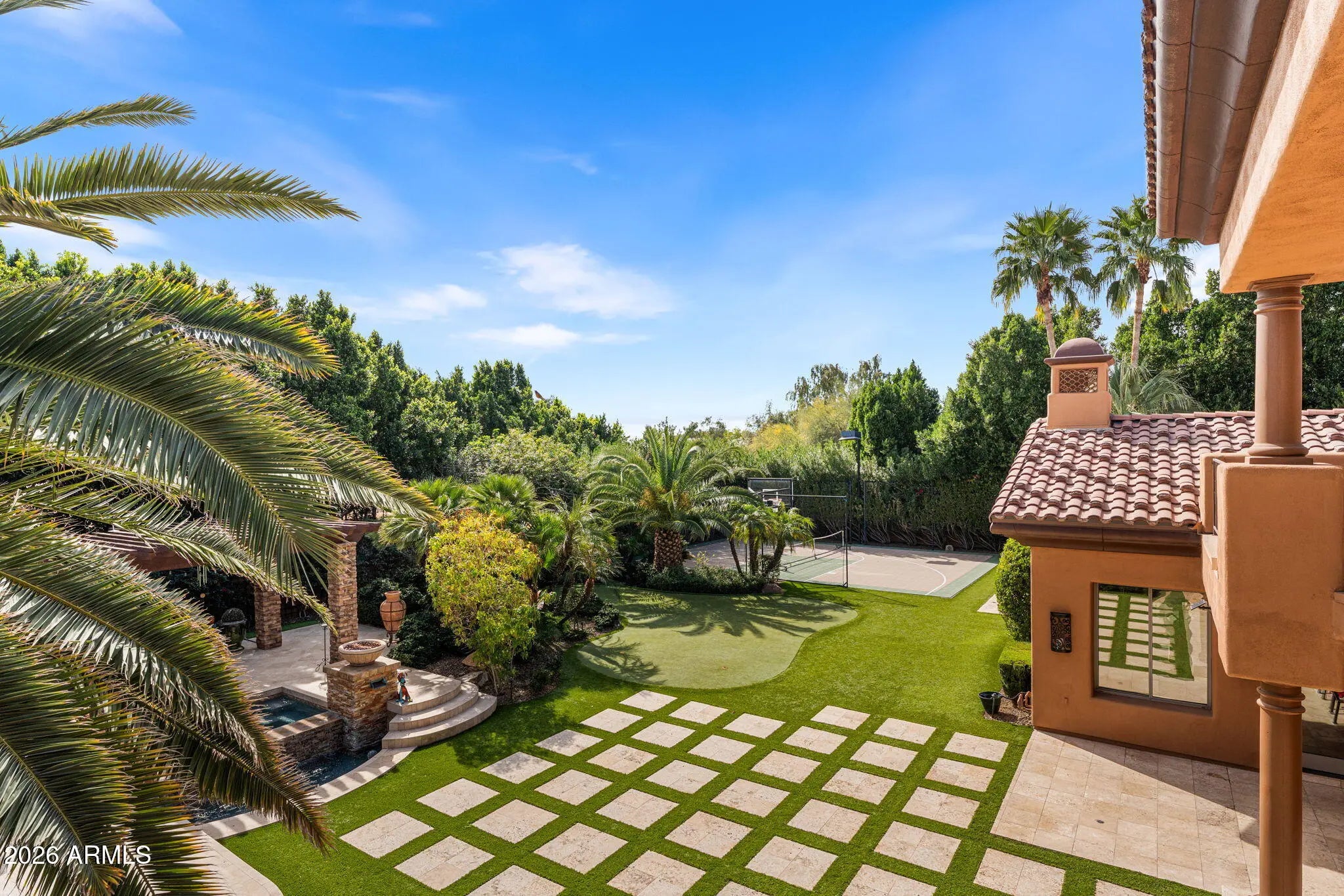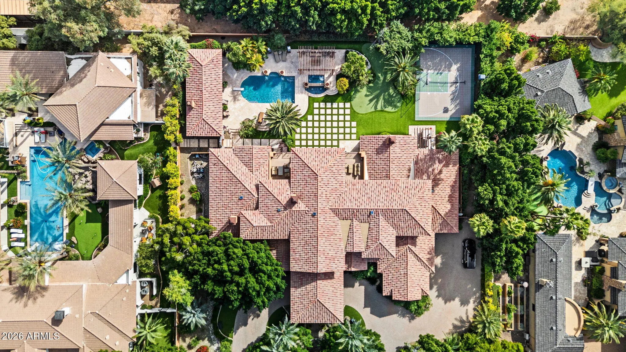 Iconic Mediterranean Estate I Resort Living on a Grand Scale A statement of timeless architecture and refined desert luxury, this magnificent Mediterranean estate offers an extraordinary lifestyle in one of Scottsdale1s most coveted settings. Privately nestled on an expansive 43,000sf homesite, the residence makes a lasting first impression with a sweeping paver motor court, lush mature landscaping, and a stately covered entry designed for elegant arrivals. Spanning 8,433 square feet, the home blends grand scale with thoughtful livability. A dramatic double height foyer, sweeping staircase, and rich architectural detailing set a tone of sophistication, while stone flooring and curated finishes reflect enduring craftsmanship. Designed to host at any scale, the estate offers an effortless flow between formal and casual living spaces ideal for refined entertaining or relaxed everyday living. At the heart of the home, the chef1s kitchen is a showpiece, appointed with dual oversized islands, custom cabinetry, premium appliances, and abundant prep and gathering space for seamless hosting. Five luxurious bedrooms and seven spa inspired baths provide exceptional comfort and privacy, creating serene retreats for both residents and guests. A dedicated billiards room adds a classic touch of leisure and entertainment. Outdoors, the property transforms into a private resort. Enjoy a sparkling pool and spa, a fully equipped outdoor kitchen, and a charming dining gazebo perfect for al fresco evenings. Professional grade pickleball and basketball courts elevate recreation, while expansive grounds offer rare space and seclusion. A four-car garage with EV charging completes the home's modern conveniences. This is a rare opportunity to own a residence that pairs architectural presence with resort caliber amenities crafted for those who expect distinction, privacy, and effortless luxury.