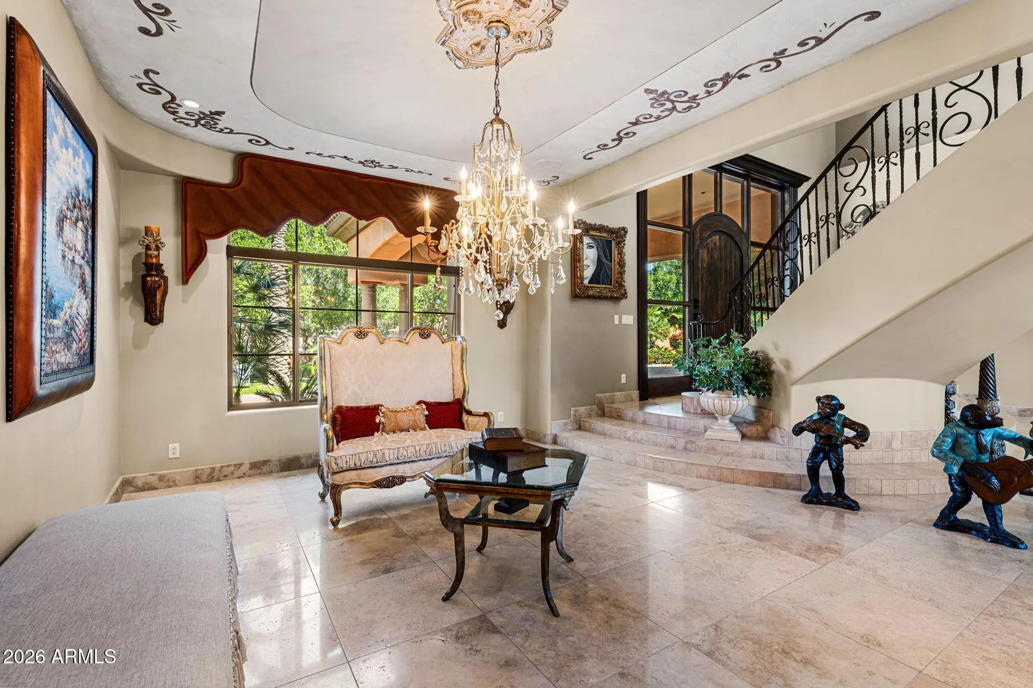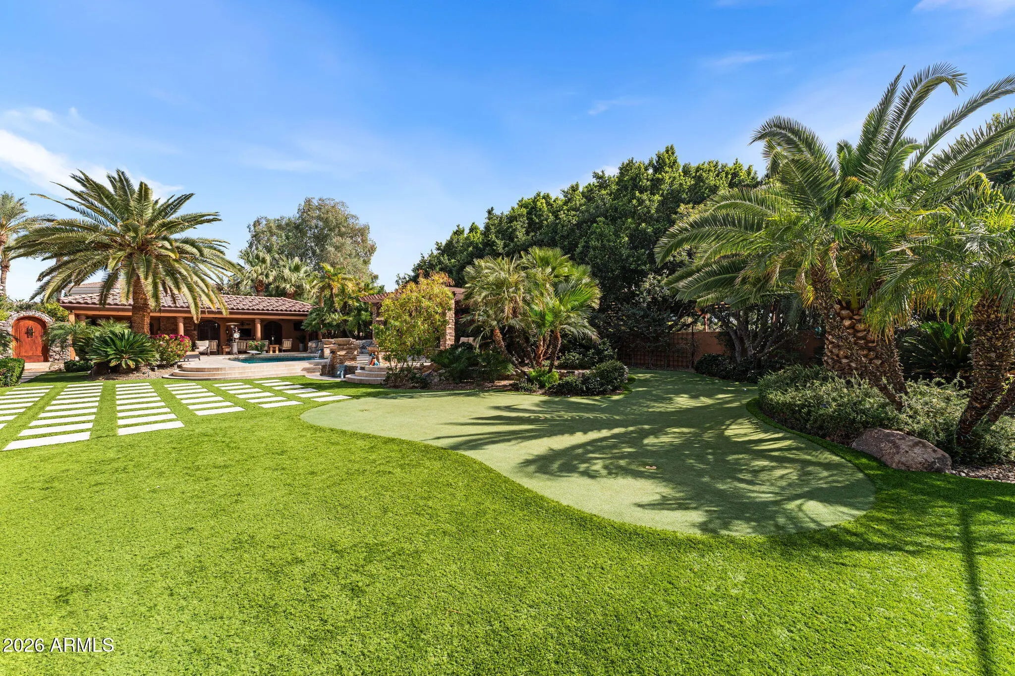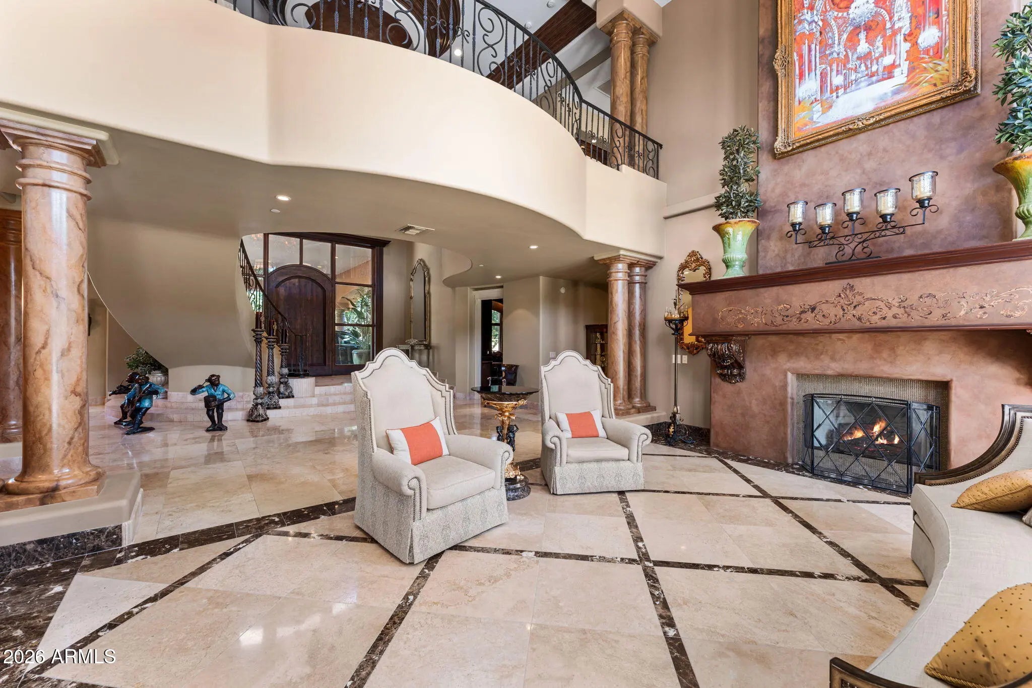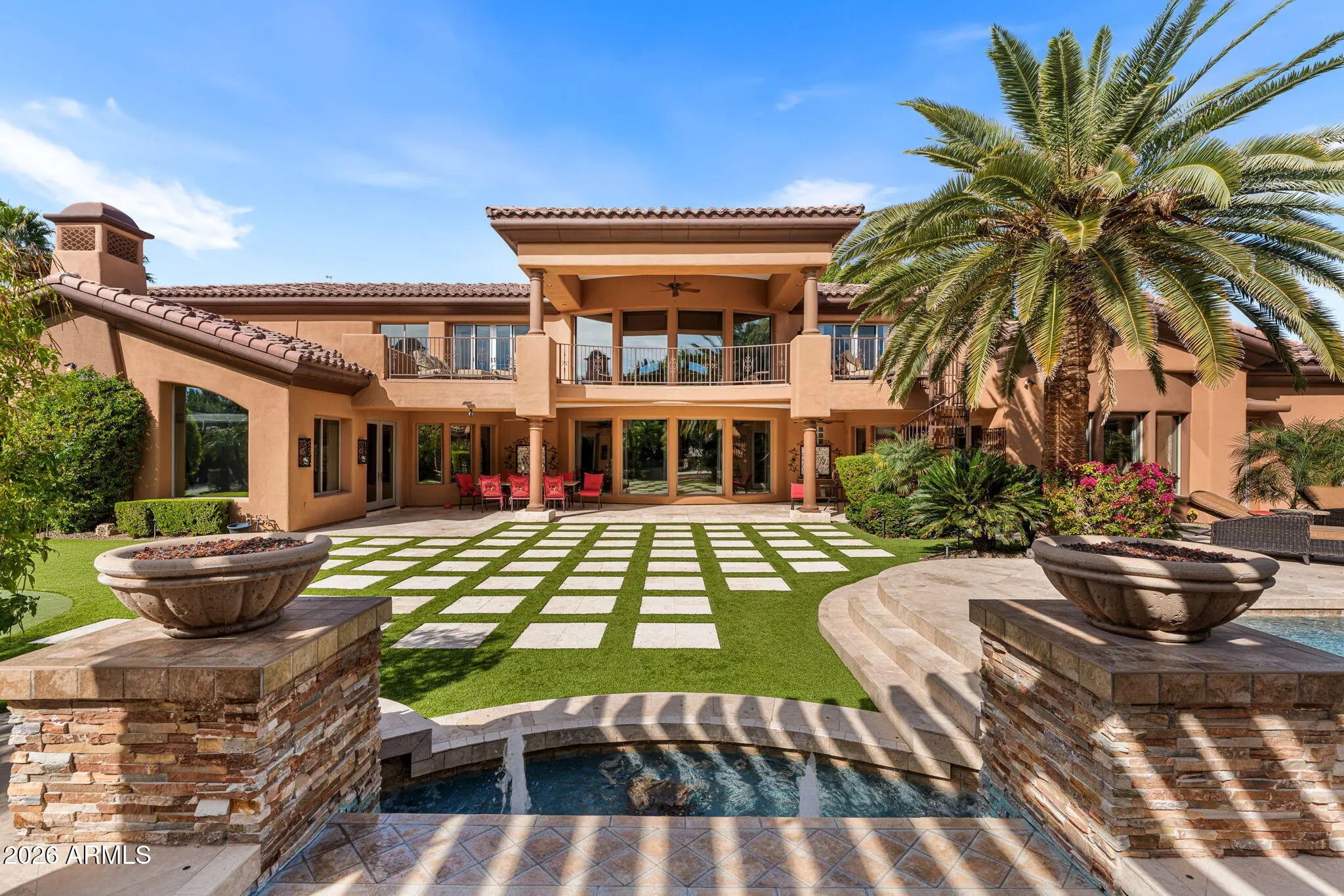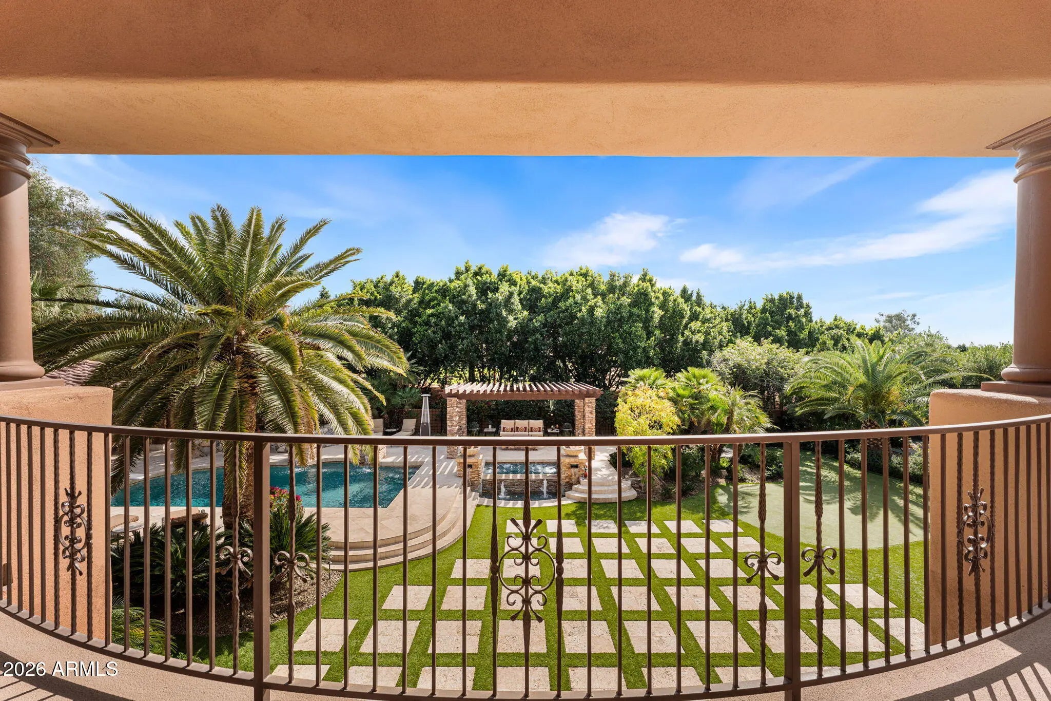 Iconic Mediterranean Estate I Resort Living on a Grand Scale A statement of timeless architecture and refined desert luxury, this magnificent Mediterranean estate offers an extraordinary lifestyle in one of Scottsdale1s most coveted settings. Privately nestled on an expansive 43,000sf homesite, the residence makes a lasting first impression with a sweeping paver motor court, lush mature landscaping, and a stately covered entry designed for elegant arrivals. Spanning 8,433 square feet, the home blends grand scale with thoughtful livability. A dramatic double height foyer, sweeping staircase, and rich architectural detailing set a tone of sophistication, while stone flooring and curated finishes reflect enduring craftsmanship. Designed to host at any scale, the estate offers an effortless flow between formal and casual living spaces ideal for refined entertaining or relaxed everyday living. At the heart of the home, the chef1s kitchen is a showpiece, appointed with dual oversized islands, custom cabinetry, premium appliances, and abundant prep and gathering space for seamless hosting. Five luxurious bedrooms and seven spa inspired baths provide exceptional comfort and privacy, creating serene retreats for both residents and guests. A dedicated billiards room adds a classic touch of leisure and entertainment. Outdoors, the property transforms into a private resort. Enjoy a sparkling pool and spa, a fully equipped outdoor kitchen, and a charming dining gazebo perfect for al fresco evenings. Professional grade pickleball and basketball courts elevate recreation, while expansive grounds offer rare space and seclusion. A four-car garage with EV charging completes the home's modern conveniences. This is a rare opportunity to own a residence that pairs architectural presence with resort caliber amenities crafted for those who expect distinction, privacy, and effortless luxury.