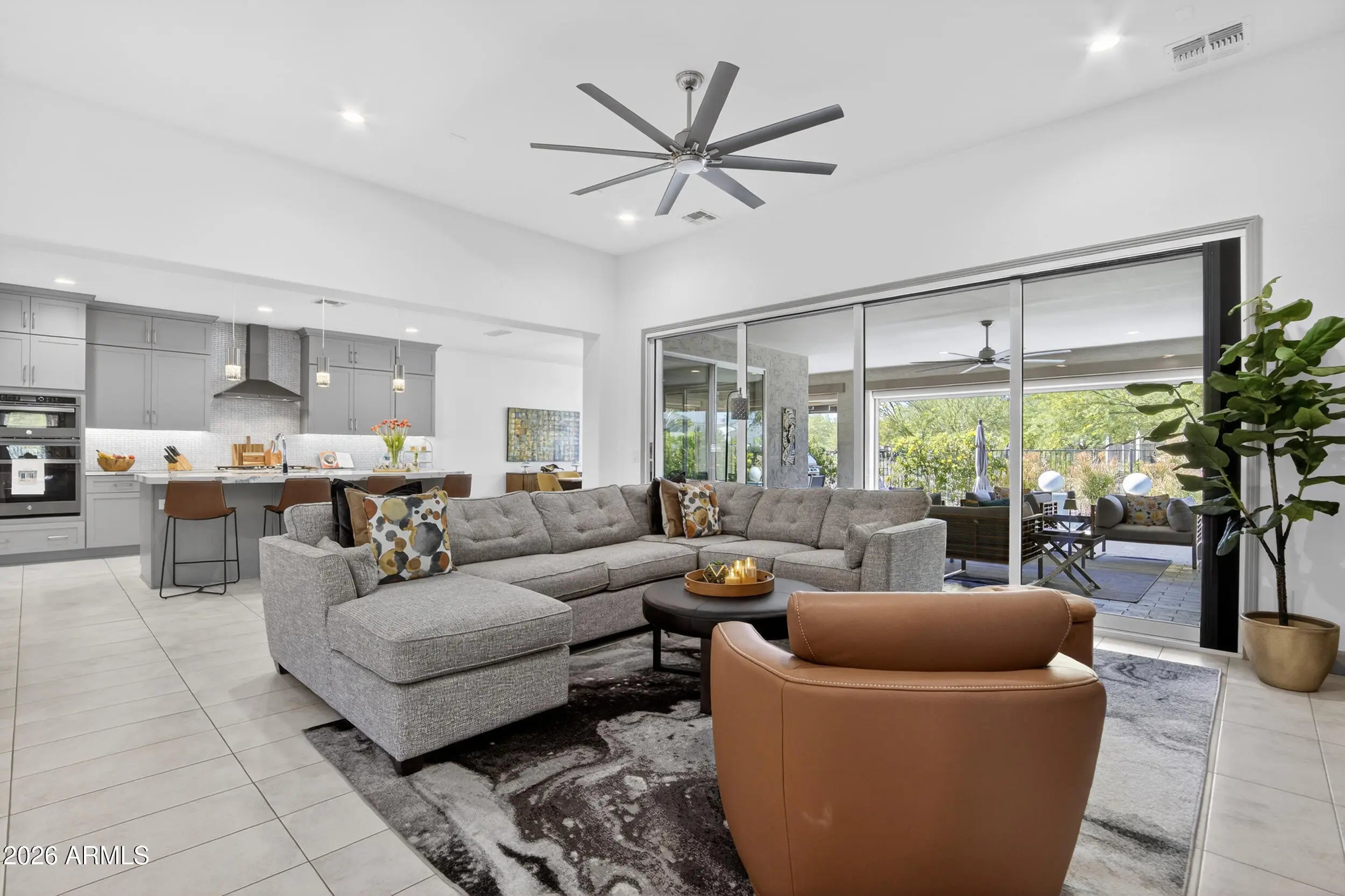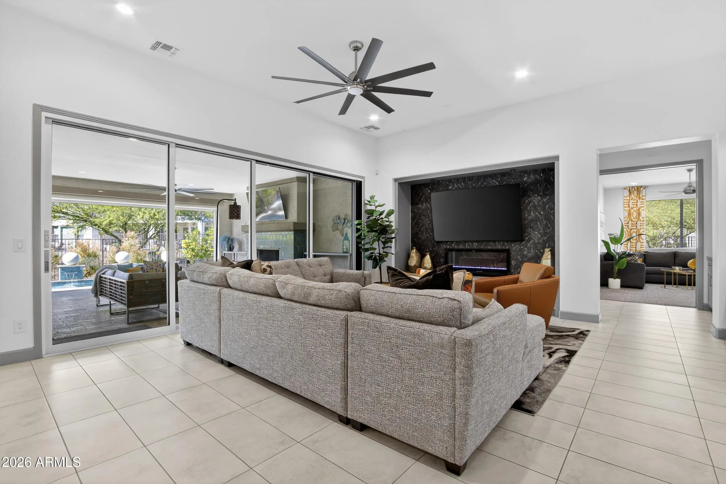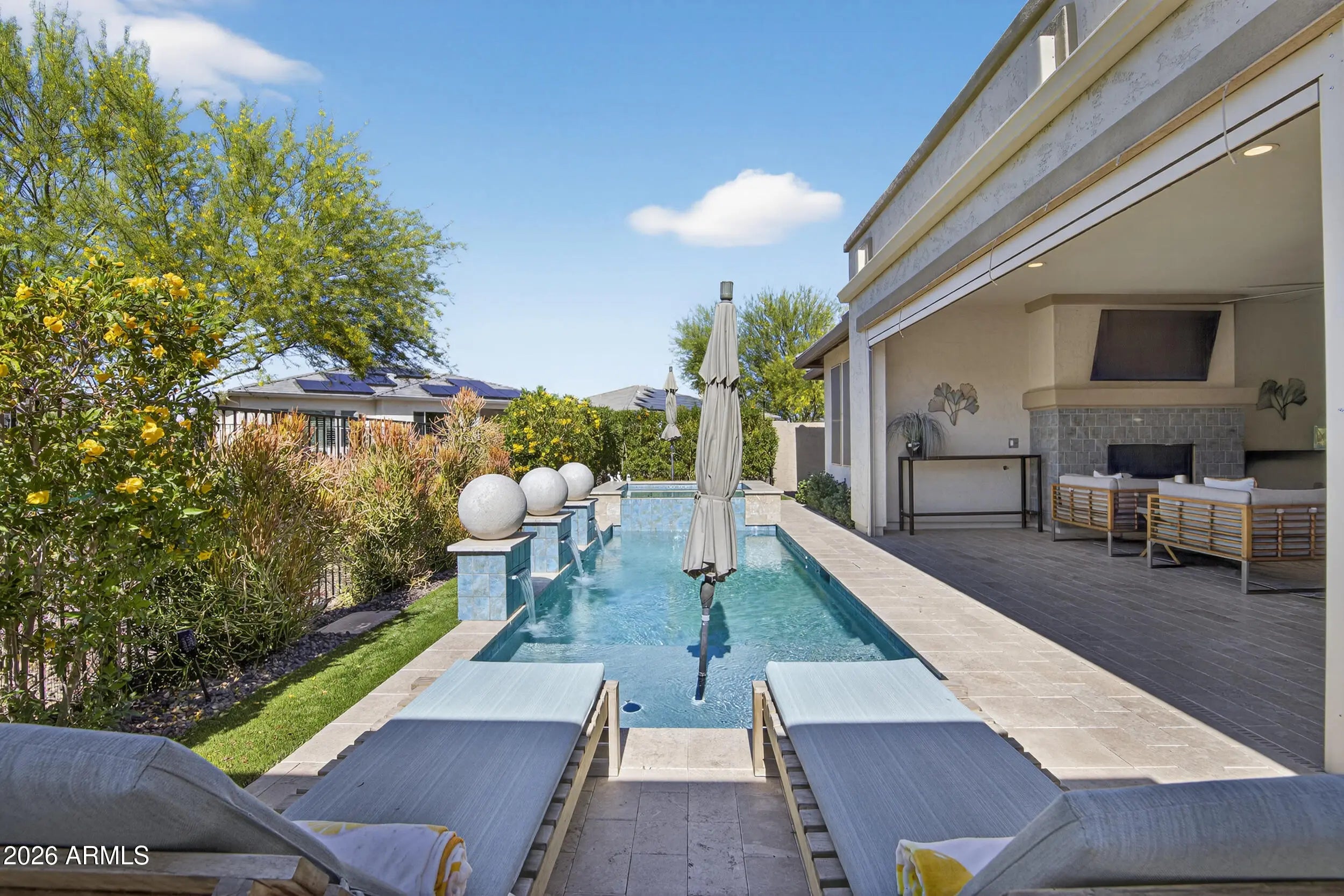 There is simply nothing else like it in PebbleCreek this is luxury living redefined. This exceptional 3 bed, 3 bath + den Tesoro with private-entry casita offers 2,761 sq ft of thoughtfully designed elegance, combining high-end finishes with effortless indoor-outdoor living. From the moment you enter the private courtyard, you're welcomed into a true designer's dream creating a grand first impression while offering privacy and charm for both everyday living and guest arrivals. The expansive great room features a stackable moving glass wall system with a pleated retractable screen, seamlessly blending indoor comfort with outdoor resort-style living perfect for entertaining or simply enjoying Arizona's beautiful evenings. A sleek electric fireplace and modern two-tone paint create a warm yet sophisticated ambiance, while a 44-bottle wine refrigerator elevates your hosting experience. The chef's kitchen is nothing short of spectacular designed for both beauty and function. A built-in gas package with gas cooktop delivers precision cooking, while 42" upper cabinets with crown molding maximize storage and elevate the space. Quartz countertops extend through the kitchen, butler's pantry, and wet bar, creating a cohesive, high-end design. Thoughtful upgrades such as pull-out shelving, a wood spice drawer, stemware rack, and Blanco undermount sinks ensure everything is within reach making cooking, hosting, and daily living effortless. Retreat to the extended primary suite, where luxury meets comfort. The expanded layout offers a large walk-in shower, extended mirrors to the ceiling for a bright, open feel, a spacious walk-in closet, and a dedicated vanity area creating a spa-like escape designed for relaxation and ease. Cultured marble finishes add timeless sophistication and durability. Step outside to your extended back patio and private pool an entertainer's dream designed for unforgettable gatherings. A gas fireplace creates the perfect setting for cozy evenings under the stars, while the built-in BBQ under a shaded pergola allows for effortless outdoor dining and hosting year-round. This is a backyard you truly won't want to leave. The private casita with its own entrance off the courtyard offers incredible flexibility ideal for guests, multigenerational living, or a private office. Complete with upgraded finishes, a refrigerator, built-in microwave, and abundant storage, it provides comfort, convenience, and independence all in one. Additional spaces continue to impress, including a den with French doors perfect for a home office or quiet retreat and a well-appointed laundry room with added upper cabinetry and a sink, bringing both function and organization to daily living. Every detail has been thoughtfully considered, including a 4-foot extended garage with golf cart space for added versatility, tankless hot water for energy efficiency and endless supply, a water purification system and soft water loop for enhanced quality of living, and epoxy garage floors with built-in cabinets and workbench creating a clean, polished, and highly functional space. Beyond the home, enjoy the unmatched lifestyle that makes PebbleCreek so highly sought after featuring 36 pickleball courts, championship golf, tennis, bocce ball, five resort-style pools, state-of-the-art fitness centers, a full-service spa, multiple restaurants, a theater, ballroom, two clubhouses, and over 200 clubs and activities designed to keep you as active and social as you desire. This is more than a home, it's a lifestyle upgrade. Better than new and available now without the build time, this one-of-a-kind property is a rare opportunity you don't want to miss.