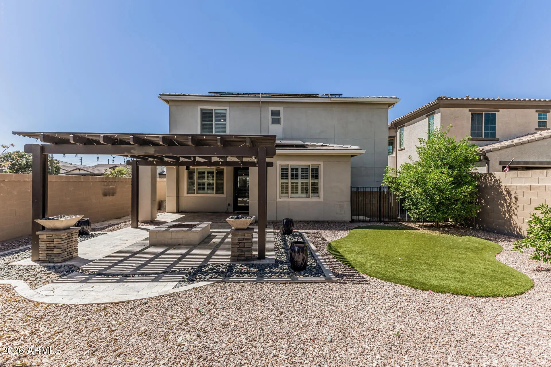 Tucked inside a quiet gated community on a premium corner lot, this turn key home offers style, function, and an exceptional location near the playground. Inside, you'll find wood look floors, a dramatic cathedral entry, smooth texture walls, custom paint, fresh interior paint, plantation shutters, surround sound, and flexible living space with double living areas, a loft, and an executive office space or flex room. The updated kitchen features quartz countertops, stainless steel appliances, and a designer backsplash. The spacious primary bath showcases an extra large walk in shower. Enjoy owned solar, EV charger, climate controlled garage storage, plus a beautifully finished backyard with turf, lighting, misters, timed irrigation, pet enclosure, and an Alumiwood pergola with a fire pit. " Quartz countertops " Stainless steel appliances " Remodeled kitchen backsplash " Large luxurious walk in shower " Owned solar panels " Double living rooms or flex space for an office " Loft " Enhanced wood accent wall " Premium carpet padding " Plantation shutters throughout " Reverse osmosis water system " Triple filter backyard misters " Backyard lighting " EV car charger in garage " Garage overhead storage " Enclosed garage storage or workstation " AC unit in 3rd bay of garage " Surround sound system " 4 camera hookups " Turf backyard " Irrigation " Pet side yard enclosure " Outdoor TV wiring " Real wood fire pit " Alumiwood patio pergola " Corner lot " Quiet gated community " Located between a cul de sac and neighborhood playground " Wood look floors " Cathedral entry " Smooth texture walls " Custom paint " Freshly painted interior " Clean carpets " Turn key condition " Vacant and ready for move in
