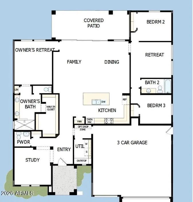 BRAND NEW single level home with 3 beds, 2.5 baths, study with 3 car side by side garage in incredible Litchfield Park location; incredible open plan with 10' ceilings, 8' doors and views out the family room and kitchen out 16' sliding glass door and huge energy efficient windows; chef's kitchen with modern 2 tone cabinets, designer tiled backsplash and quartz tops, stainless GE appliances including 42'' built-in refrigerator; plank tile flooring, upgraded carpet/pad throughout; incredible extended outdoor living area with large private backyard; spa-like owner's bath with dual sinks and super shower with floor to ceiling tile; 4' extension on 3-car side by side garage; 2x6 CONSTRUCTION AND EXTENSIVE NEW HOME WARRANTY.