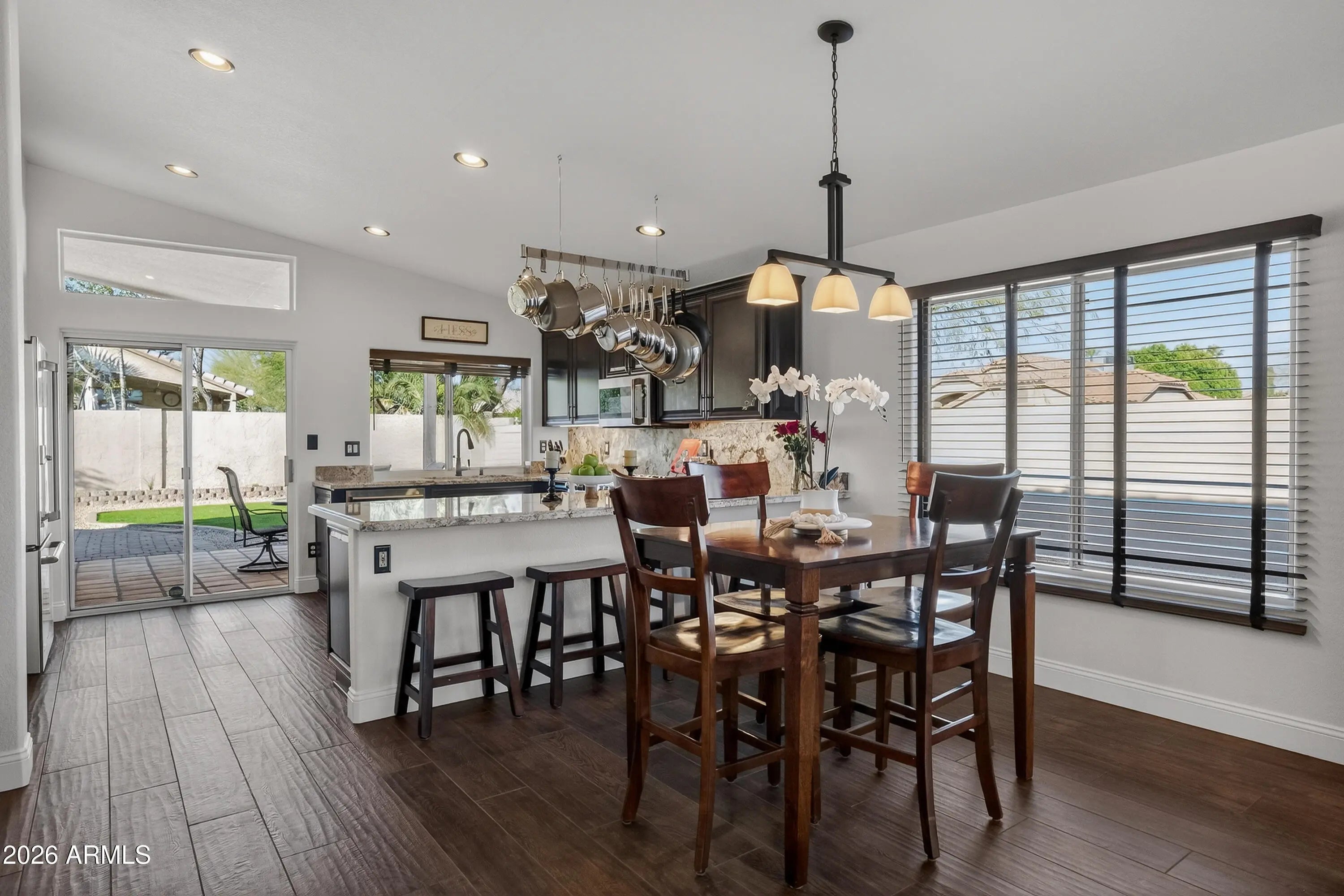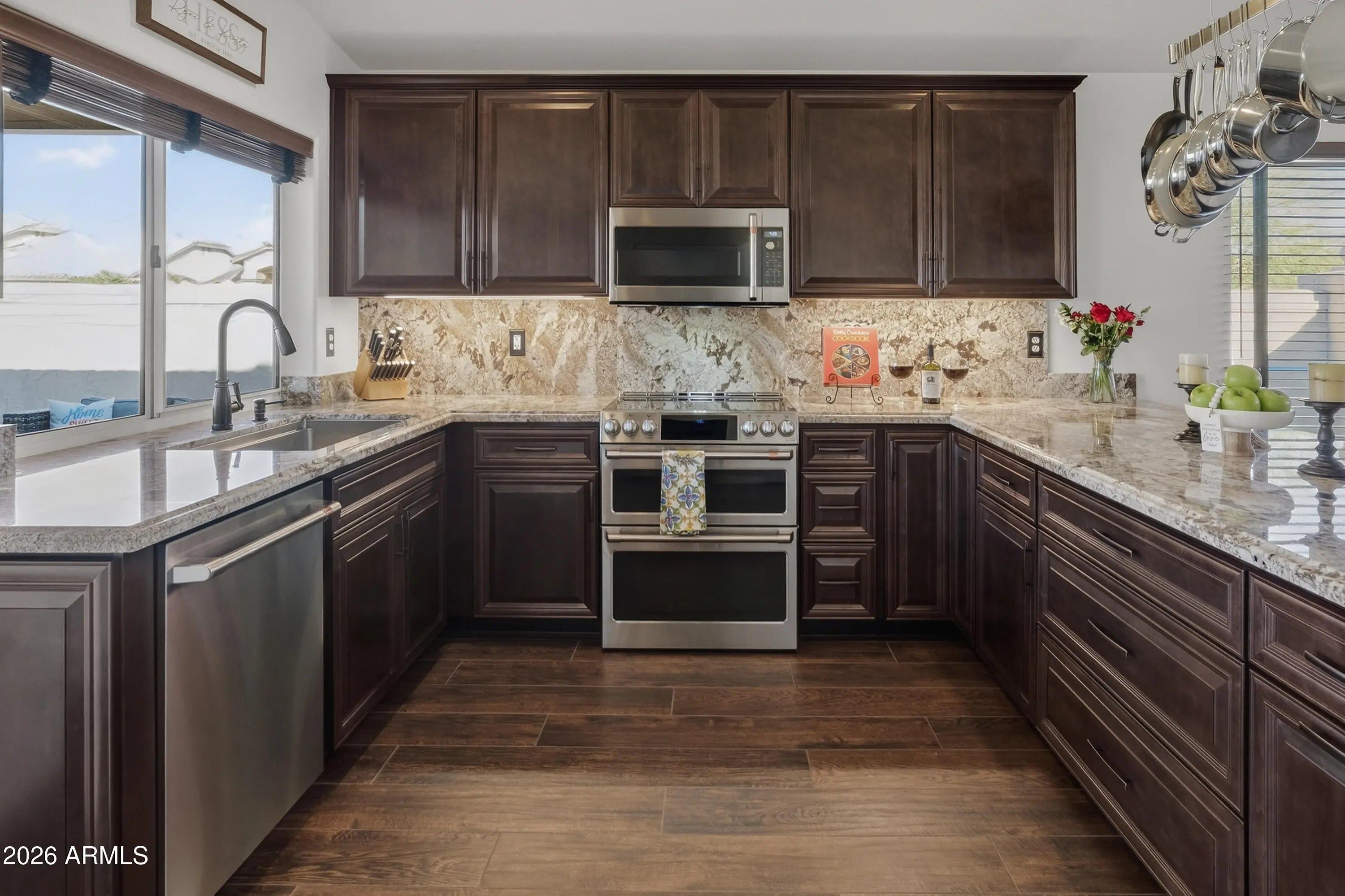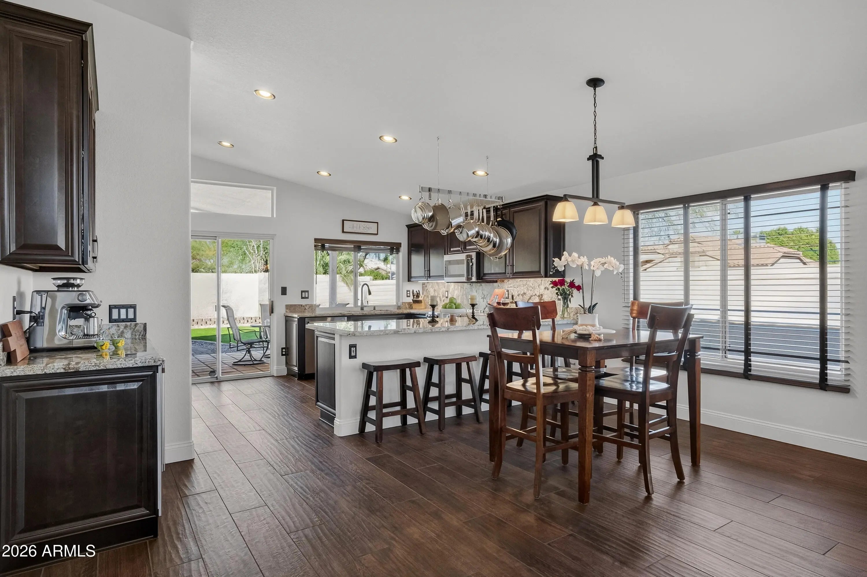 Fall in love with this beautifully updated home on a desirable corner lot featuring a bright, open great room floorplan perfect for gathering and entertaining. The gorgous kitchen showcases GE Café stainless steel appliances, beverage bar, modern cabinetry and Desert Beach granite countertops. Natural Timber Chestnut wood-look porcelain flooring adds warmth and durability throughout the main living areas. Bathrooms are elegantly updated with Newport Metallic porcelain tile and Blue Galaxy granite, custom shower and tub surround gives you a spa like retreat. Step outside to a charming backyard with a paver walkways, grass area, and planters--an inviting space to relax or entertain. Ideally located near freeways, shopping, and schools, with PVCC & Quail Run Elementary just minutes away.