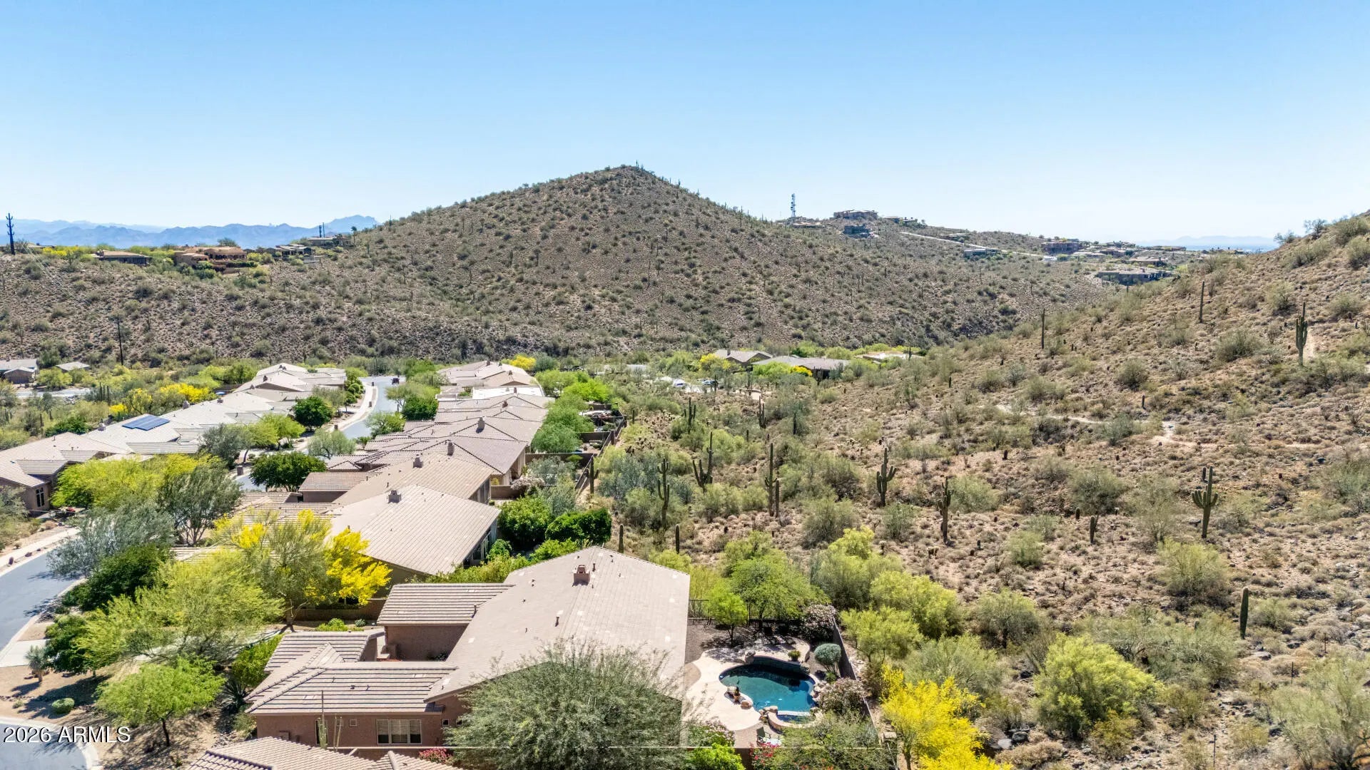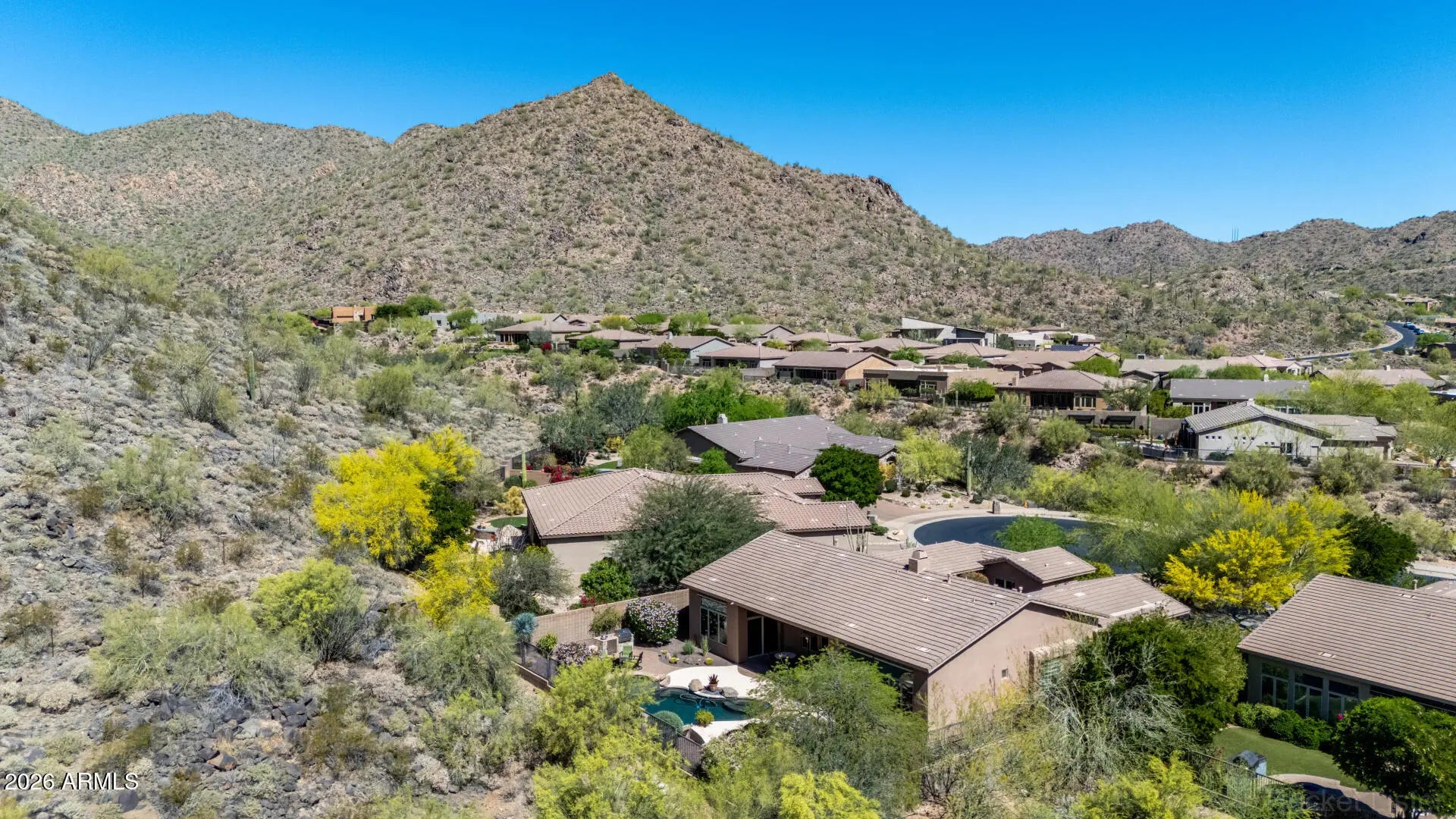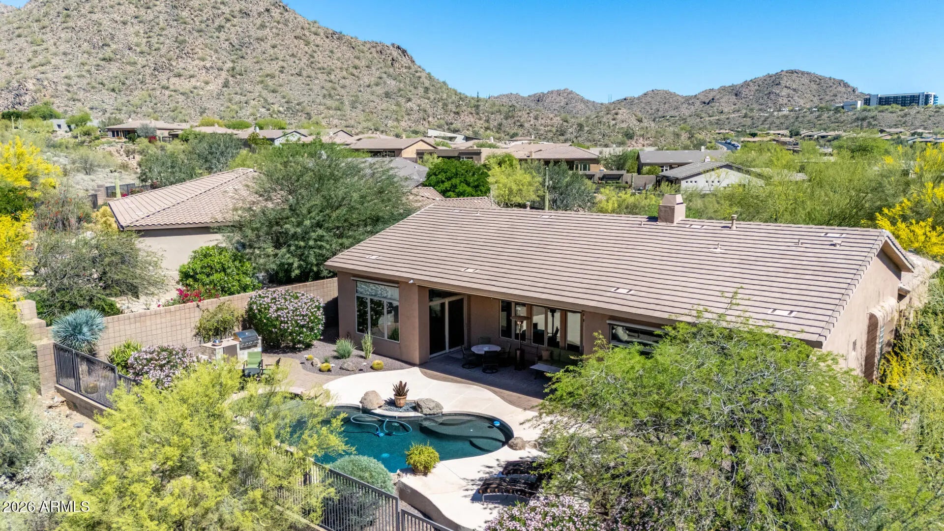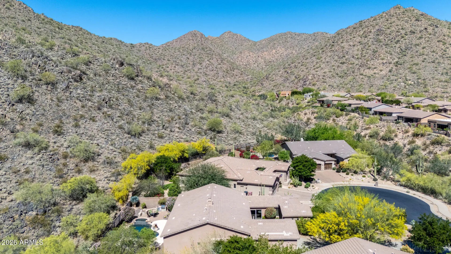 SPECTACULAR VIEW BACKING TO A MOUNTAIN PRESERVE IN THE EXCLUSIVE GATED COMMUNITY OF HIDDEN HILLS. You can feel a sense of peace & serenity in this lovely neighborhood that has access to the Sunrise Trail Head. NESTLED IN A CUL-DE-SAC, there's lush desert growth, striking curb appeal & a driveway that can hold 6 vehicles. Pass through the private courtyard to enter this exquisite residence. Basking in the sunlight, this home has luxurious finishes that includes travertine & hardwood flooring, granite & travertine countertops, slate backsplash, high-end cabinetry & doors & power interior/exterior window shades. ALL FOUR BEDROOMS HAVE THEIR OWN BATHROOM. The yard backs to its own mountain, there's a heated pool/spa, gas firepit, extensive patio space & built-in BBQ island with sink & fridge. YOU MIGHT NOT WANT TO LEAVE HOME!