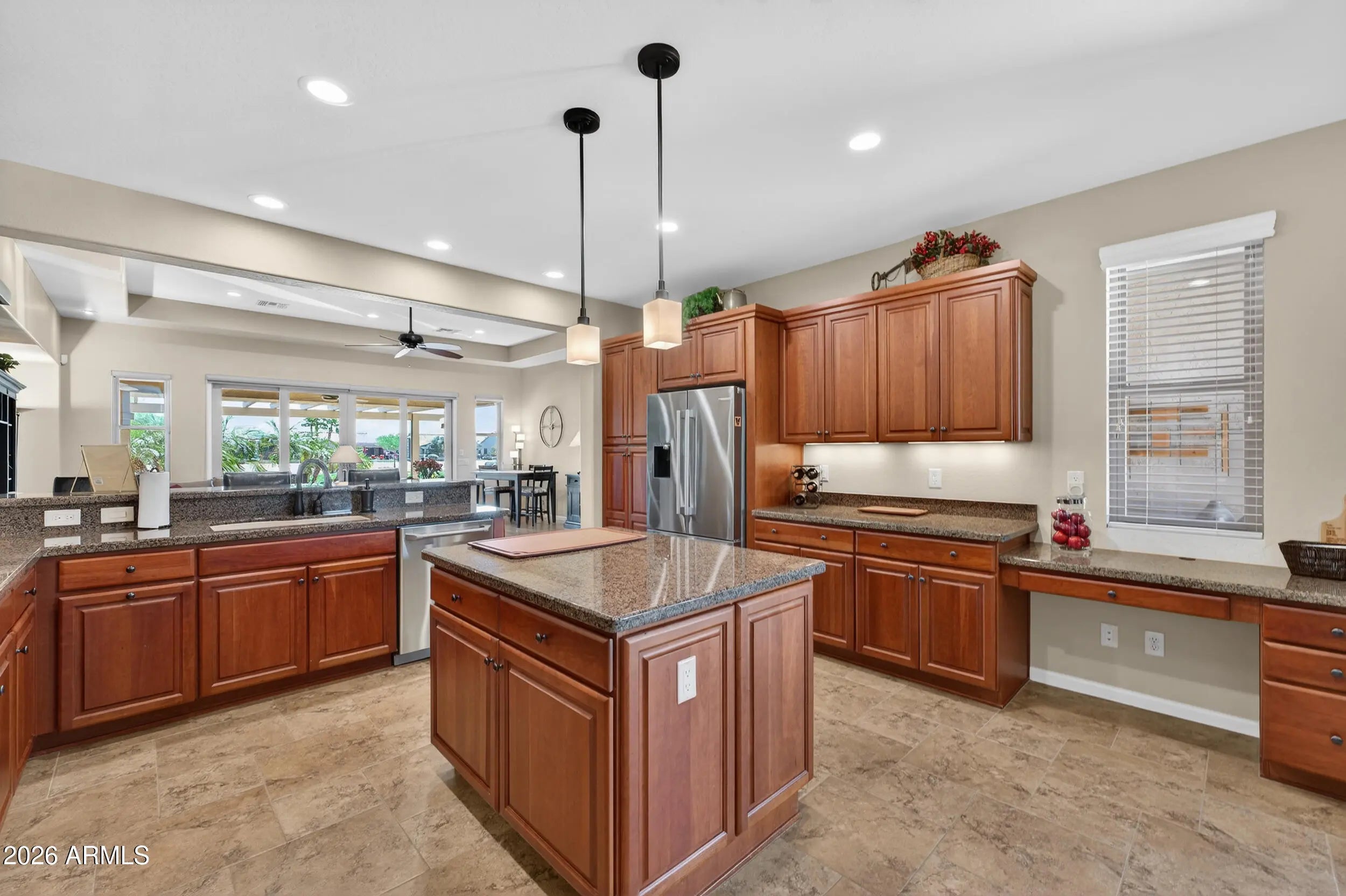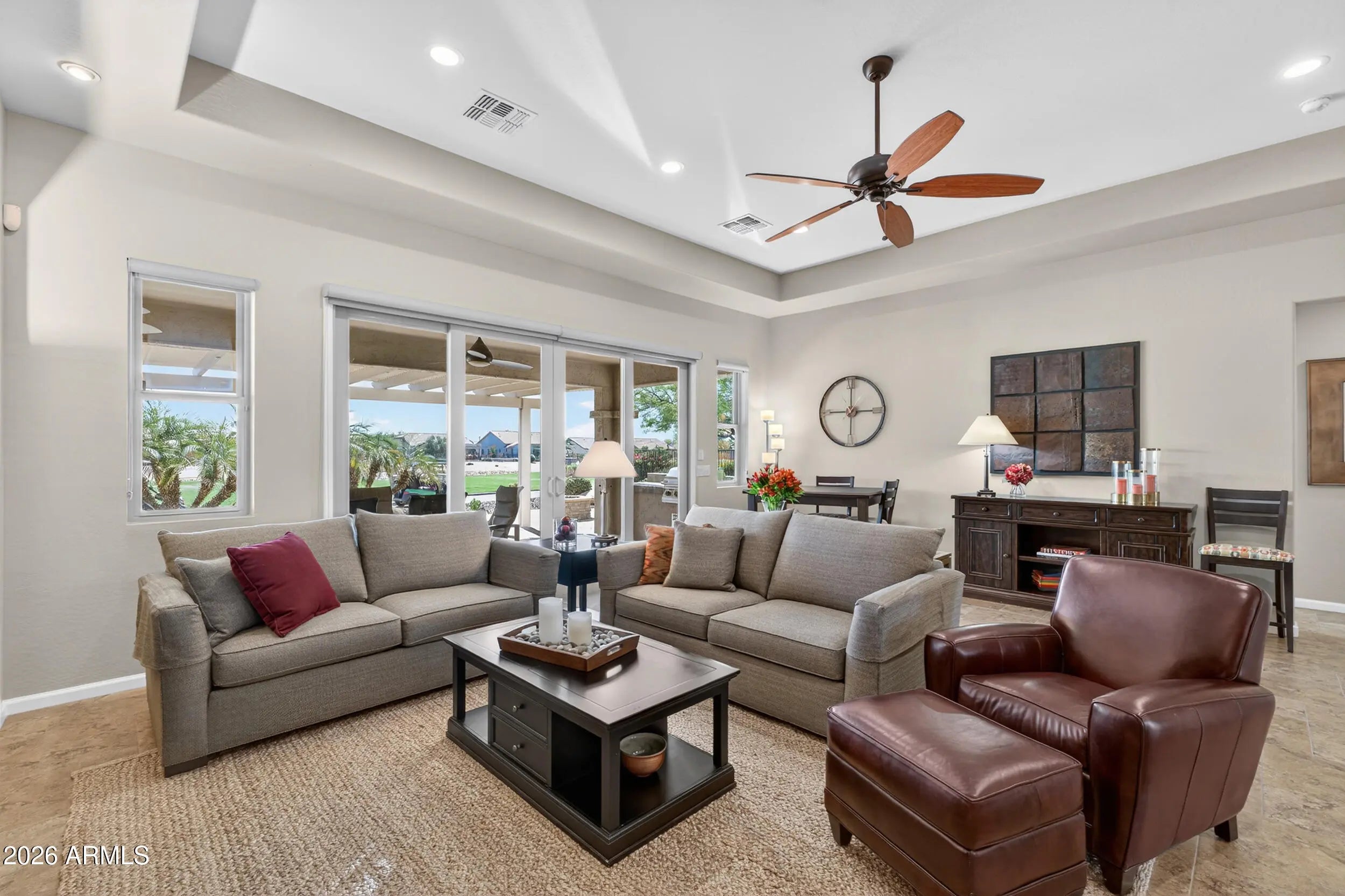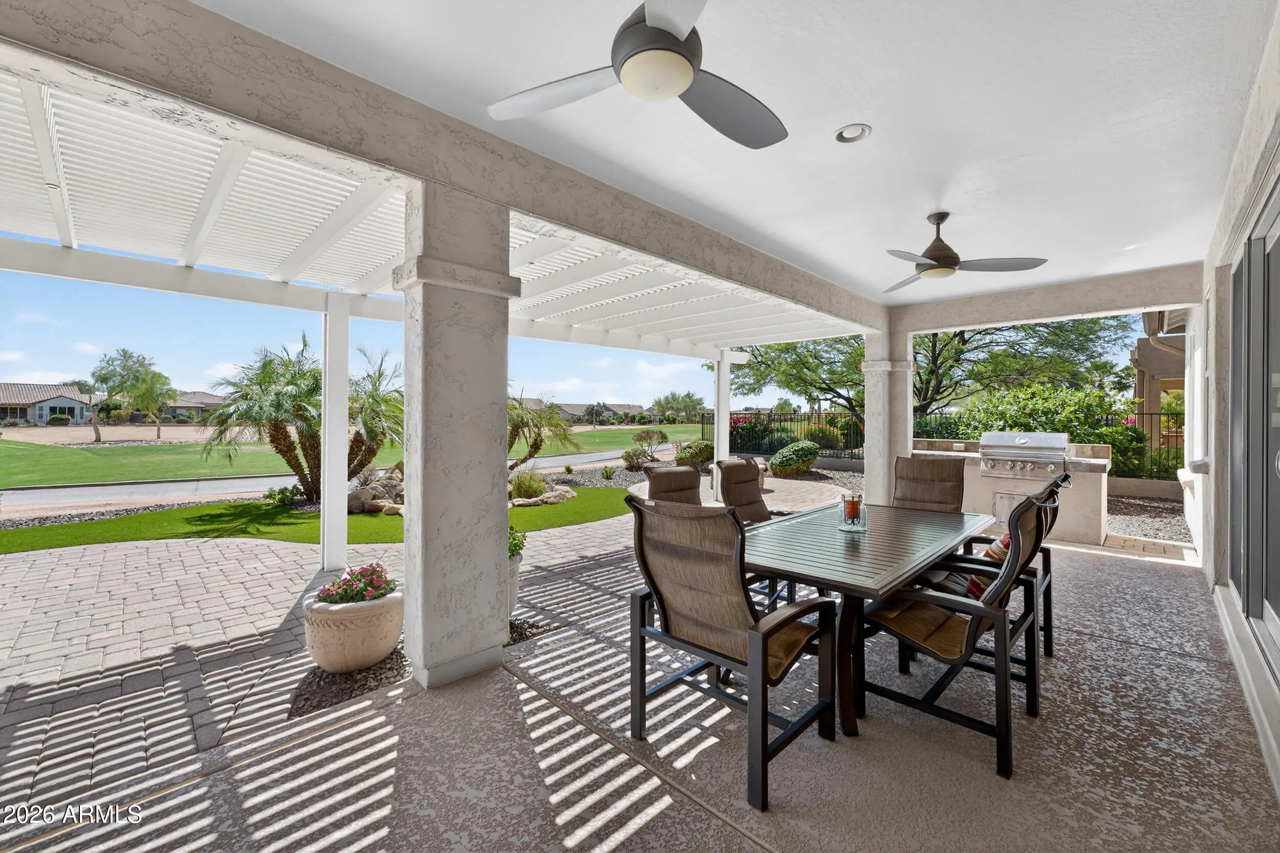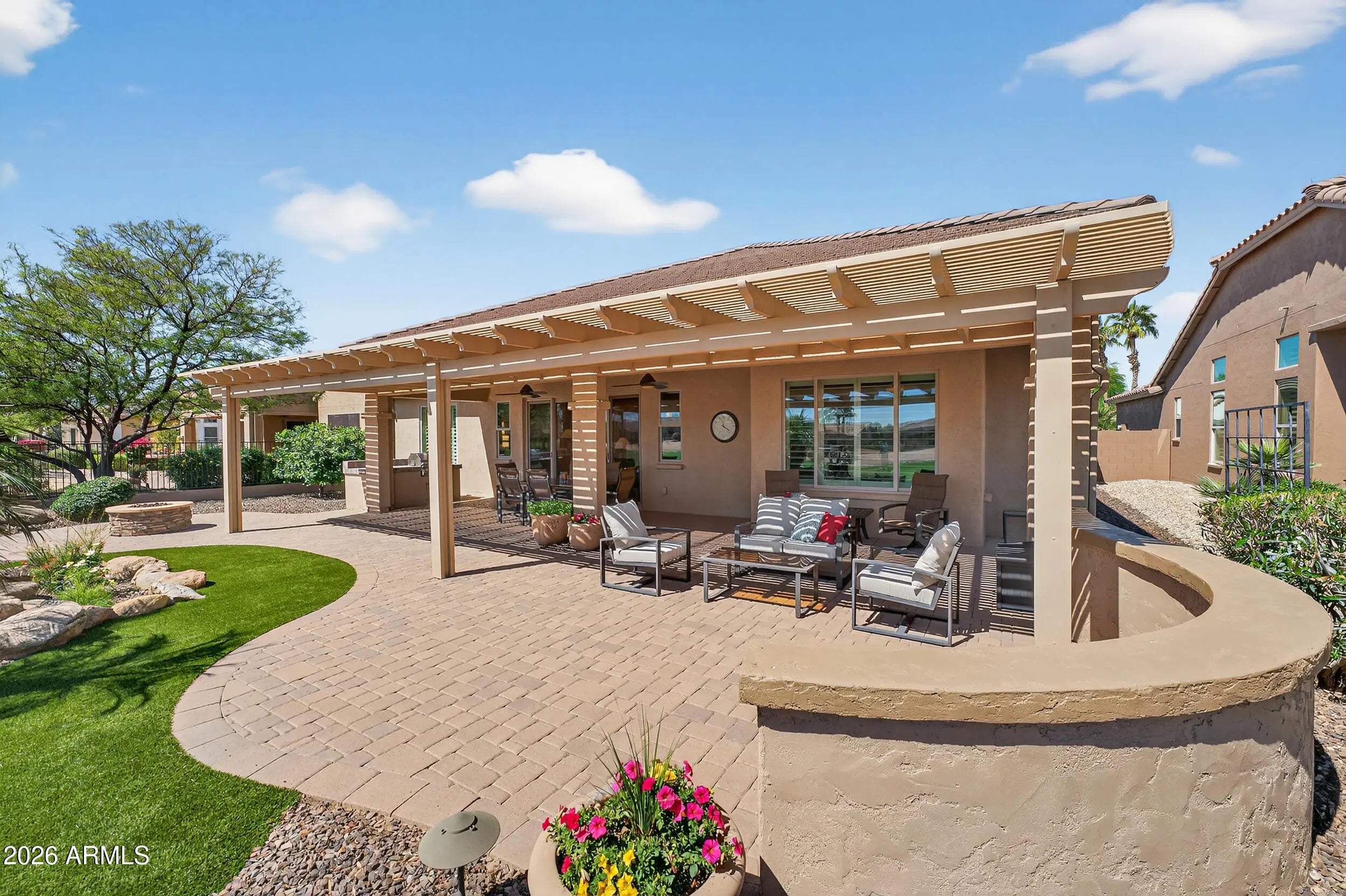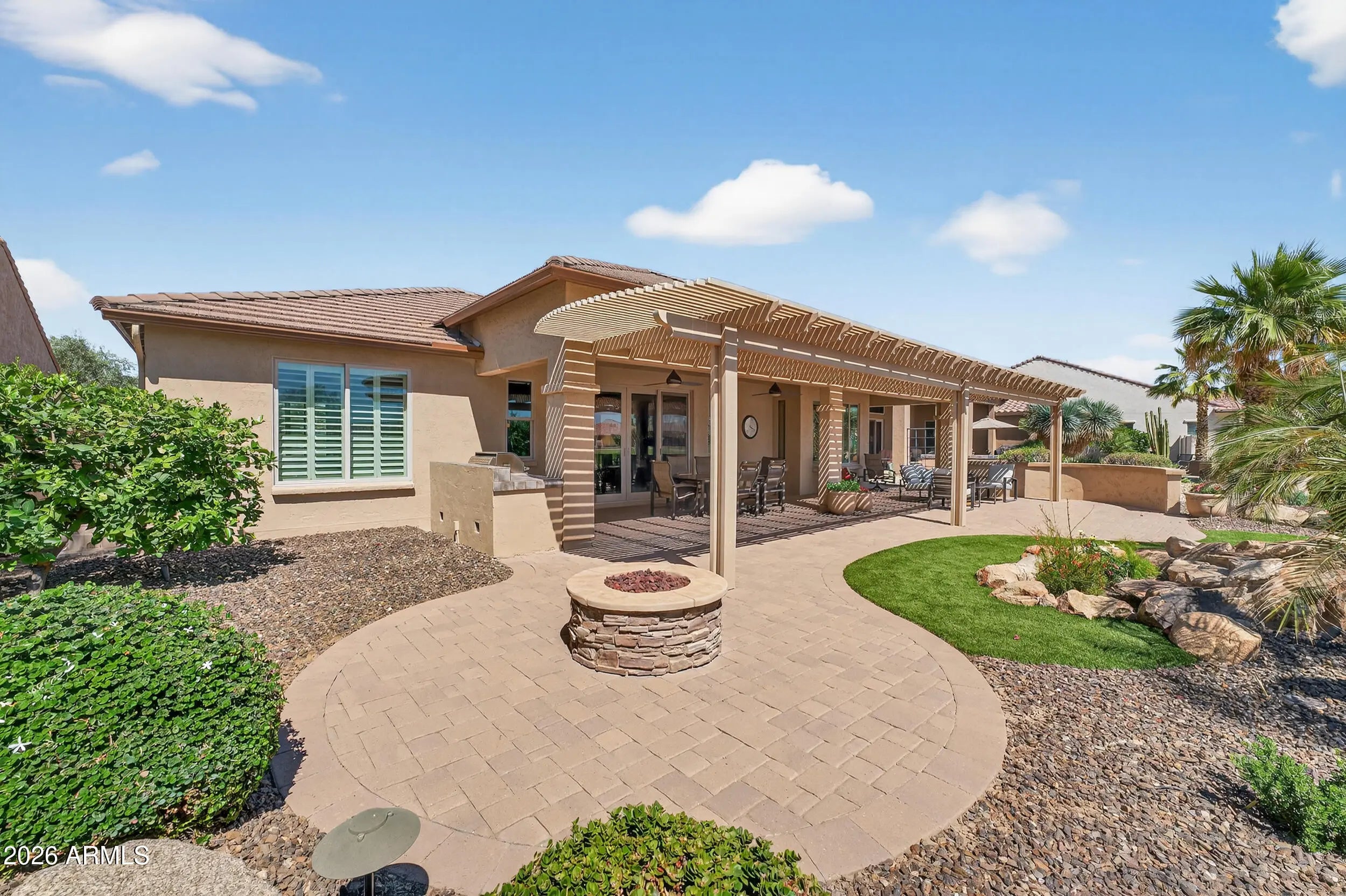 Experience elevated desert living in this beautifully upgraded golf course home on the 12th hole of the Tuscany West Course in PebbleCreek, Goodyear's premier 55+ active adult resort community. Thoughtfully designed and tastefully finished, this modified Medina floorplan offers enhanced openness with squared archways, creating a light, spacious feel that immediately welcomes you home. From the moment you arrive, the curb appeal sets the tone--paver-lined driveway, cool decking, pony wall planter, 4 foot extended 2-car + golf cart garage with epoxy floors--delivering both style and functionality. Enter through a gated front courtyard with designer screen door and glass entry, seamlessly connecting the main home to a private detached casita, perfect for guests or flexible living. Inside, the home blends comfort and upscale finishes with a layout designed for everyday enjoyment and effortless entertaining. The chef's kitchen is the heart of the home, featuring granite countertops, center island with eating bar, Brockton cherry cabinetry with shaker crown molding, roll-out shelving, and soft-close drawers throughout. Premium appliances include a GE Monogram gas cooktop with high-powered stainless hood, Bosch oven, microwave, and refrigerator--making it a dream space for both cooking and gathering. The open-concept living area flows beautifully through a center sliding glass wall to an inviting outdoor retreat--complete with built in BBQ, covered patio, pergola, patio misters, fire pit, and cool decking throughout. This space is designed for year-round enjoyment, offering the perfect setting to relax, entertain, and take in the serene golf course backdrop. The Primary Bedroom offers a peaceful retreat. The extended primary suite with bay window captures tranquil golf course views and a private door to the ensuite bath with a cultured granite vanity, and a walk-in-tiled shower (recently regrouted). The detached casita enhances the home's versatility with its own cultured granite vanity and shower, ideal as a guest suite, ensuring comfort and privacy for visitors or as an office, fitness room, or creative studio. Additional highlights include: · Extended garage with service door, windows, overhead and wall-mounted storage, and epoxy flooring · Laundry room with abundant cabinetry and utility sink · Upgraded bronze interior hardware for a modern touch · WiFi-controlled Ecobee thermostat and irrigation system · Soft water system Living in PebbleCreek means embracing a vibrant resort lifestyle with access to championship golf, resort-style pools and spas, state-of-the-art fitness centers, 36 pickleball courts, tennis, on-site dining, and over 200 clubs, classes, and social activities--all within a guard-gated, beautifully maintained community in Goodyear, Arizona. This is more than a home--it's an opportunity to live the lifestyle you've been waiting for. Don't miss your chance to make this exceptional golf course property your own.