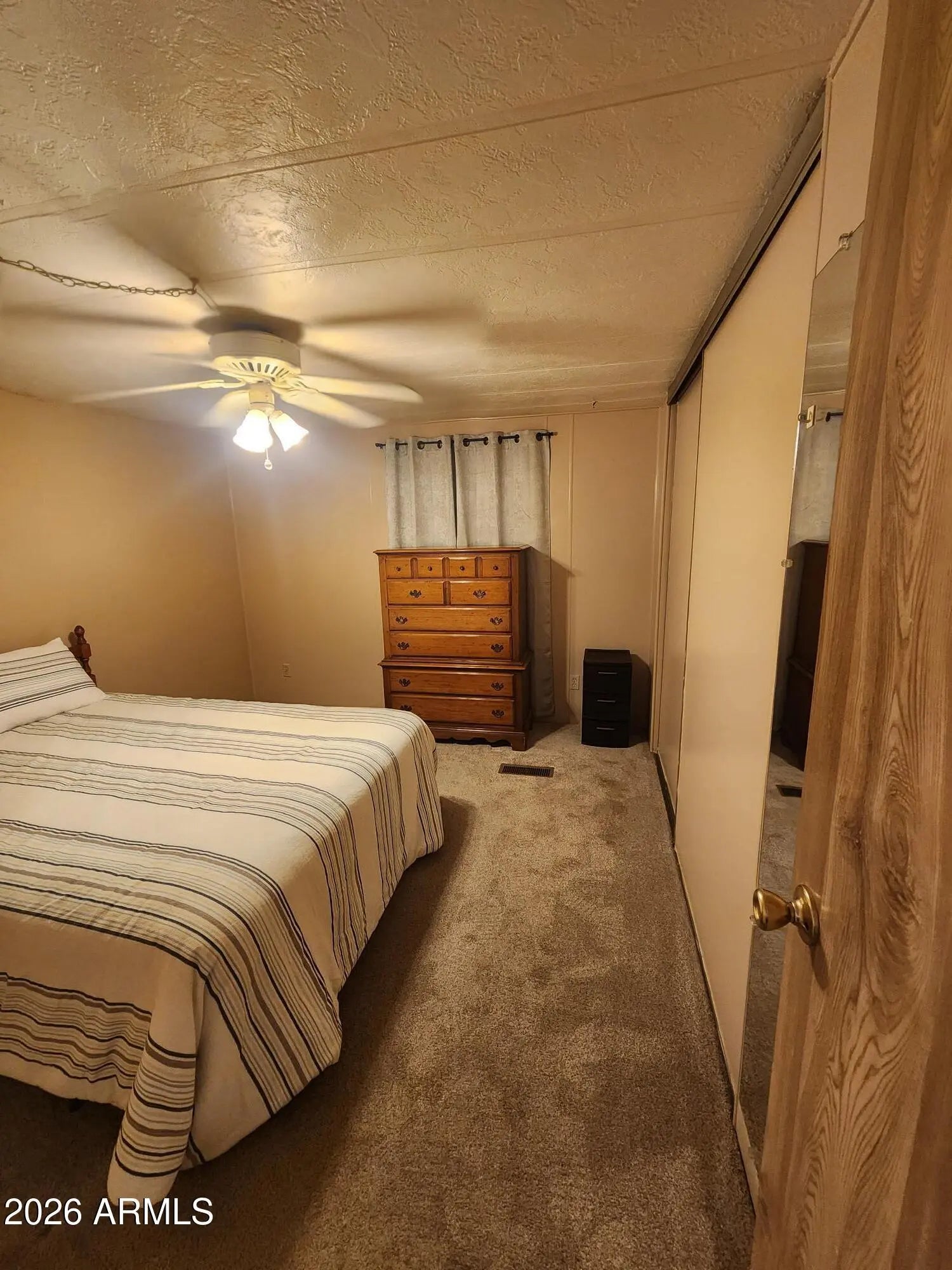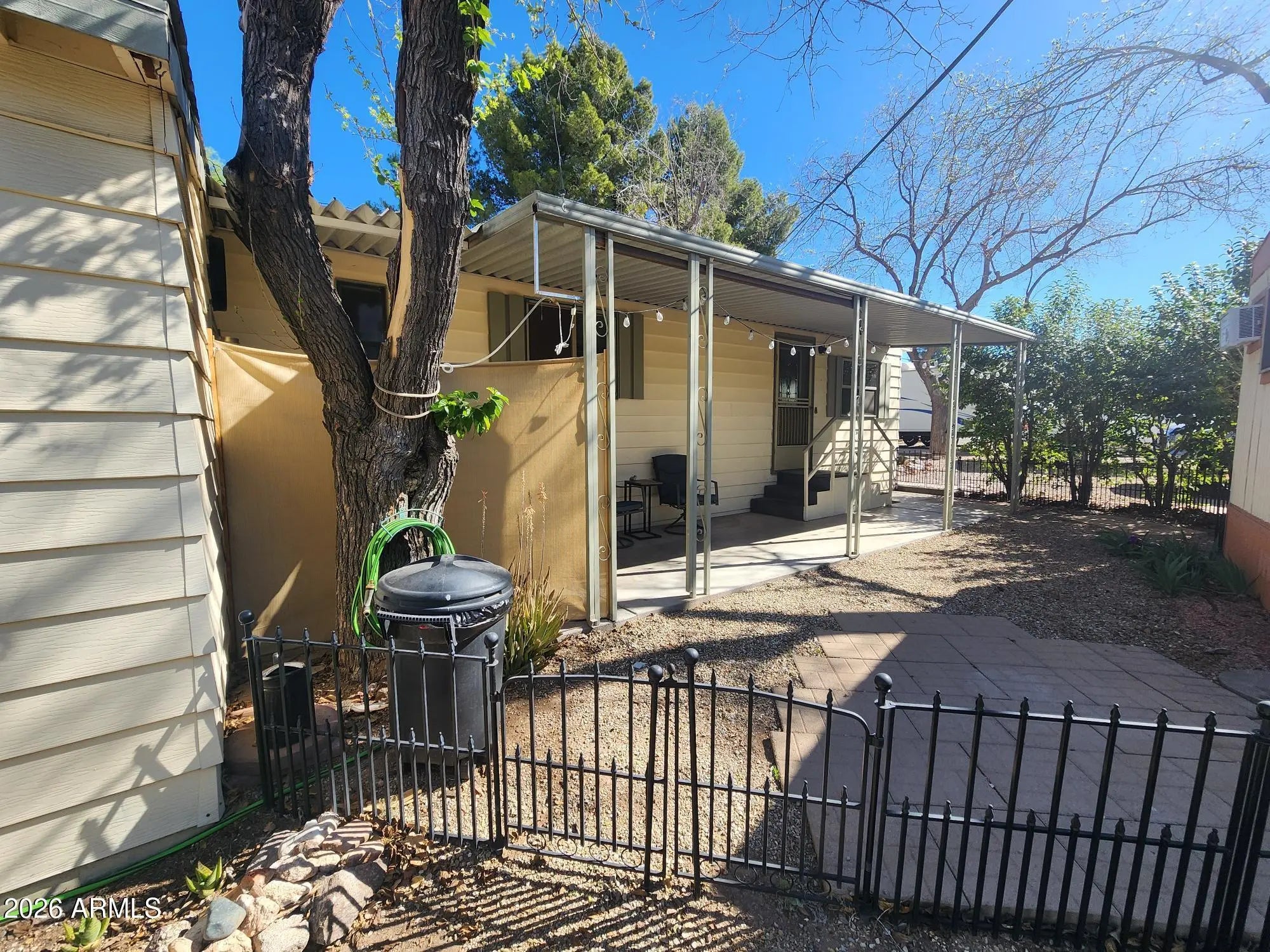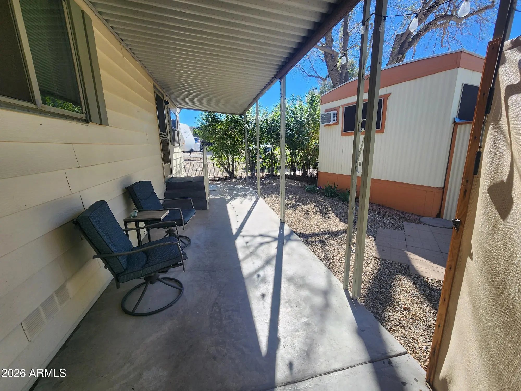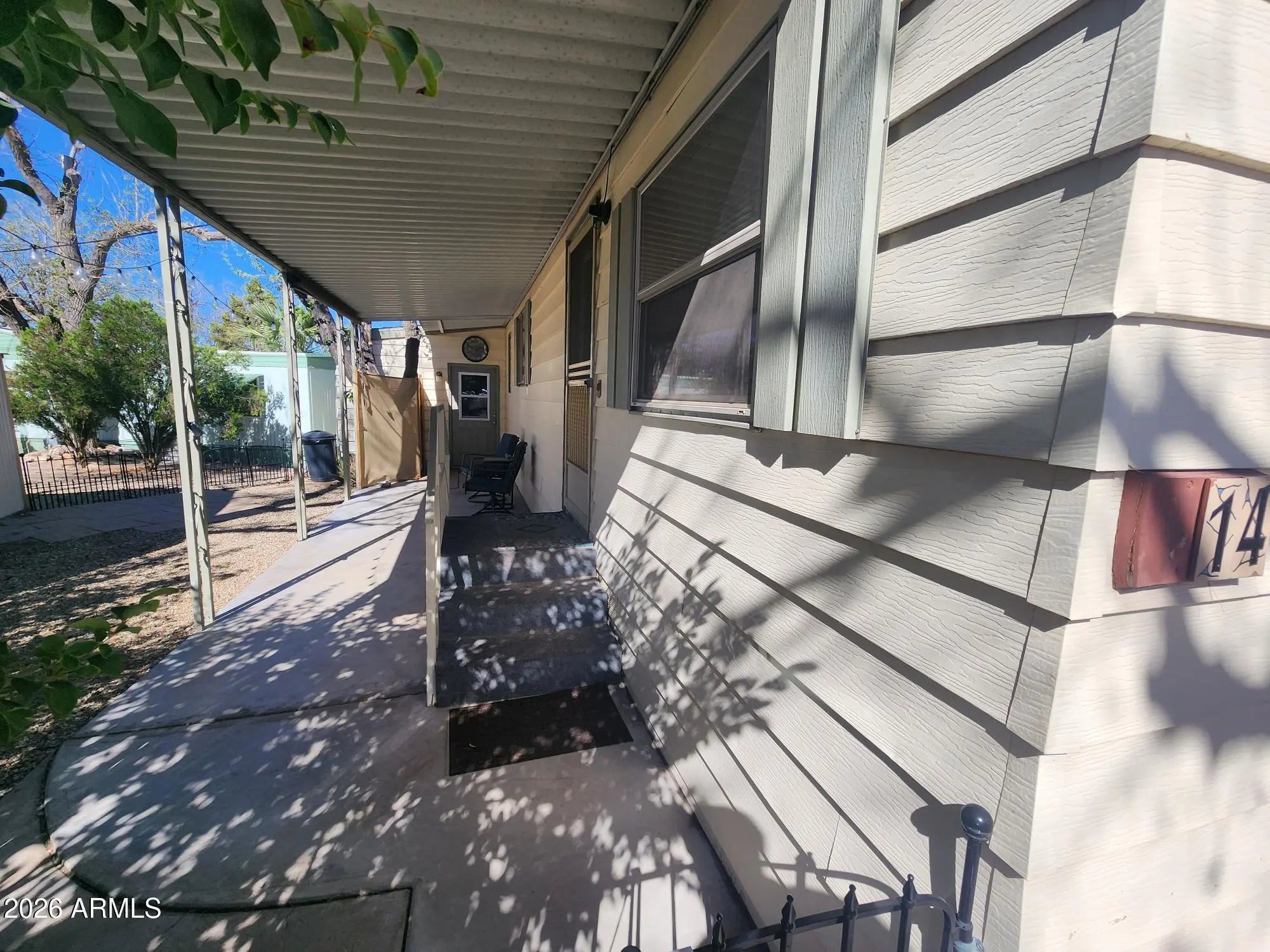 Welcome to Desert Cypress Mobile Home Park #14, where comfort and convenience meet peaceful living. This charming 1 bed, 1 bath home offers a well-designed layout with all appliances included, featuring dual pane windows and new refrigerator for efficiency. Enjoy relaxing on the covered patio surrounded by shade trees, creating a sense of privacy and seclusion. The home includes a carport, large storage shed, w/ laundry. Professionally cleaned and move-in ready, this property is ideal for those seeking low-maintenance living in a quiet, welcoming environment w/ community amenities.