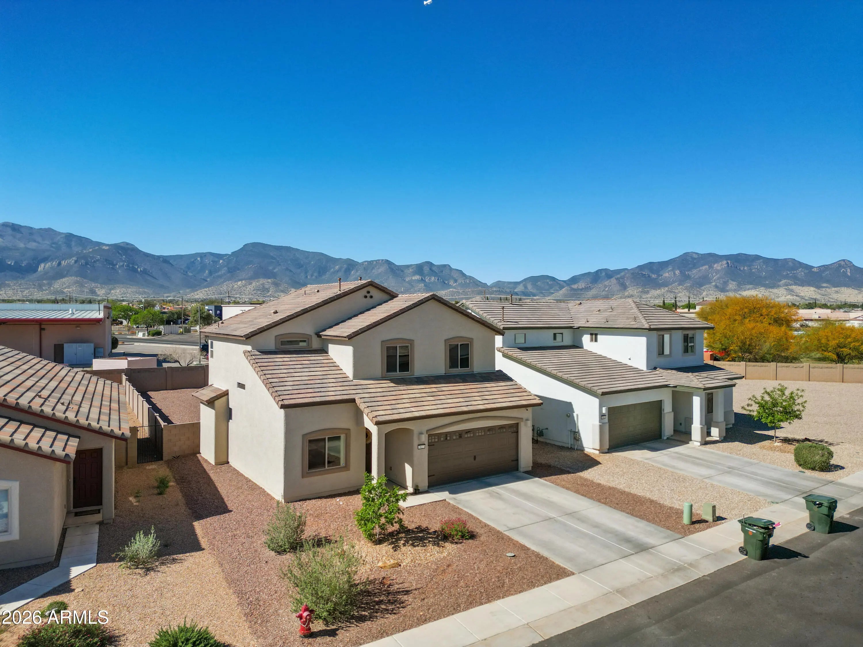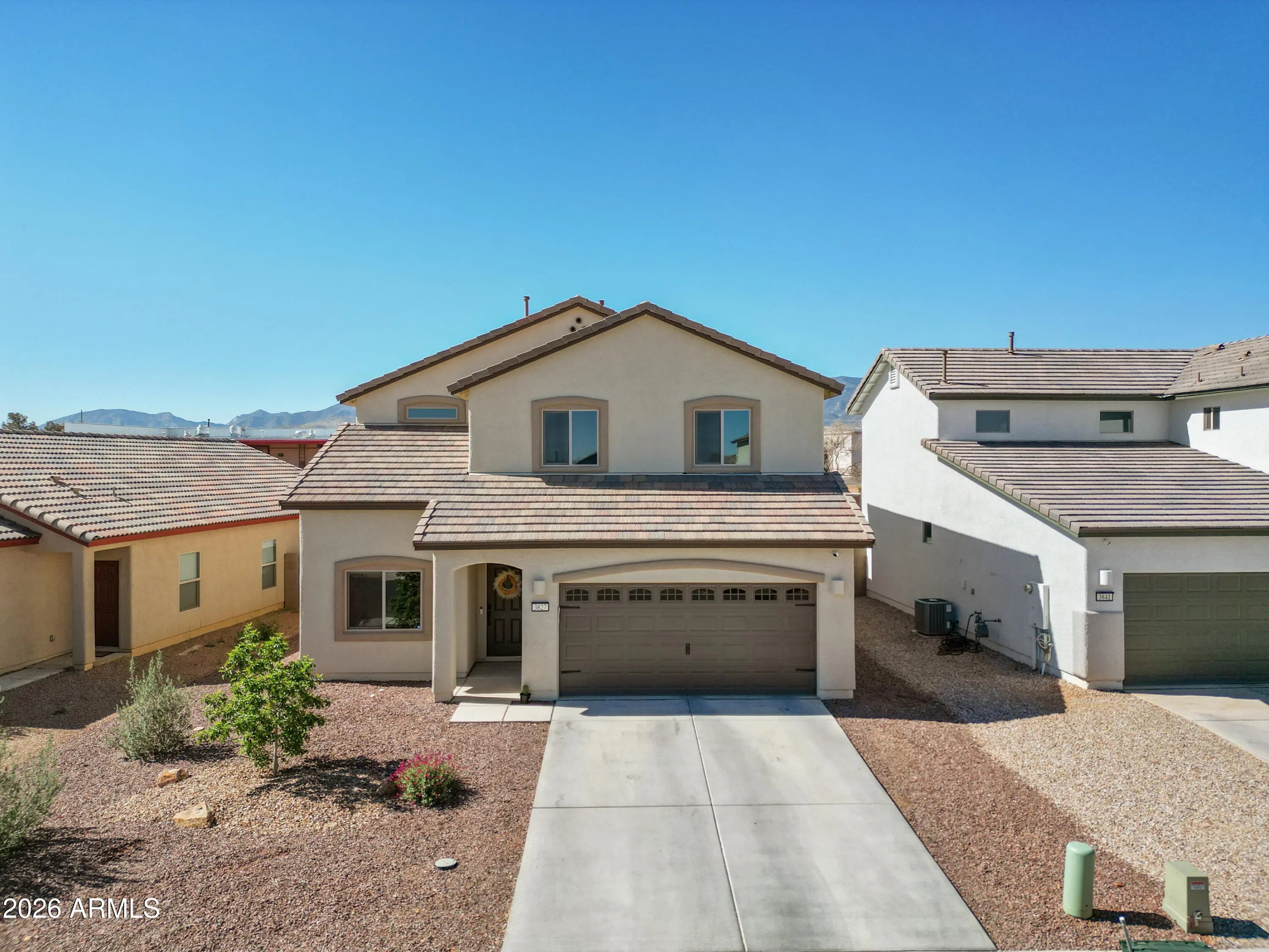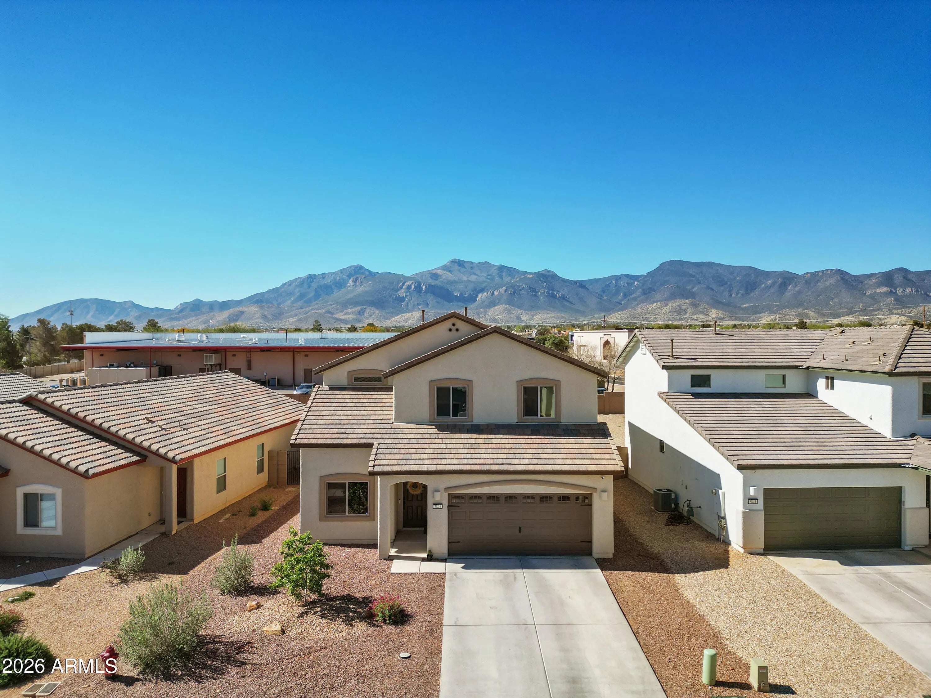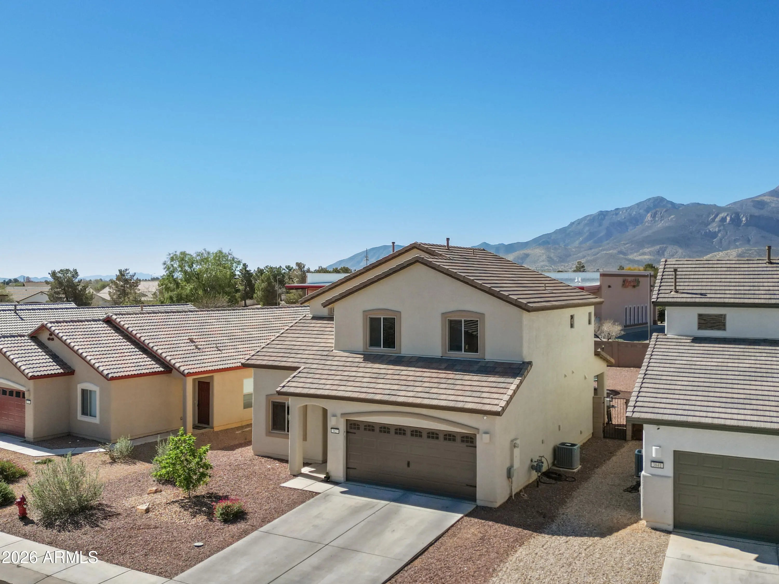 THIS IS IT! Stunning newer construction in the desirable Holiday subdivision of Sierra Vista! Built in 2022, this thoughtfully designed 4-bedroom, 2.5-bath home offers the perfect blend of modern finishes, functional layout, and beautiful mountain views. Step inside to an open-concept living space featuring upgraded tile flooring, abundant natural light, and a stylish, contemporary feel throughout. The kitchen is a true centerpiece with gorgeous granite countertops, white cabinetry, stainless steel appliances, and a spacious island--perfect for entertaining or everyday living. The flexible floor plan includes one bedroom downstairs (no built in closet) that works perfectly as a guest room, home office, or den. Upstairs, you'll find three additional bedrooms including the spacious primary suite, creating a comfortable and private retreat. The living area flows seamlessly to the backyard, where you'll enjoy a low-maintenance landscape and plenty of space to customize or relax while taking in the surrounding mountain views and Arizona sunsets. Additional highlights include a durable tile roof, modern fixtures, and energy-efficient construction. Located in a well-maintained community with access to a pool and clubhouse, this home offers both comfort and convenience just minutes from shopping, dining, and Fort Huachuca. This move-in ready home checks all the boxes--schedule your showing today! Home Starts Here!