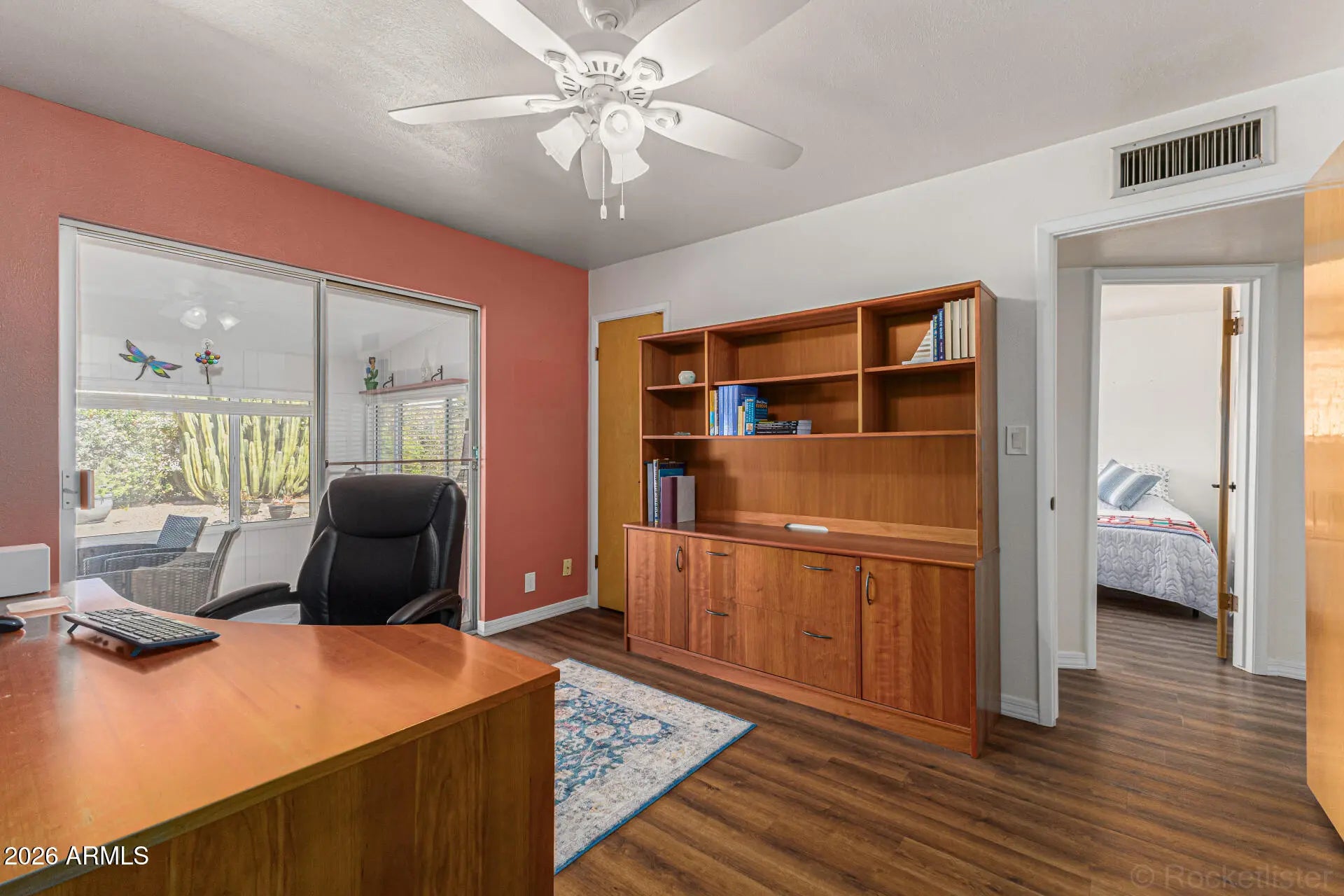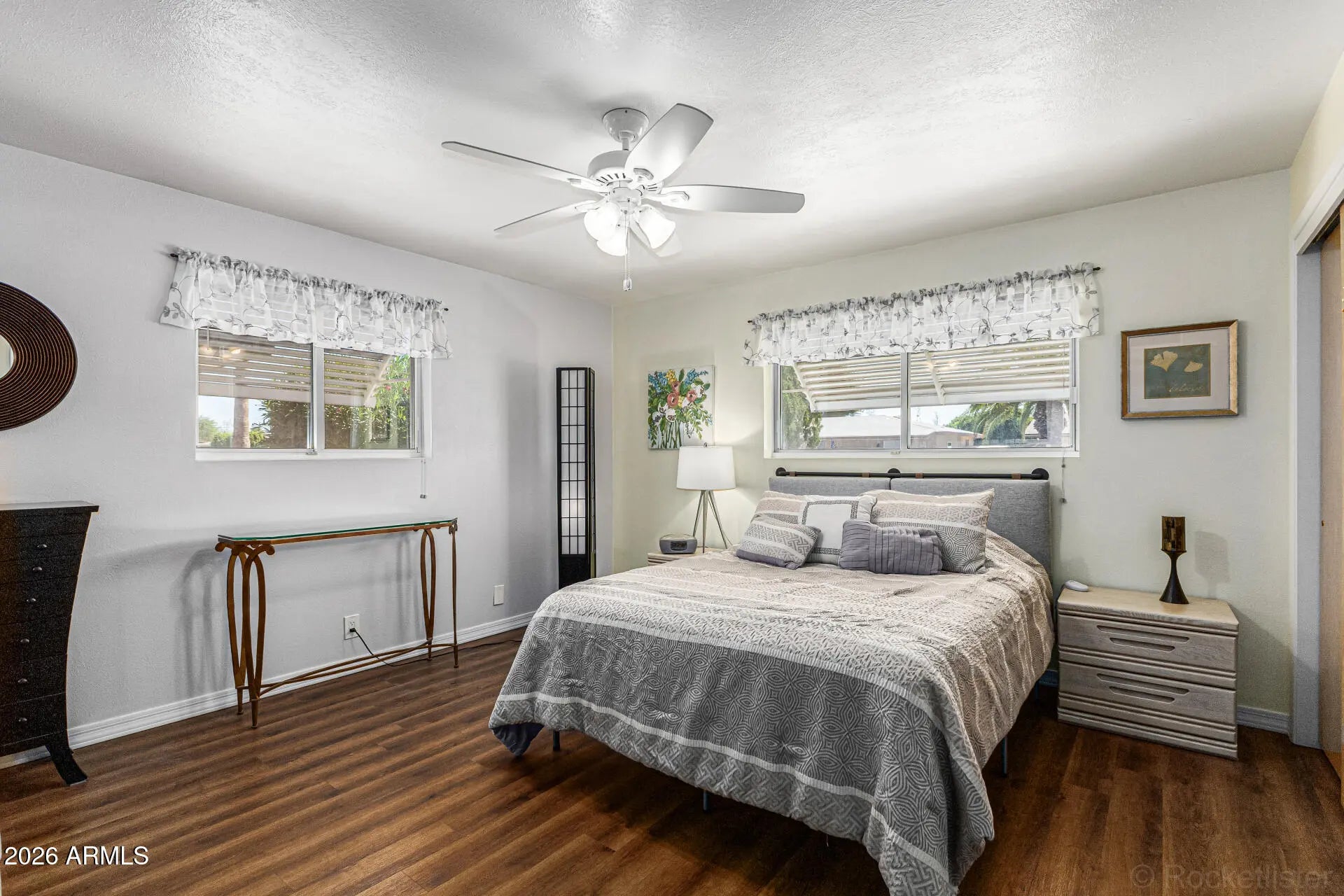 Buyer couldn't perform! Beautifully upgraded 3-bedroom, 2-bath home in the desirable Dreamland Villa 55+ community where no detail has been overlooked. From the moment you step inside, you'll appreciate the open, inviting floorplan enhanced by stunning plank flooring that flows seamlessly throughout the home. The kitchen is truly the heart of the home, featuring a spacious breakfast island, soft-close cabinetry, quartz countertops, double ovens, pendant lighting, and a dishwasher--with the refrigerator included. Thoughtful upgrades continue with ceiling fans throughout, added insulation, dual pane windows, and a tankless water heater, offering both comfort and energy efficiency. The primary suite provides a relaxing retreat with dual closets and easy access to the beautifully updated bathroom showcasing a new vanity and fixtures. A versatile third bedroom, located just off the dining area, opens to the Arizona room--perfect for use as a guest room, office, or craft space. Enjoy expanded living with the light and bright Arizona room, ideal for relaxing or entertaining, plus an additional covered and enclosed patio offering endless possibilities for hobbies or gatherings. Step outside to a partially fenced backyard with lush greenery and plenty of space to create your own outdoor oasis--perfect for enjoying Arizona's beautiful weather.