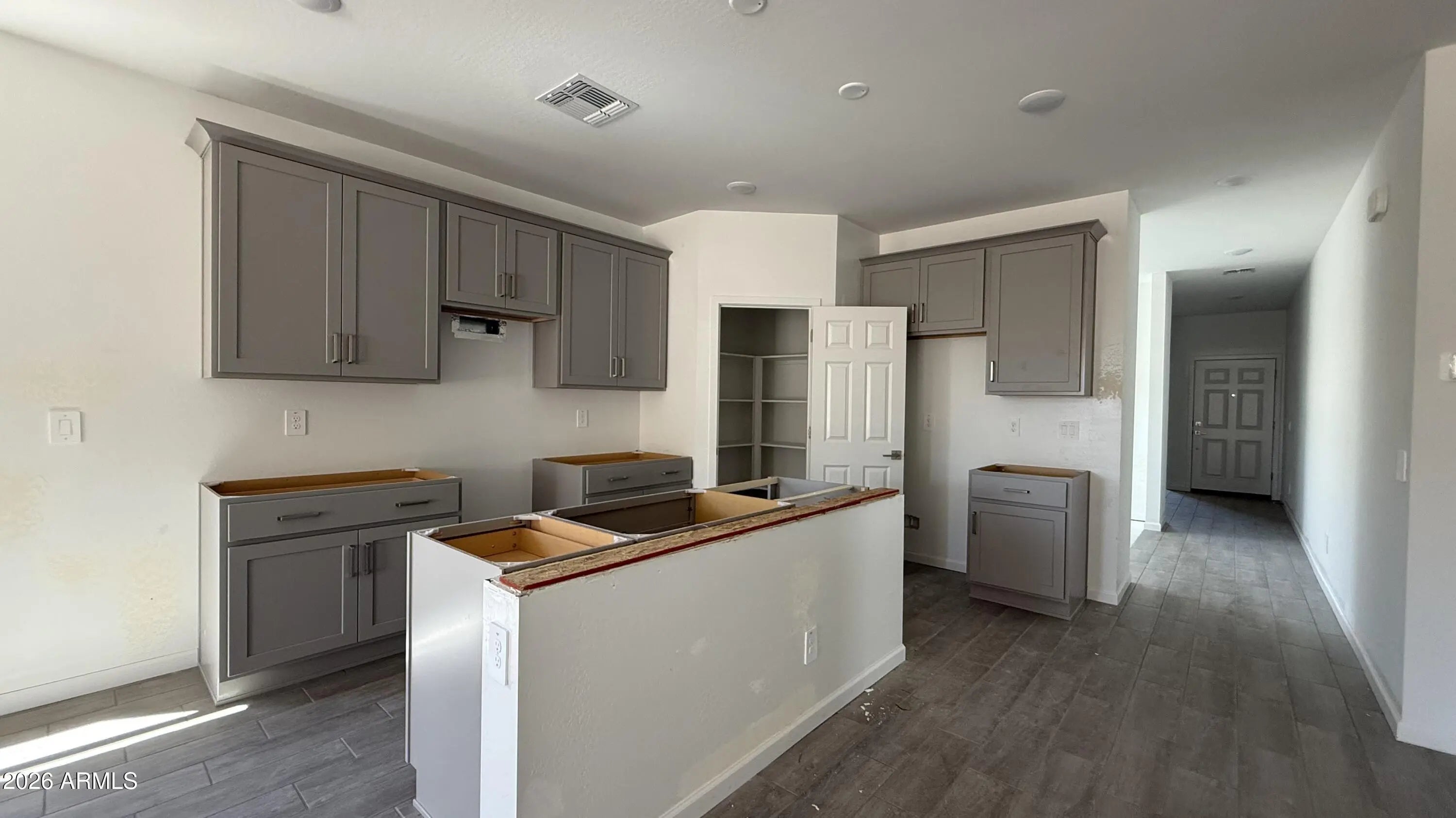 The Poppy at Amarillo Creek - Alba in Maricopa featuring a Modern Desert elevation. This 2,071 sq ft home offers 4 beds, 3 baths, and den, with a 2-car garage. The open-concept layout connects the kitchen, dining, and great room. The kitchen showcases the Milan Collection finishes including grey 42'' cabinets, white sand quartz countertops, white offset 4x16 tile backsplash, and brushed nickel hardware. Flooring includes 7x22 warm taupe in main areas and plush Bare Mineral Carpet in bedrooms. The spacious primary suite features dual-sinks, walk-in shower, linen closet, water closet, and walk-in closet. Additional highlights include washer, dryer, and fridge included as well as blinds on all windows, pendant light pre-wires, soft water loop, and garage door opener.