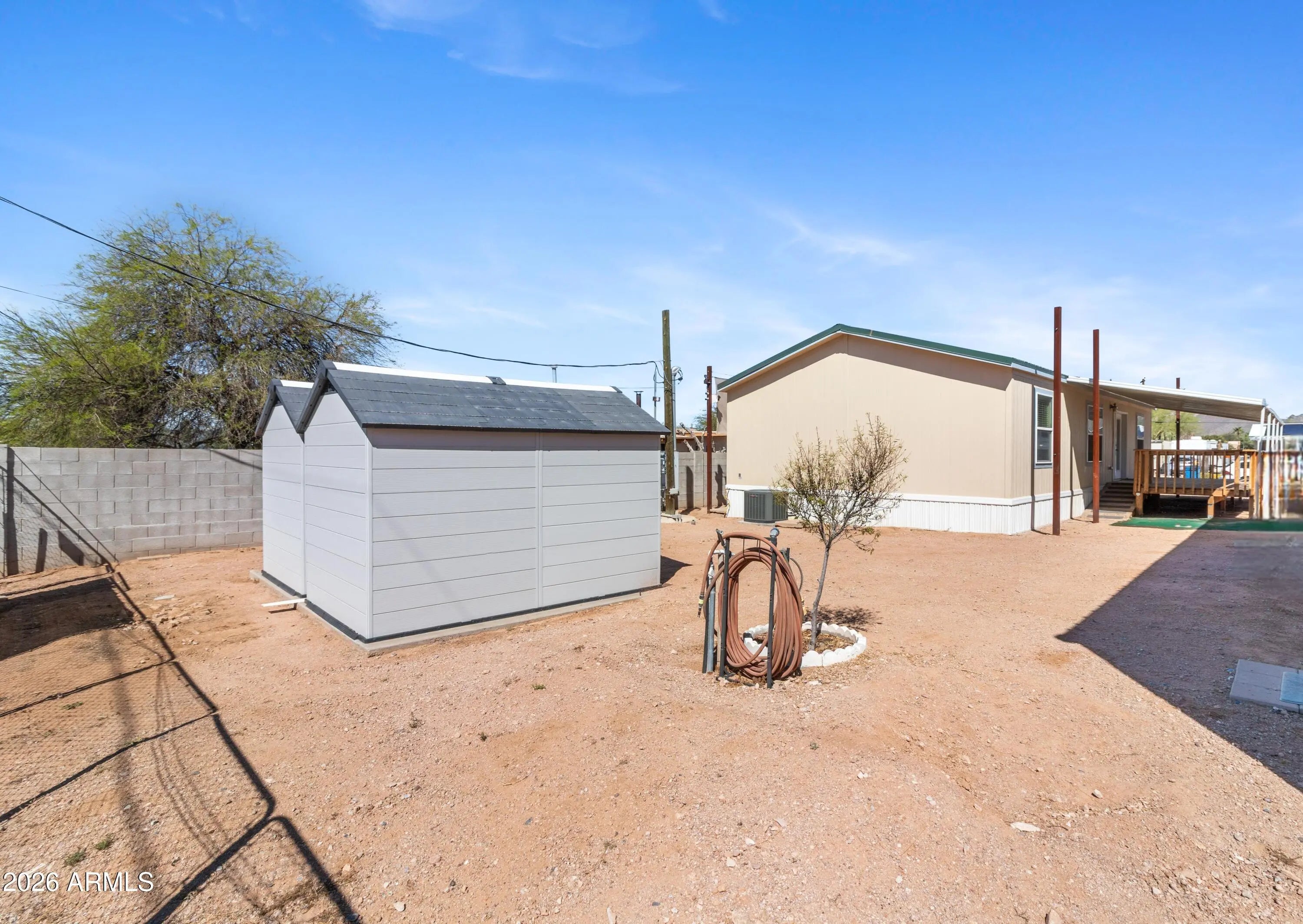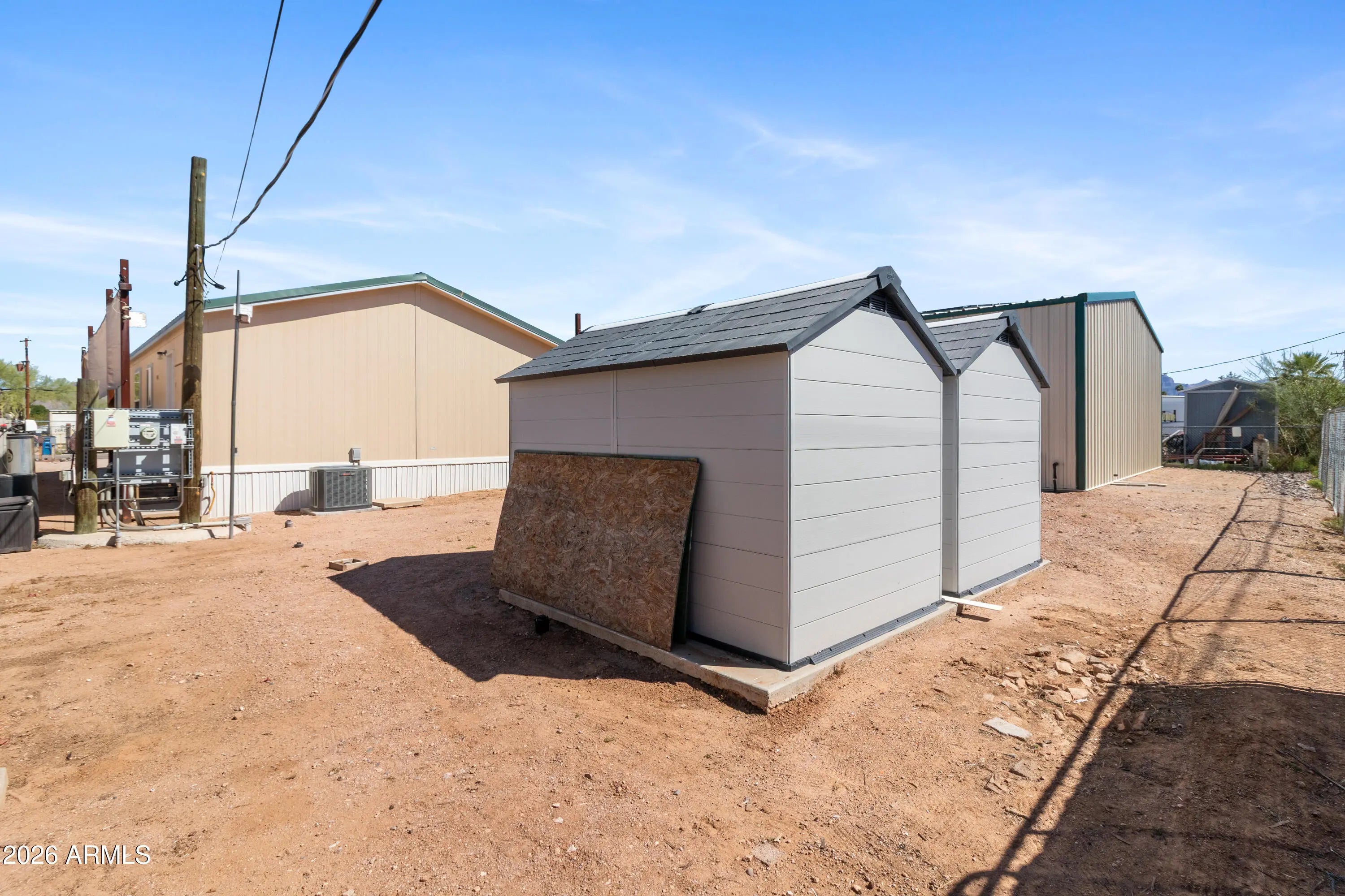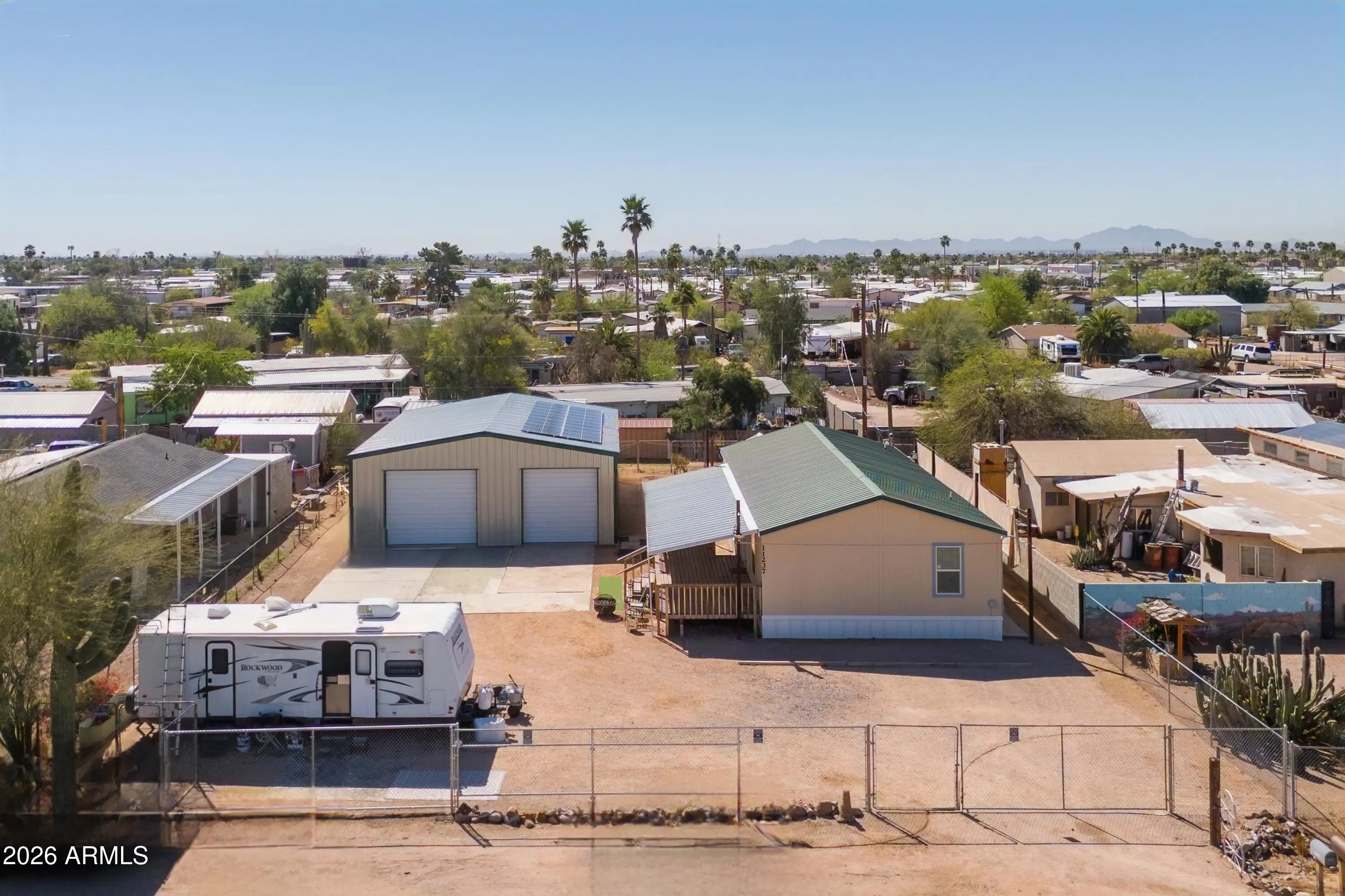 Unique live/work property on a quarter-acre lot with no HOA. This 2019, 3BR/2BA, 1,200sf manufactured home is plumbed for gas/electric appliances, has a long-lasting metal roof, PAID solar, RV hookups, & a covered deck with a wheelchair-access ramp to enjoy AZ evenings on. The other standout feature is the 1,575sf insulated steel shop / detached garage (approx. 45' x 35') with 12ft eave height, 2 roll-up doors, plumbing (toilet, sink, and washer/dryer hookups), & space for multiple vehicles, workshop, storage, RV parking, boat parking, home gym, home business use, or a future guest house / casita. This is more than just a home - it's a property with possibilities.
