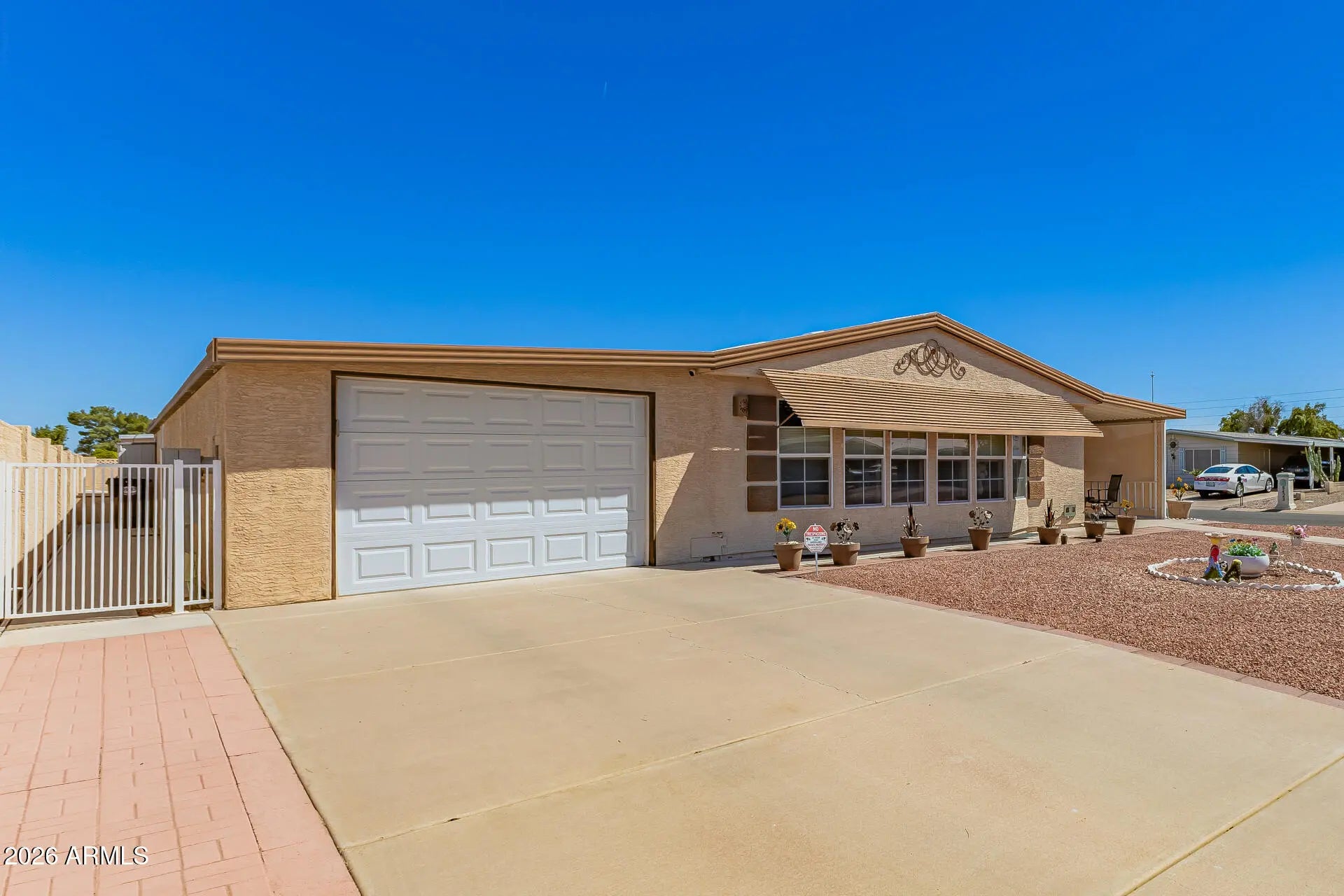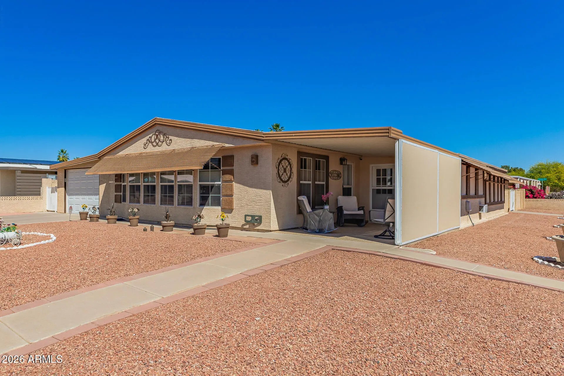 This well maintained 2 bedroom manufactured home features a large living room, formal dining area, additional den/office space, and an enclosed Arizona room providing plenty of space for relaxing or entertaining. The kitchen was updated with all new cabinets featuring soft close doors & drawers and quartz countertops. The spacious primary suite includes a steam and jetted tub/shower for a spa-like experience. Exterior features include a stuccoed finish, a front patio with outdoor shades for added privacy and comfort, and an extended 2 car garage with an extra storage room with direct golf cart access. Enjoy low-maintenance living with access to golf, clubhouse, pools, fitness center, pickleball, and many social activities that make Sun Lakes a premier active adult community.