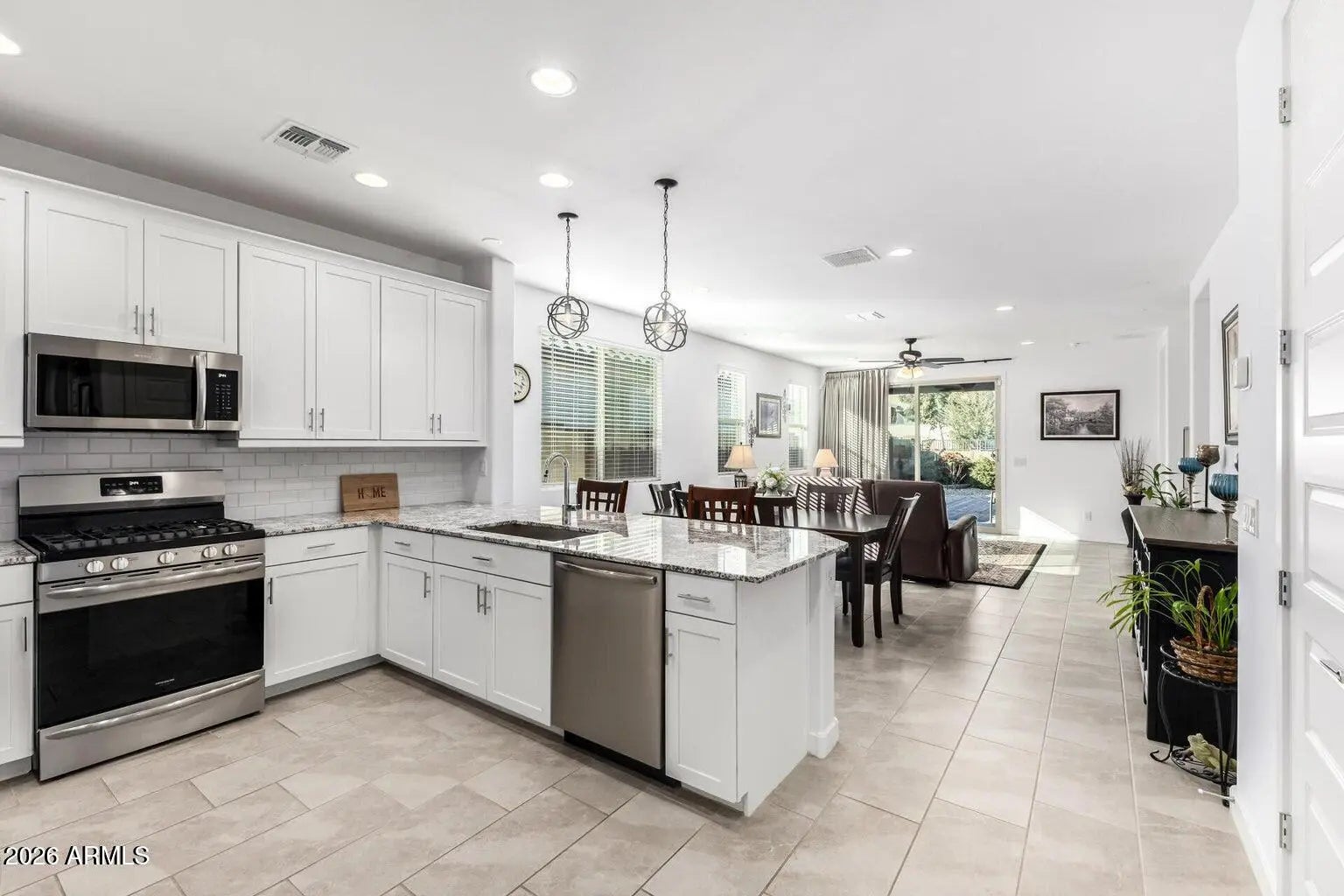 Beautiful newer (2024) 5 bedroom 3 bath, tucked inside a gated community. Bright, super clean, Spacious layout, with beautiful tile flooring throughout the main living areas and upgraded finishes throughout. Kitchen with eat-in island, granite countertops, a walk-in pantry, stainless-steel appliances, and a gas range. You will find a private bedroom and full bath near the front of the home, perfect for a home office, guests or multi-generational living. There is space for everyone and thoughtful storage throughout. Low maintenance landscaped backyard, including covered patio, pavers and backing up to a walking path. Washer/Dryer included. N/S exposure. This is pet free home. Good job and credit score a must. More pics available.