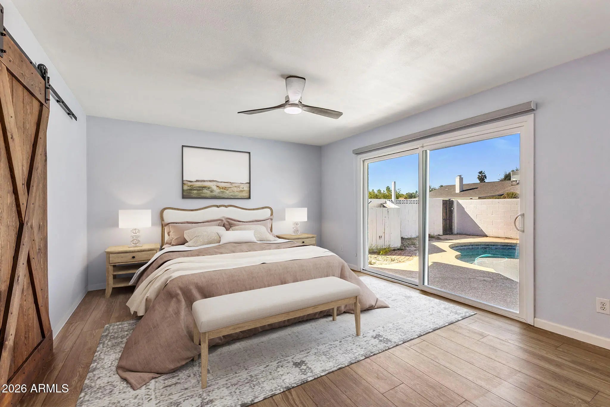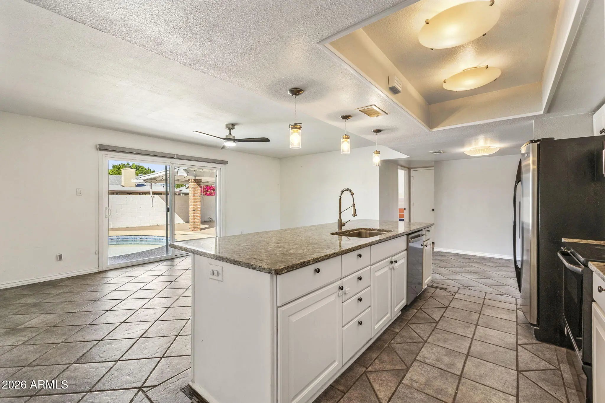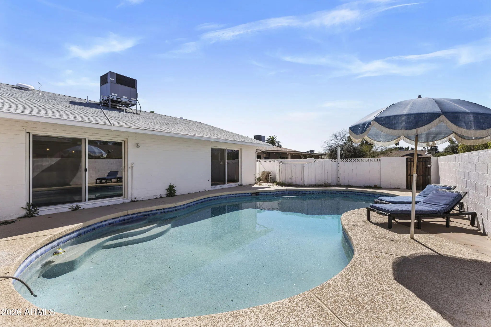 Prime Tempe location! Major updates already completed including roof, AC, water heater, & Pella windows/sliding doors. Situated on a quiet cul-de-sac with a charming white picket fenced front yard & sparkling pool. The split floor plan features a sunken living room, open kitchen with island, granite countertops, pendant lighting, farmhouse sink, stainless appliances + fridge, & an oversized family room. Large laundry/mud room with washer, dryer, storage, & side exit. Expanded primary bath offers barn doors, dual sinks, large tiled shower, & backyard access. Private yard includes a large covered patio, pergola, & citrus trees. Enjoy a pebble tech diving pool & side play yard with grass. Conveniently located to US-60, minutes to Sky Harbor Airport & Kiwanis Park.
