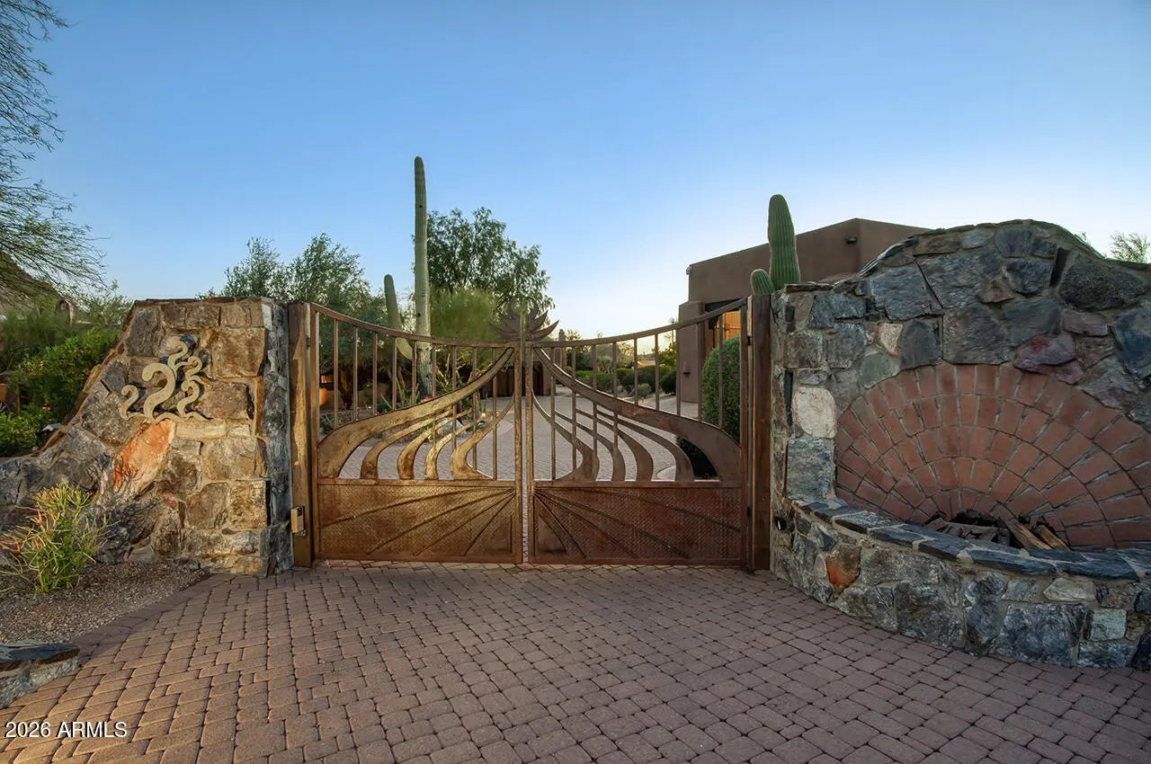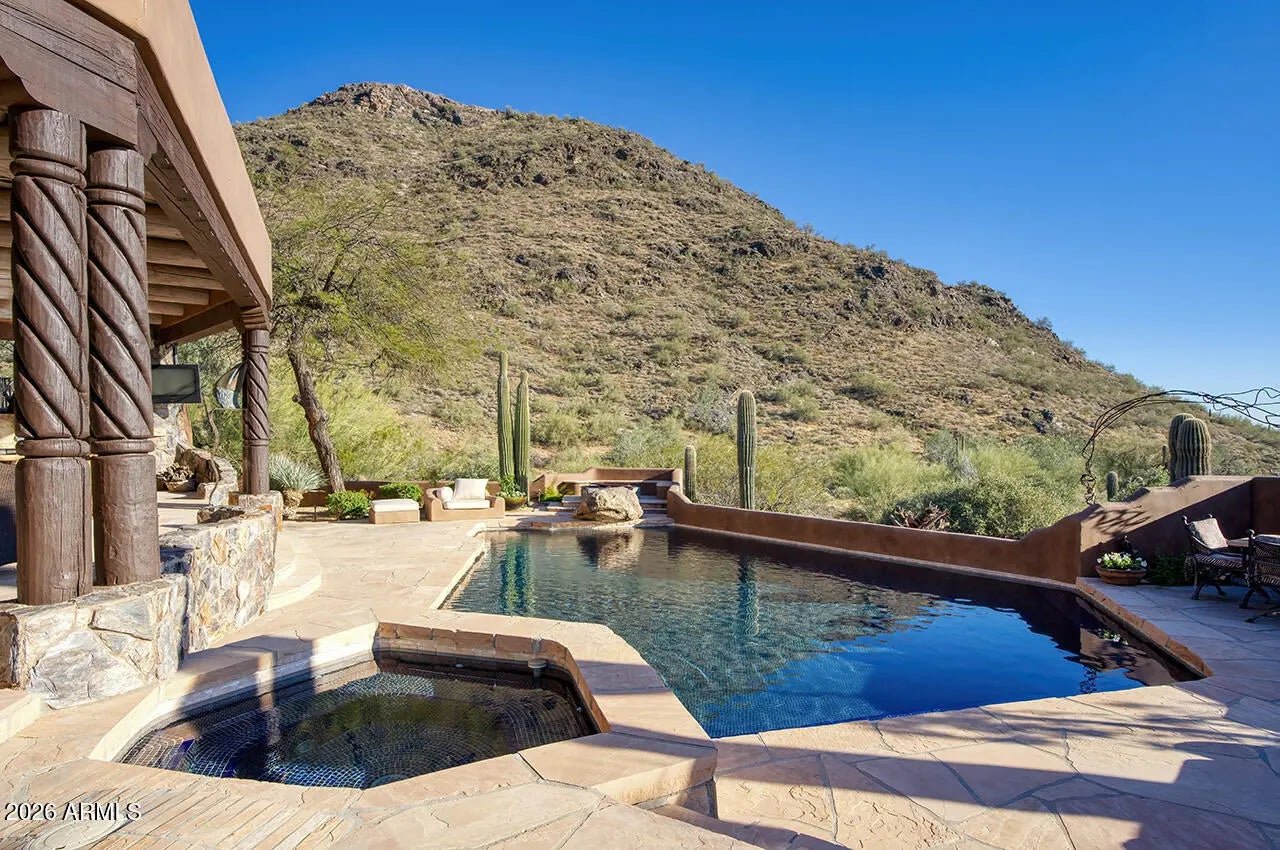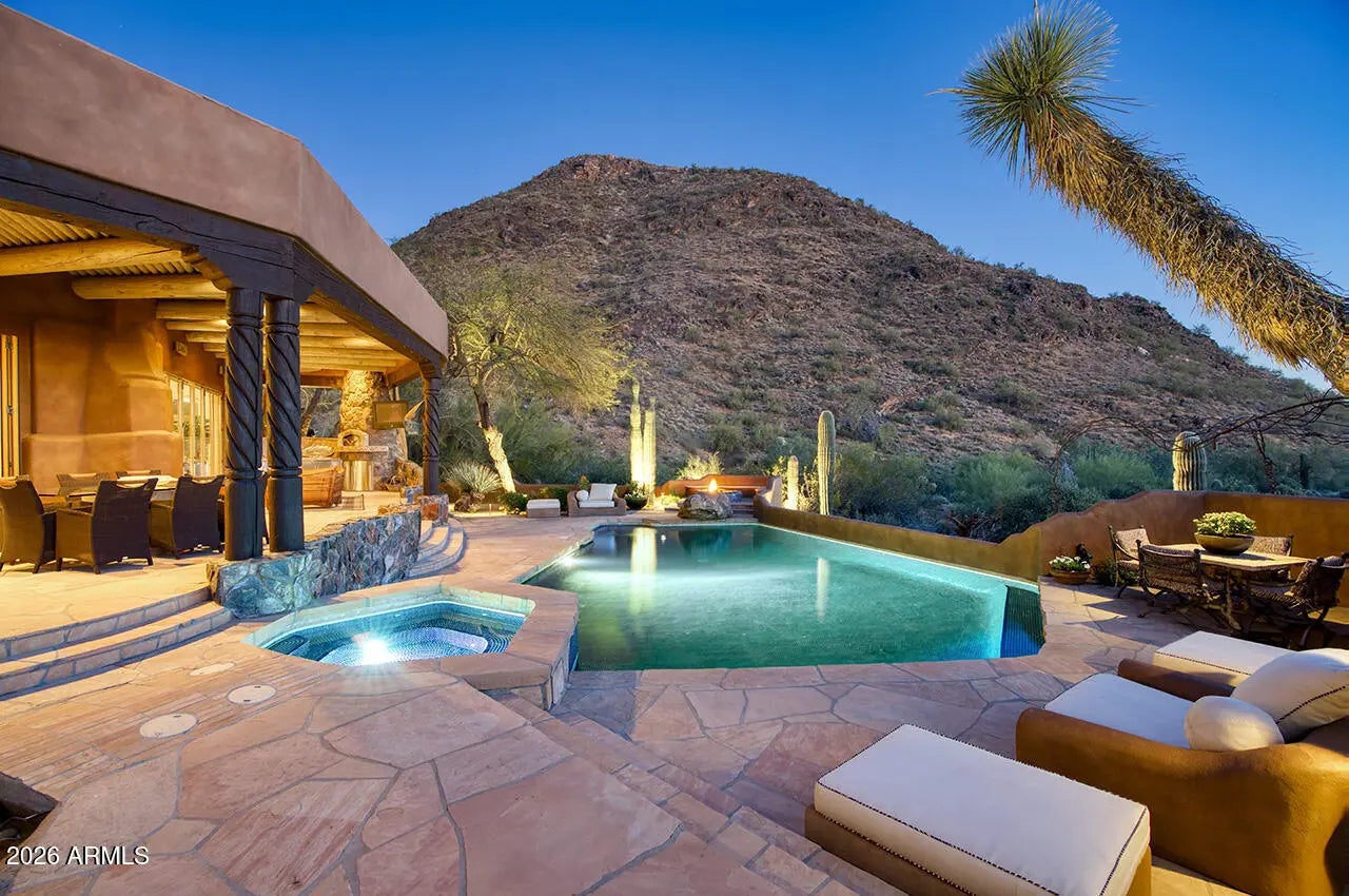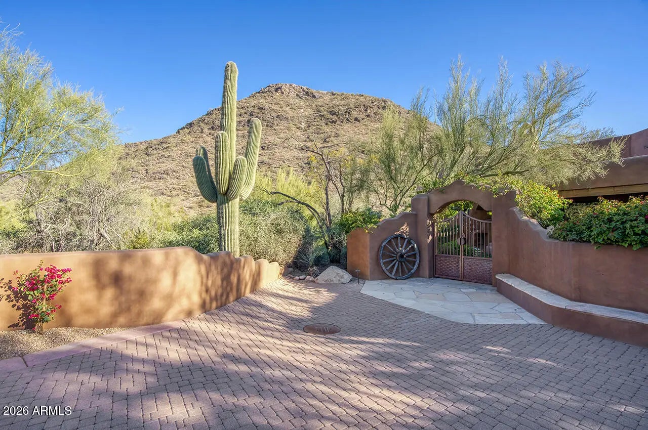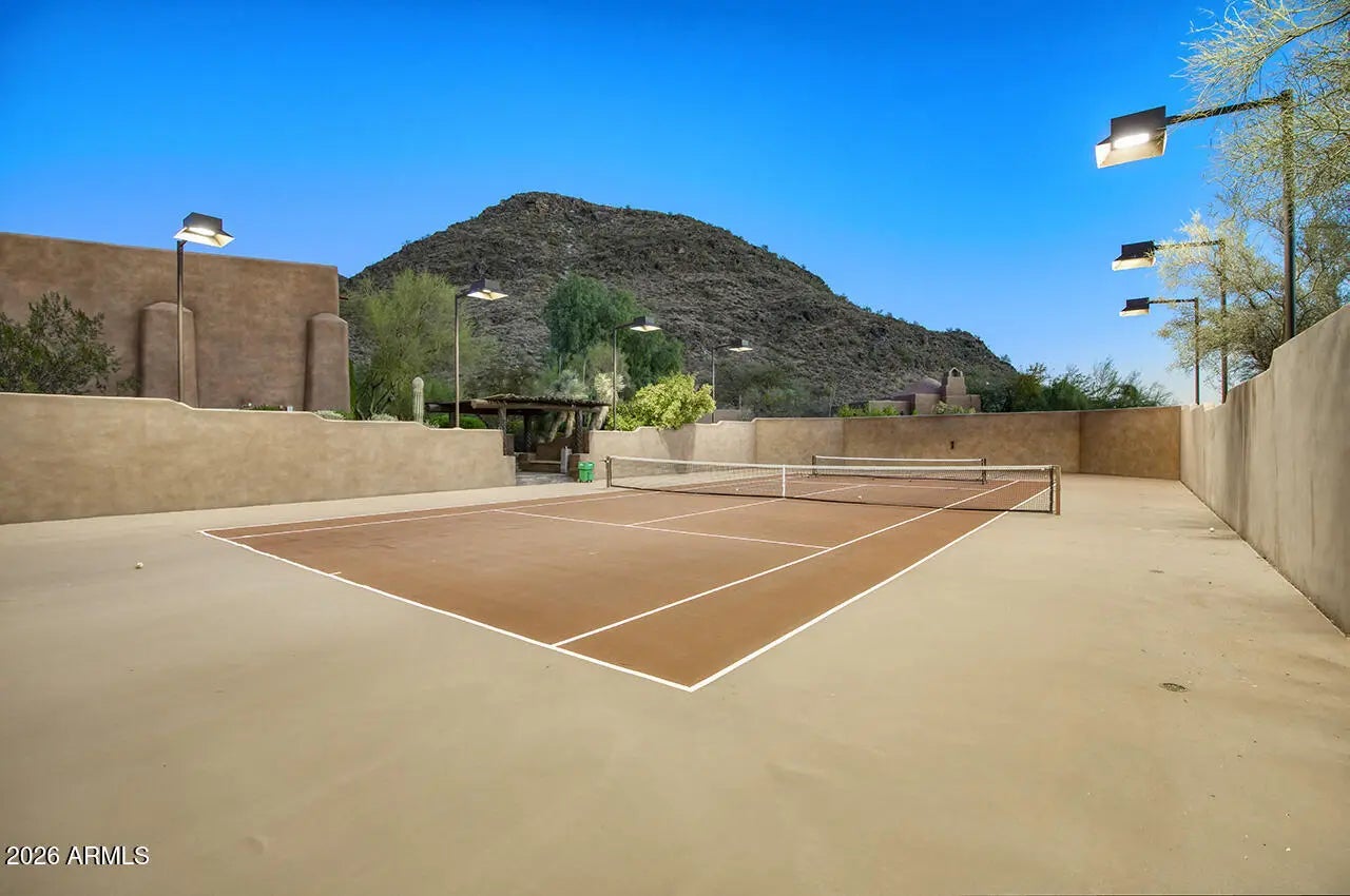 Tucked within the esteemed custom-home community of Pinnacle Peak Heights, Desert Tears is a truly extraordinary gated estate set on nearly seven acres at the base of the McDowell Mountains, where the land rises into one of the area's peaks and captures sweeping panoramic city-light views and the beauty of the Sonoran Desert. Rich with character and timeless charm, this one-of-a-kind residence is defined by artisan craftsmanship and distinctive architectural details throughout. Its name, Desert Tears, offers a subtle nod to the beauty and stillness of the desert landscape that inspired its creation. Thoughtfully designed for both elevated entertaining and comfortable everyday living, the home offers a desirable and dynamic layout. The primary suite is privately situated on the upper level opening to breathtaking valley, city-light, and mountain views--creating a serene retreat that feels both elevated and connected to the surrounding landscape. Two additional en-suite bedrooms are located on the main level, along with a separate guest house on the property, providing ideal accommodations for family and guests. At the heart of the home, a truly exceptional commercial-grade kitchen caters to the culinary enthusiast, featuring top-tier Montague appliances, infrared gas broilers, a French hot top with wok ring, six-burner configuration, and three ovens. A striking horseshoe bar seamlessly connects the kitchen and main living spaces, enhancing the home's natural flow and creating an inviting environment for gathering and entertaining. A 1,000-bottle temperature-controlled wine cellar further elevates the experience. Seamless indoor-outdoor living is showcased through a beautiful Arizona room that opens to expansive desert and city views beyond. Throughout the home, richly layered finishes include custom beamed ceilings, domed brickwork, and extensive stone elements--remarkably sourced directly from the property itself--creating an authentic connection to the surrounding McDowell Mountain terrain. The grounds are equally captivating, featuring seven fireplaces, two fire pits, and a stunning heated all-tile pool and spa designed for both relaxation and recreation. The approximately 9.5-foot diving pool is complemented by a sculptural, custom-designed diving feature, while an intriguing fire feature at the entry gate creates a dramatic and memorable arrival. A sunken, lighted tennis court--recently refurbished and thoughtfully designed for both tennis and pickleball--adds to the estate's exceptional recreational offerings. Car enthusiasts will appreciate the impressive 13-car garage capacity, highlighted by a show-stopping nine-car showcase garage complete with a modular kitchen and extensive storage, creating a truly unique space for display, entertaining, and functionality. Private, distinctive, and masterfully crafted, Desert Tears is a rare Scottsdale estate that blends architectural soul, natural beauty, and exceptional livability into an offering of uncommon significance.