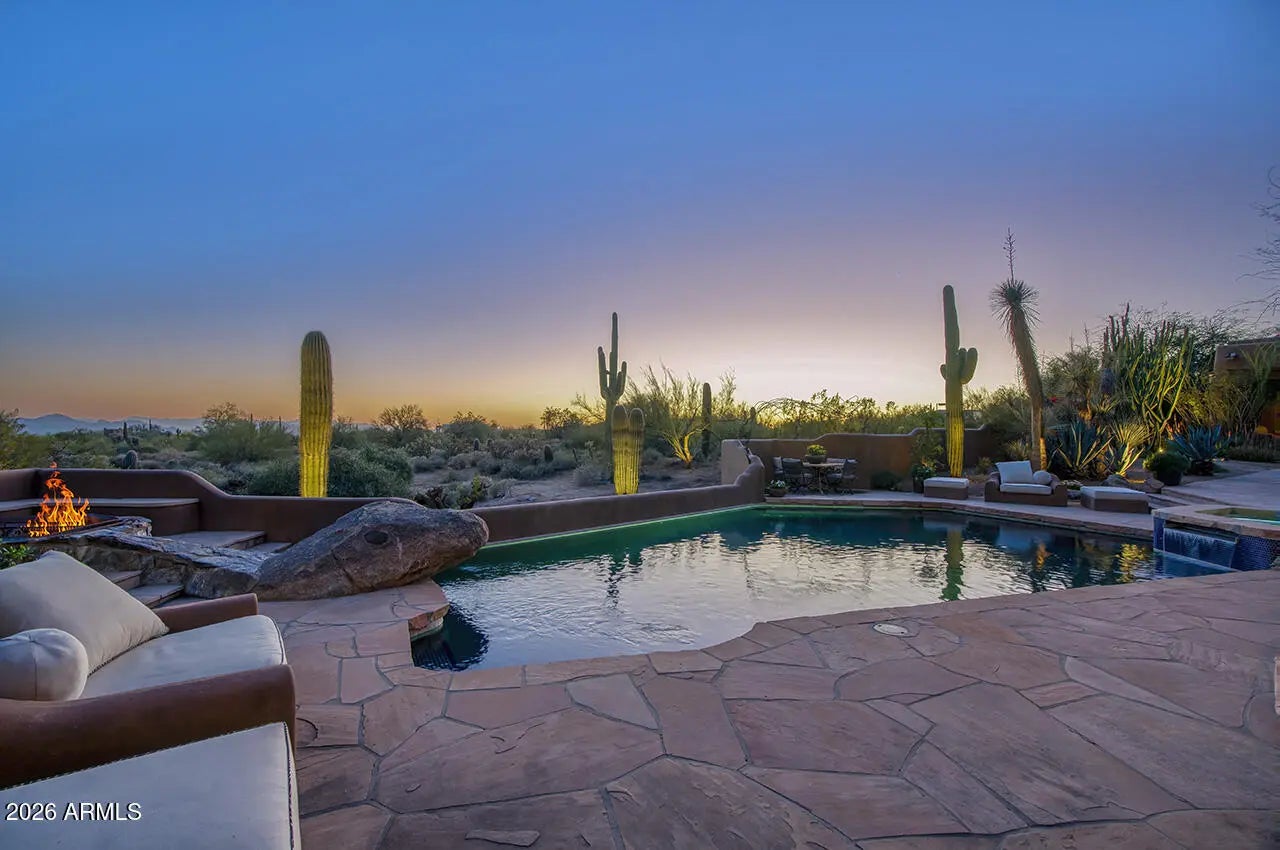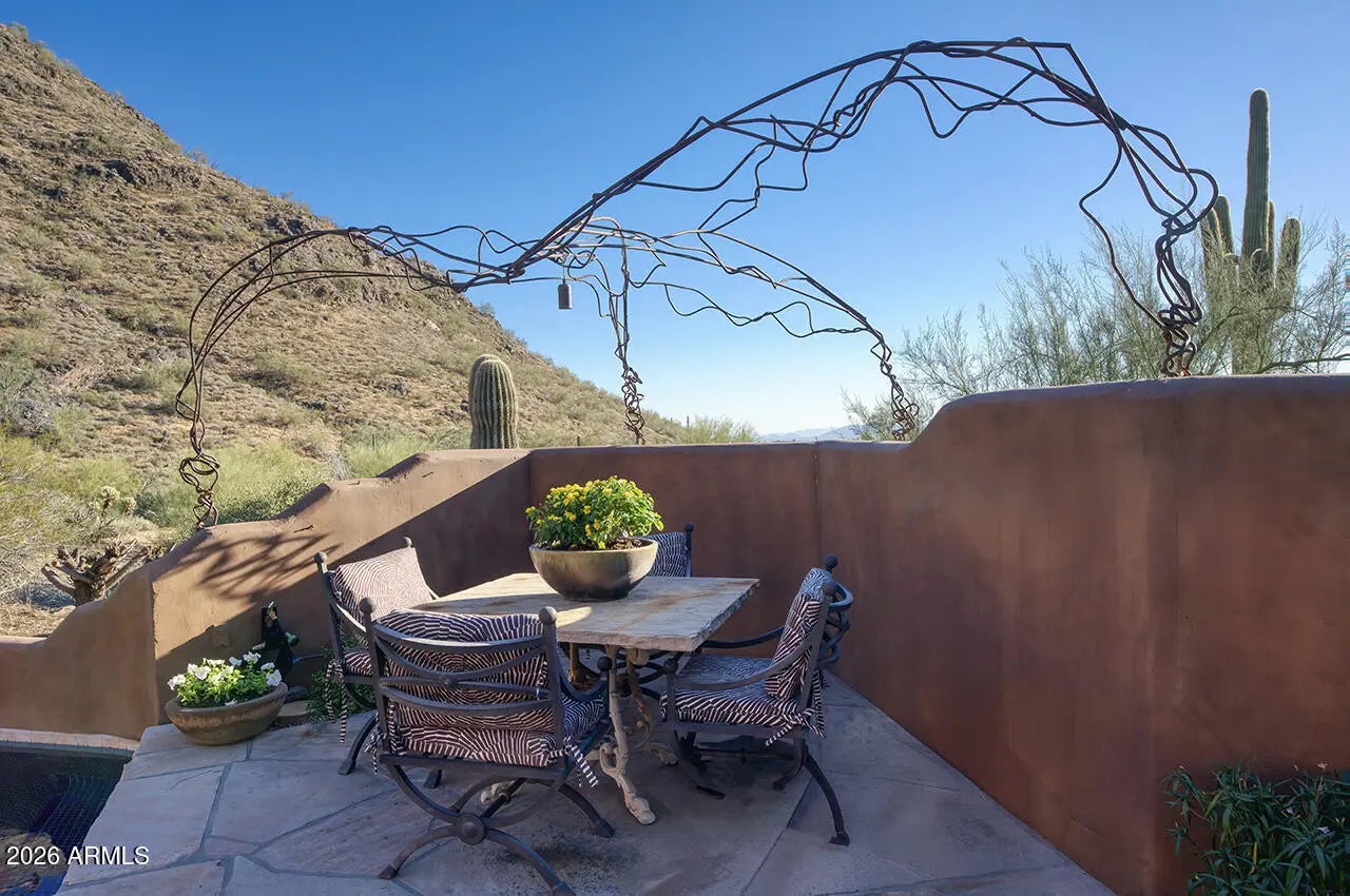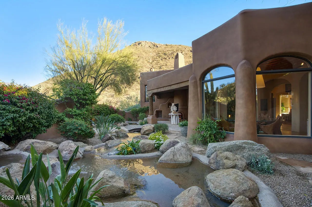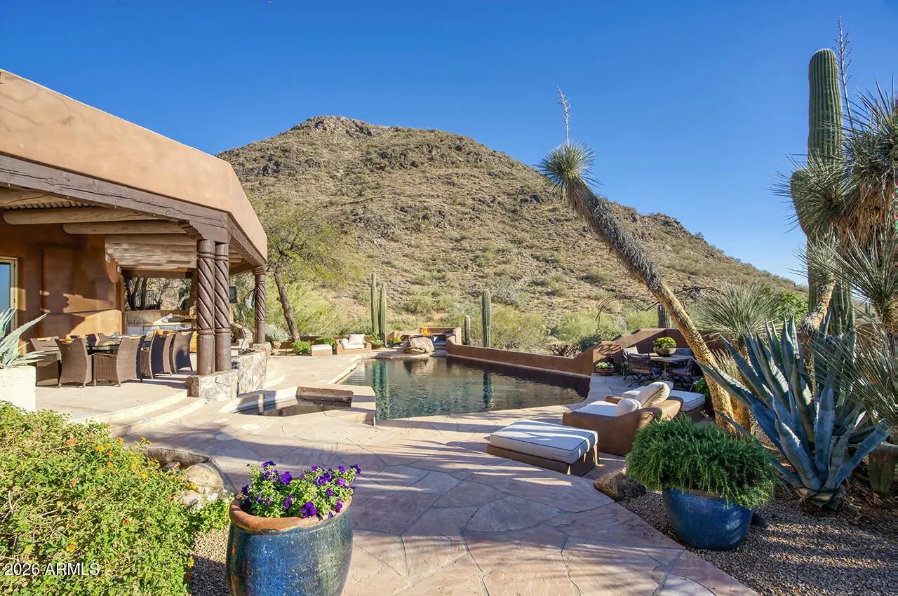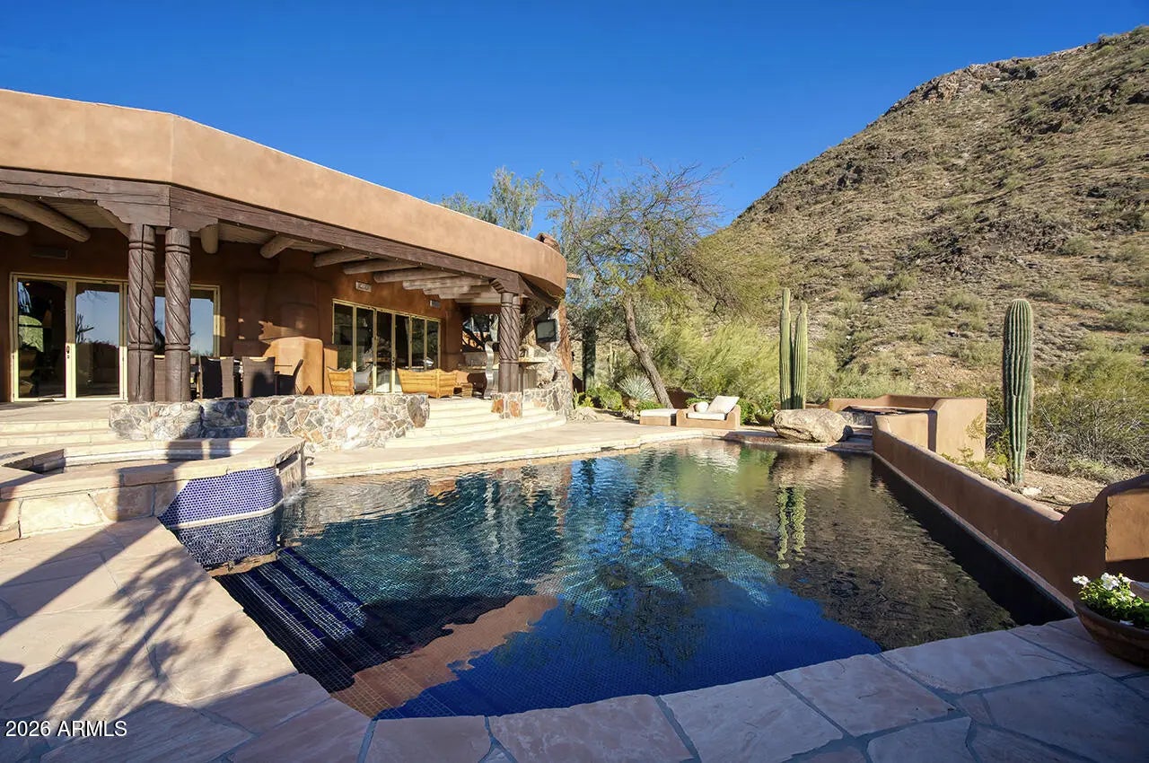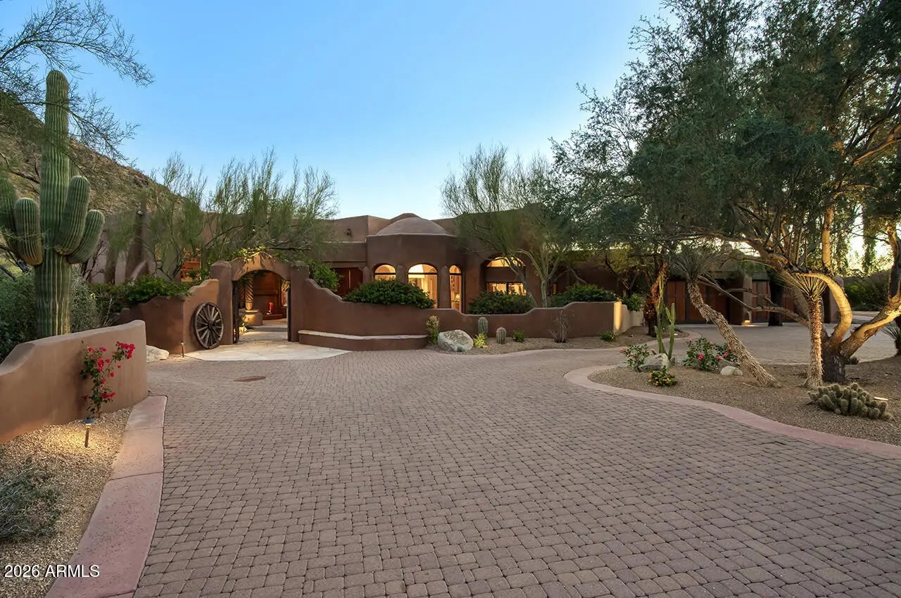 Tucked within the esteemed custom-home community of Pinnacle Peak Heights, Desert Tears is a truly extraordinary gated estate set on nearly seven acres at the base of the McDowell Mountains, where the land rises into one of the area's peaks and captures sweeping panoramic city-light views and the beauty of the Sonoran Desert. Rich with character and timeless charm, this one-of-a-kind residence is defined by artisan craftsmanship and distinctive architectural details throughout. Its name, Desert Tears, offers a subtle nod to the beauty and stillness of the desert landscape that inspired its creation. Thoughtfully designed for both elevated entertaining and comfortable everyday living, the home offers a desirable and dynamic layout. The primary suite is privately situated on the upper level opening to breathtaking valley, city-light, and mountain views--creating a serene retreat that feels both elevated and connected to the surrounding landscape. Two additional en-suite bedrooms are located on the main level, along with a separate guest house on the property, providing ideal accommodations for family and guests. At the heart of the home, a truly exceptional commercial-grade kitchen caters to the culinary enthusiast, featuring top-tier Montague appliances, infrared gas broilers, a French hot top with wok ring, six-burner configuration, and three ovens. A striking horseshoe bar seamlessly connects the kitchen and main living spaces, enhancing the home's natural flow and creating an inviting environment for gathering and entertaining. A 1,000-bottle temperature-controlled wine cellar further elevates the experience. Seamless indoor-outdoor living is showcased through a beautiful Arizona room that opens to expansive desert and city views beyond. Throughout the home, richly layered finishes include custom beamed ceilings, domed brickwork, and extensive stone elements--remarkably sourced directly from the property itself--creating an authentic connection to the surrounding McDowell Mountain terrain. The grounds are equally captivating, featuring seven fireplaces, two fire pits, and a stunning heated all-tile pool and spa designed for both relaxation and recreation. The approximately 9.5-foot diving pool is complemented by a sculptural, custom-designed diving feature, while an intriguing fire feature at the entry gate creates a dramatic and memorable arrival. A sunken, lighted tennis court--recently refurbished and thoughtfully designed for both tennis and pickleball--adds to the estate's exceptional recreational offerings. Car enthusiasts will appreciate the impressive 13-car garage capacity, highlighted by a show-stopping nine-car showcase garage complete with a modular kitchen and extensive storage, creating a truly unique space for display, entertaining, and functionality. Private, distinctive, and masterfully crafted, Desert Tears is a rare Scottsdale estate that blends architectural soul, natural beauty, and exceptional livability into an offering of uncommon significance.
