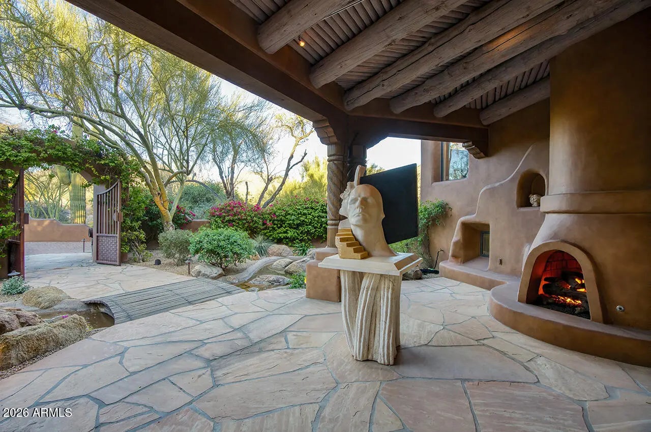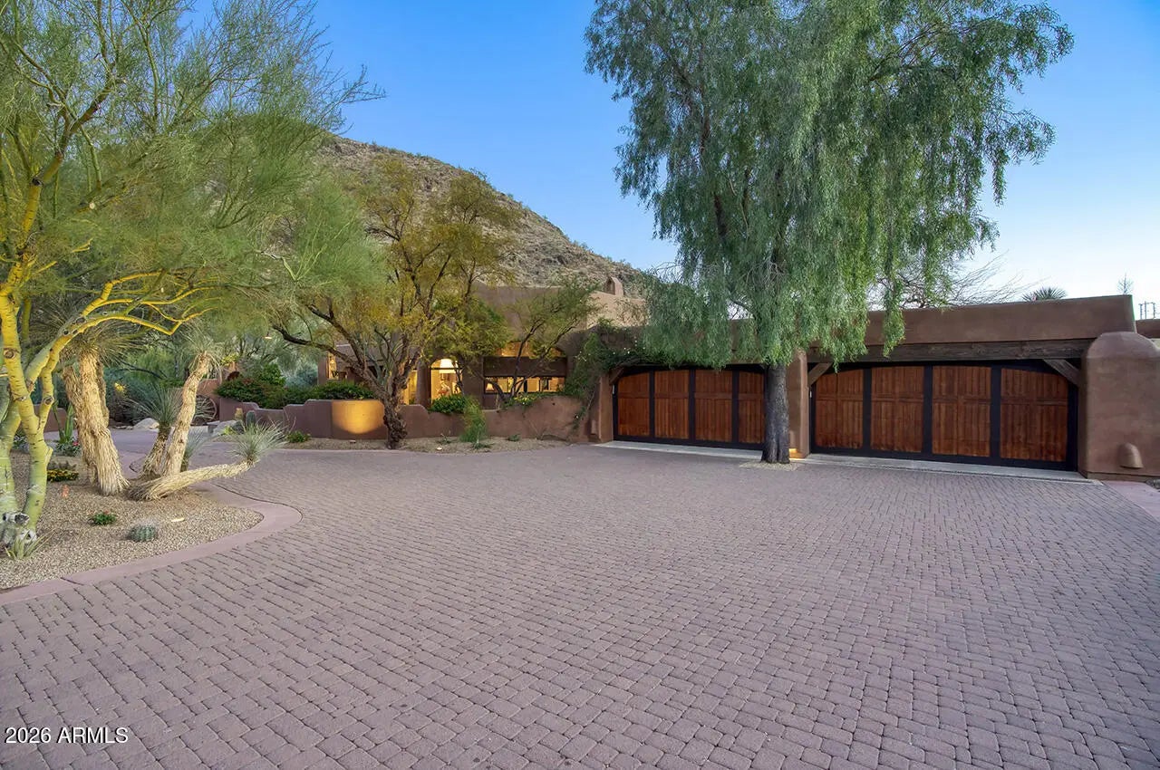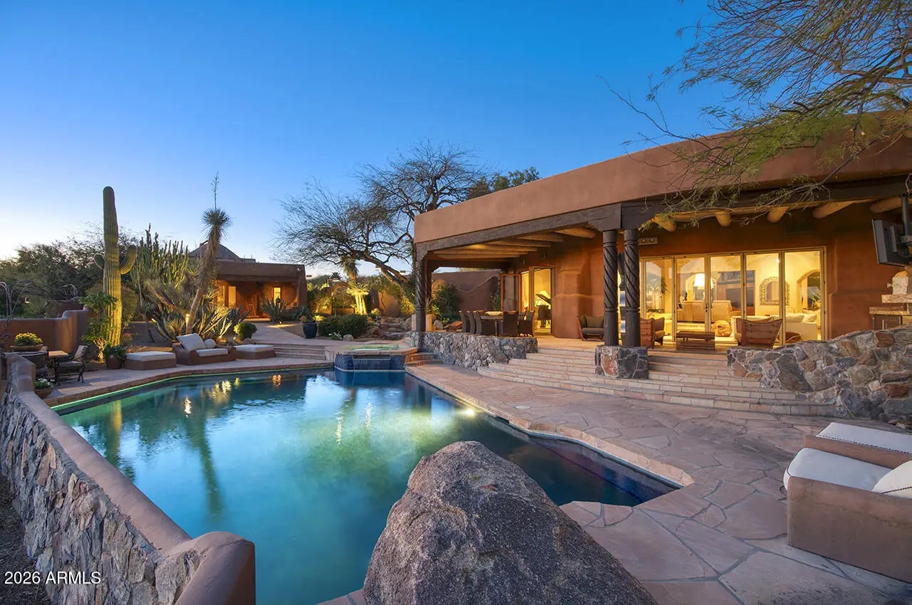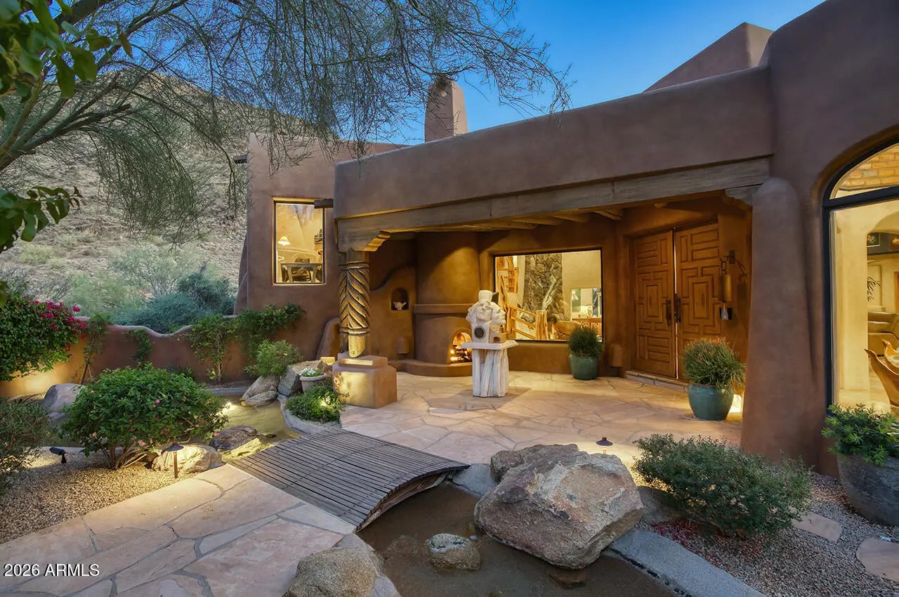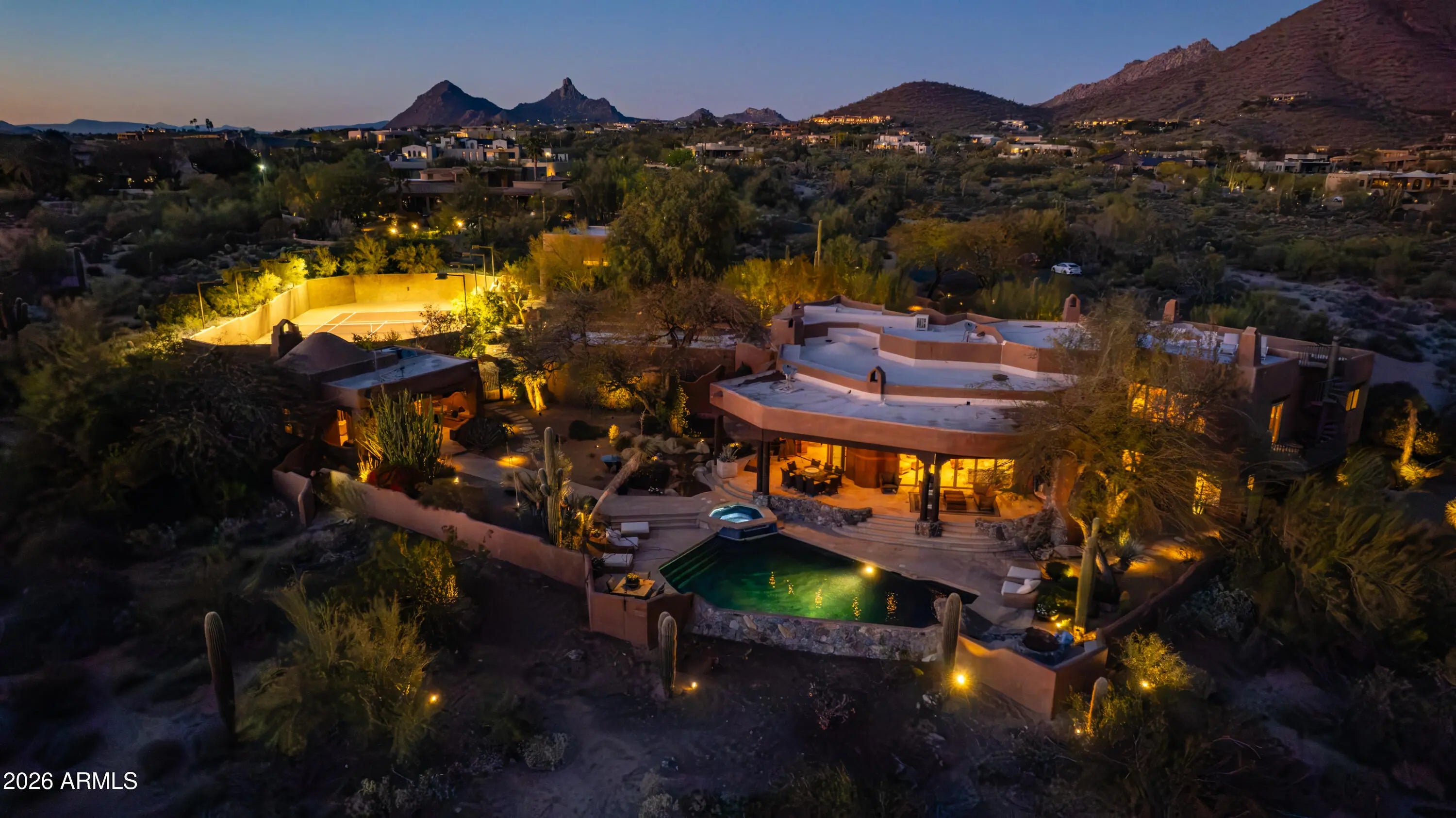 Tucked within the esteemed custom-home community of Pinnacle Peak Heights, Desert Tears is a truly extraordinary gated estate set on nearly seven acres at the base of the McDowell Mountains, where the land rises into one of the area's peaks and captures sweeping panoramic city-light views and the beauty of the Sonoran Desert. Rich with character and timeless charm, this one-of-a-kind residence is defined by artisan craftsmanship and distinctive architectural details throughout. Its name, Desert Tears, offers a subtle nod to the beauty and stillness of the desert landscape that inspired its creation. Thoughtfully designed for both elevated entertaining and comfortable everyday living, the home offers a desirable and dynamic layout. The primary suite is privately situated on the upper level opening to breathtaking valley, city-light, and mountain views--creating a serene retreat that feels both elevated and connected to the surrounding landscape. Two additional en-suite bedrooms are located on the main level, along with a separate guest house on the property, providing ideal accommodations for family and guests. At the heart of the home, a truly exceptional commercial-grade kitchen caters to the culinary enthusiast, featuring top-tier Montague appliances, infrared gas broilers, a French hot top with wok ring, six-burner configuration, and three ovens. A striking horseshoe bar seamlessly connects the kitchen and main living spaces, enhancing the home's natural flow and creating an inviting environment for gathering and entertaining. A 1,000-bottle temperature-controlled wine cellar further elevates the experience. Seamless indoor-outdoor living is showcased through a beautiful Arizona room that opens to expansive desert and city views beyond. Throughout the home, richly layered finishes include custom beamed ceilings, domed brickwork, and extensive stone elements--remarkably sourced directly from the property itself--creating an authentic connection to the surrounding McDowell Mountain terrain. The grounds are equally captivating, featuring seven fireplaces, two fire pits, and a stunning heated all-tile pool and spa designed for both relaxation and recreation. The approximately 9.5-foot diving pool is complemented by a sculptural, custom-designed diving feature, while an intriguing fire feature at the entry gate creates a dramatic and memorable arrival. A sunken, lighted tennis court--recently refurbished and thoughtfully designed for both tennis and pickleball--adds to the estate's exceptional recreational offerings. Car enthusiasts will appreciate the impressive 13-car garage capacity, highlighted by a show-stopping nine-car showcase garage complete with a modular kitchen and extensive storage, creating a truly unique space for display, entertaining, and functionality. Private, distinctive, and masterfully crafted, Desert Tears is a rare Scottsdale estate that blends architectural soul, natural beauty, and exceptional livability into an offering of uncommon significance.
