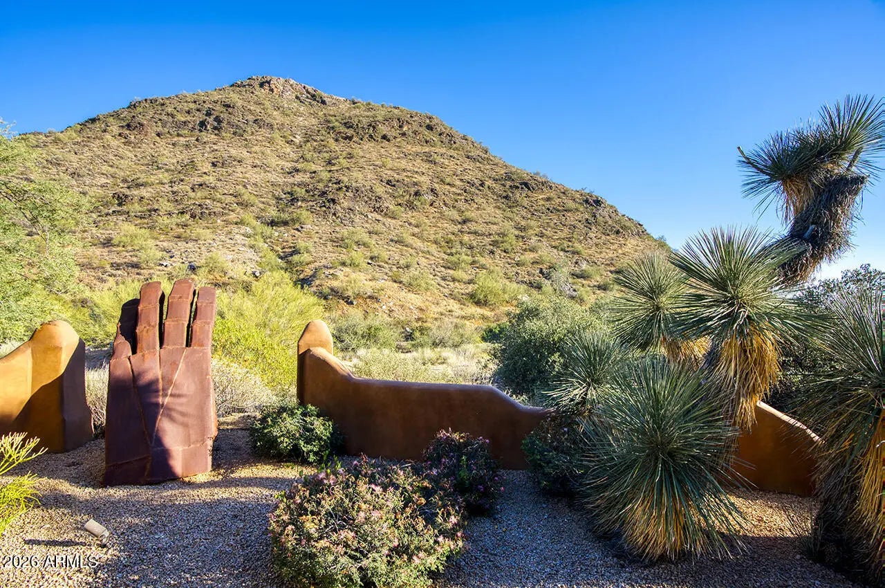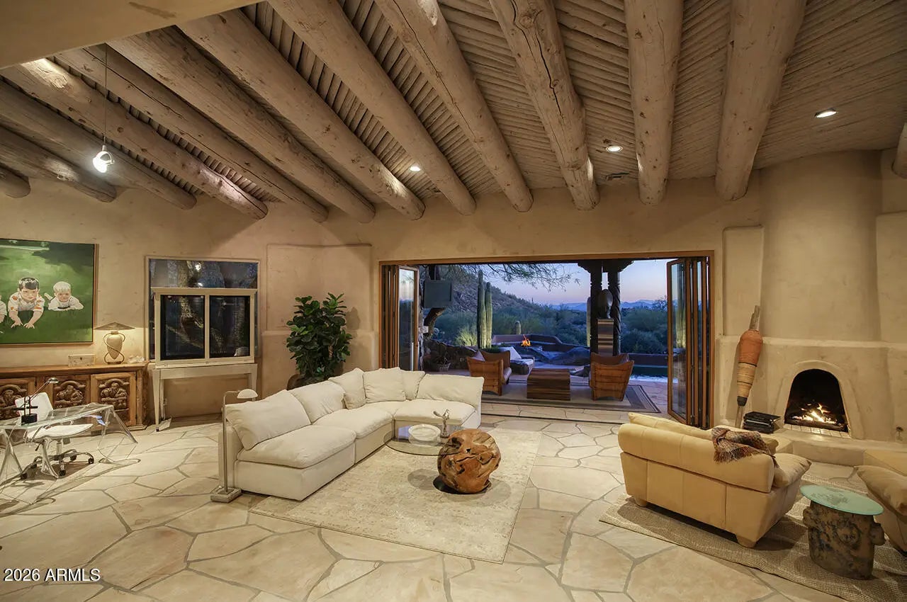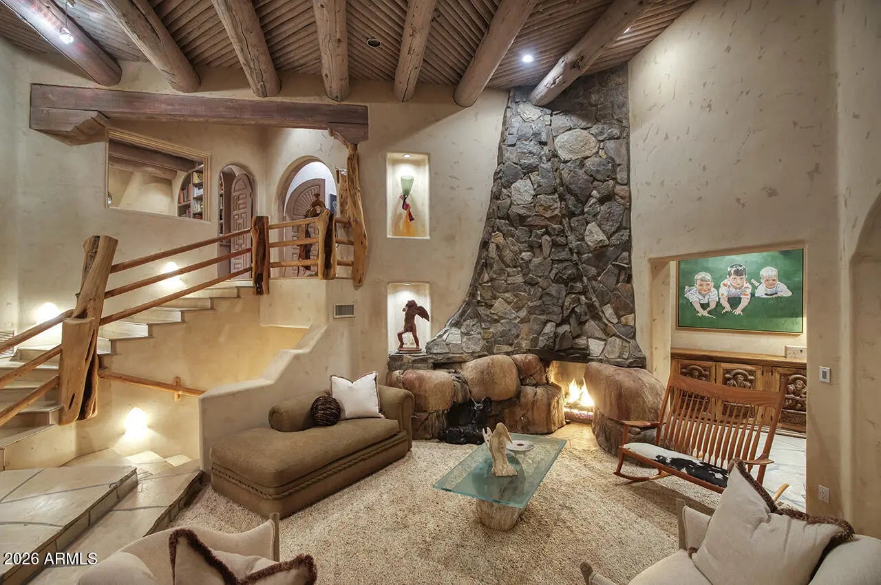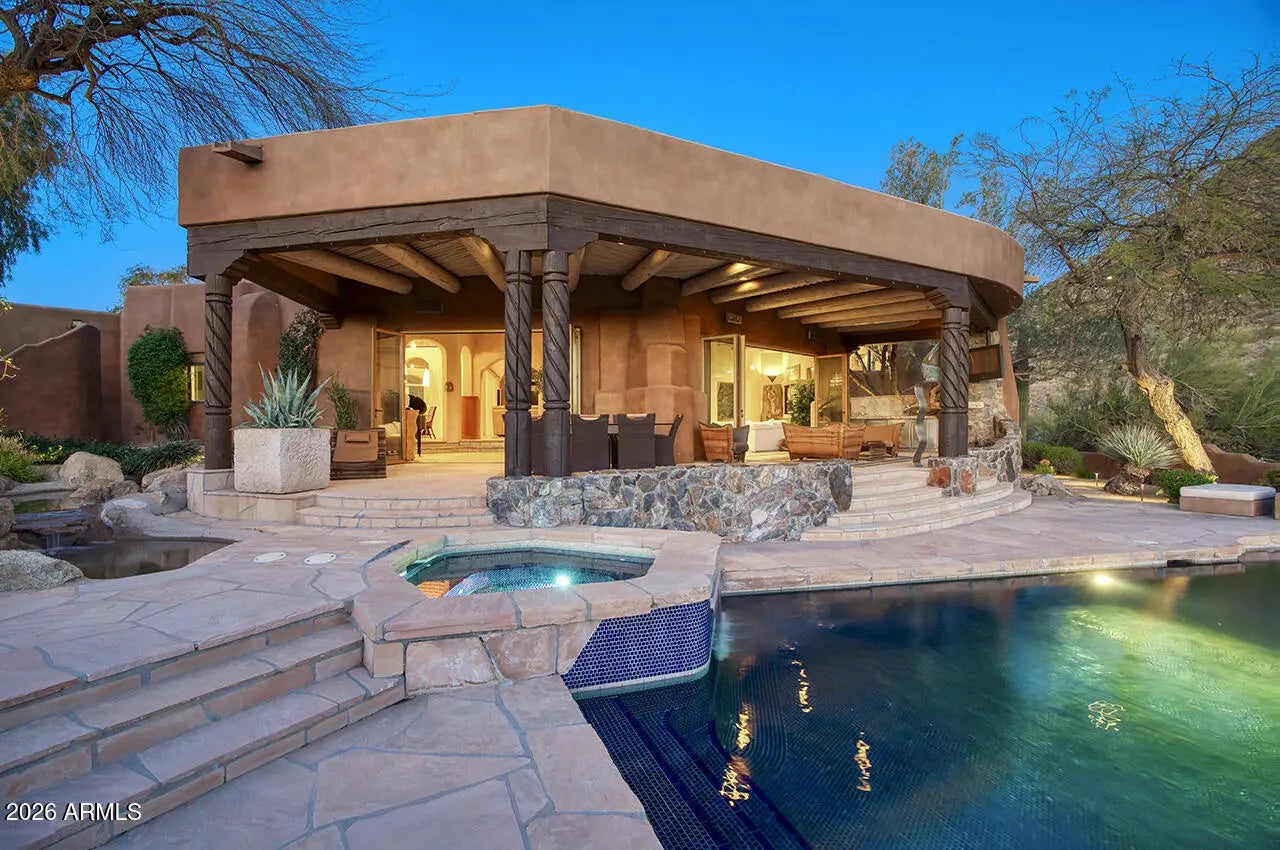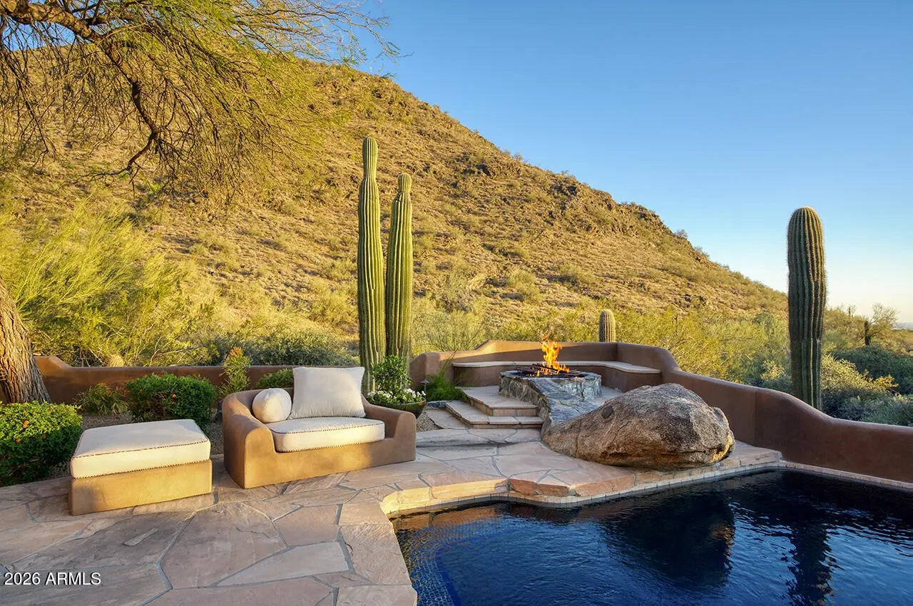 Tucked within the esteemed custom-home community of Pinnacle Peak Heights, Desert Tears is a truly extraordinary gated estate set on nearly seven acres at the base of the McDowell Mountains, where the land rises into one of the area's peaks and captures sweeping panoramic city-light views and the beauty of the Sonoran Desert. Rich with character and timeless charm, this one-of-a-kind residence is defined by artisan craftsmanship and distinctive architectural details throughout. Its name, Desert Tears, offers a subtle nod to the beauty and stillness of the desert landscape that inspired its creation. Thoughtfully designed for both elevated entertaining and comfortable everyday living, the home offers a desirable and dynamic layout. The primary suite is privately situated on the upper level opening to breathtaking valley, city-light, and mountain views--creating a serene retreat that feels both elevated and connected to the surrounding landscape. Two additional en-suite bedrooms are located on the main level, along with a separate guest house on the property, providing ideal accommodations for family and guests. At the heart of the home, a truly exceptional commercial-grade kitchen caters to the culinary enthusiast, featuring top-tier Montague appliances, infrared gas broilers, a French hot top with wok ring, six-burner configuration, and three ovens. A striking horseshoe bar seamlessly connects the kitchen and main living spaces, enhancing the home's natural flow and creating an inviting environment for gathering and entertaining. A 1,000-bottle temperature-controlled wine cellar further elevates the experience. Seamless indoor-outdoor living is showcased through a beautiful Arizona room that opens to expansive desert and city views beyond. Throughout the home, richly layered finishes include custom beamed ceilings, domed brickwork, and extensive stone elements--remarkably sourced directly from the property itself--creating an authentic connection to the surrounding McDowell Mountain terrain. The grounds are equally captivating, featuring seven fireplaces, two fire pits, and a stunning heated all-tile pool and spa designed for both relaxation and recreation. The approximately 9.5-foot diving pool is complemented by a sculptural, custom-designed diving feature, while an intriguing fire feature at the entry gate creates a dramatic and memorable arrival. A sunken, lighted tennis court--recently refurbished and thoughtfully designed for both tennis and pickleball--adds to the estate's exceptional recreational offerings. Car enthusiasts will appreciate the impressive 13-car garage capacity, highlighted by a show-stopping nine-car showcase garage complete with a modular kitchen and extensive storage, creating a truly unique space for display, entertaining, and functionality. Private, distinctive, and masterfully crafted, Desert Tears is a rare Scottsdale estate that blends architectural soul, natural beauty, and exceptional livability into an offering of uncommon significance.