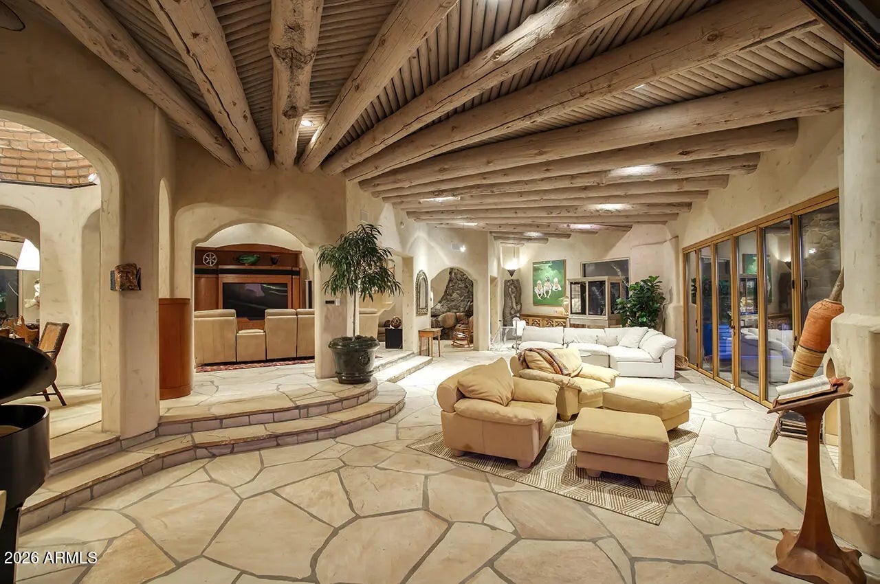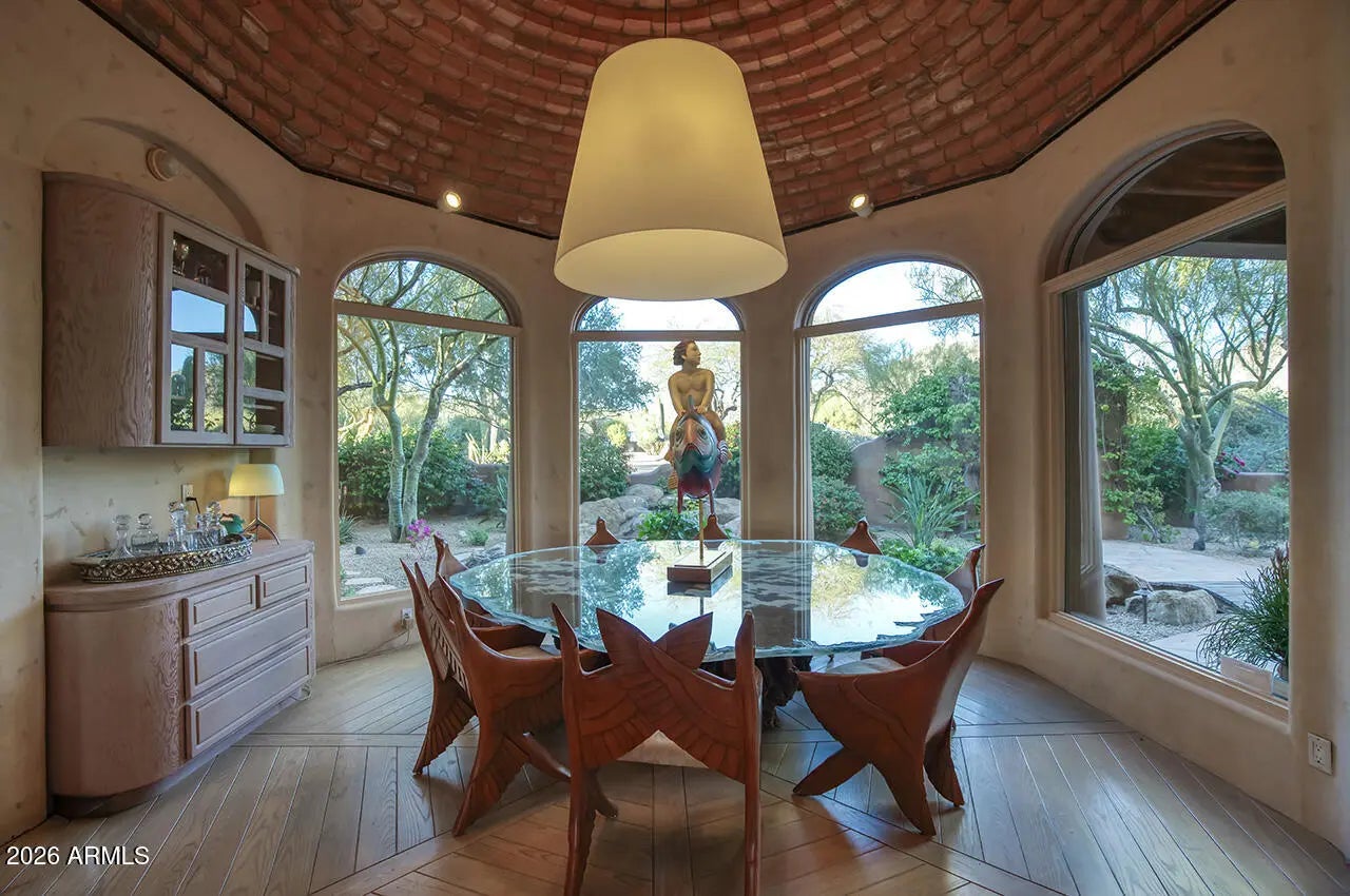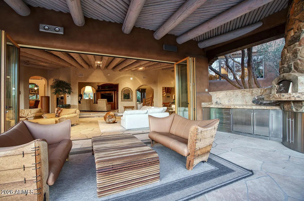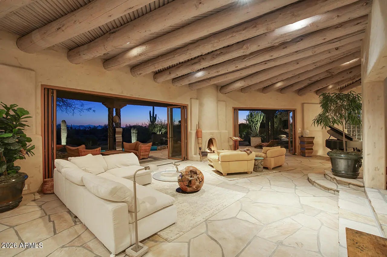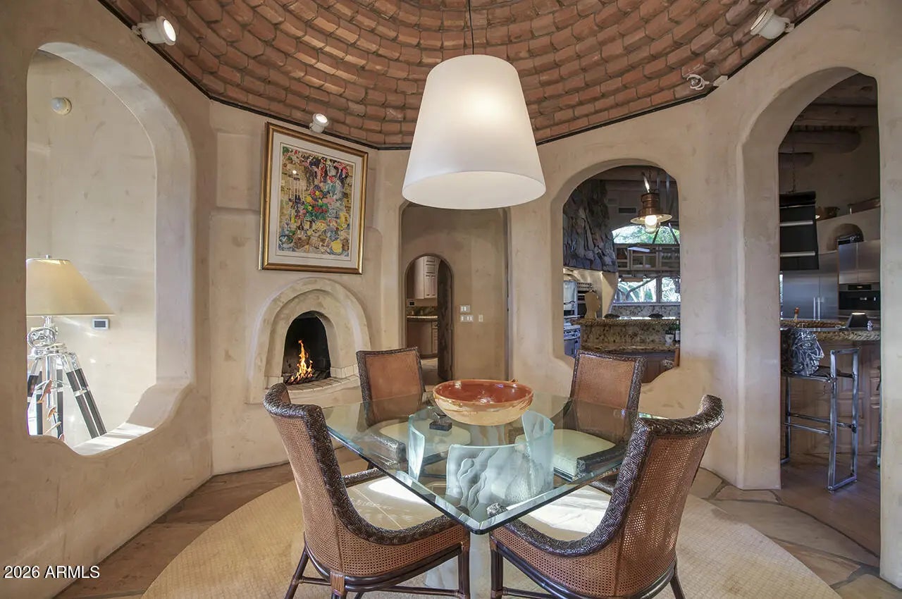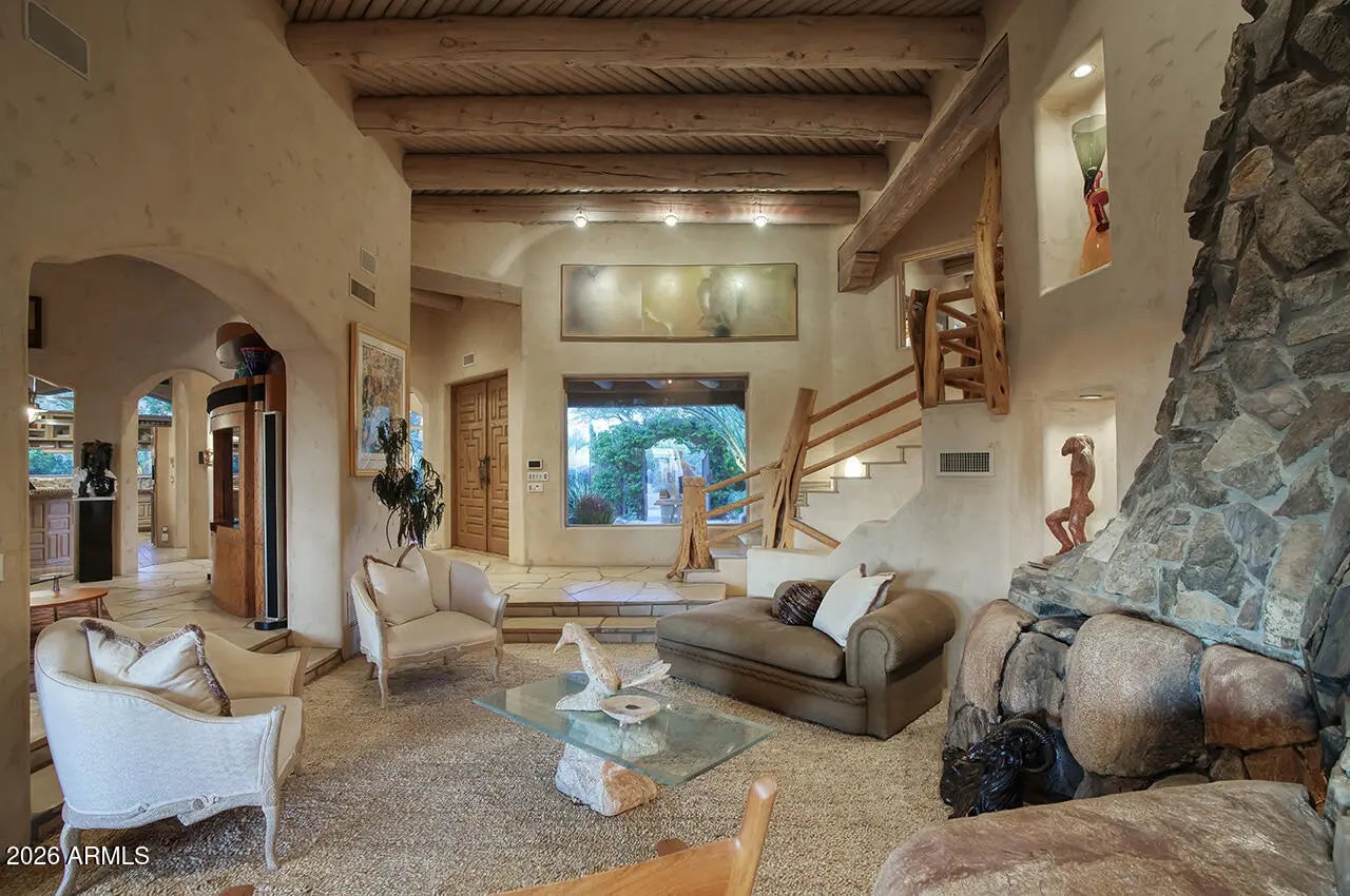 Tucked within the esteemed custom-home community of Pinnacle Peak Heights, Desert Tears is a truly extraordinary gated estate set on nearly seven acres at the base of the McDowell Mountains, where the land rises into one of the area's peaks and captures sweeping panoramic city-light views and the beauty of the Sonoran Desert. Rich with character and timeless charm, this one-of-a-kind residence is defined by artisan craftsmanship and distinctive architectural details throughout. Its name, Desert Tears, offers a subtle nod to the beauty and stillness of the desert landscape that inspired its creation. Thoughtfully designed for both elevated entertaining and comfortable everyday living, the home offers a desirable and dynamic layout. The primary suite is privately situated on the upper level opening to breathtaking valley, city-light, and mountain views--creating a serene retreat that feels both elevated and connected to the surrounding landscape. Two additional en-suite bedrooms are located on the main level, along with a separate guest house on the property, providing ideal accommodations for family and guests. At the heart of the home, a truly exceptional commercial-grade kitchen caters to the culinary enthusiast, featuring top-tier Montague appliances, infrared gas broilers, a French hot top with wok ring, six-burner configuration, and three ovens. A striking horseshoe bar seamlessly connects the kitchen and main living spaces, enhancing the home's natural flow and creating an inviting environment for gathering and entertaining. A 1,000-bottle temperature-controlled wine cellar further elevates the experience. Seamless indoor-outdoor living is showcased through a beautiful Arizona room that opens to expansive desert and city views beyond. Throughout the home, richly layered finishes include custom beamed ceilings, domed brickwork, and extensive stone elements--remarkably sourced directly from the property itself--creating an authentic connection to the surrounding McDowell Mountain terrain. The grounds are equally captivating, featuring seven fireplaces, two fire pits, and a stunning heated all-tile pool and spa designed for both relaxation and recreation. The approximately 9.5-foot diving pool is complemented by a sculptural, custom-designed diving feature, while an intriguing fire feature at the entry gate creates a dramatic and memorable arrival. A sunken, lighted tennis court--recently refurbished and thoughtfully designed for both tennis and pickleball--adds to the estate's exceptional recreational offerings. Car enthusiasts will appreciate the impressive 13-car garage capacity, highlighted by a show-stopping nine-car showcase garage complete with a modular kitchen and extensive storage, creating a truly unique space for display, entertaining, and functionality. Private, distinctive, and masterfully crafted, Desert Tears is a rare Scottsdale estate that blends architectural soul, natural beauty, and exceptional livability into an offering of uncommon significance.