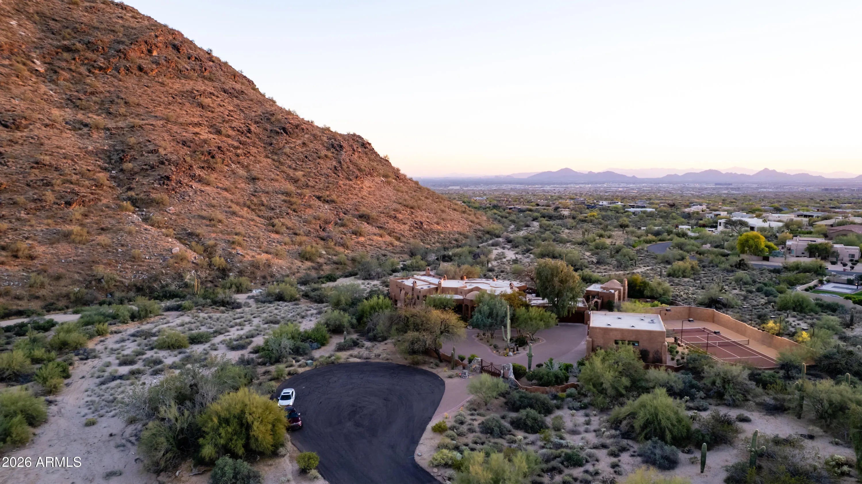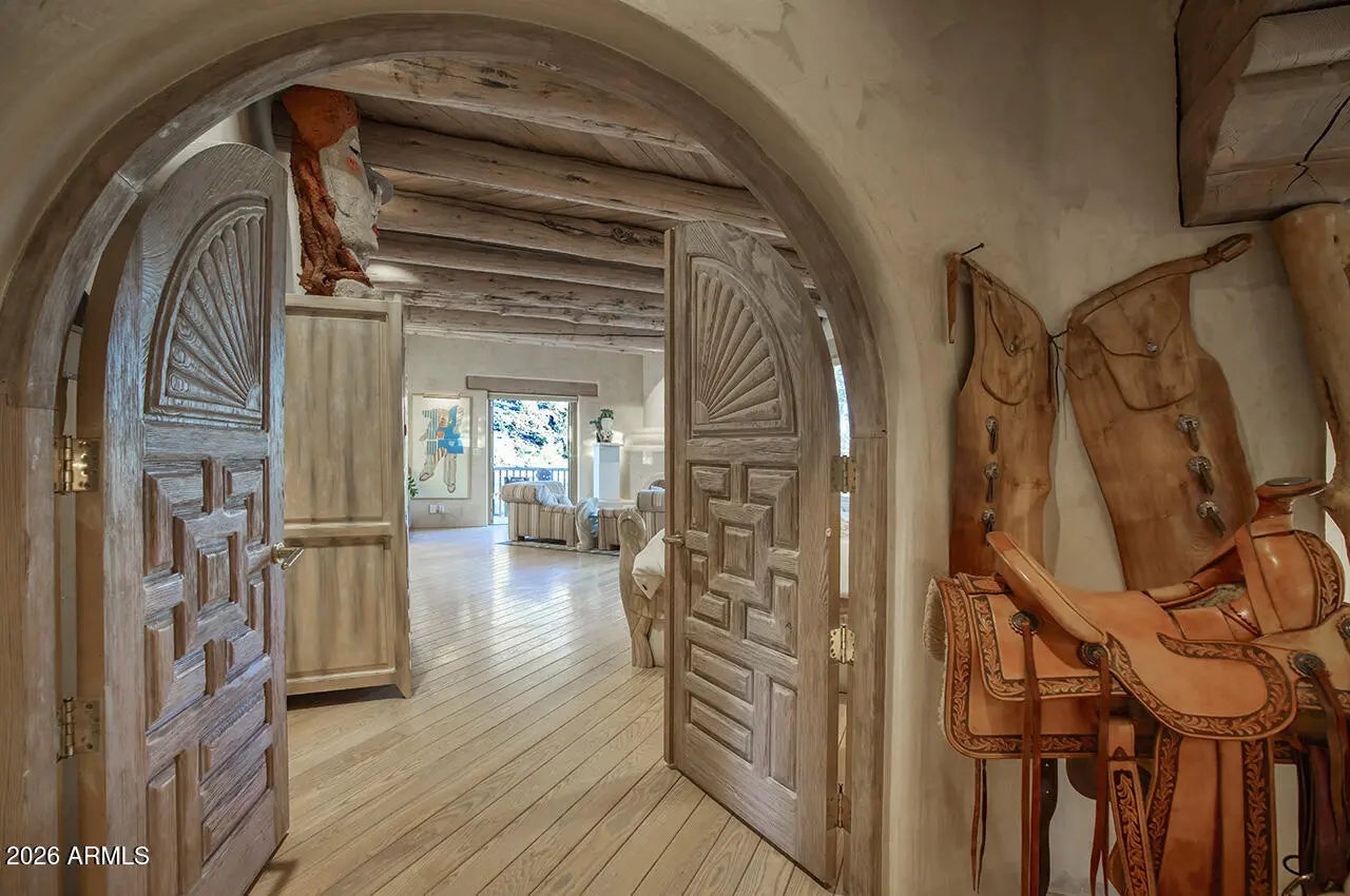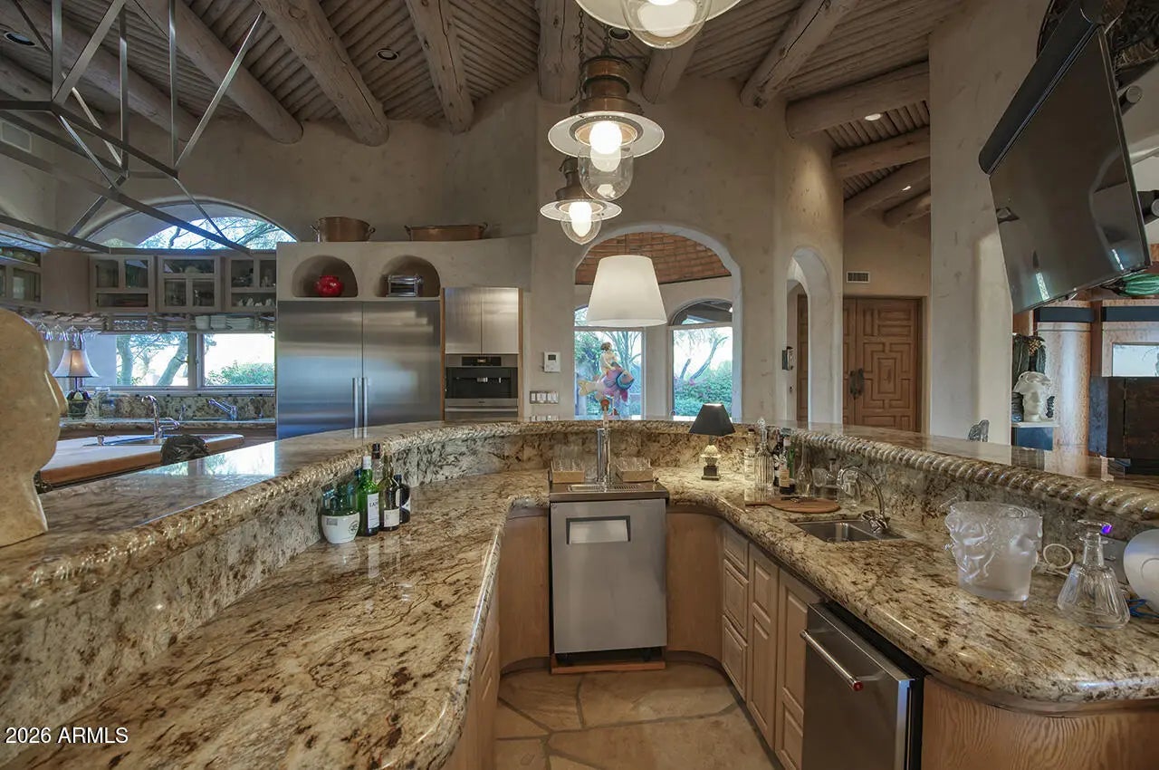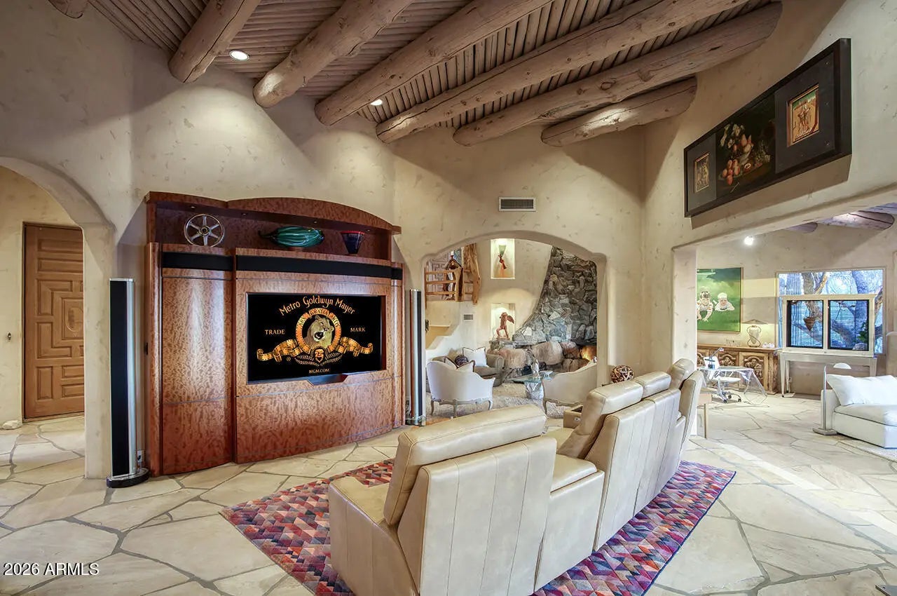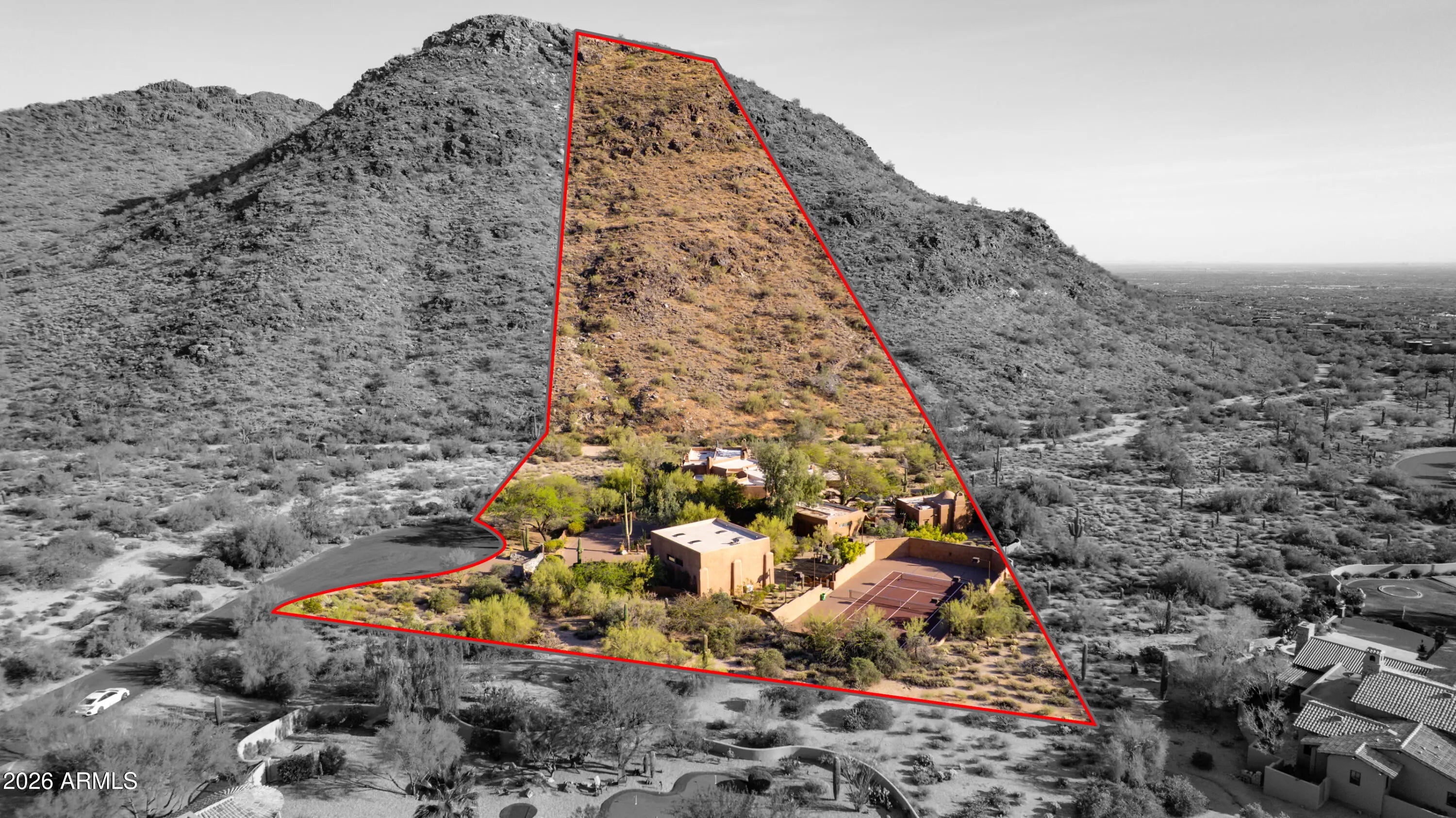 Tucked within the esteemed custom-home community of Pinnacle Peak Heights, Desert Tears is a truly extraordinary gated estate set on nearly seven acres at the base of the McDowell Mountains, where the land rises into one of the area's peaks and captures sweeping panoramic city-light views and the beauty of the Sonoran Desert. Rich with character and timeless charm, this one-of-a-kind residence is defined by artisan craftsmanship and distinctive architectural details throughout. Its name, Desert Tears, offers a subtle nod to the beauty and stillness of the desert landscape that inspired its creation. Thoughtfully designed for both elevated entertaining and comfortable everyday living, the home offers a desirable and dynamic layout. The primary suite is privately situated on the upper level opening to breathtaking valley, city-light, and mountain views--creating a serene retreat that feels both elevated and connected to the surrounding landscape. Two additional en-suite bedrooms are located on the main level, along with a separate guest house on the property, providing ideal accommodations for family and guests. At the heart of the home, a truly exceptional commercial-grade kitchen caters to the culinary enthusiast, featuring top-tier Montague appliances, infrared gas broilers, a French hot top with wok ring, six-burner configuration, and three ovens. A striking horseshoe bar seamlessly connects the kitchen and main living spaces, enhancing the home's natural flow and creating an inviting environment for gathering and entertaining. A 1,000-bottle temperature-controlled wine cellar further elevates the experience. Seamless indoor-outdoor living is showcased through a beautiful Arizona room that opens to expansive desert and city views beyond. Throughout the home, richly layered finishes include custom beamed ceilings, domed brickwork, and extensive stone elements--remarkably sourced directly from the property itself--creating an authentic connection to the surrounding McDowell Mountain terrain. The grounds are equally captivating, featuring seven fireplaces, two fire pits, and a stunning heated all-tile pool and spa designed for both relaxation and recreation. The approximately 9.5-foot diving pool is complemented by a sculptural, custom-designed diving feature, while an intriguing fire feature at the entry gate creates a dramatic and memorable arrival. A sunken, lighted tennis court--recently refurbished and thoughtfully designed for both tennis and pickleball--adds to the estate's exceptional recreational offerings. Car enthusiasts will appreciate the impressive 13-car garage capacity, highlighted by a show-stopping nine-car showcase garage complete with a modular kitchen and extensive storage, creating a truly unique space for display, entertaining, and functionality. Private, distinctive, and masterfully crafted, Desert Tears is a rare Scottsdale estate that blends architectural soul, natural beauty, and exceptional livability into an offering of uncommon significance.