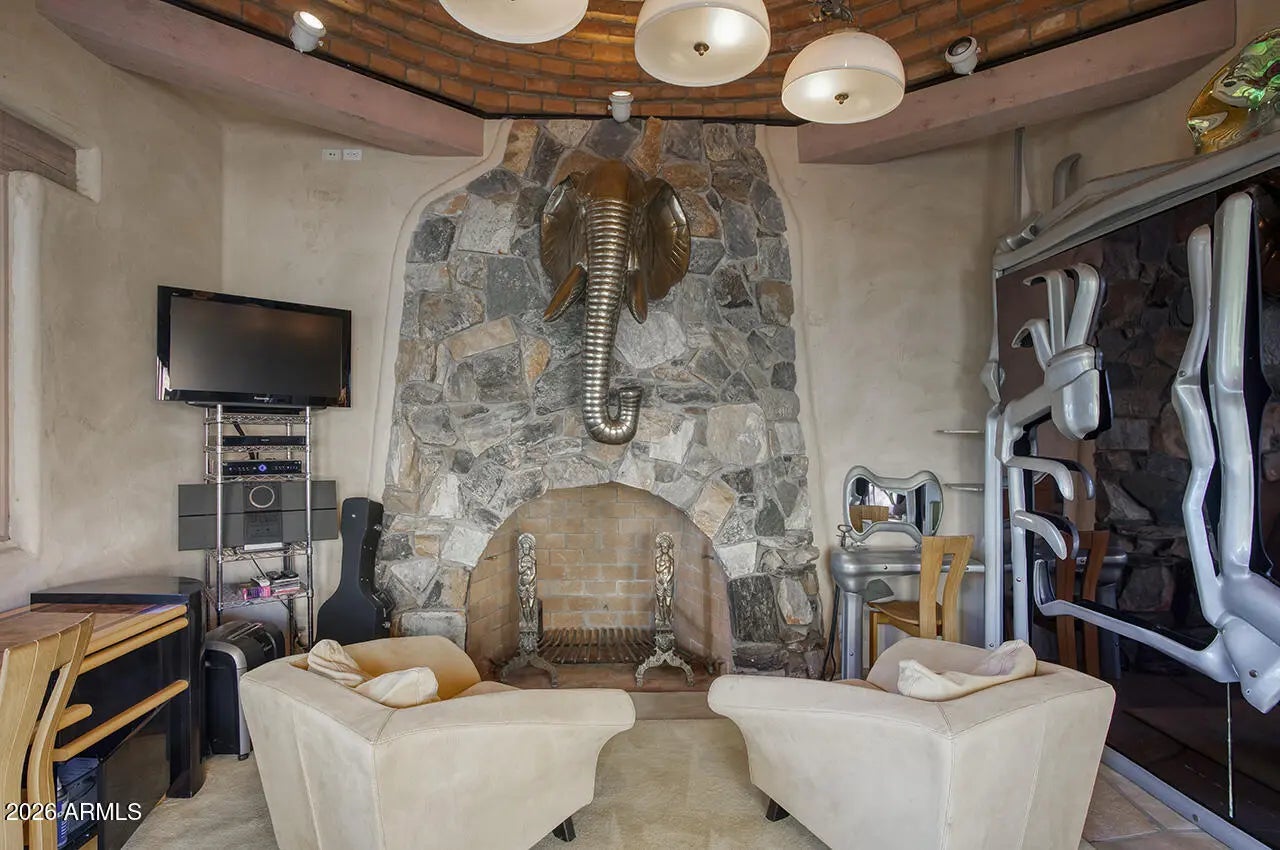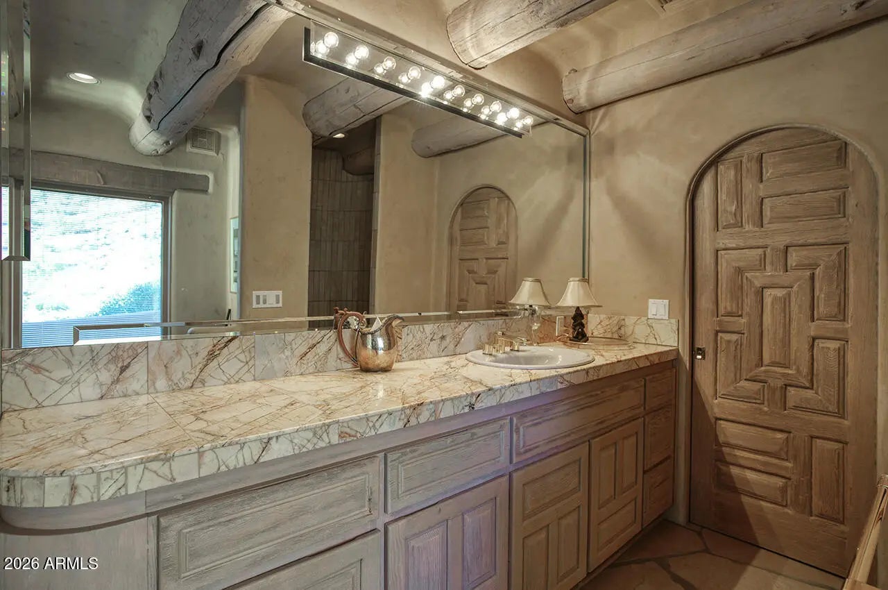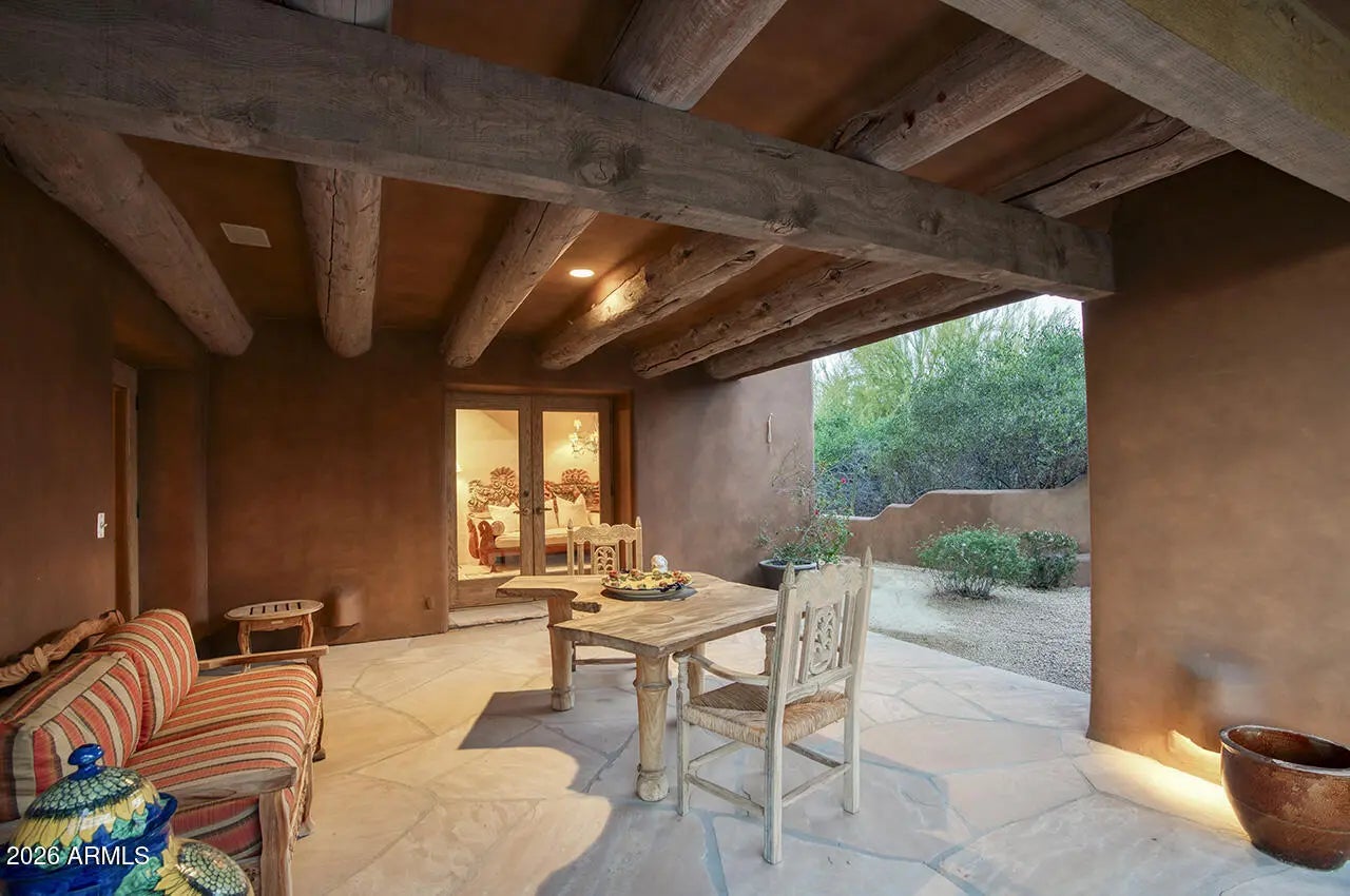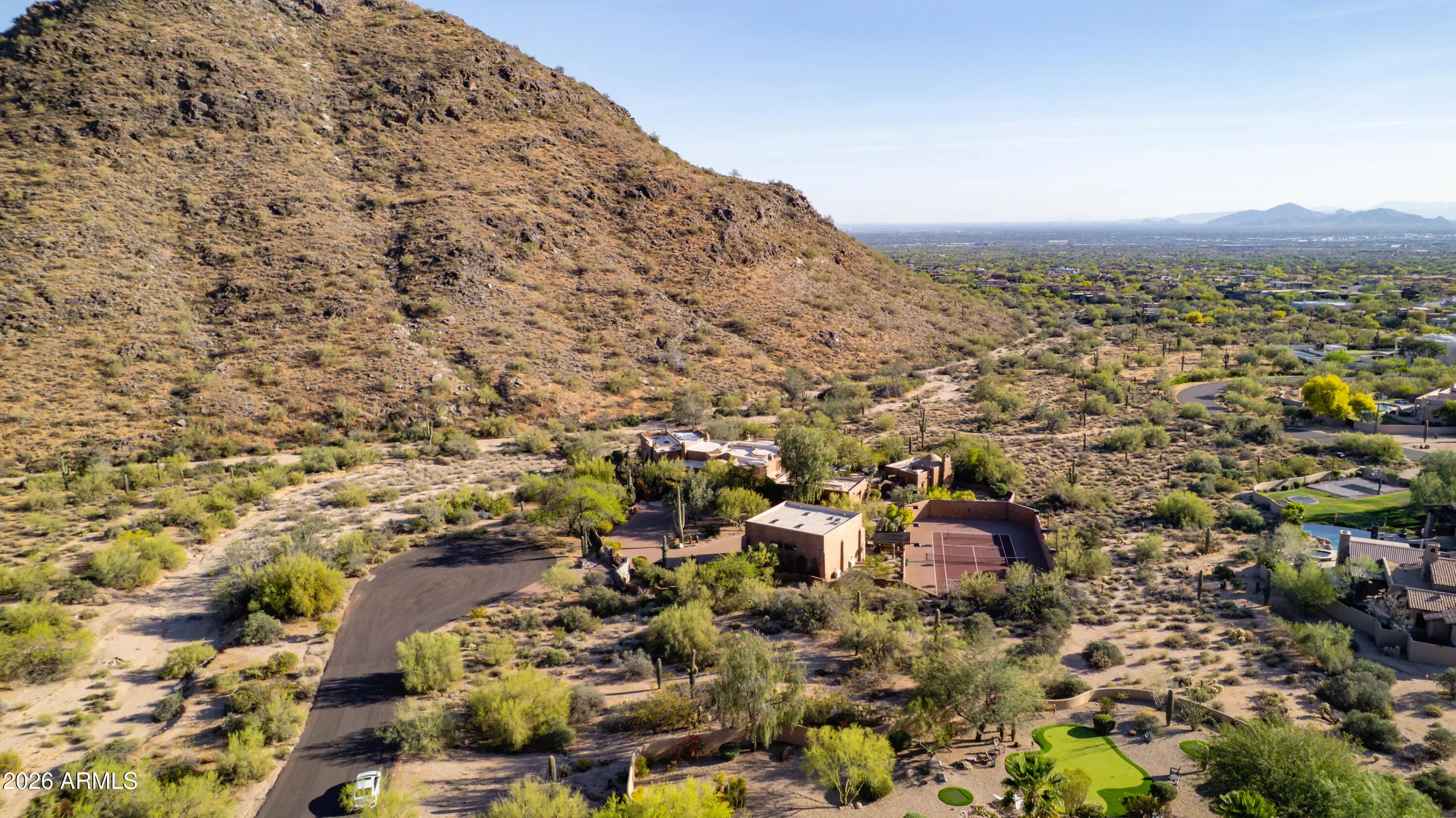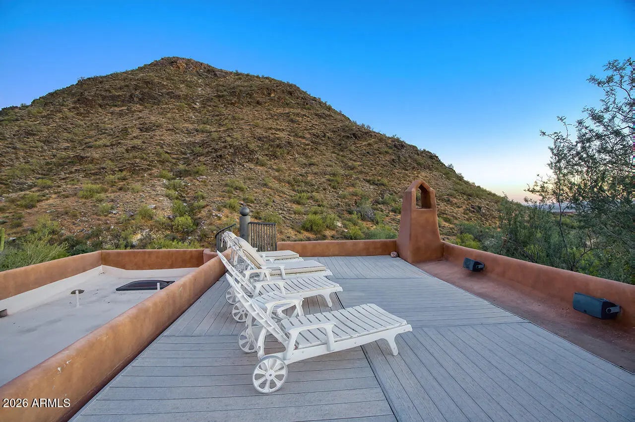 Tucked within the esteemed custom-home community of Pinnacle Peak Heights, Desert Tears is a truly extraordinary gated estate set on nearly seven acres at the base of the McDowell Mountains, where the land rises into one of the area's peaks and captures sweeping panoramic city-light views and the beauty of the Sonoran Desert. Rich with character and timeless charm, this one-of-a-kind residence is defined by artisan craftsmanship and distinctive architectural details throughout. Its name, Desert Tears, offers a subtle nod to the beauty and stillness of the desert landscape that inspired its creation. Thoughtfully designed for both elevated entertaining and comfortable everyday living, the home offers a desirable and dynamic layout. The primary suite is privately situated on the upper level opening to breathtaking valley, city-light, and mountain views--creating a serene retreat that feels both elevated and connected to the surrounding landscape. Two additional en-suite bedrooms are located on the main level, along with a separate guest house on the property, providing ideal accommodations for family and guests. At the heart of the home, a truly exceptional commercial-grade kitchen caters to the culinary enthusiast, featuring top-tier Montague appliances, infrared gas broilers, a French hot top with wok ring, six-burner configuration, and three ovens. A striking horseshoe bar seamlessly connects the kitchen and main living spaces, enhancing the home's natural flow and creating an inviting environment for gathering and entertaining. A 1,000-bottle temperature-controlled wine cellar further elevates the experience. Seamless indoor-outdoor living is showcased through a beautiful Arizona room that opens to expansive desert and city views beyond. Throughout the home, richly layered finishes include custom beamed ceilings, domed brickwork, and extensive stone elements--remarkably sourced directly from the property itself--creating an authentic connection to the surrounding McDowell Mountain terrain. The grounds are equally captivating, featuring seven fireplaces, two fire pits, and a stunning heated all-tile pool and spa designed for both relaxation and recreation. The approximately 9.5-foot diving pool is complemented by a sculptural, custom-designed diving feature, while an intriguing fire feature at the entry gate creates a dramatic and memorable arrival. A sunken, lighted tennis court--recently refurbished and thoughtfully designed for both tennis and pickleball--adds to the estate's exceptional recreational offerings. Car enthusiasts will appreciate the impressive 13-car garage capacity, highlighted by a show-stopping nine-car showcase garage complete with a modular kitchen and extensive storage, creating a truly unique space for display, entertaining, and functionality. Private, distinctive, and masterfully crafted, Desert Tears is a rare Scottsdale estate that blends architectural soul, natural beauty, and exceptional livability into an offering of uncommon significance.