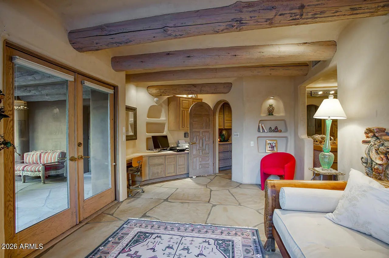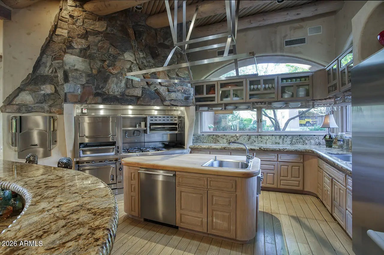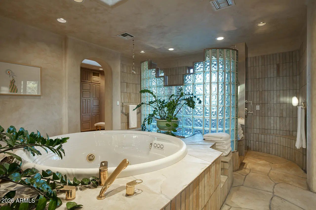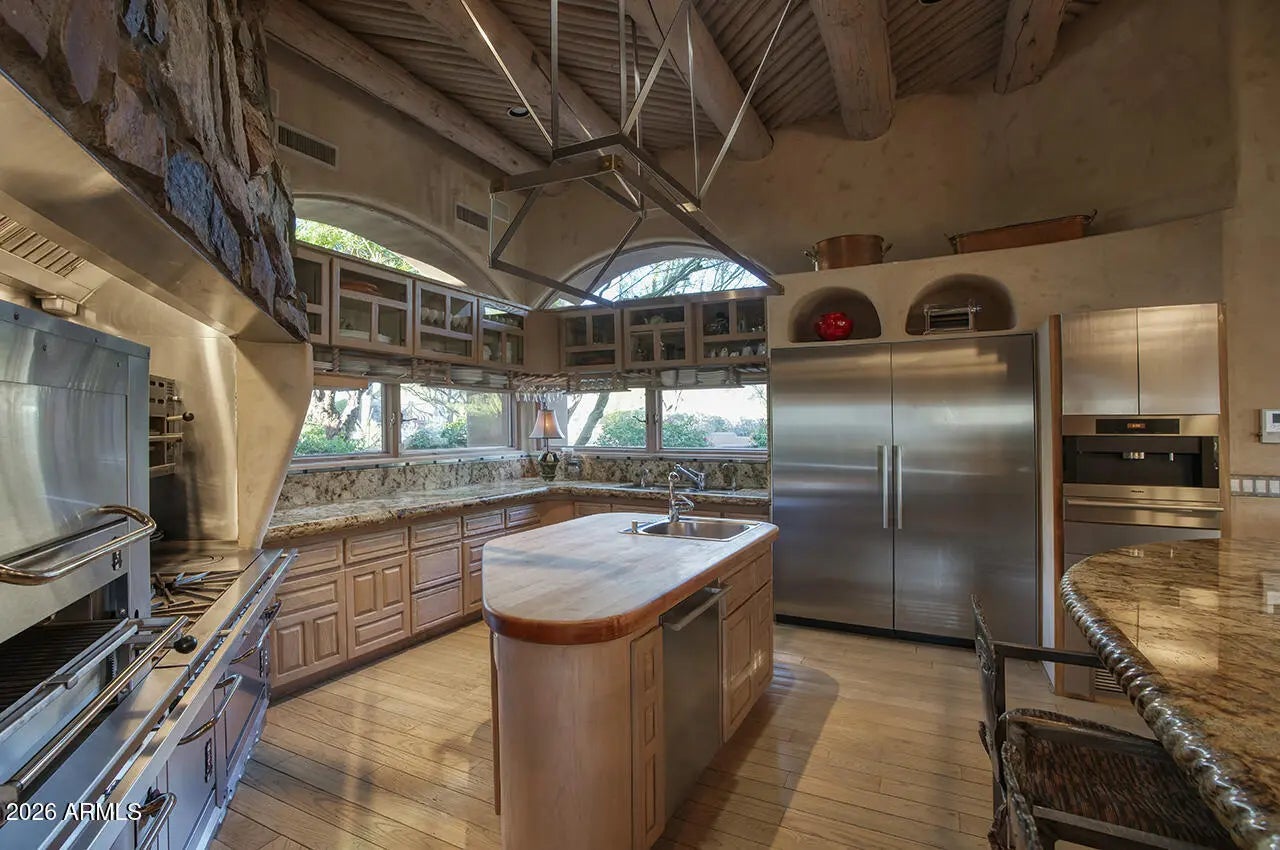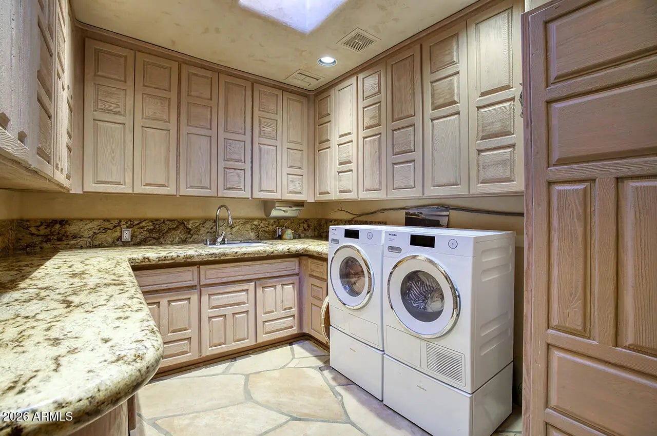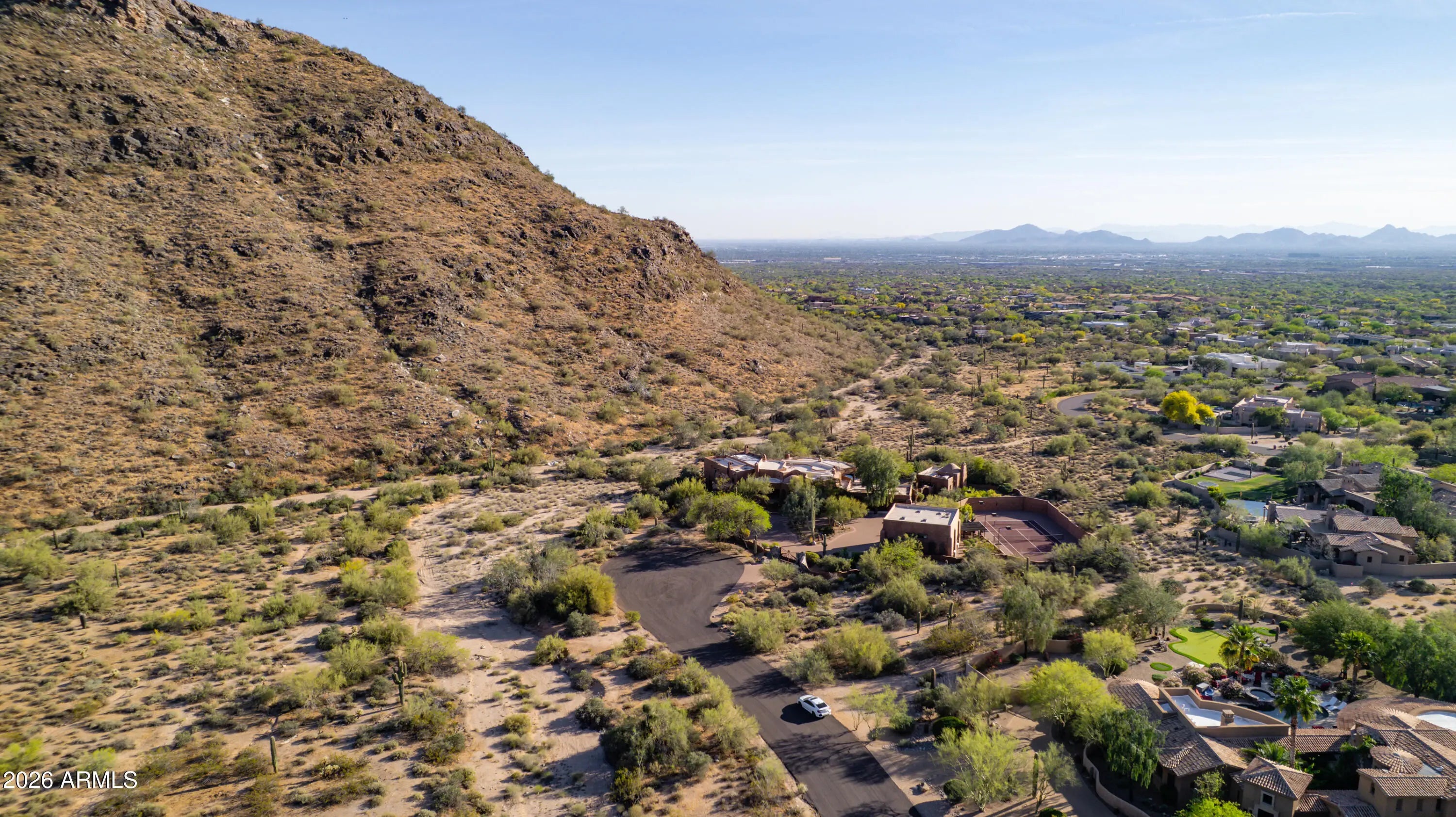 Tucked within the esteemed custom-home community of Pinnacle Peak Heights, Desert Tears is a truly extraordinary gated estate set on nearly seven acres at the base of the McDowell Mountains, where the land rises into one of the area's peaks and captures sweeping panoramic city-light views and the beauty of the Sonoran Desert. Rich with character and timeless charm, this one-of-a-kind residence is defined by artisan craftsmanship and distinctive architectural details throughout. Its name, Desert Tears, offers a subtle nod to the beauty and stillness of the desert landscape that inspired its creation. Thoughtfully designed for both elevated entertaining and comfortable everyday living, the home offers a desirable and dynamic layout. The primary suite is privately situated on the upper level opening to breathtaking valley, city-light, and mountain views--creating a serene retreat that feels both elevated and connected to the surrounding landscape. Two additional en-suite bedrooms are located on the main level, along with a separate guest house on the property, providing ideal accommodations for family and guests. At the heart of the home, a truly exceptional commercial-grade kitchen caters to the culinary enthusiast, featuring top-tier Montague appliances, infrared gas broilers, a French hot top with wok ring, six-burner configuration, and three ovens. A striking horseshoe bar seamlessly connects the kitchen and main living spaces, enhancing the home's natural flow and creating an inviting environment for gathering and entertaining. A 1,000-bottle temperature-controlled wine cellar further elevates the experience. Seamless indoor-outdoor living is showcased through a beautiful Arizona room that opens to expansive desert and city views beyond. Throughout the home, richly layered finishes include custom beamed ceilings, domed brickwork, and extensive stone elements--remarkably sourced directly from the property itself--creating an authentic connection to the surrounding McDowell Mountain terrain. The grounds are equally captivating, featuring seven fireplaces, two fire pits, and a stunning heated all-tile pool and spa designed for both relaxation and recreation. The approximately 9.5-foot diving pool is complemented by a sculptural, custom-designed diving feature, while an intriguing fire feature at the entry gate creates a dramatic and memorable arrival. A sunken, lighted tennis court--recently refurbished and thoughtfully designed for both tennis and pickleball--adds to the estate's exceptional recreational offerings. Car enthusiasts will appreciate the impressive 13-car garage capacity, highlighted by a show-stopping nine-car showcase garage complete with a modular kitchen and extensive storage, creating a truly unique space for display, entertaining, and functionality. Private, distinctive, and masterfully crafted, Desert Tears is a rare Scottsdale estate that blends architectural soul, natural beauty, and exceptional livability into an offering of uncommon significance.