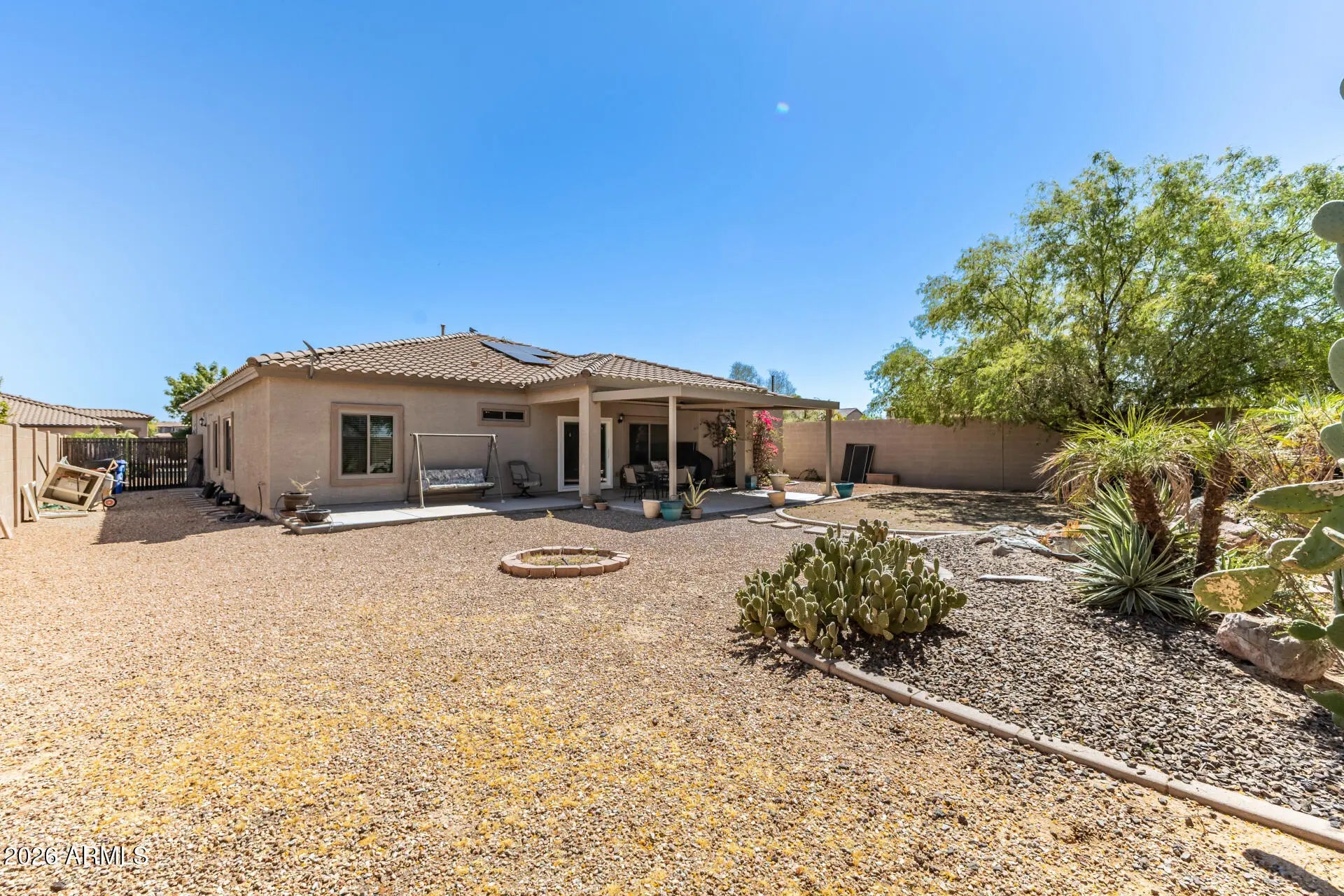 Beautiful spacious 3 beds 2 baths + Den 3- car garage located in East Mesa. Well-manicured desert landscaping leads to the front door entry. Inside the front door opens to a formal living and dining area with ceramic tile and plush carpeting. This home appears bright, featuring a neutral palette accented with decorative fans and fixtures. The kitchen is spacious offering SS appliances, granite counters, recessed lighting, staggered wood cabinets, and an island w/breakfast bar. The main bedroom has an ensuite with dual sinks, separate tub/shower & a walk-in closet. Tranquility awaits in the spacious backyard providing an extended covered patio and trees for refreshing shade. Close to freeway access, schools, dining, shopping and entertainment. Come and See!