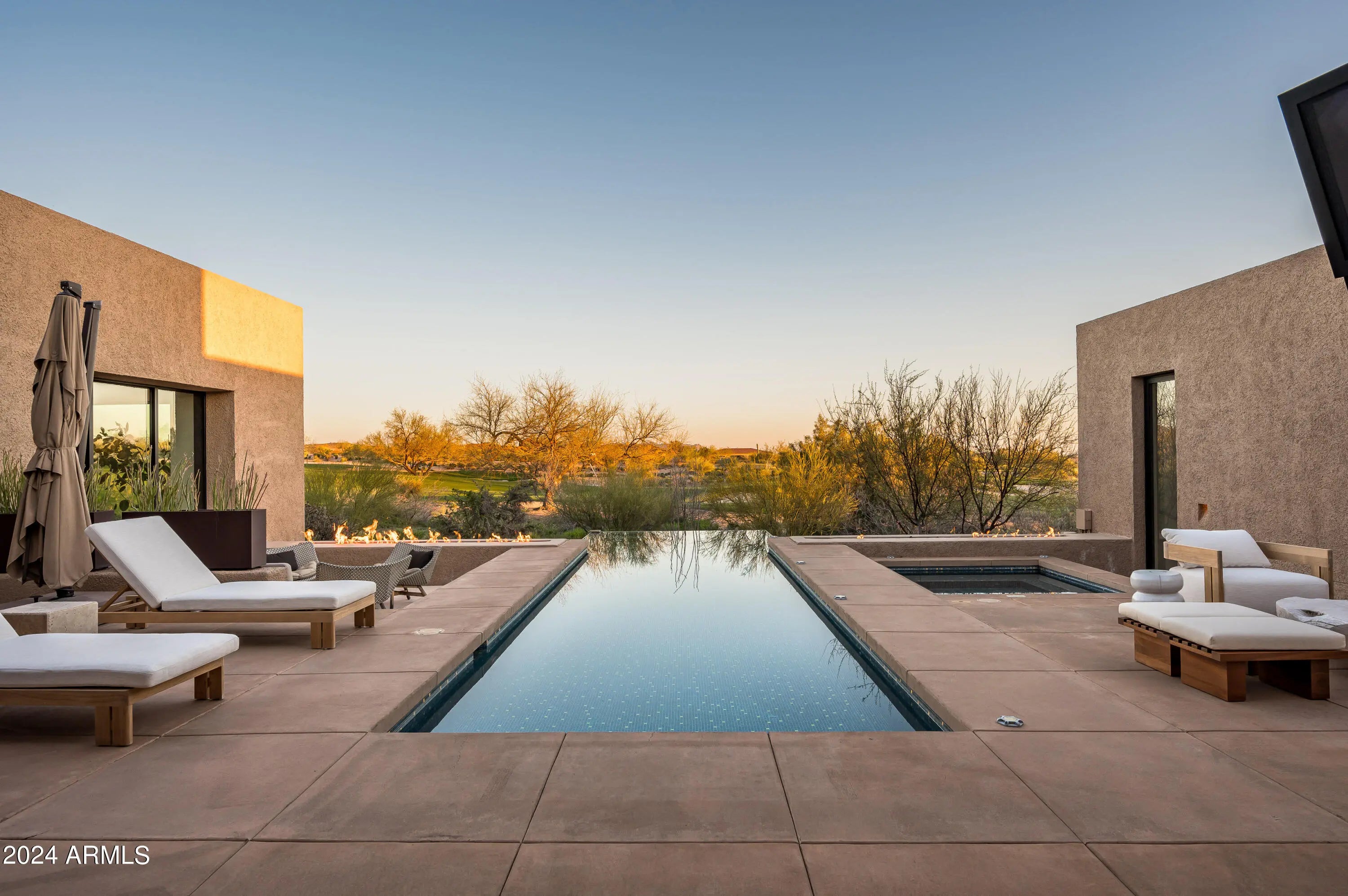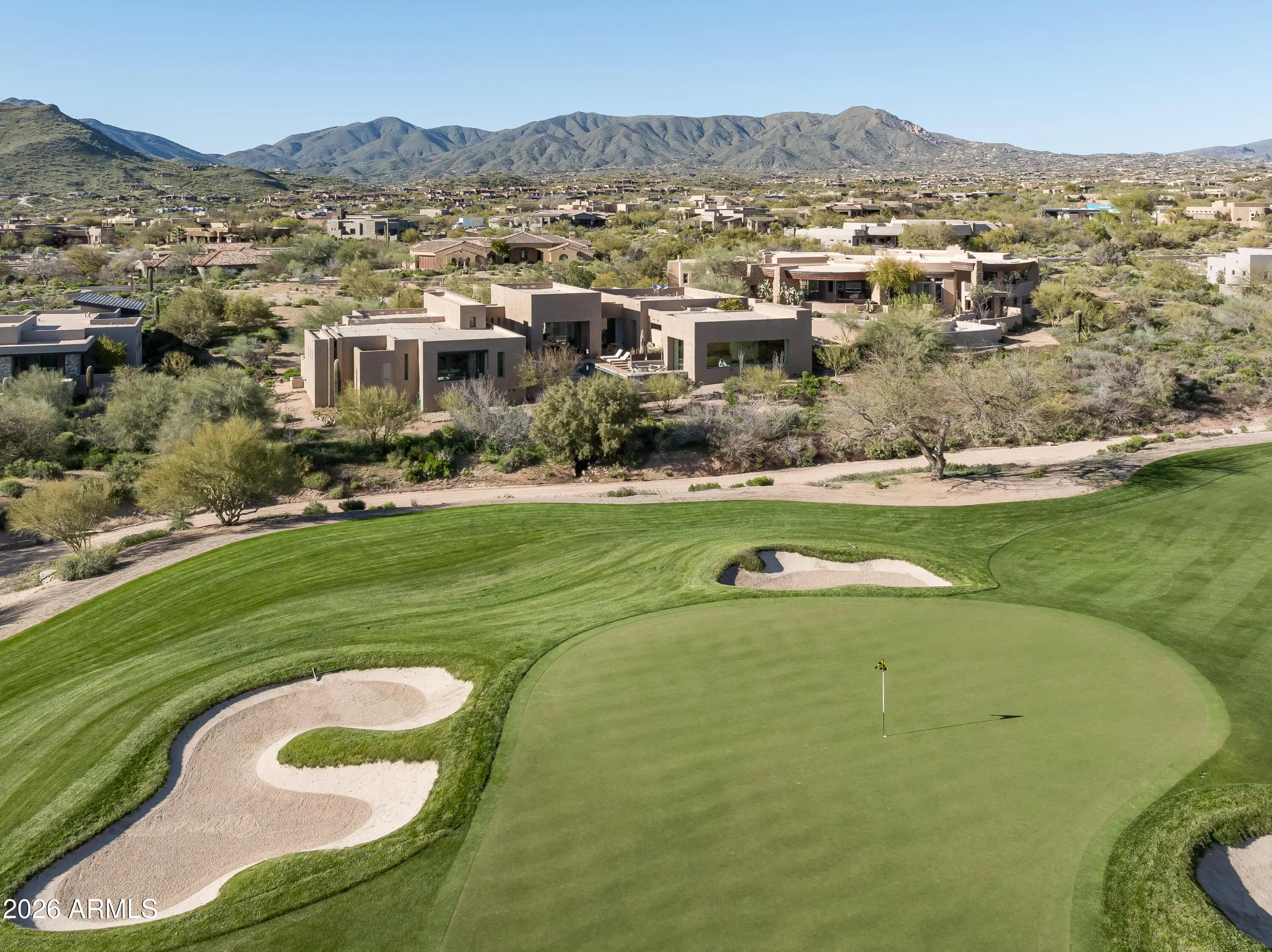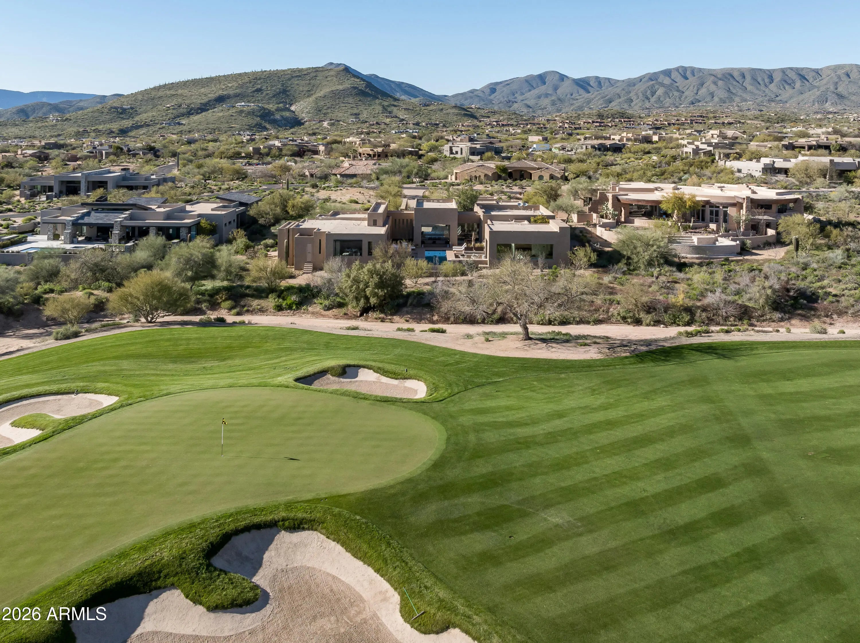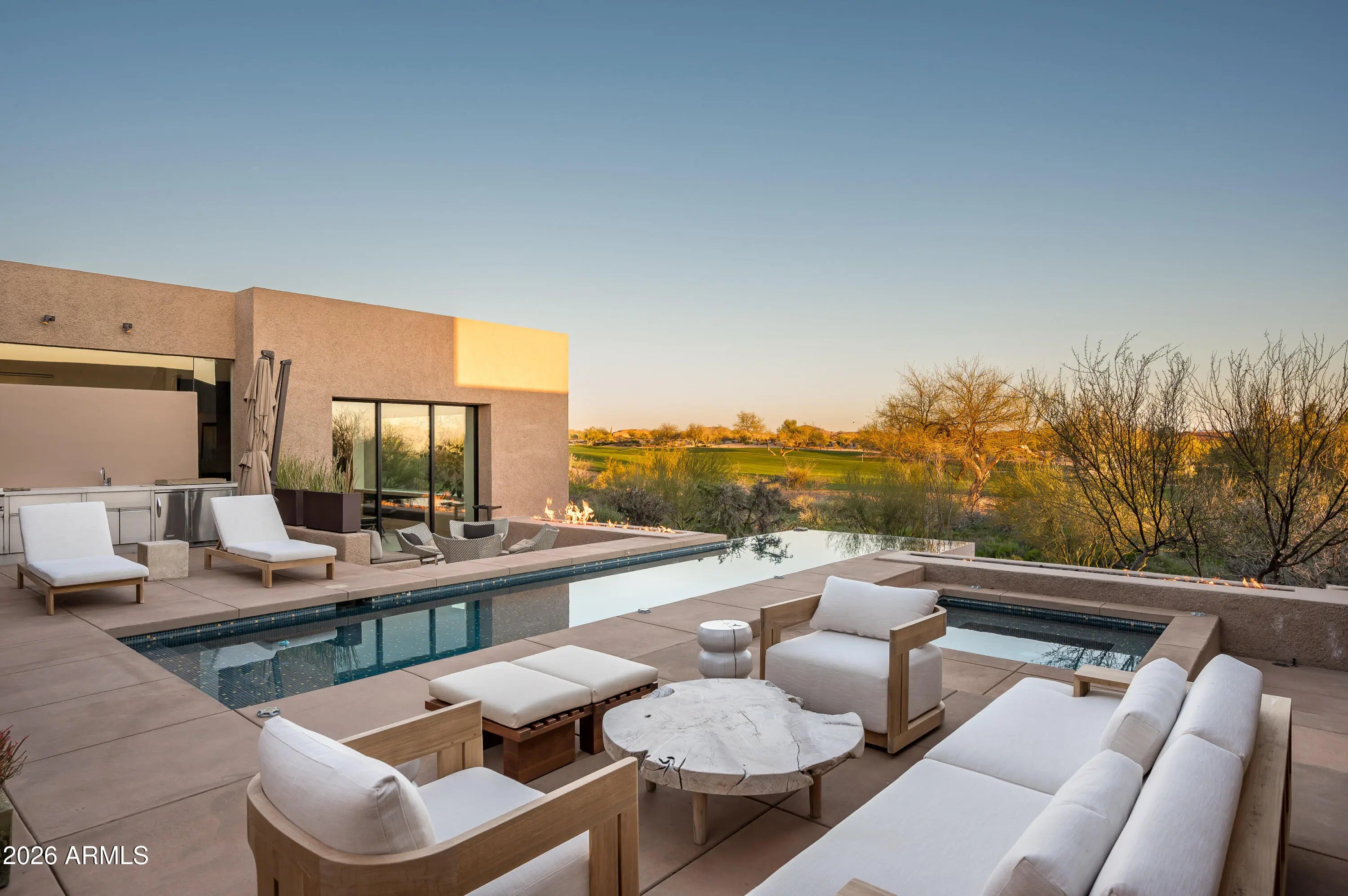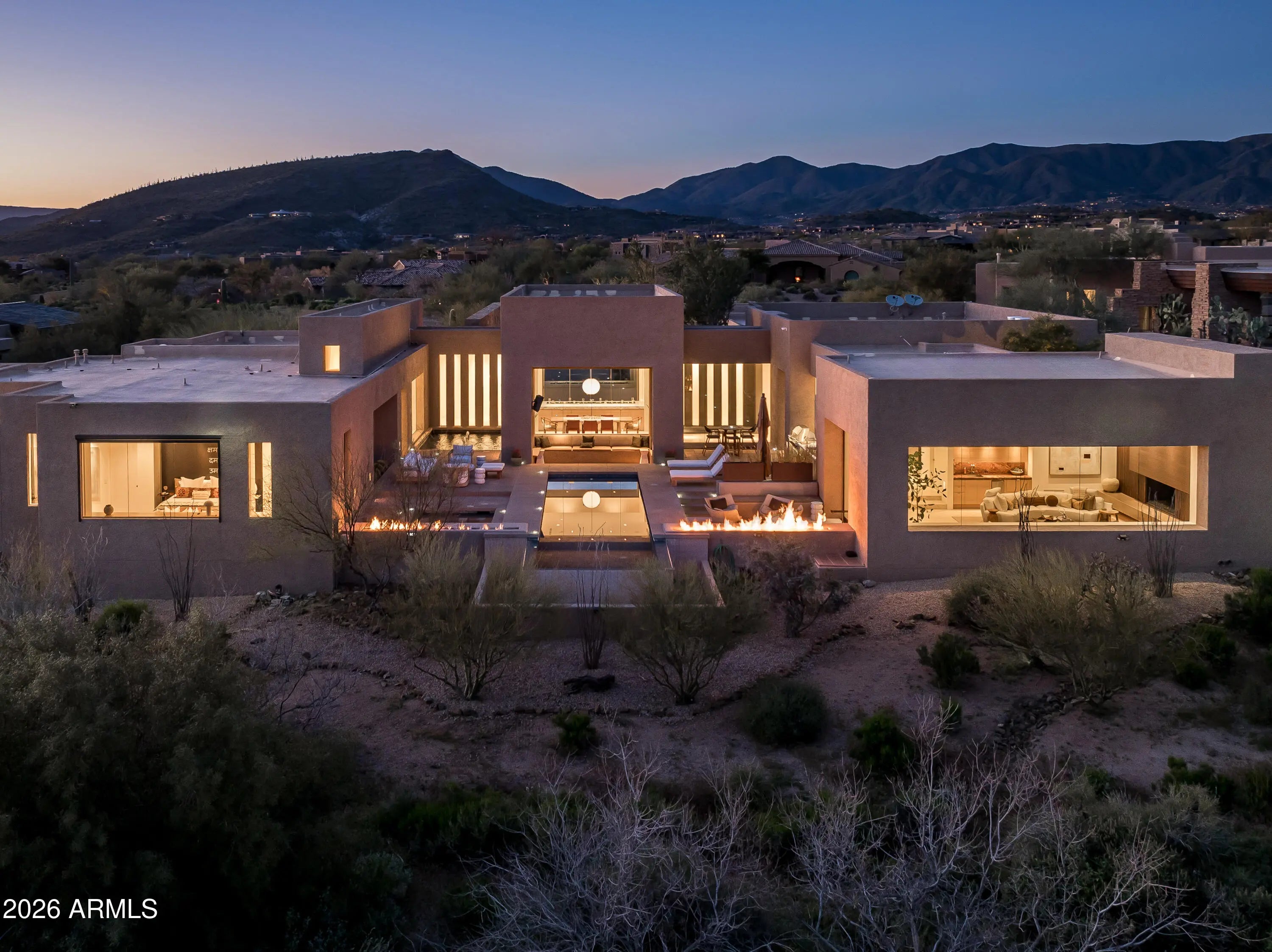 Immerse yourself in the epitome of luxury living with this exquisite contemporary residence, offering timeless modern design and unparalleled quality in Arizona's Desert Mountain community, located within the coveted Sunrise Village.. * LIFESTYLE MEMBERSHIP to Desert Mountain Club is available for transfer to Buyer. Designed by Peter Magee and influenced by renowned architects Ricardo Legorreta and Luis Barragan, this organic masterpiece seamlessly blends indoor and outdoor living, boasting sweeping views over the 7th hole of the Renegade Golf Course. A large stone-clad wall with prominent fire feature in driveway sets the tone upon arrival to the home. Striking glass walls and large windows allow for amazing natural light inside, accenting the Zen ambiance that was imagined when designed. Open floorplan features primary bedroom, office/2nd bedroom, kitchen, TV lounge and dining room in main home. Detached guest casita has 3 additional ensuite bedrooms, providing ideal privacy for owners and guest alike. Kitchen has commercial flair with large stainless steel built in wine wall system adjacent to Wolf/Subzero double oven, double refrigerator/freezer and built-in Miele coffee maker- ideal for both entertainers and culinary enthusiasts. From the captivating outdoor oasis to the meticulously designed interiors, every element speaks of tranquility, elegance, and the artful interplay of light and space. A glass-walled hallway with reflecting pools leads to the dining room with an infinity pool view. The primary suite offers a tranquil sanctuary connected to an open-air reflecting pool. The primary bathroom exudes spa-like luxury with floating vanities, solid limestone counters, and a deep soaking tub. Outdoor amenities include various seating areas, an outdoor kitchen, spa, and a stunning infinity-edge lap pool framed by linear fire feature. From the moment you enter, experience a harmonious fusion of luxury, innovation, and nature, with an inviting outdoor oasis surrounded by lush desert landscapes. FURNITURE AVAILABLE VIA SEPARATE BILL OF SALE. Desert Mountain offers a relaxed, natural setting with exclusive amenities, including guard gated security, private hiking trails, separate private membership club with seven golf courses and nine restaurants. The recently reimagined Sonoran Clubhouse features state of the art fitness center, spa, pickleball and tennis courts, croquet, bocce ball and outdoor heated pools...all within the gated confines of one of America's premier golf and lifestyle destinations.