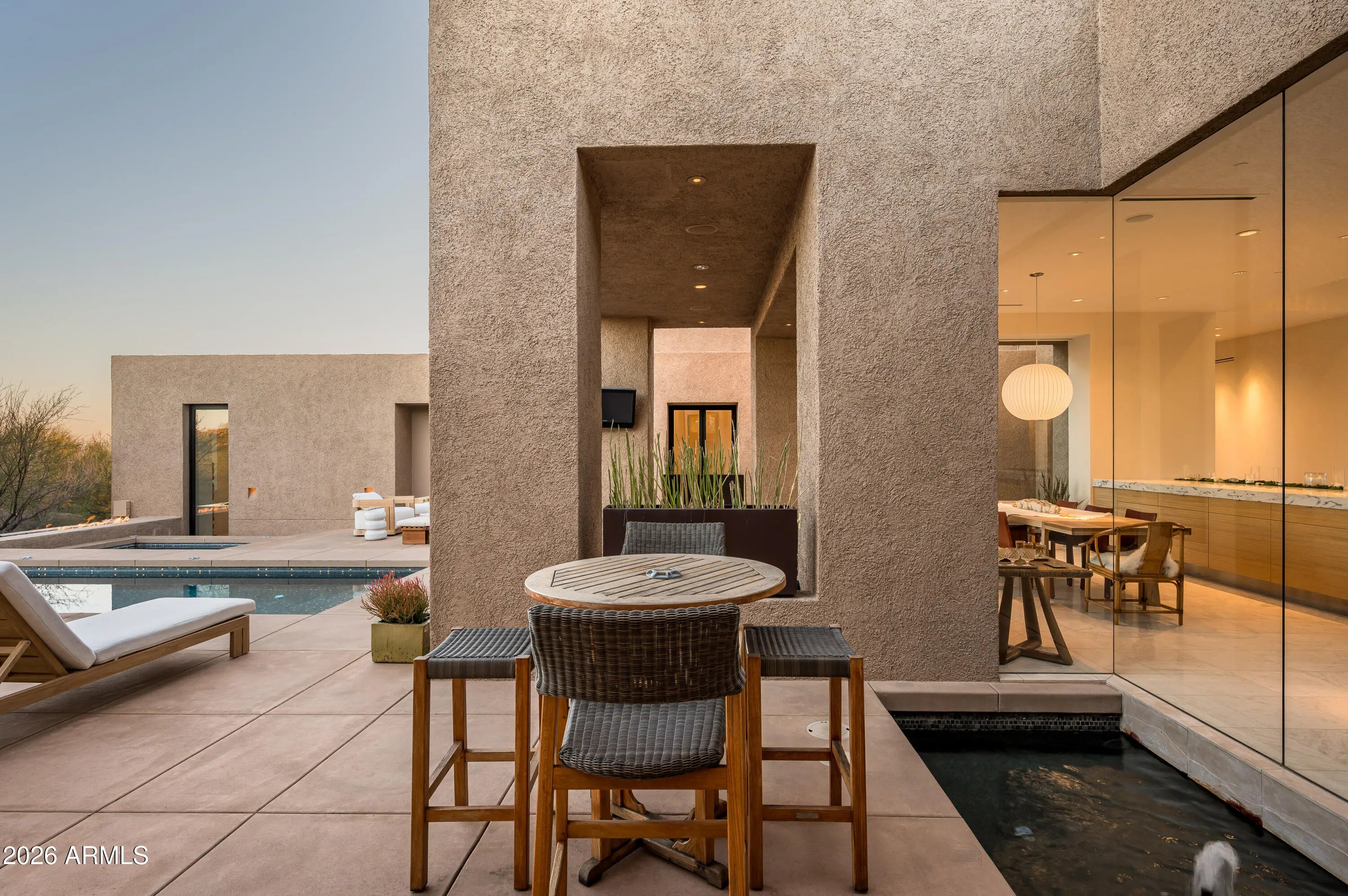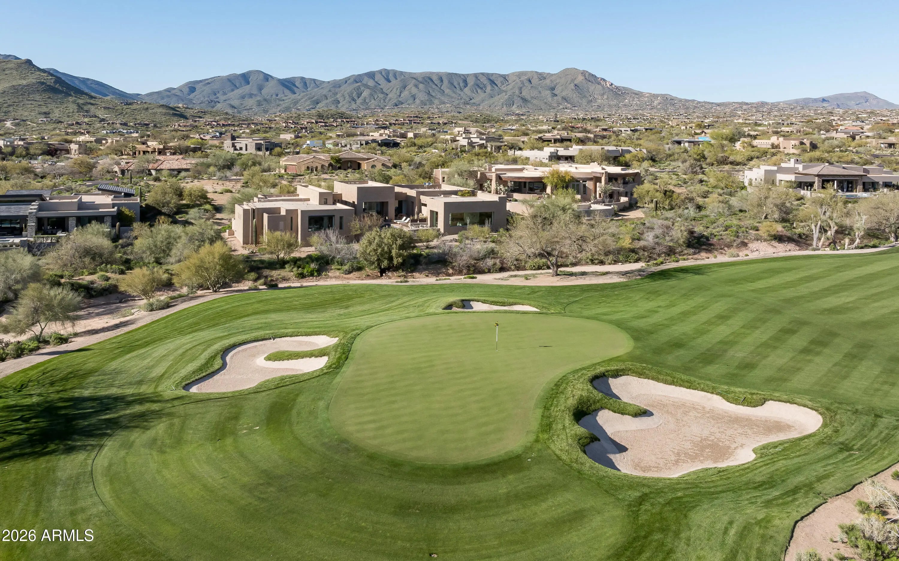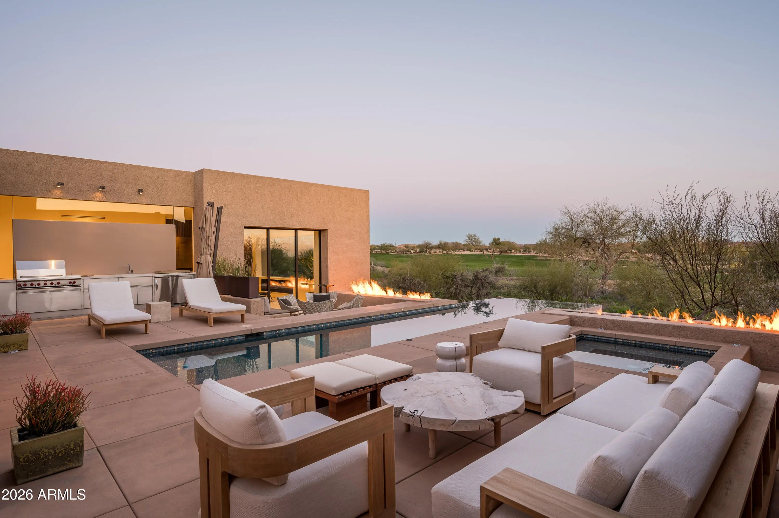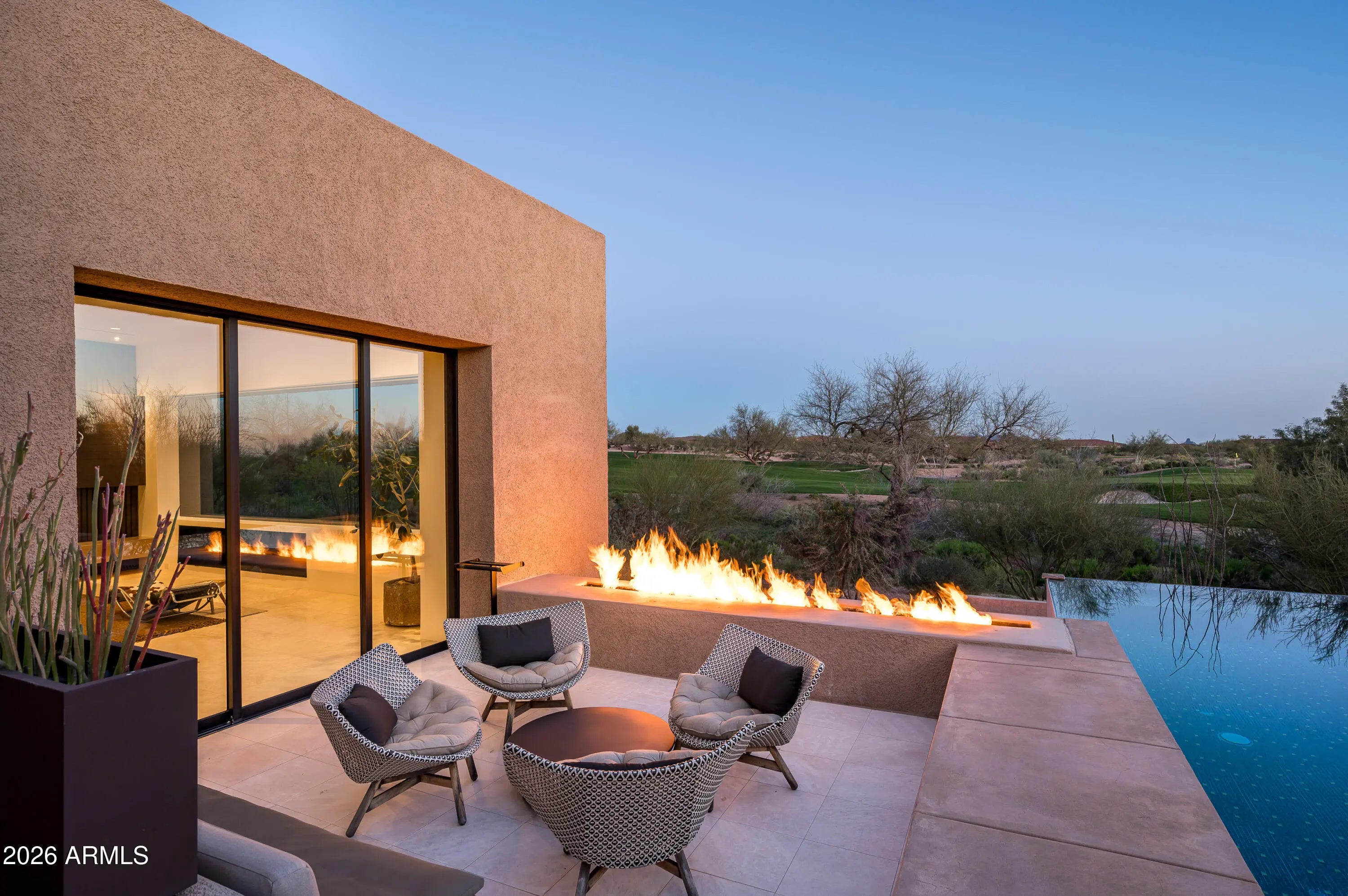Immerse yourself in the epitome of luxury living with this exquisite contemporary residence, offering timeless modern design and unparalleled quality in Arizona's Desert Mountain community, located within the coveted Sunrise Village.. * LIFESTYLE MEMBERSHIP to Desert Mountain Club is available for transfer to Buyer. Designed by Peter Magee and influenced by renowned architects Ricardo Legorreta and Luis Barragan, this organic masterpiece seamlessly blends indoor and outdoor living, boasting sweeping views over the 7th hole of the Renegade Golf Course. A large stone-clad wall with prominent fire feature in driveway sets the tone upon arrival to the home. Striking glass walls and large windows allow for amazing natural light inside, accenting the Zen ambiance that was imagined when designed. Open floorplan features primary bedroom, office/2nd bedroom, kitchen, TV lounge and dining room in main home. Detached guest casita has 3 additional ensuite bedrooms, providing ideal privacy for owners and guest alike. Kitchen has commercial flair with large stainless steel built in wine wall system adjacent to Wolf/Subzero double oven, double refrigerator/freezer and built-in Miele coffee maker- ideal for both entertainers and culinary enthusiasts. From the captivating outdoor oasis to the meticulously designed interiors, every element speaks of tranquility, elegance, and the artful interplay of light and space. A glass-walled hallway with reflecting pools leads to the dining room with an infinity pool view. The primary suite offers a tranquil sanctuary connected to an open-air reflecting pool. The primary bathroom exudes spa-like luxury with floating vanities, solid limestone counters, and a deep soaking tub. Outdoor amenities include various seating areas, an outdoor kitchen, spa, and a stunning infinity-edge lap pool framed by linear fire feature. From the moment you enter, experience a harmonious fusion of luxury, innovation, and nature, with an inviting outdoor oasis surrounded by lush desert landscapes. FURNITURE AVAILABLE VIA SEPARATE BILL OF SALE. Desert Mountain offers a relaxed, natural setting with exclusive amenities, including guard gated security, private hiking trails, separate private membership club with seven golf courses and nine restaurants. The recently reimagined Sonoran Clubhouse features state of the art fitness center, spa, pickleball and tennis courts, croquet, bocce ball and outdoor heated pools...all within the gated confines of one of America's premier golf and lifestyle destinations.
