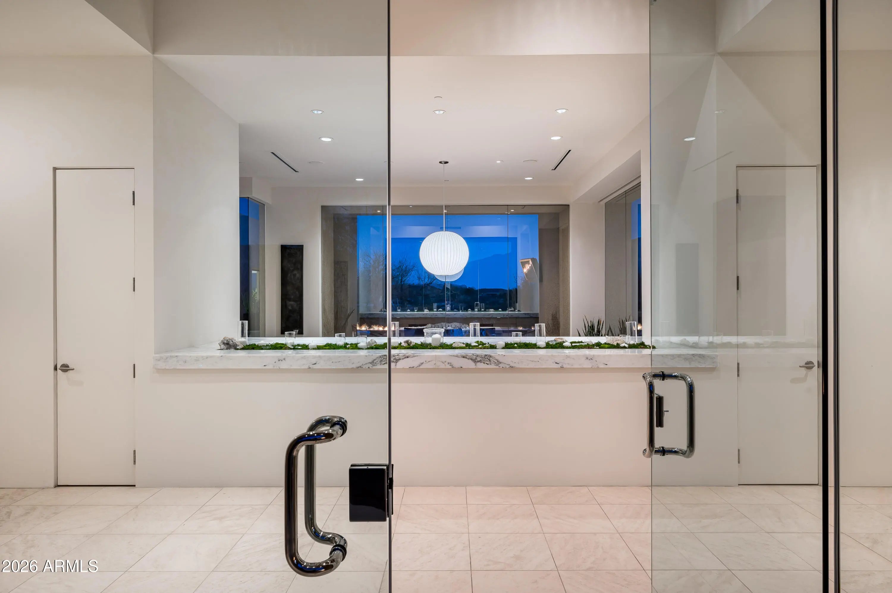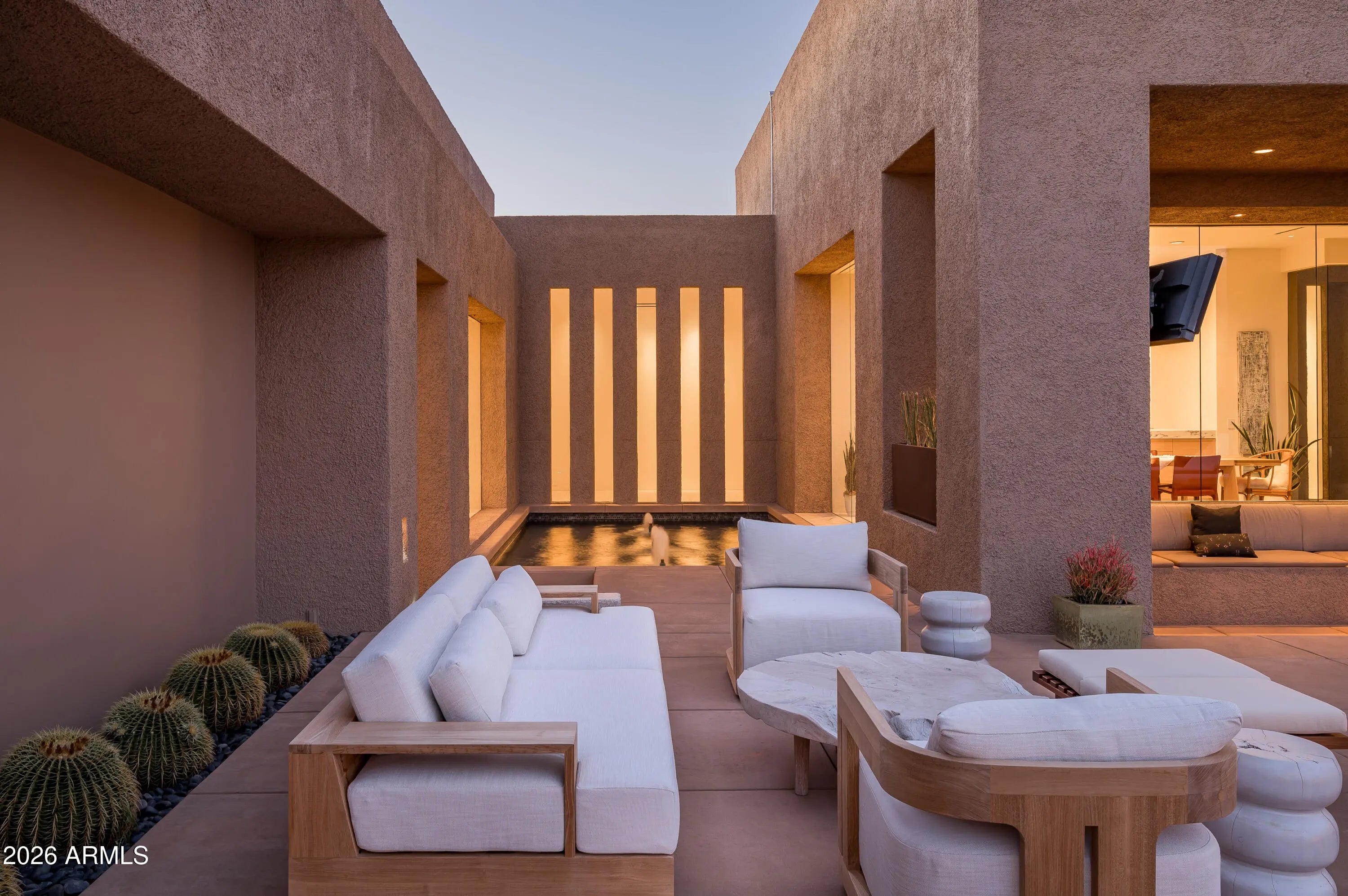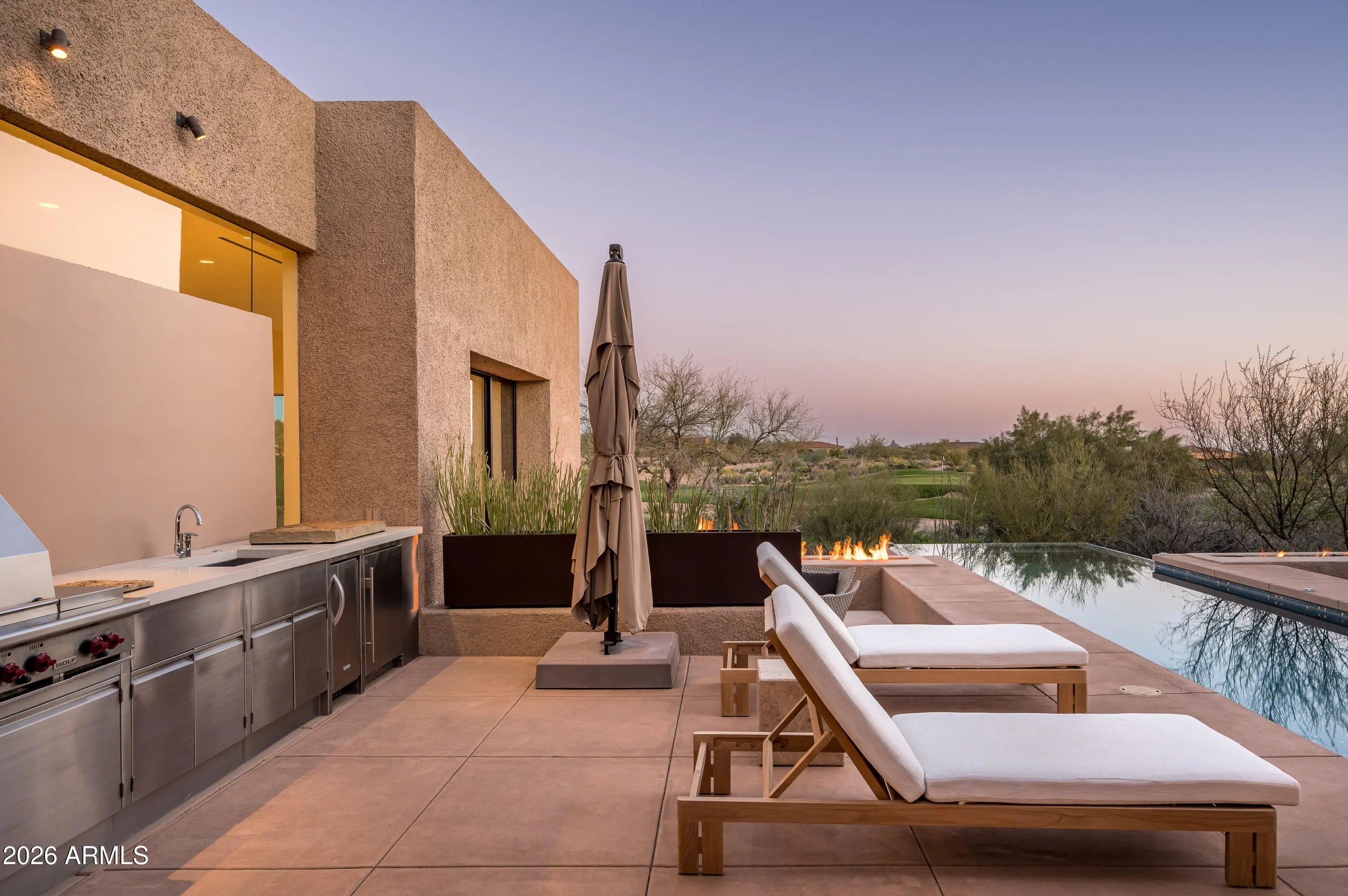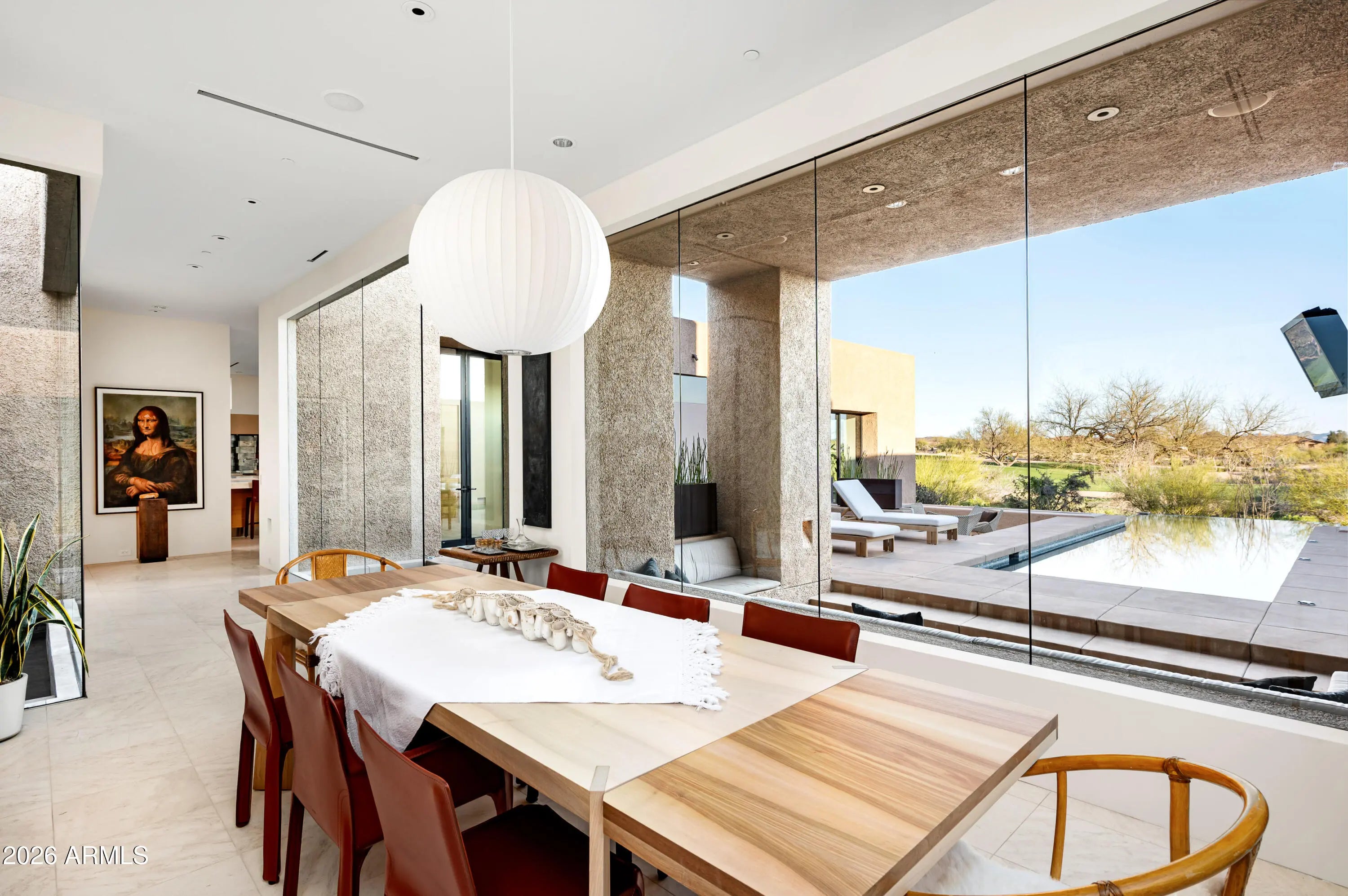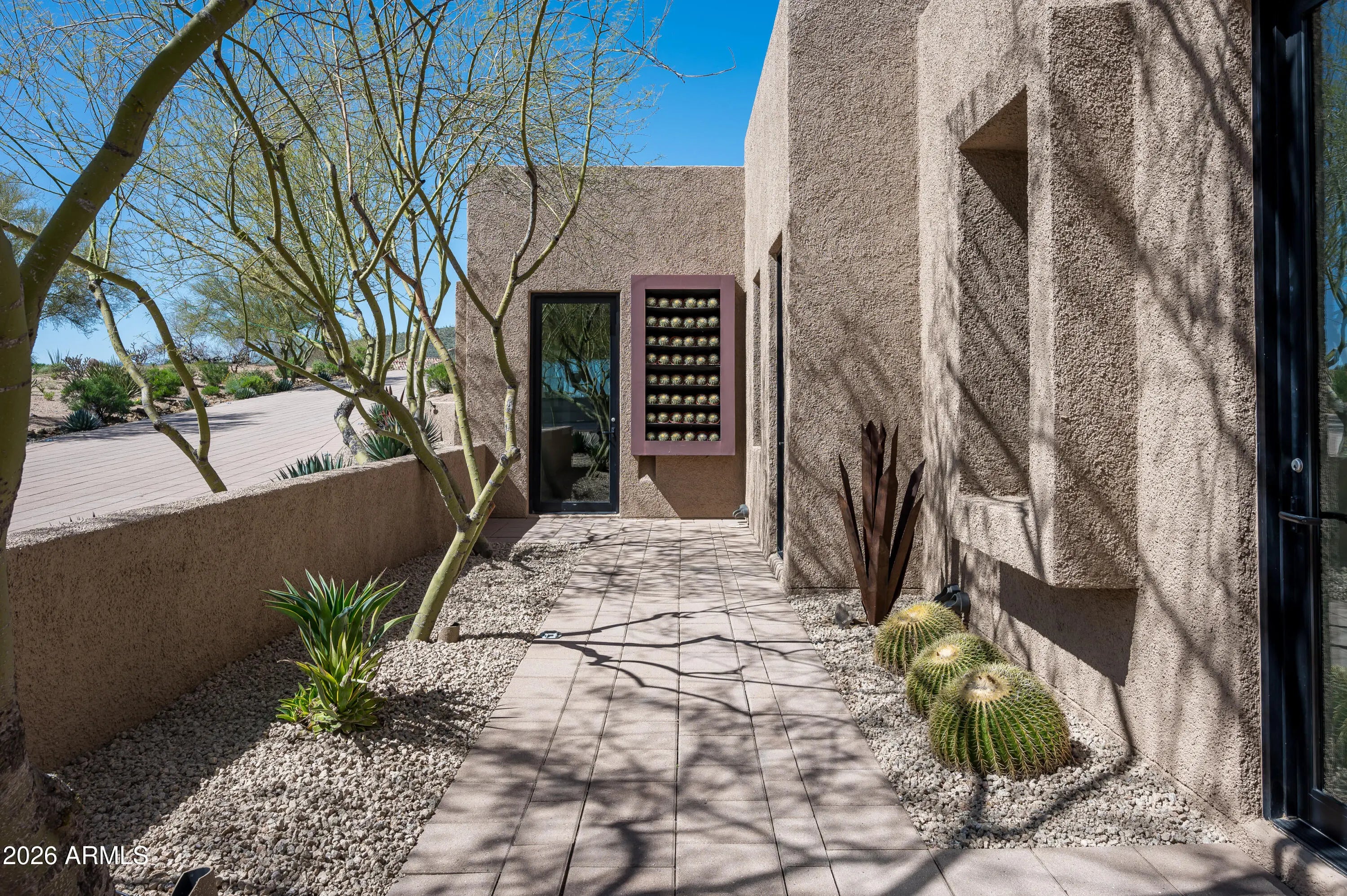 Immerse yourself in the epitome of luxury living with this exquisite contemporary residence, offering timeless modern design and unparalleled quality in Arizona's Desert Mountain community, located within the coveted Sunrise Village.. * LIFESTYLE MEMBERSHIP to Desert Mountain Club is available for transfer to Buyer. Designed by Peter Magee and influenced by renowned architects Ricardo Legorreta and Luis Barragan, this organic masterpiece seamlessly blends indoor and outdoor living, boasting sweeping views over the 7th hole of the Renegade Golf Course. A large stone-clad wall with prominent fire feature in driveway sets the tone upon arrival to the home. Striking glass walls and large windows allow for amazing natural light inside, accenting the Zen ambiance that was imagined when designed. Open floorplan features primary bedroom, office/2nd bedroom, kitchen, TV lounge and dining room in main home. Detached guest casita has 3 additional ensuite bedrooms, providing ideal privacy for owners and guest alike. Kitchen has commercial flair with large stainless steel built in wine wall system adjacent to Wolf/Subzero double oven, double refrigerator/freezer and built-in Miele coffee maker- ideal for both entertainers and culinary enthusiasts. From the captivating outdoor oasis to the meticulously designed interiors, every element speaks of tranquility, elegance, and the artful interplay of light and space. A glass-walled hallway with reflecting pools leads to the dining room with an infinity pool view. The primary suite offers a tranquil sanctuary connected to an open-air reflecting pool. The primary bathroom exudes spa-like luxury with floating vanities, solid limestone counters, and a deep soaking tub. Outdoor amenities include various seating areas, an outdoor kitchen, spa, and a stunning infinity-edge lap pool framed by linear fire feature. From the moment you enter, experience a harmonious fusion of luxury, innovation, and nature, with an inviting outdoor oasis surrounded by lush desert landscapes. FURNITURE AVAILABLE VIA SEPARATE BILL OF SALE. Desert Mountain offers a relaxed, natural setting with exclusive amenities, including guard gated security, private hiking trails, separate private membership club with seven golf courses and nine restaurants. The recently reimagined Sonoran Clubhouse features state of the art fitness center, spa, pickleball and tennis courts, croquet, bocce ball and outdoor heated pools...all within the gated confines of one of America's premier golf and lifestyle destinations.