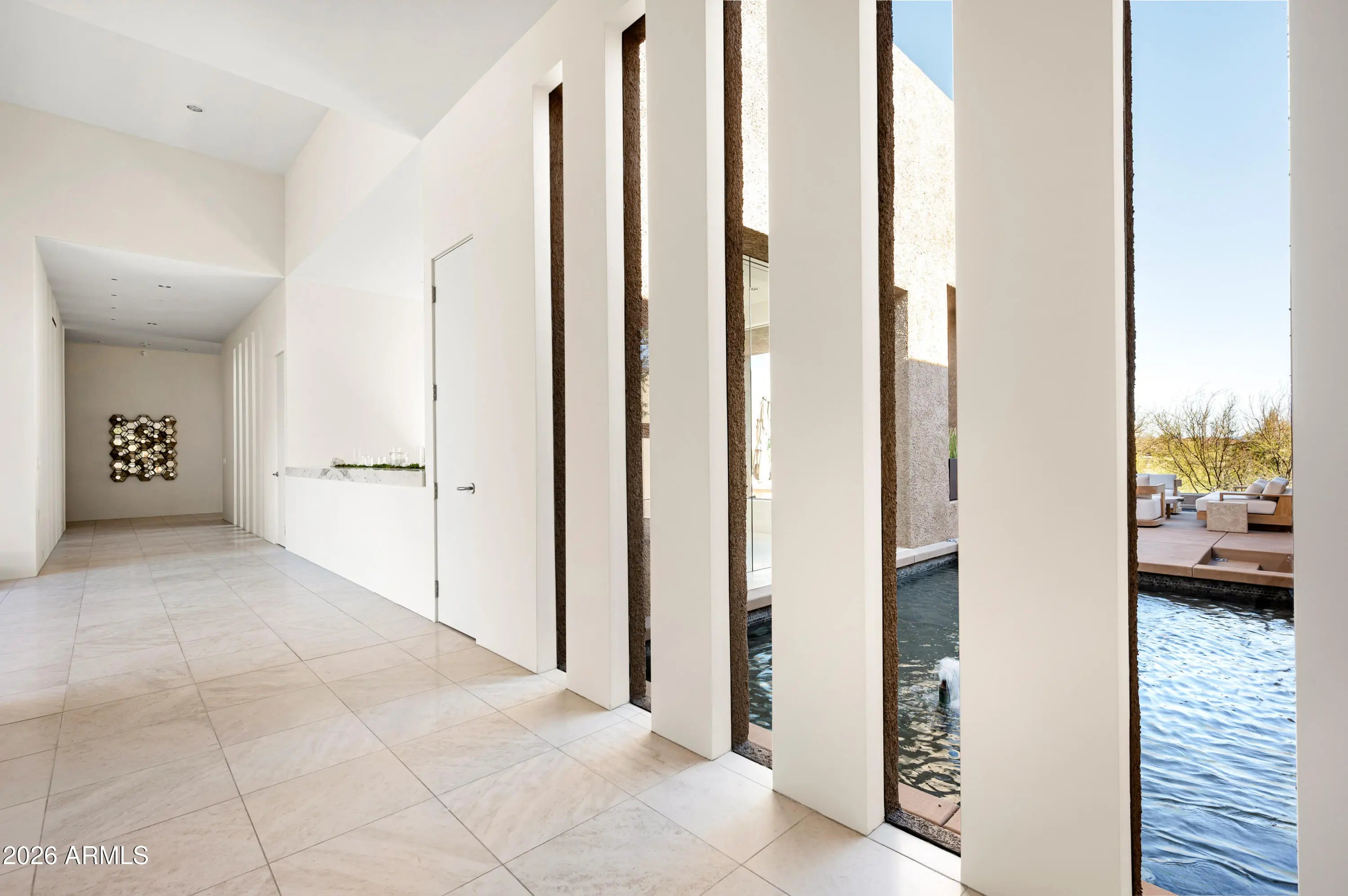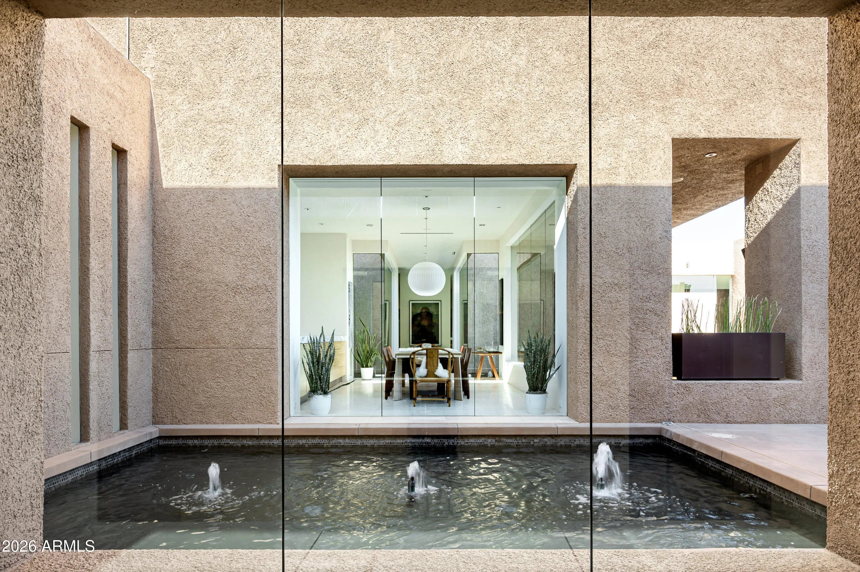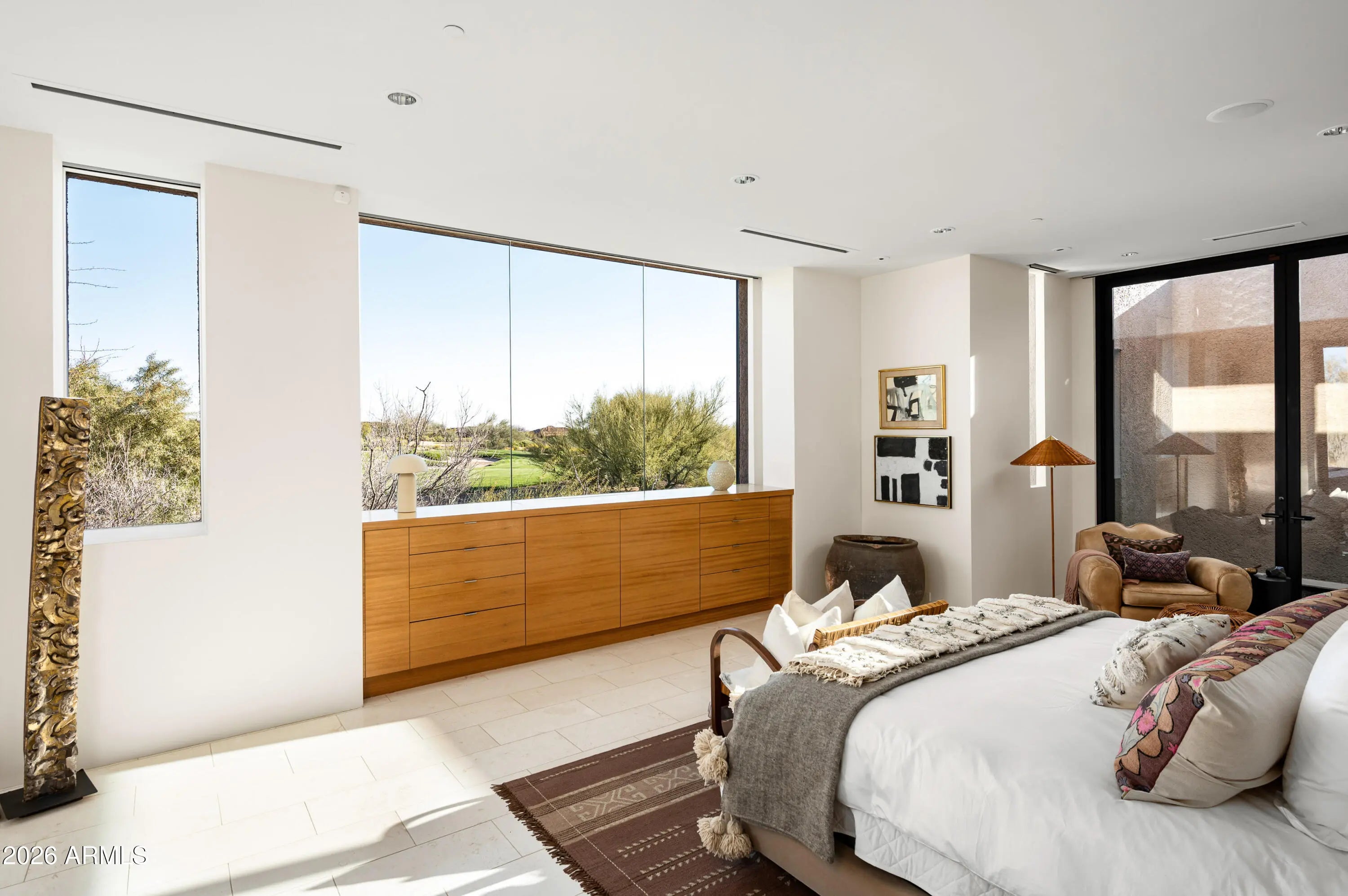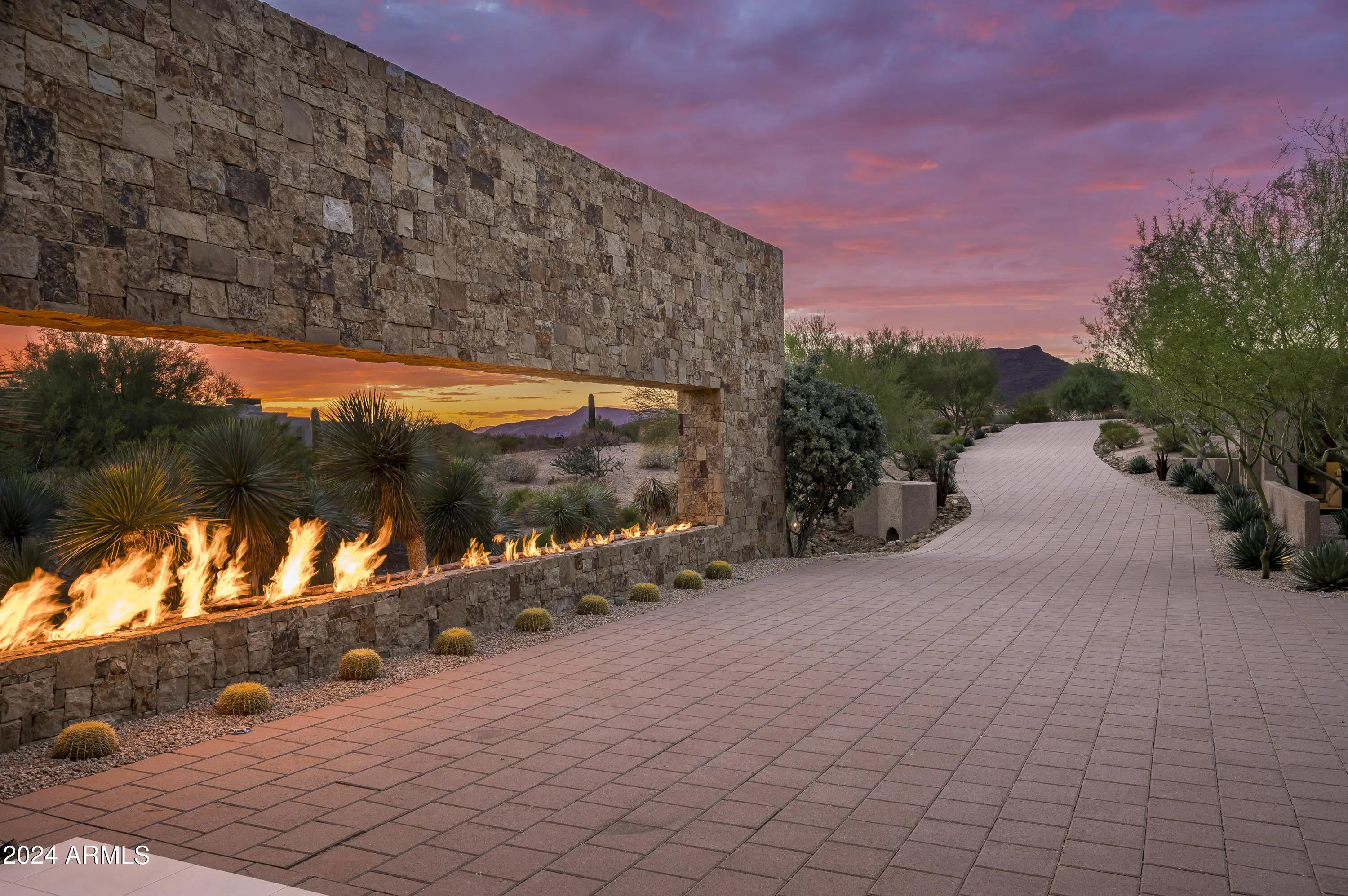 Immerse yourself in the epitome of luxury living with this exquisite contemporary residence, offering timeless modern design and unparalleled quality in Arizona's Desert Mountain community, located within the coveted Sunrise Village.. * LIFESTYLE MEMBERSHIP to Desert Mountain Club is available for transfer to Buyer. Designed by Peter Magee and influenced by renowned architects Ricardo Legorreta and Luis Barragan, this organic masterpiece seamlessly blends indoor and outdoor living, boasting sweeping views over the 7th hole of the Renegade Golf Course. A large stone-clad wall with prominent fire feature in driveway sets the tone upon arrival to the home. Striking glass walls and large windows allow for amazing natural light inside, accenting the Zen ambiance that was imagined when designed. Open floorplan features primary bedroom, office/2nd bedroom, kitchen, TV lounge and dining room in main home. Detached guest casita has 3 additional ensuite bedrooms, providing ideal privacy for owners and guest alike. Kitchen has commercial flair with large stainless steel built in wine wall system adjacent to Wolf/Subzero double oven, double refrigerator/freezer and built-in Miele coffee maker- ideal for both entertainers and culinary enthusiasts. From the captivating outdoor oasis to the meticulously designed interiors, every element speaks of tranquility, elegance, and the artful interplay of light and space. A glass-walled hallway with reflecting pools leads to the dining room with an infinity pool view. The primary suite offers a tranquil sanctuary connected to an open-air reflecting pool. The primary bathroom exudes spa-like luxury with floating vanities, solid limestone counters, and a deep soaking tub. Outdoor amenities include various seating areas, an outdoor kitchen, spa, and a stunning infinity-edge lap pool framed by linear fire feature. From the moment you enter, experience a harmonious fusion of luxury, innovation, and nature, with an inviting outdoor oasis surrounded by lush desert landscapes. FURNITURE AVAILABLE VIA SEPARATE BILL OF SALE. Desert Mountain offers a relaxed, natural setting with exclusive amenities, including guard gated security, private hiking trails, separate private membership club with seven golf courses and nine restaurants. The recently reimagined Sonoran Clubhouse features state of the art fitness center, spa, pickleball and tennis courts, croquet, bocce ball and outdoor heated pools...all within the gated confines of one of America's premier golf and lifestyle destinations.