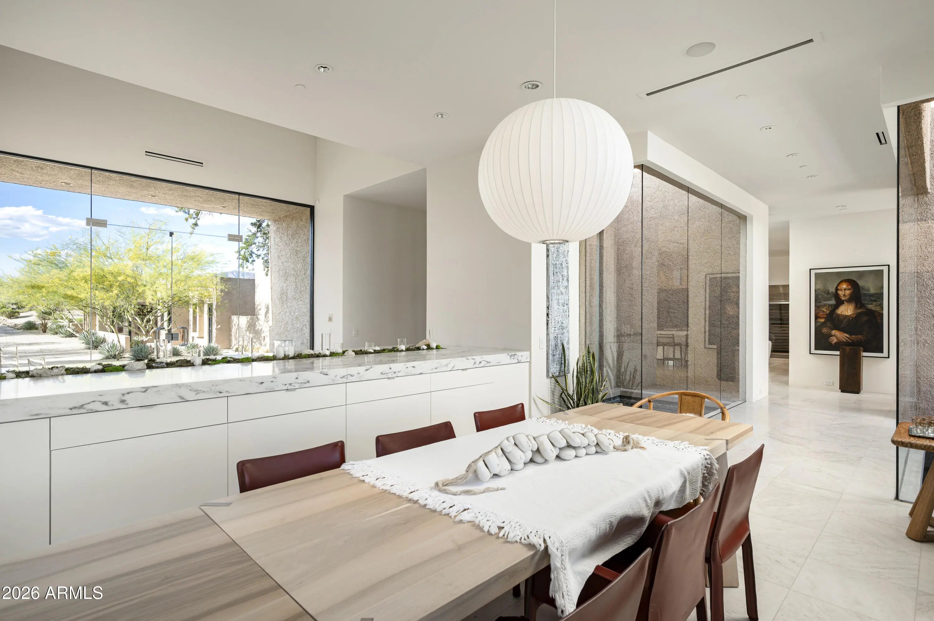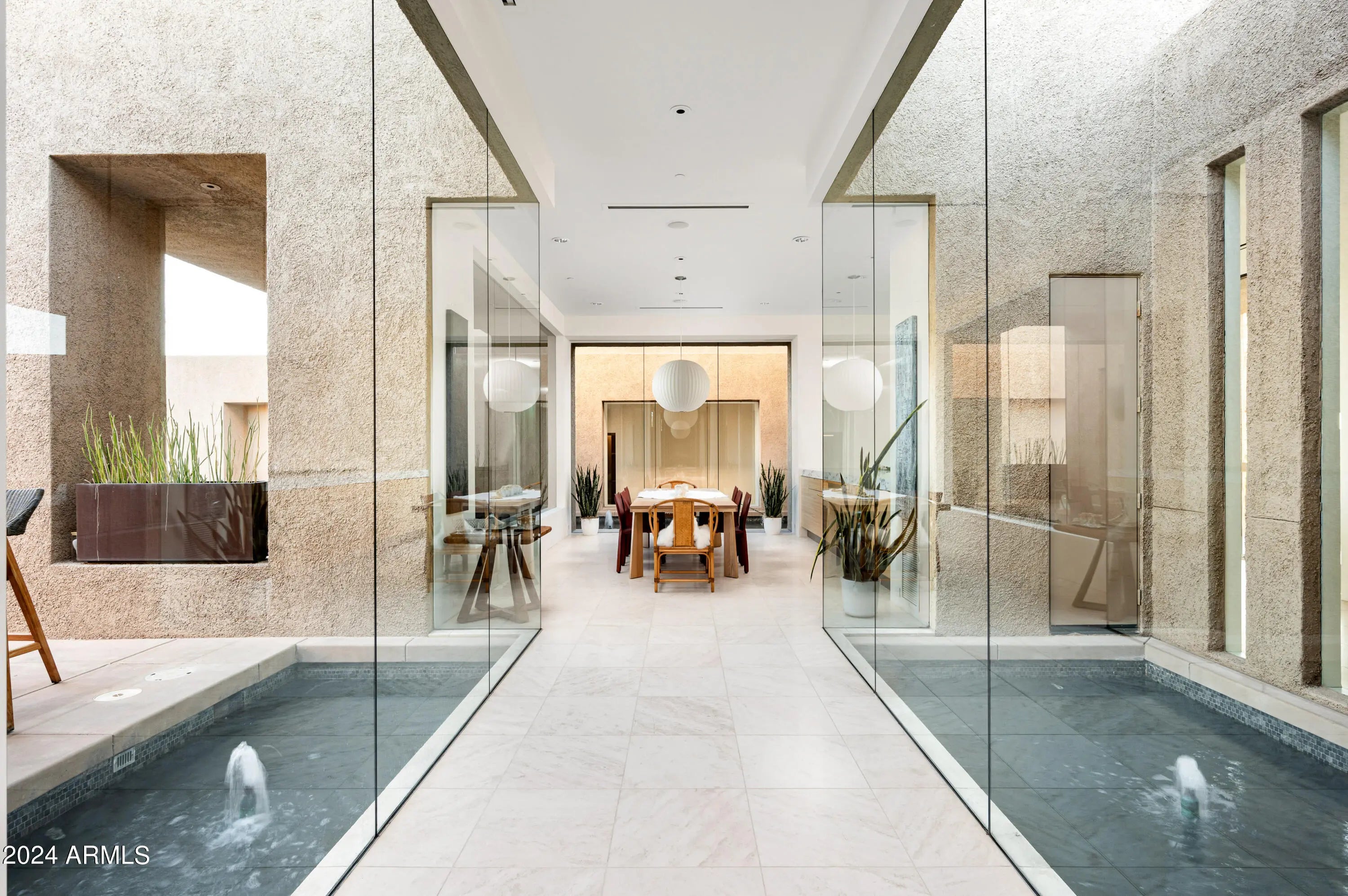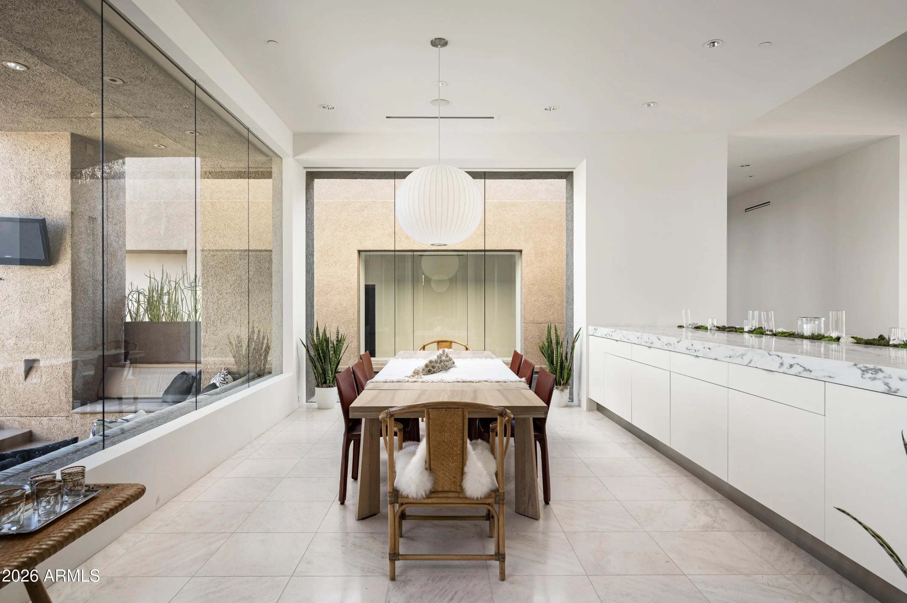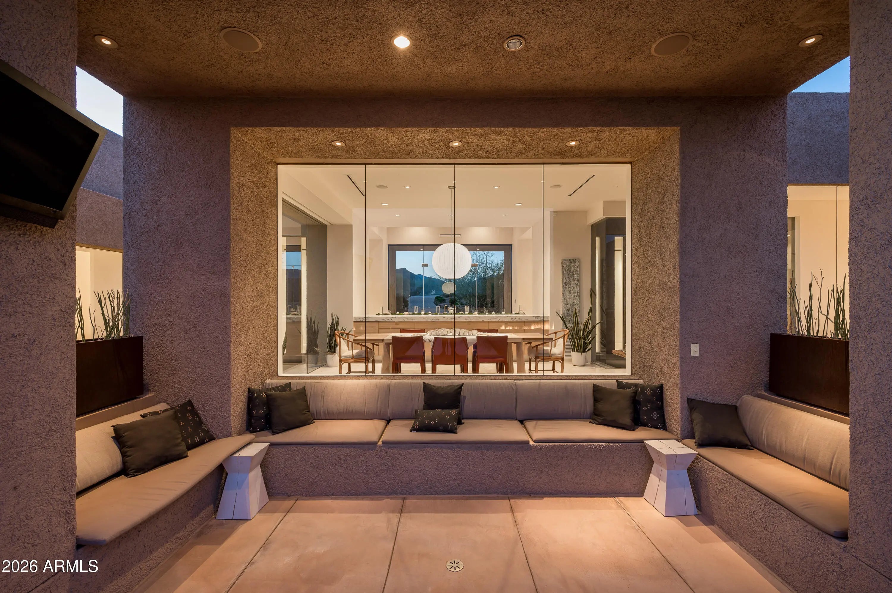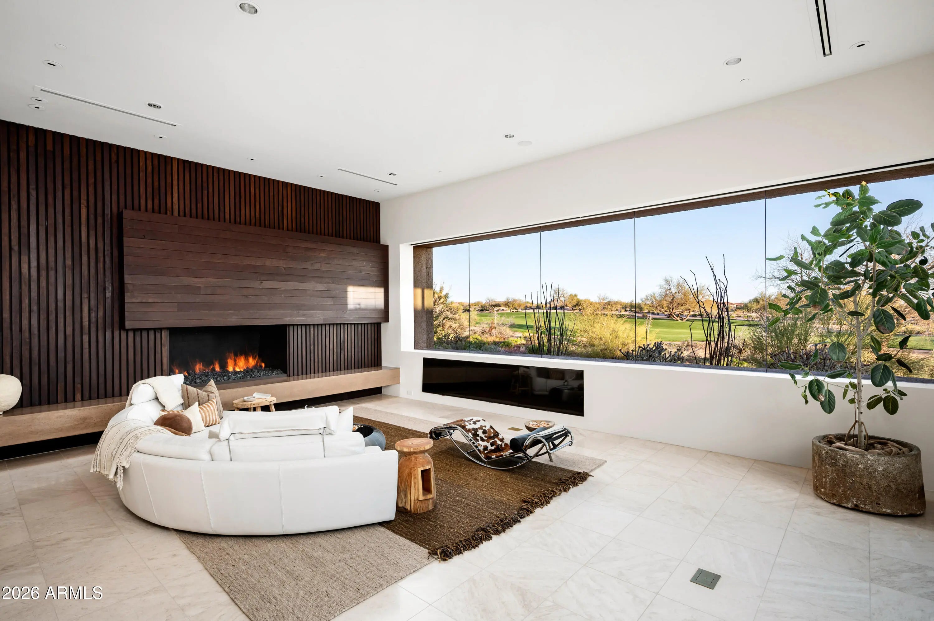 Immerse yourself in the epitome of luxury living with this exquisite contemporary residence, offering timeless modern design and unparalleled quality in Arizona's Desert Mountain community, located within the coveted Sunrise Village.. * LIFESTYLE MEMBERSHIP to Desert Mountain Club is available for transfer to Buyer. Designed by Peter Magee and influenced by renowned architects Ricardo Legorreta and Luis Barragan, this organic masterpiece seamlessly blends indoor and outdoor living, boasting sweeping views over the 7th hole of the Renegade Golf Course. A large stone-clad wall with prominent fire feature in driveway sets the tone upon arrival to the home. Striking glass walls and large windows allow for amazing natural light inside, accenting the Zen ambiance that was imagined when designed. Open floorplan features primary bedroom, office/2nd bedroom, kitchen, TV lounge and dining room in main home. Detached guest casita has 3 additional ensuite bedrooms, providing ideal privacy for owners and guest alike. Kitchen has commercial flair with large stainless steel built in wine wall system adjacent to Wolf/Subzero double oven, double refrigerator/freezer and built-in Miele coffee maker- ideal for both entertainers and culinary enthusiasts. From the captivating outdoor oasis to the meticulously designed interiors, every element speaks of tranquility, elegance, and the artful interplay of light and space. A glass-walled hallway with reflecting pools leads to the dining room with an infinity pool view. The primary suite offers a tranquil sanctuary connected to an open-air reflecting pool. The primary bathroom exudes spa-like luxury with floating vanities, solid limestone counters, and a deep soaking tub. Outdoor amenities include various seating areas, an outdoor kitchen, spa, and a stunning infinity-edge lap pool framed by linear fire feature. From the moment you enter, experience a harmonious fusion of luxury, innovation, and nature, with an inviting outdoor oasis surrounded by lush desert landscapes. FURNITURE AVAILABLE VIA SEPARATE BILL OF SALE. Desert Mountain offers a relaxed, natural setting with exclusive amenities, including guard gated security, private hiking trails, separate private membership club with seven golf courses and nine restaurants. The recently reimagined Sonoran Clubhouse features state of the art fitness center, spa, pickleball and tennis courts, croquet, bocce ball and outdoor heated pools...all within the gated confines of one of America's premier golf and lifestyle destinations.