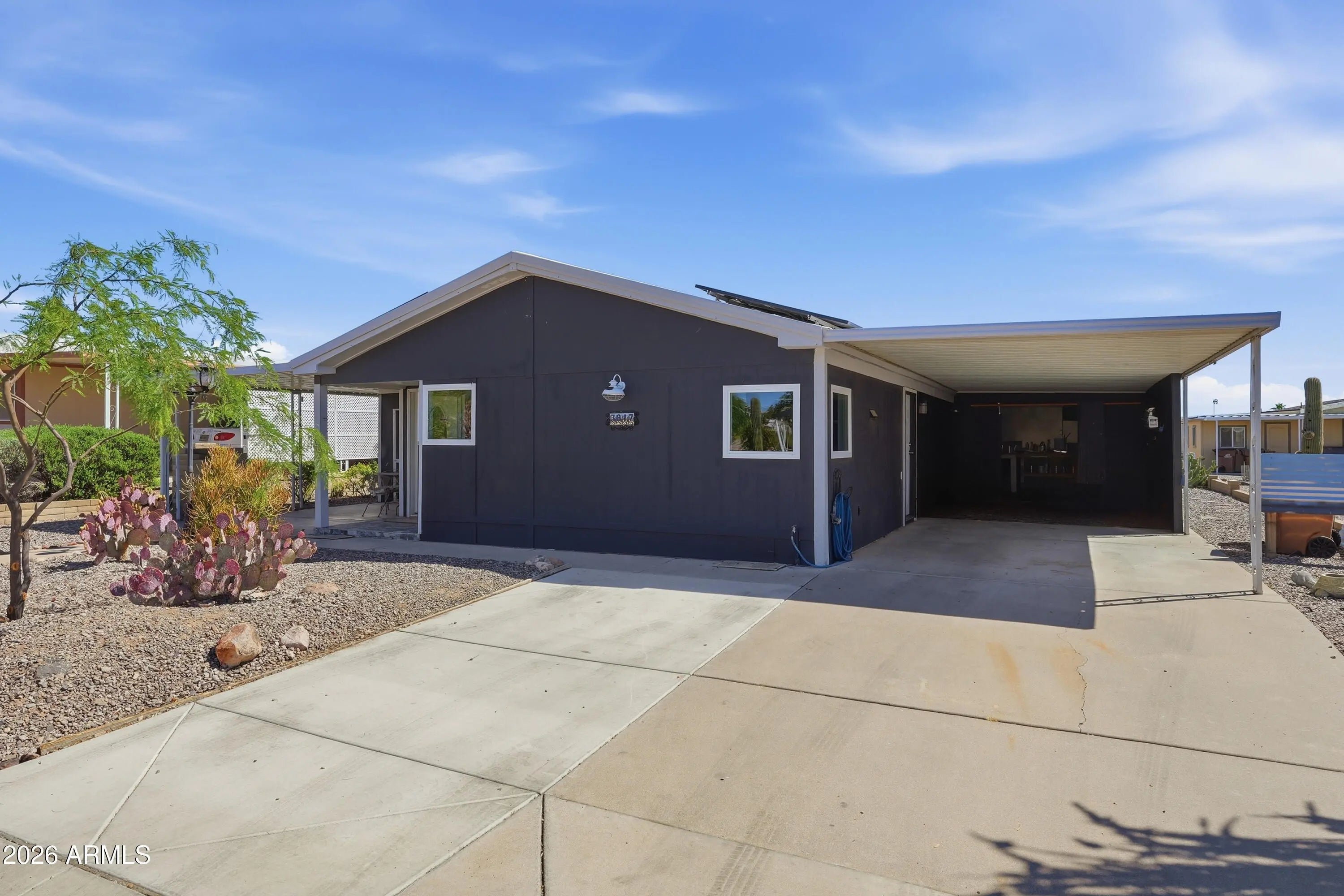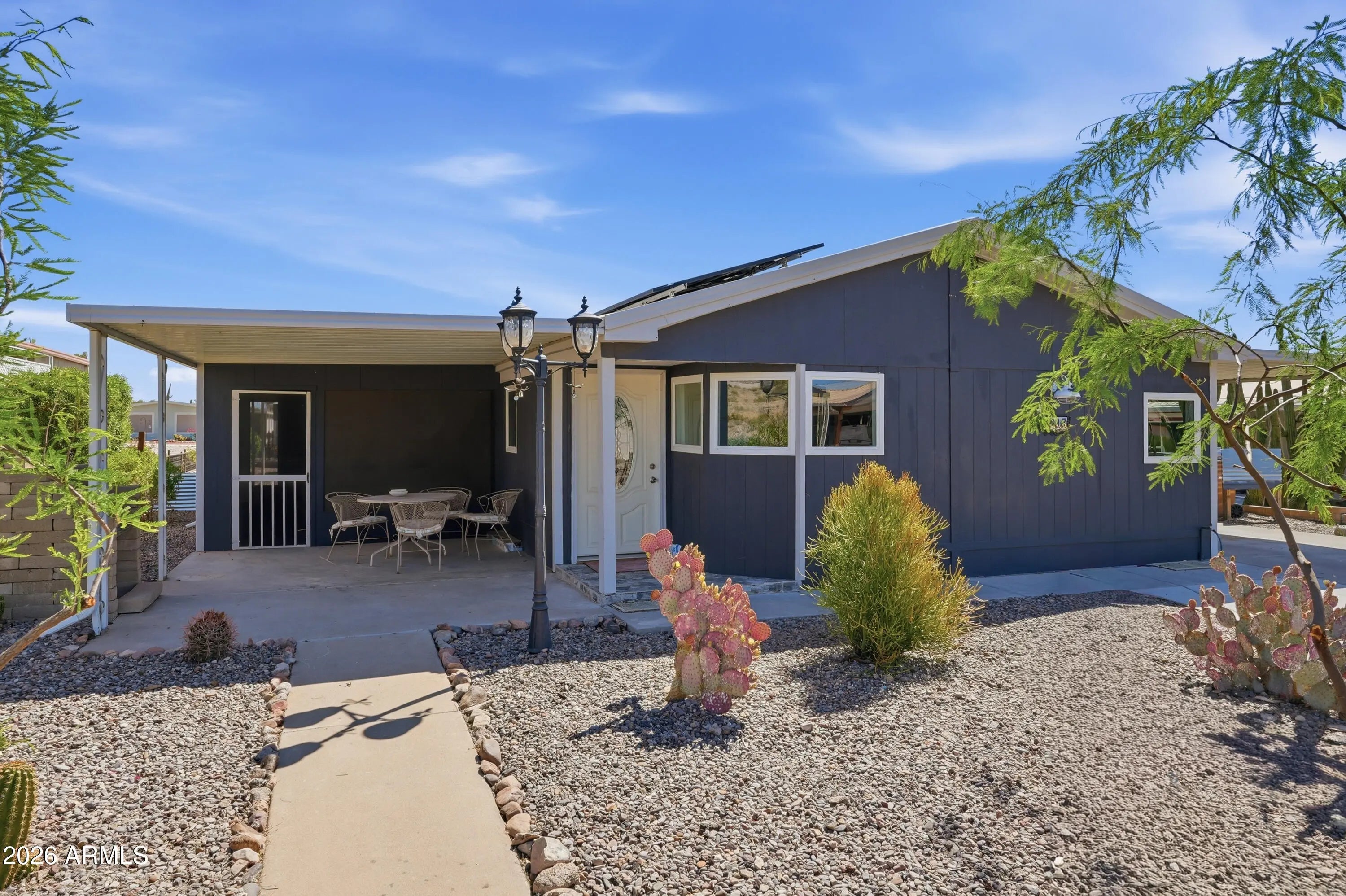 Very clean well maintained 2 bd 2 full bathrooms. Ground set home with a carport and shop on one side on the other side is a covered patio with an office/ man cave. Both bathrooms have walk-in custom Tiled showers the kind you find in custom homes!! All appliances are included including washer and dryer. Master bedroom has two closets and doors out to the backyard that is very well landscaped Owners just bought a solar system that will greatly reduce the electric bills. Must see Over 55 only