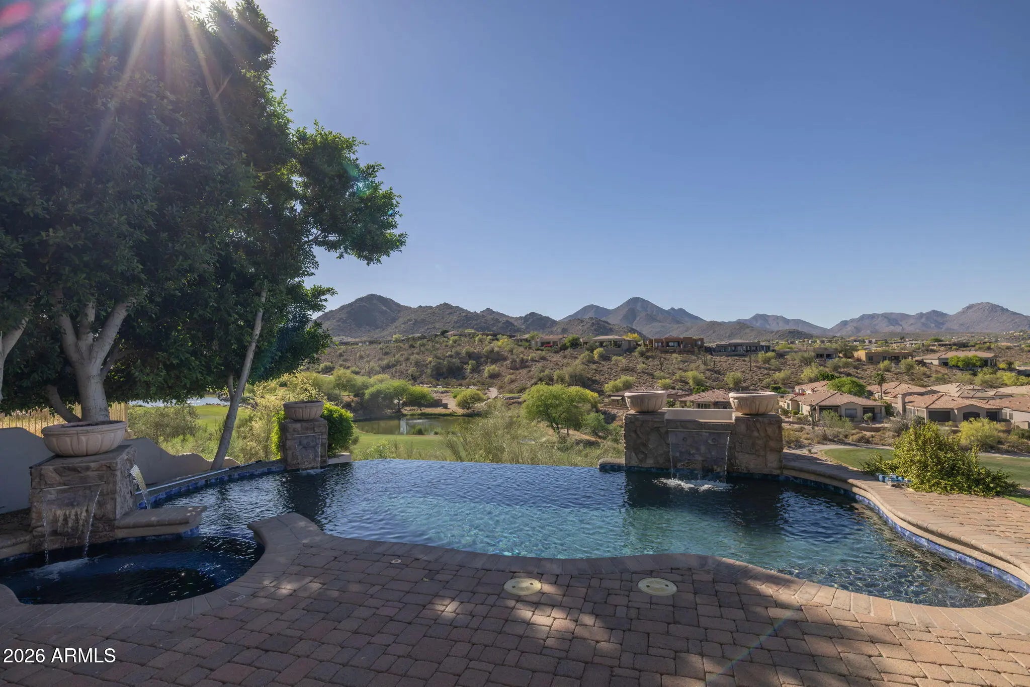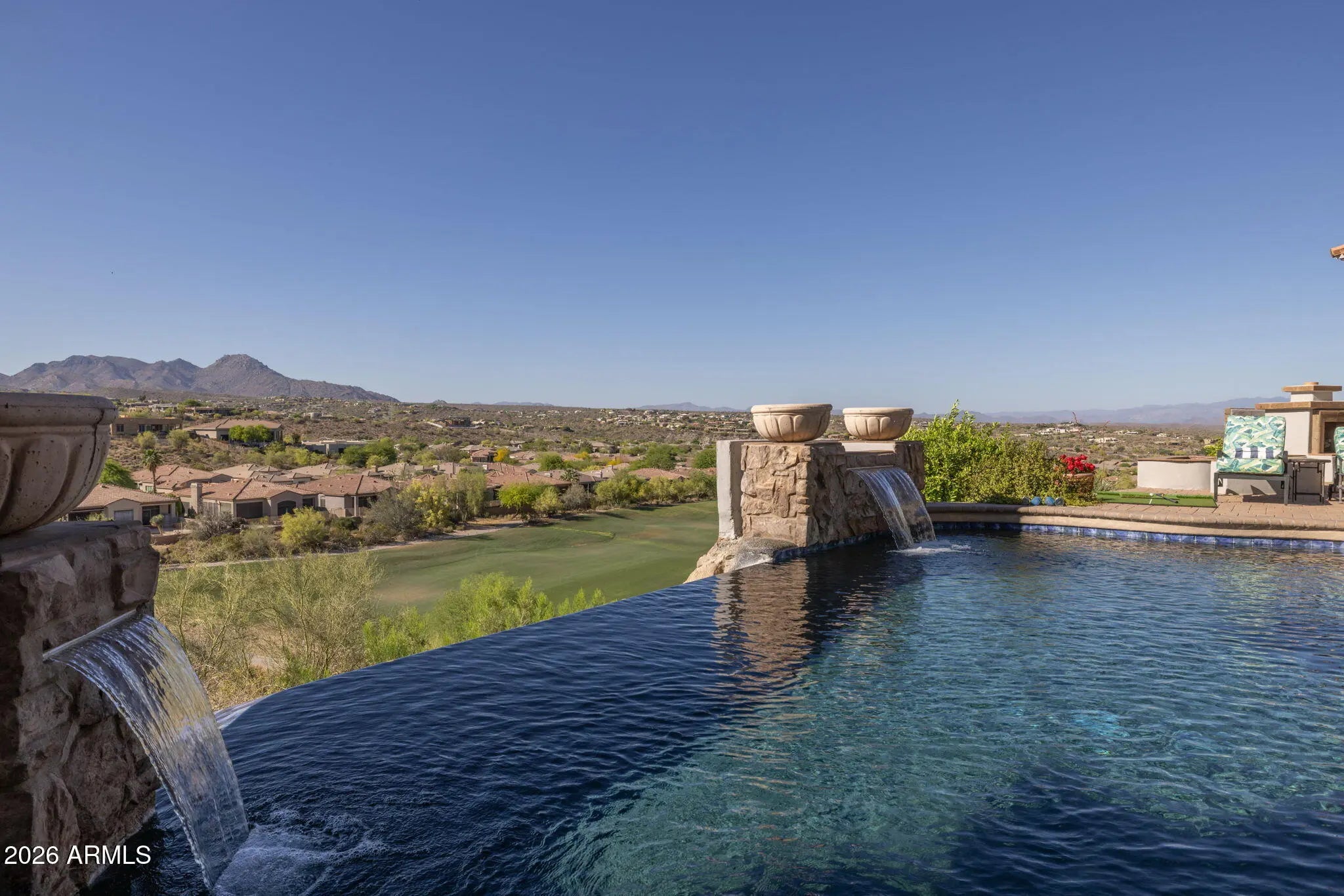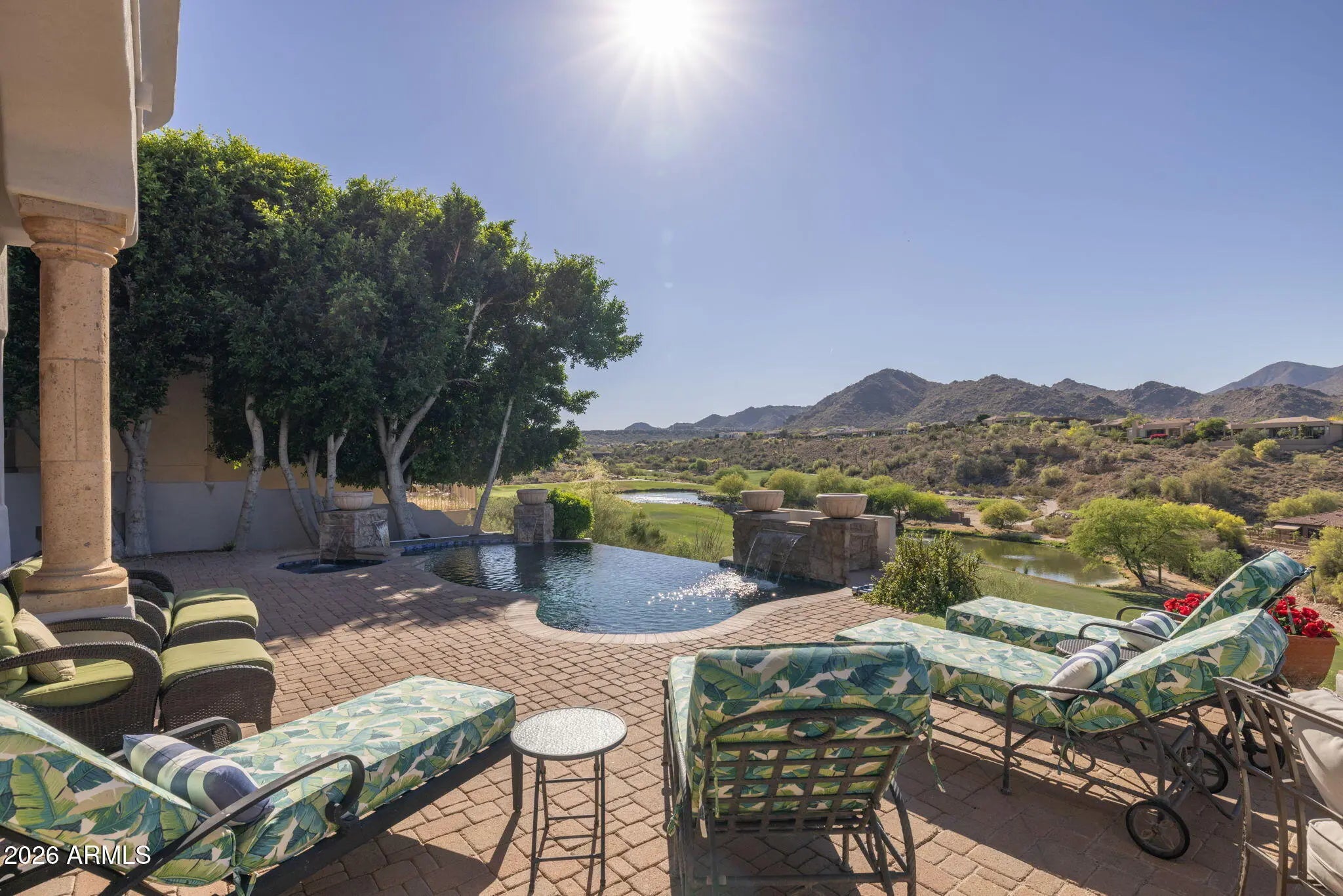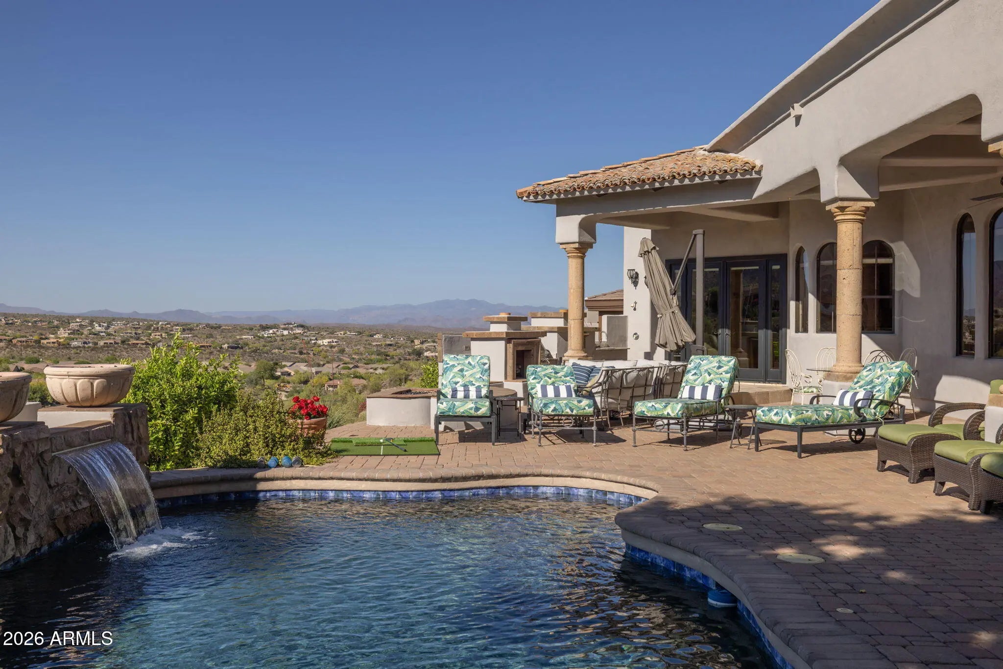 Perched high above the Sunridge Canyon Golf Course, this exceptional single-level custom residence captures sweeping, unobstructed views of two tranquil ponds, a cascading waterfall, and 180-degree mountain vistas. Thoughtfully designed with three private wings including an attached casita with its own bath--gracefully positioned off a charming courtyard--the home offers both elegance and versatility for refined living. European-inspired finishes are showcased throughout, reflecting meticulous craftsmanship and a commitment to quality without compromise. The chef's kitchen is a true centerpiece, appointed with top-tier appliances, an impressive center island, and an adjoining butler's pantry designed to support both everyday living and elevated entertaining. Click more for more remarks.. The open-concept floor plan flows effortlessly, featuring a curved bar, expansive living and dining areas, and walls of windows that frame the breathtaking surroundings. The primary suite serves as a serene, light-filled retreat, complete with a fireplace, stunning views, and a spa-inspired bath designed for ultimate relaxation. A dedicated guest wing offers exceptional comfort and privacy, including a media room with a service bar and two generously sized en-suite bedrooms. Outdoors, the resort-style backyard is nothing short of extraordinary. Enjoy a heated negative-edge pool and spa accented by gas fire bowls, lush landscaping--including a citrus garden--along with a firepit, outdoor fireplace, and a wood-burning pizza oven. Designed for both intimate evenings and grand entertaining, the setting is enhanced by panoramic golf course and mountain views, all while maintaining complete privacy. Perfectly oriented to capture spectacular sunsets without harsh afternoon sun, the home also includes integrated TV and surround sound systems in both the media room and great room. Representing one of the most distinguished properties in this exclusive enclave of Sunridge Canyon, this residence offers a rare opportunity to experience luxury living at its finest.