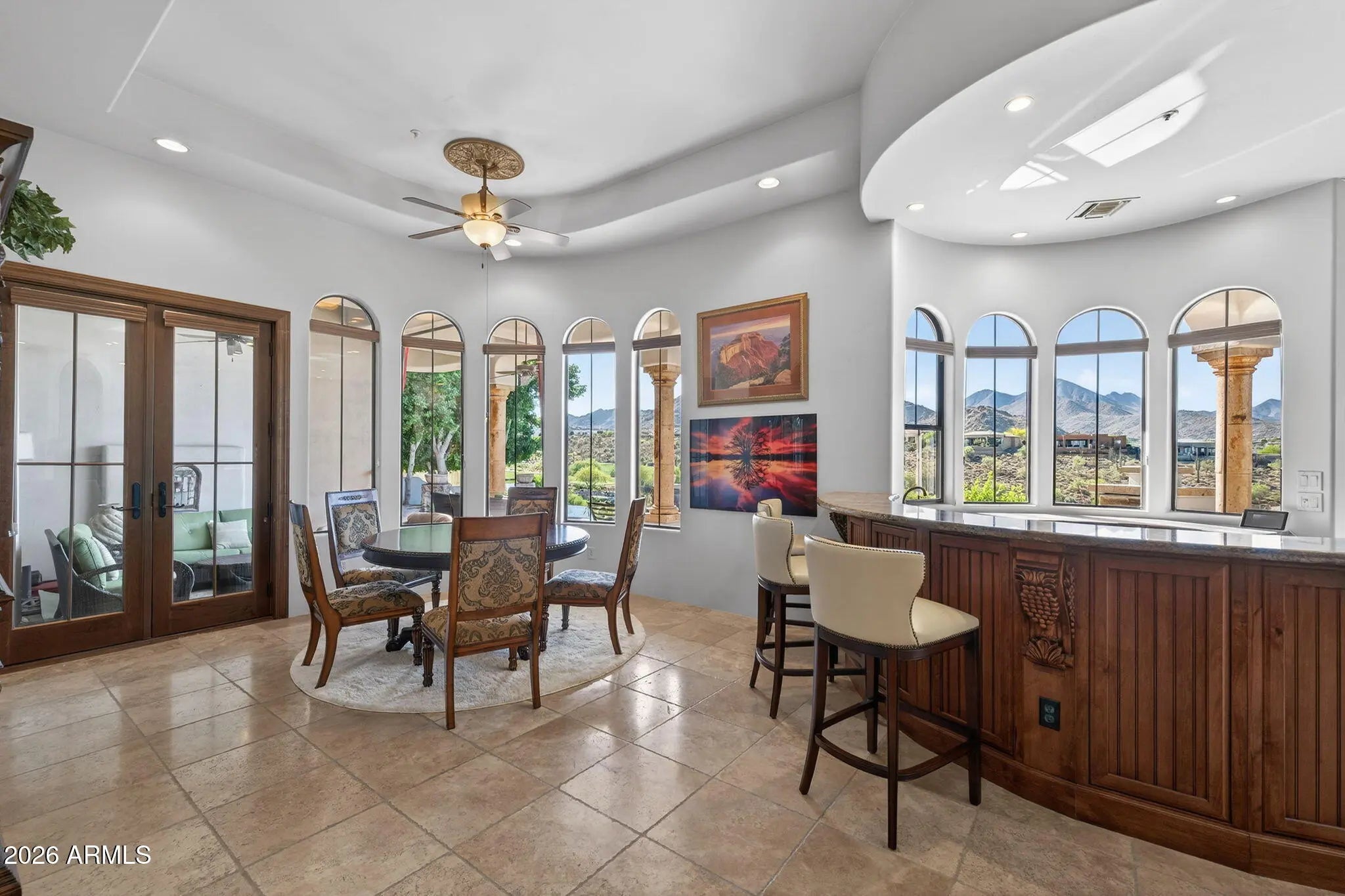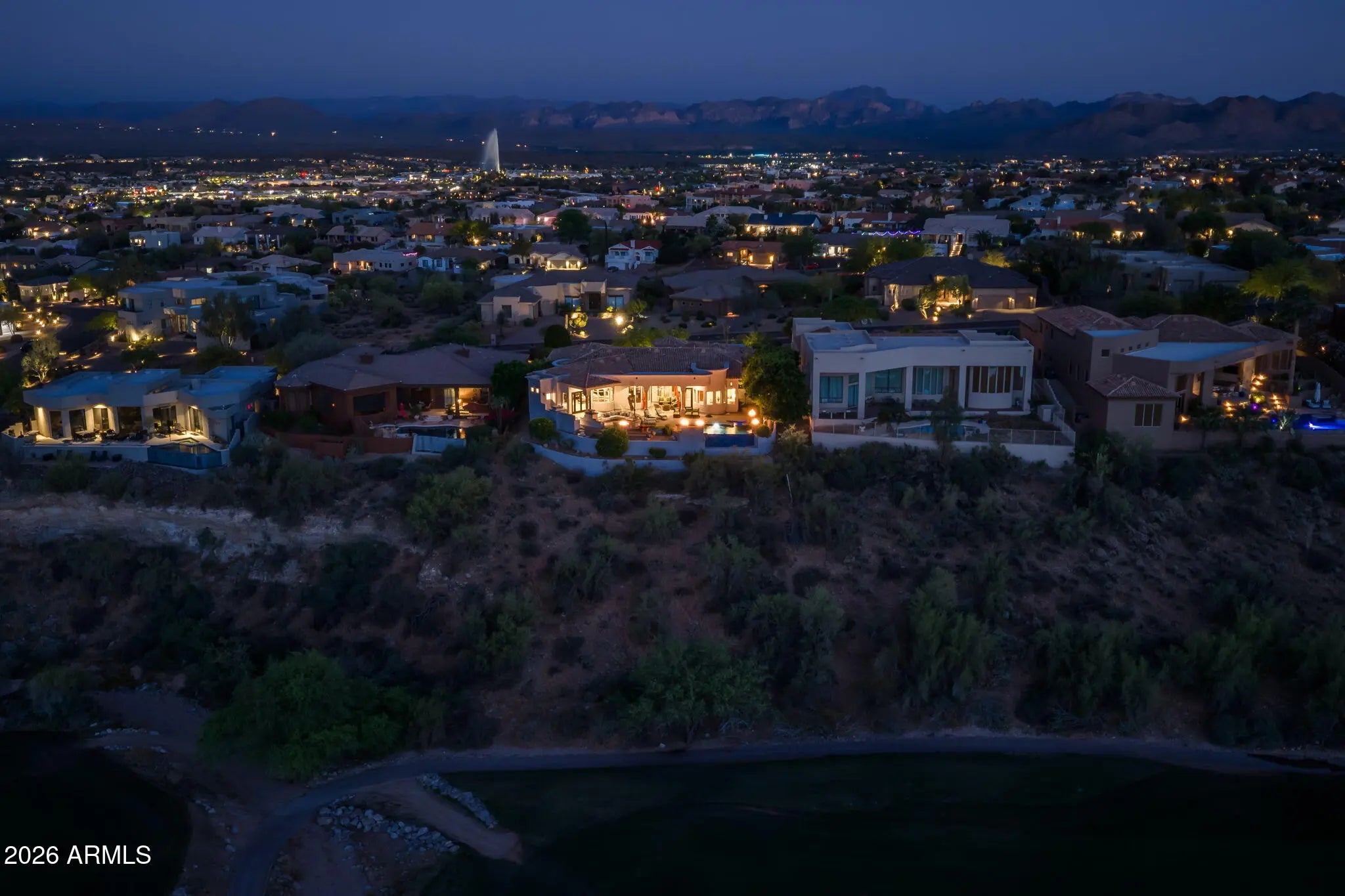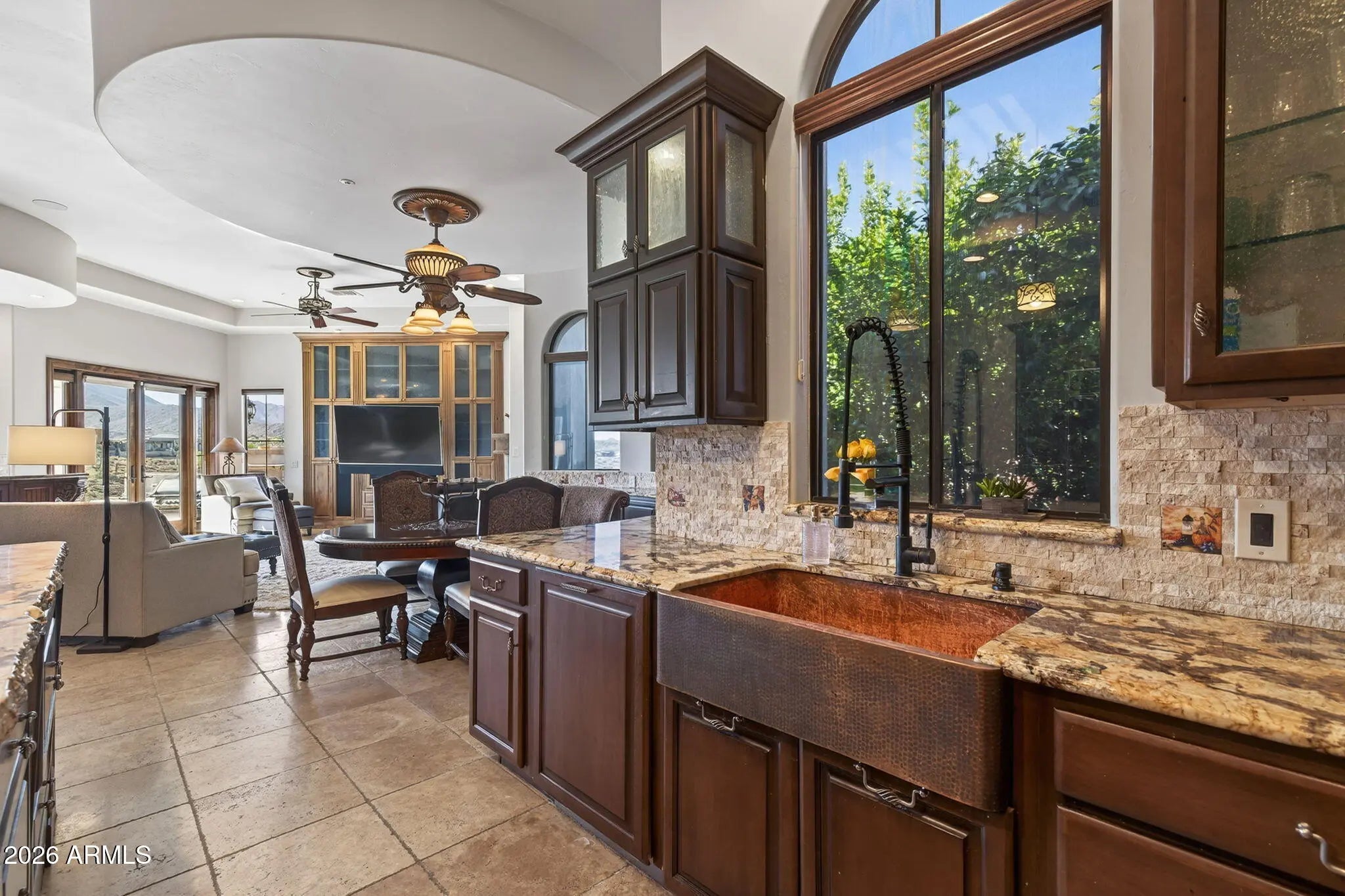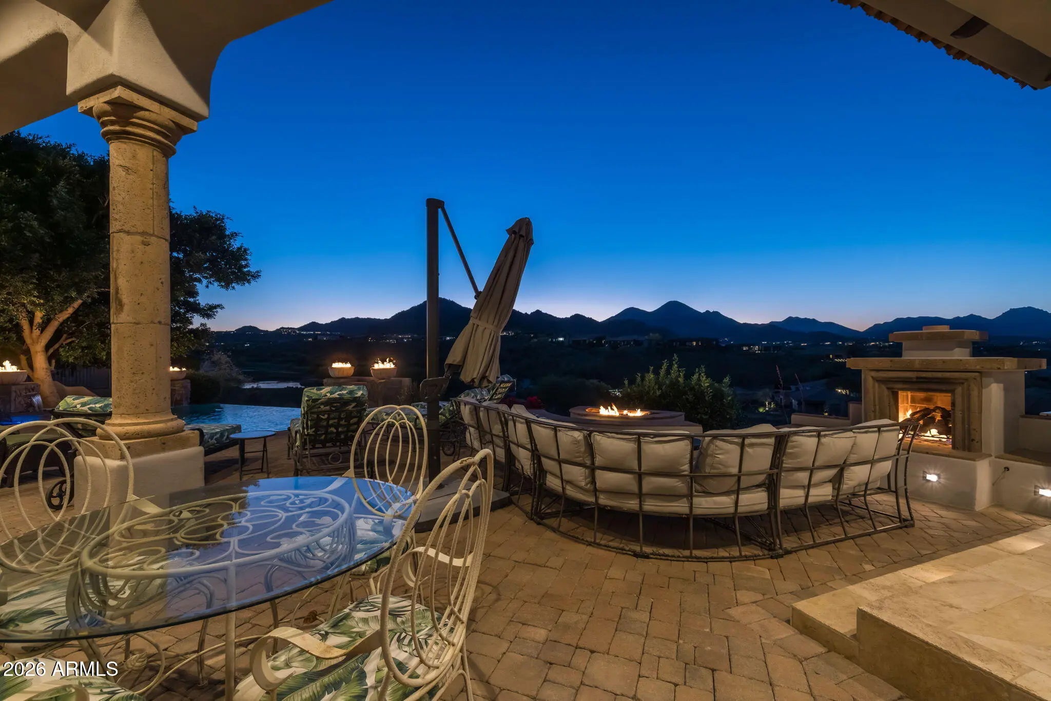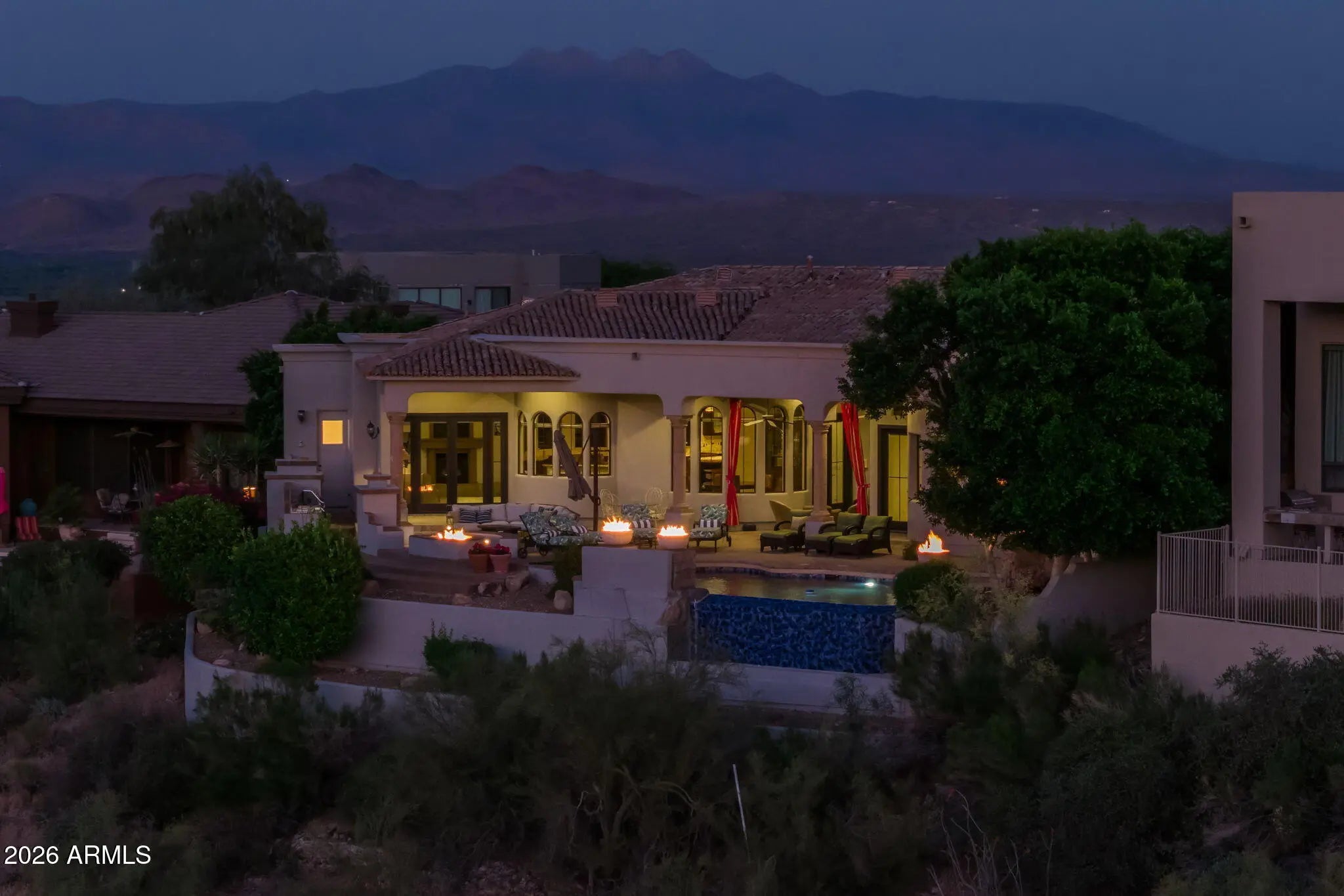 Perched high above the Sunridge Canyon Golf Course, this exceptional single-level custom residence captures sweeping, unobstructed views of two tranquil ponds, a cascading waterfall, and 180-degree mountain vistas. Thoughtfully designed with three private wings including an attached casita with its own bath--gracefully positioned off a charming courtyard--the home offers both elegance and versatility for refined living. European-inspired finishes are showcased throughout, reflecting meticulous craftsmanship and a commitment to quality without compromise. The chef's kitchen is a true centerpiece, appointed with top-tier appliances, an impressive center island, and an adjoining butler's pantry designed to support both everyday living and elevated entertaining. Click more for more remarks.. The open-concept floor plan flows effortlessly, featuring a curved bar, expansive living and dining areas, and walls of windows that frame the breathtaking surroundings. The primary suite serves as a serene, light-filled retreat, complete with a fireplace, stunning views, and a spa-inspired bath designed for ultimate relaxation. A dedicated guest wing offers exceptional comfort and privacy, including a media room with a service bar and two generously sized en-suite bedrooms. Outdoors, the resort-style backyard is nothing short of extraordinary. Enjoy a heated negative-edge pool and spa accented by gas fire bowls, lush landscaping--including a citrus garden--along with a firepit, outdoor fireplace, and a wood-burning pizza oven. Designed for both intimate evenings and grand entertaining, the setting is enhanced by panoramic golf course and mountain views, all while maintaining complete privacy. Perfectly oriented to capture spectacular sunsets without harsh afternoon sun, the home also includes integrated TV and surround sound systems in both the media room and great room. Representing one of the most distinguished properties in this exclusive enclave of Sunridge Canyon, this residence offers a rare opportunity to experience luxury living at its finest.