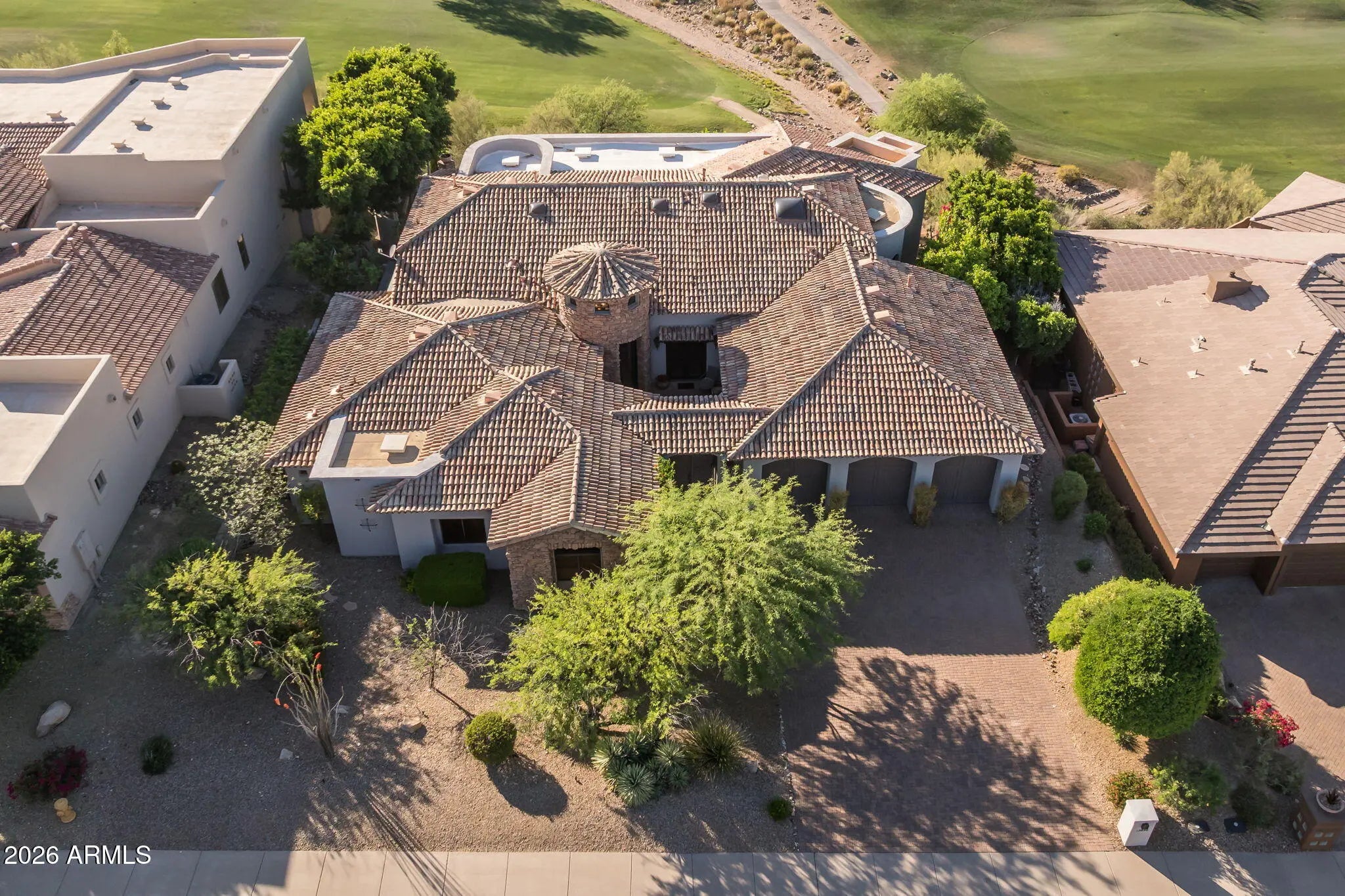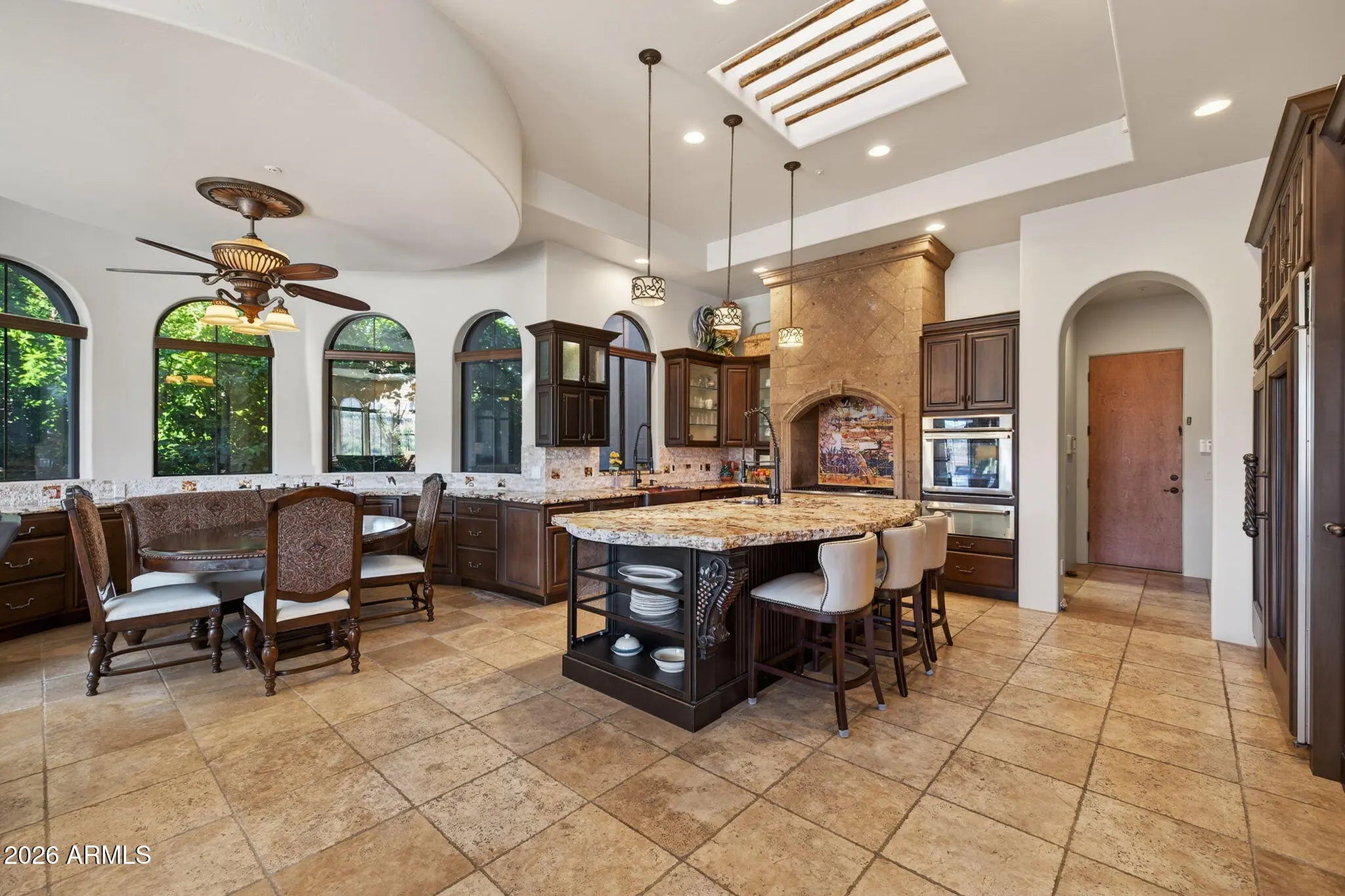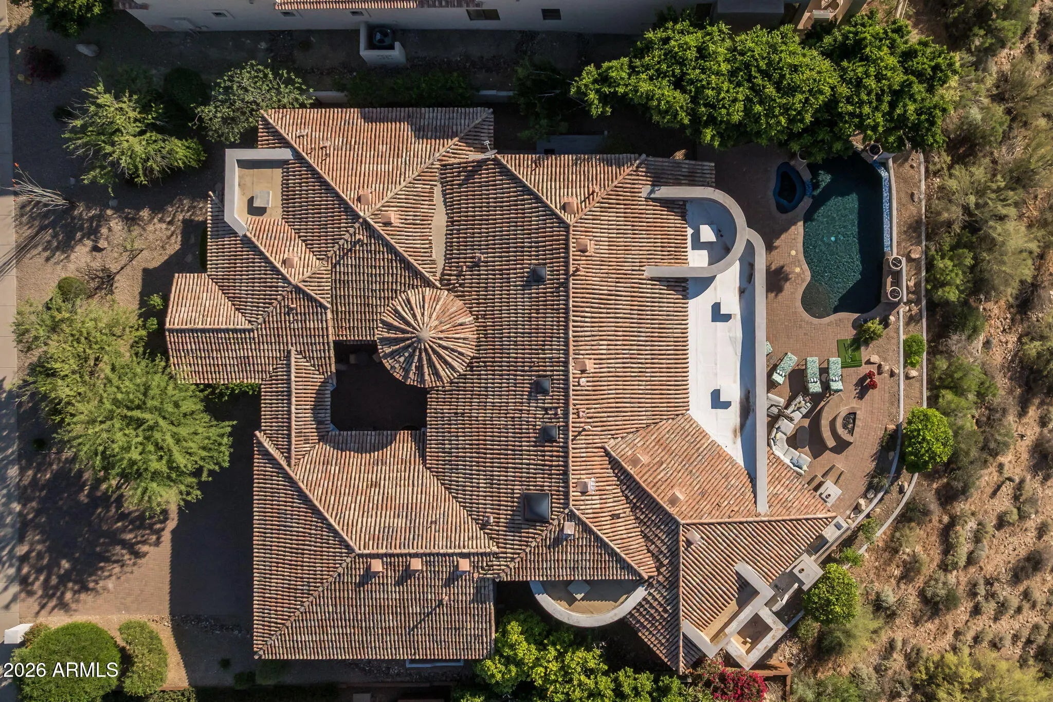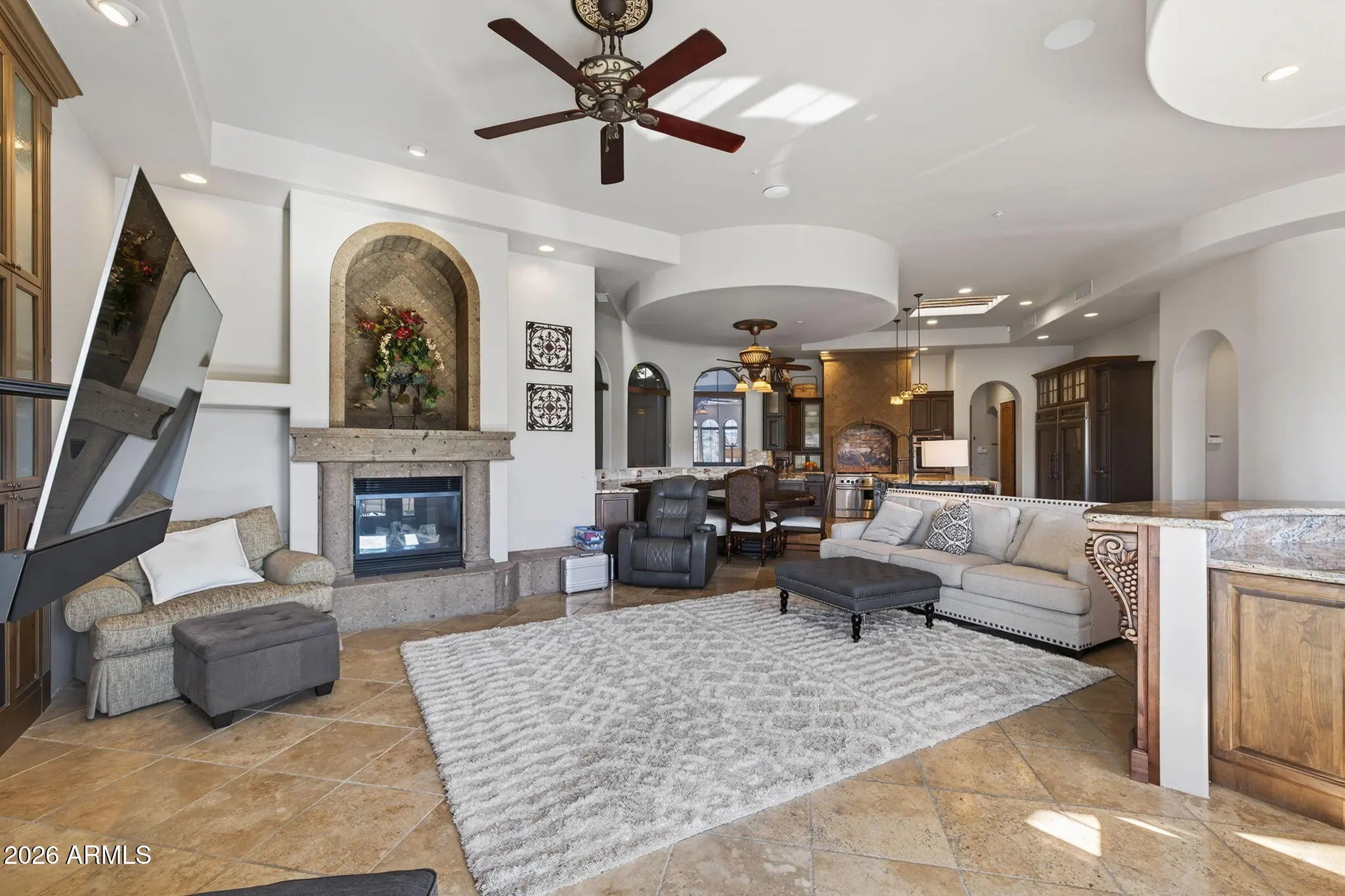 Perched high above the Sunridge Canyon Golf Course, this exceptional single-level custom residence captures sweeping, unobstructed views of two tranquil ponds, a cascading waterfall, and 180-degree mountain vistas. Thoughtfully designed with three private wings including an attached casita with its own bath--gracefully positioned off a charming courtyard--the home offers both elegance and versatility for refined living. European-inspired finishes are showcased throughout, reflecting meticulous craftsmanship and a commitment to quality without compromise. The chef's kitchen is a true centerpiece, appointed with top-tier appliances, an impressive center island, and an adjoining butler's pantry designed to support both everyday living and elevated entertaining. Click more for more remarks.. The open-concept floor plan flows effortlessly, featuring a curved bar, expansive living and dining areas, and walls of windows that frame the breathtaking surroundings. The primary suite serves as a serene, light-filled retreat, complete with a fireplace, stunning views, and a spa-inspired bath designed for ultimate relaxation. A dedicated guest wing offers exceptional comfort and privacy, including a media room with a service bar and two generously sized en-suite bedrooms. Outdoors, the resort-style backyard is nothing short of extraordinary. Enjoy a heated negative-edge pool and spa accented by gas fire bowls, lush landscaping--including a citrus garden--along with a firepit, outdoor fireplace, and a wood-burning pizza oven. Designed for both intimate evenings and grand entertaining, the setting is enhanced by panoramic golf course and mountain views, all while maintaining complete privacy. Perfectly oriented to capture spectacular sunsets without harsh afternoon sun, the home also includes integrated TV and surround sound systems in both the media room and great room. Representing one of the most distinguished properties in this exclusive enclave of Sunridge Canyon, this residence offers a rare opportunity to experience luxury living at its finest.