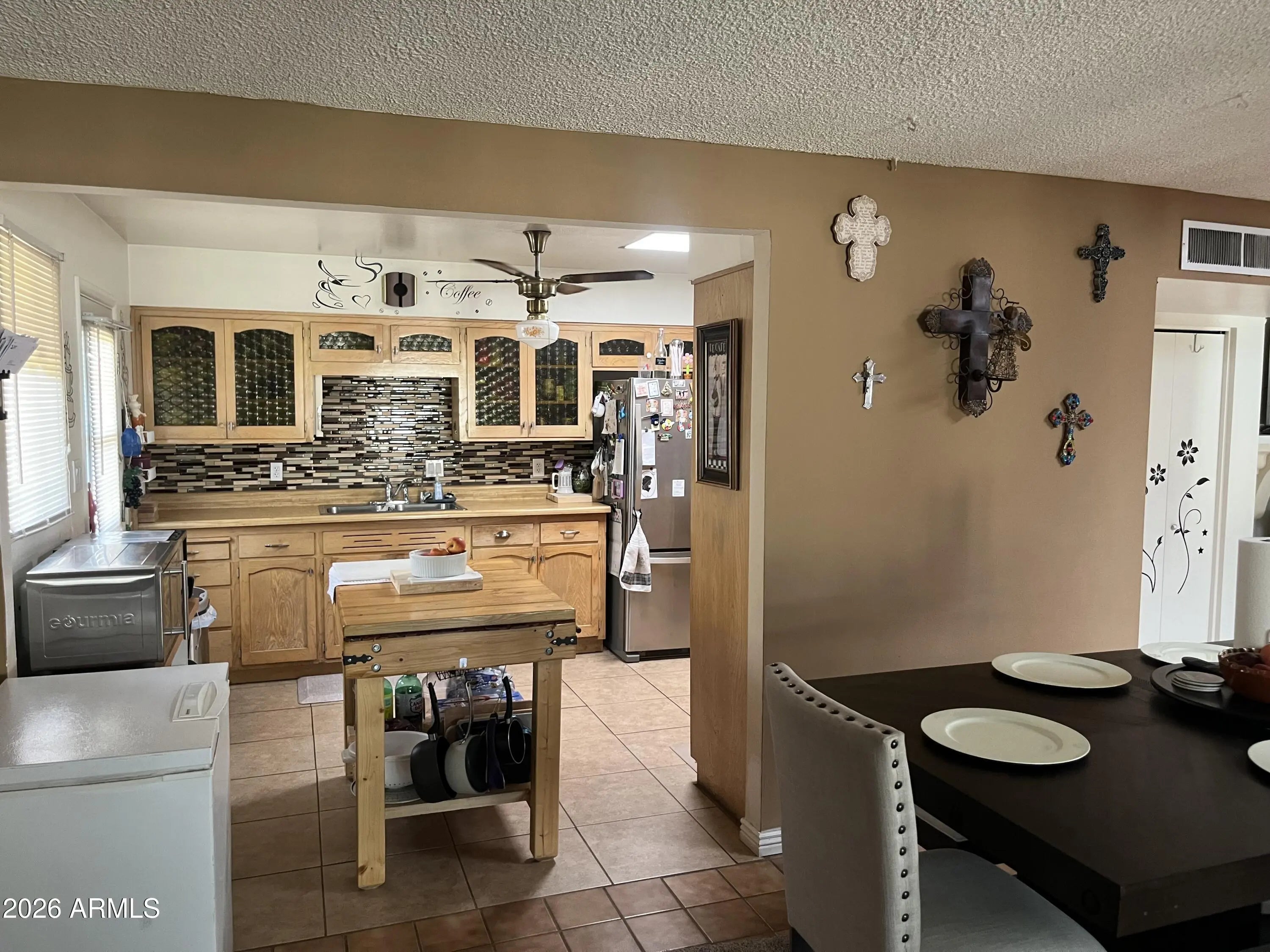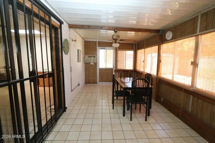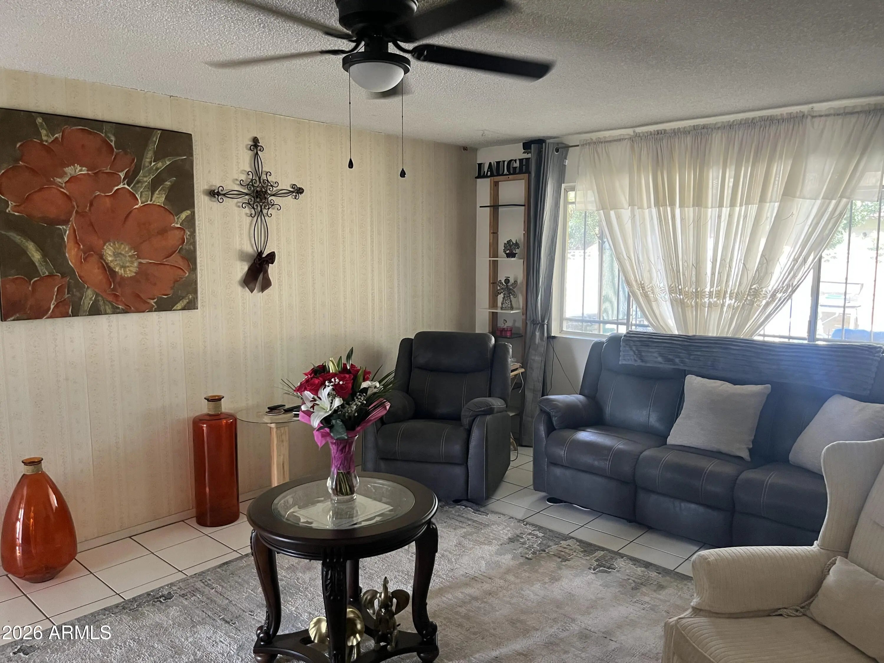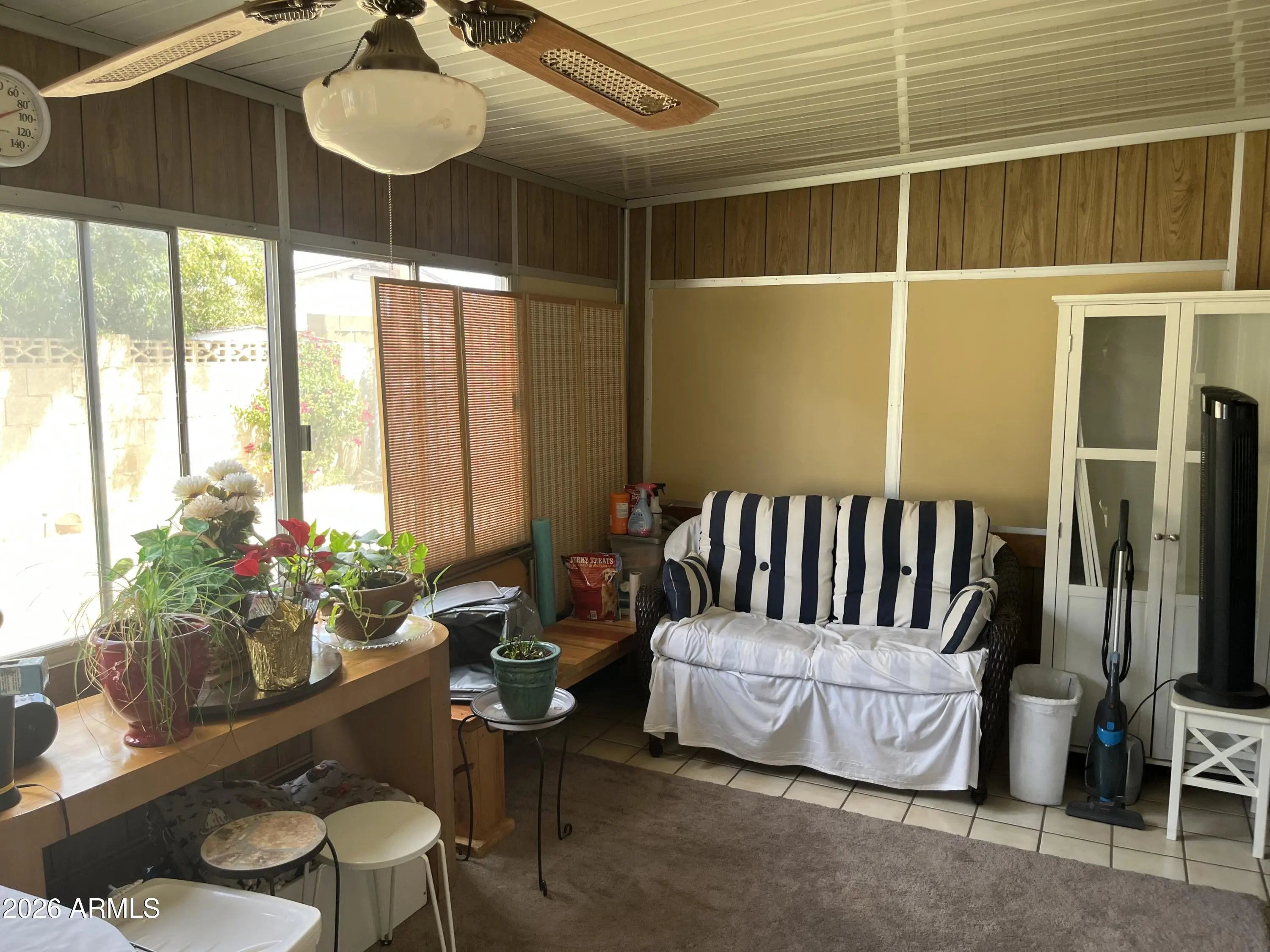 This is the Gem you are searching for. New Roof and HVAC in 2010 and most windows have been replaced! Home has been well maintained and loved by the sellers who are excited for you to move in and keep on loving it. This property is full of retro charm. Tile flooring throughout the entire home. Upon entering the quaint entry you walk into the formal living room with a huge window that looks into the backyard and lends room for a dining table too if you so desire. The huge Family room can also double as a family/dining area. Off of the Family and through the sliding glass door is the enclosed Arizona room that is cooled by its own wall unit and ceiling fan and has access to the backyard. The Kitchen that leads off of the Family/Dining room is gracious in size with enough room for a dinette set. Kitchen has lots of storage and a bonus 220 outlet. Lots of Natural lighting and skylights in the Kitchen, Living room and hall bathroom. Every room has a ceiling fan. Most windows have window shutters and decorative removable bars for added detail. Laundry room is located in a separate building just off of the garage and/or backyard. Huge two-car garage with access from the house and backyard. The mature backyard with fruit trees, beautiful flower shrubs and an outdoor fixed close line are waiting for your touches. NO HOA!! The home is very well maintained...just bring your clothes and furniture and start living.