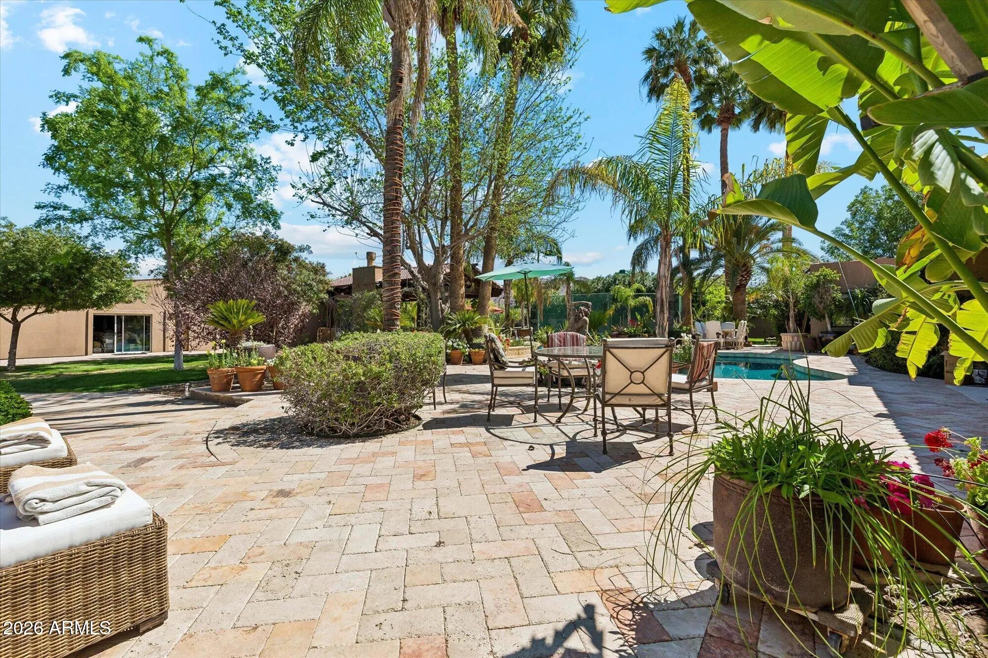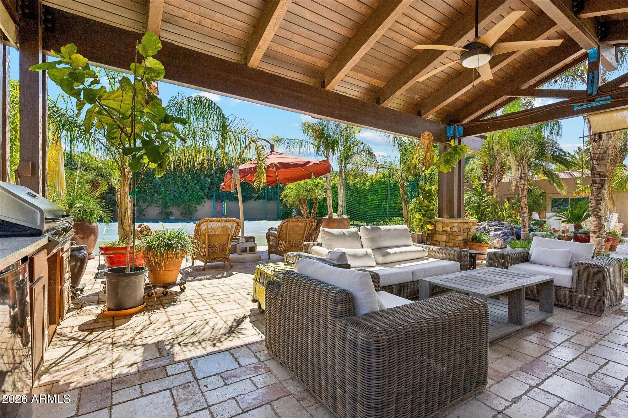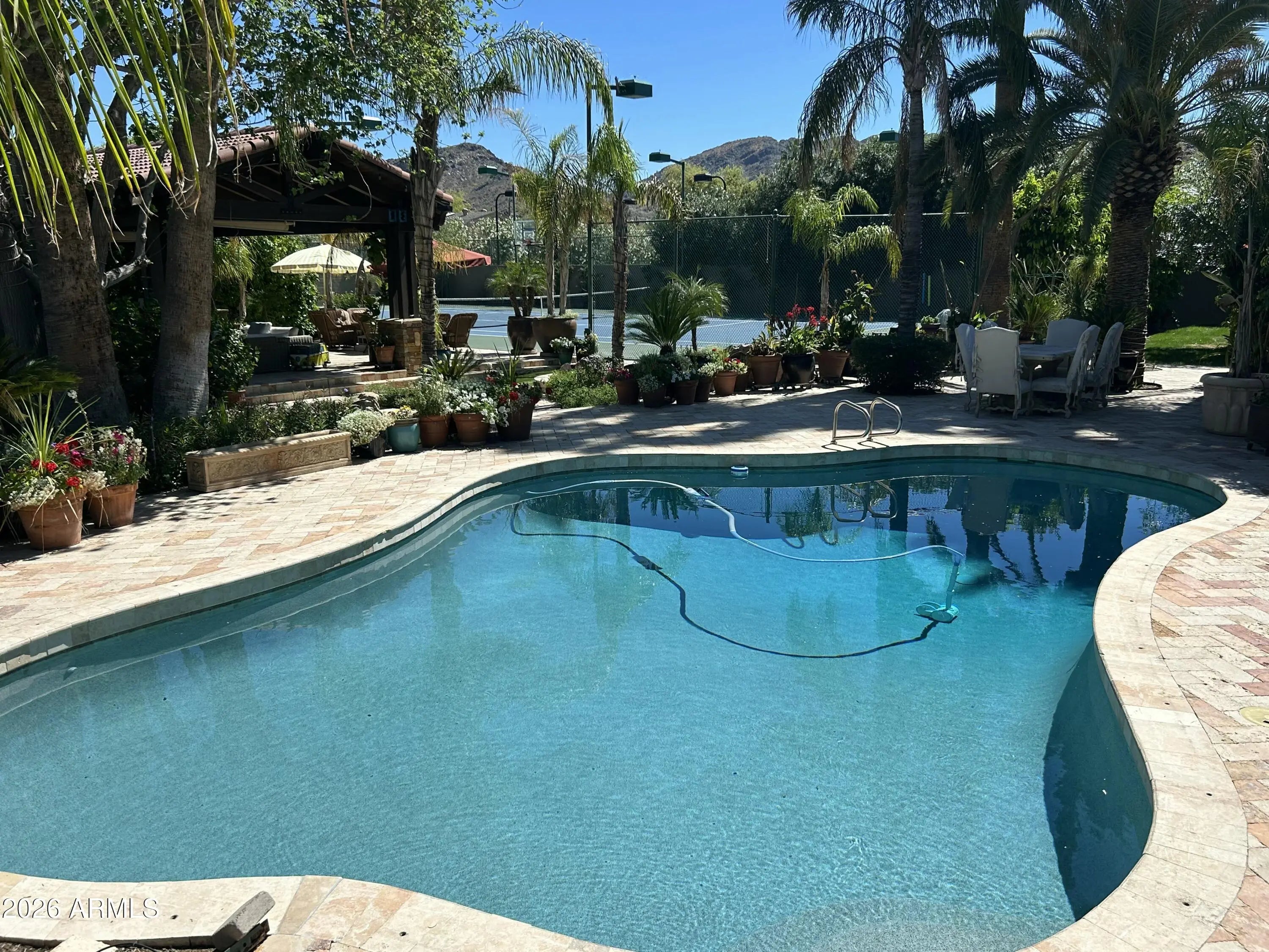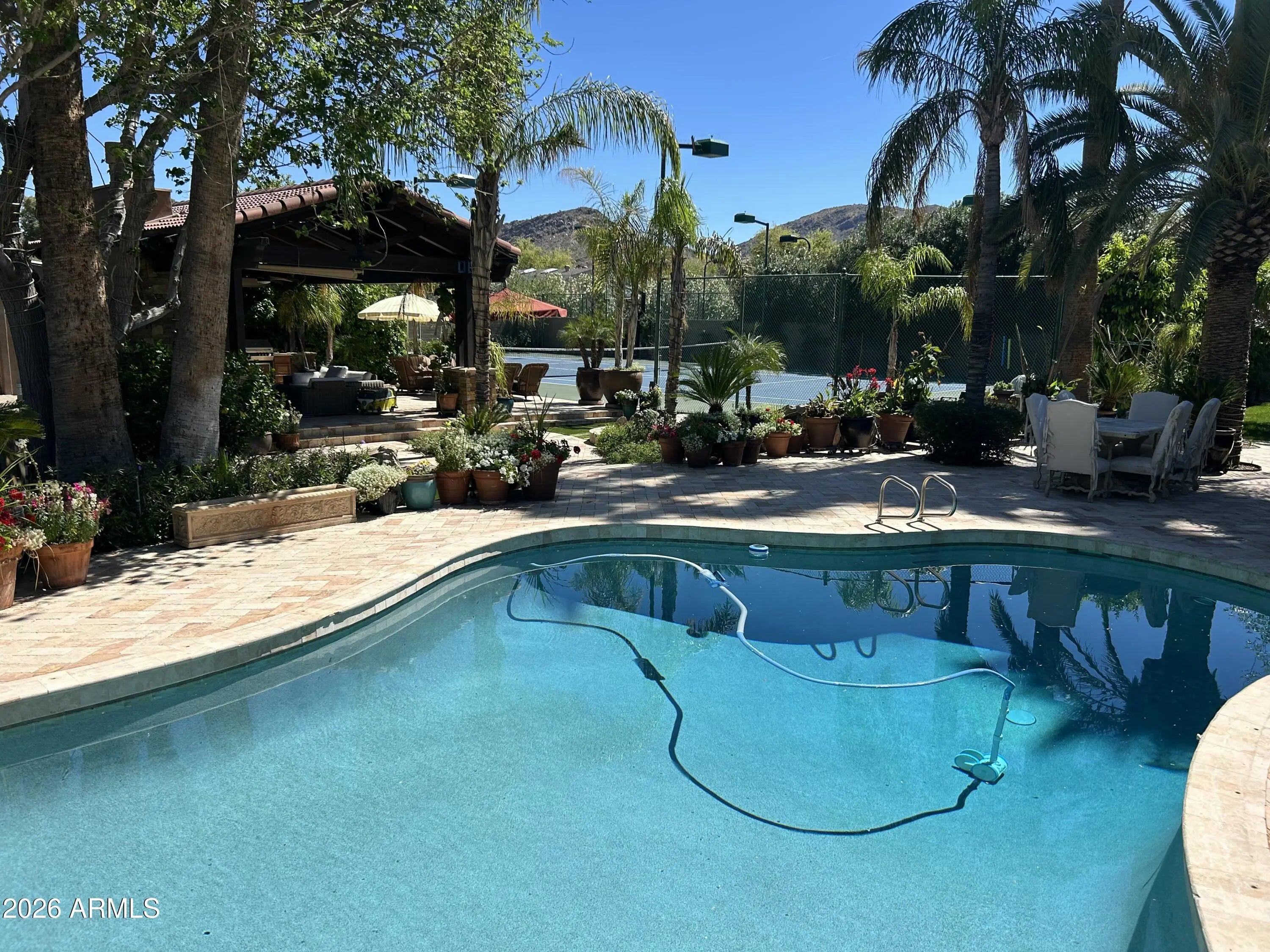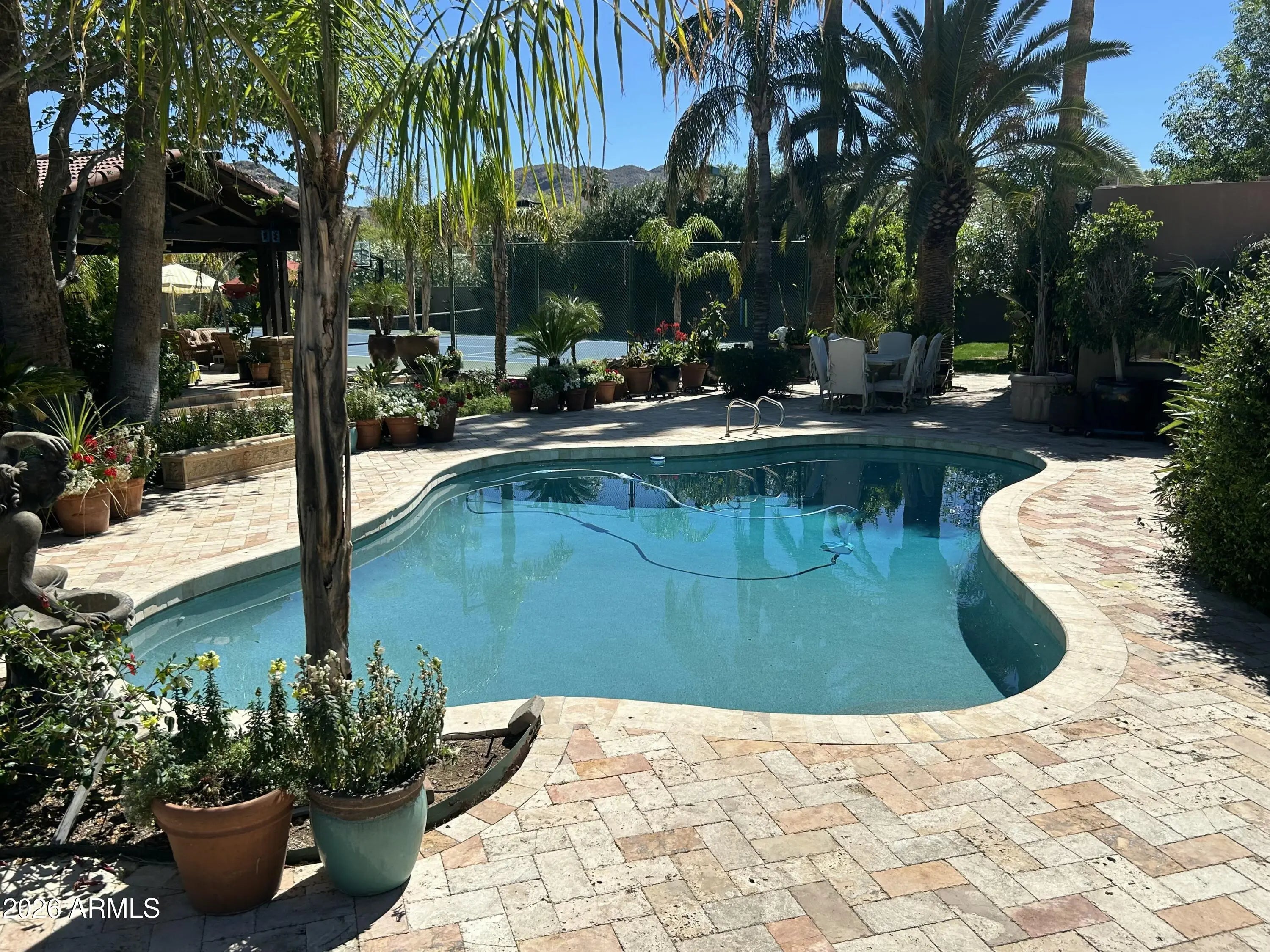 Welcome to this extraordinary estate in greater Paradise Valley, set on a sprawling 1.338-acre lot transformed into a private oasis. Over $800,000 has been invested in lush, mature landscaping featuring stunning date palms that create unmatched privacy and beauty. Inside, a grand open floor plan offers seamless flow and effortless entertaining. The property also features a massive detached guest house with an attached oversized RV garage, plus a resort-style backyard complete with a sparkling pool, a custom 36-foot stone ramada, dramatic waterfall, outdoor kitchen, tennis and basketball courts, and a covered patio with a fireplace overlooking it all. A rare opportunity to own a truly one-of-a-kind luxury retreat.