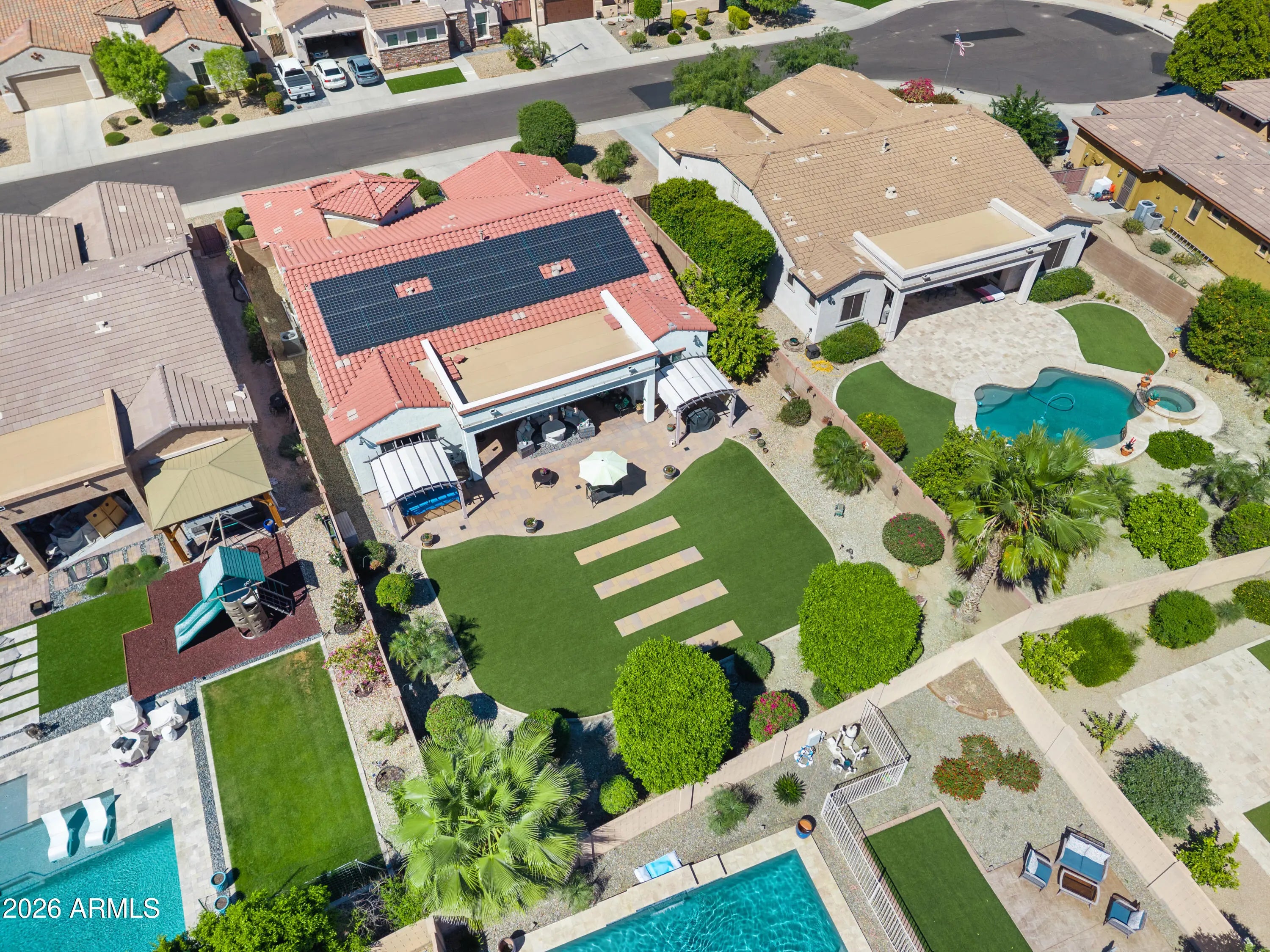 Welcome to the highly sought after Palm Valley area in Goodyear! This stunning home with 3 bedrooms 2.5 baths that sits on an amazing landscaped cul-de-sac lot is being offered at a great value by its original owner! The kitchen is a chef's dream with all stainless steel appliances 5 burner gas top stove with warming lamp, new microwave, staggered cabinets and large pantry with a huge granite center island that is an entertainers delight. The kitchen opens into the large great room where everyone will feel included in the festivities. The great room opens up to the enormous beautifully landscaped backyard with extended covered patio, 3 mature fruit trees (lemon, lime and orange) and and private above ground spa. Plenty of room inside for additional entertaining as there's a separate game room with pool table included for all to enjoy. (Game room could be converted to a 3rd car garage or a separate large bedroom) Formal living or dinning area just adjacent to the game room proving even more area to hang out with your guests. The primary and other two rooms are split allowing for additional privacy. The primary room (which was extended 2 feet when built) has remote shades separate entrance the to back yard and an amazing private bath that gives the feel of a spa with tons of closet and storage space! The other rooms share a Jack & Jill bathroom with separate toilet and tub area and are nicely sized bedrooms. HVAC and Water heater were replaced in July of 2025, plumbed for reverse osmosis, rain gutters and down spouts, 2 electric sockets in floors of great room, pigeon proofing on roof With so many more upgrades and updates in recent years. This home is being offered with most furniture included - a list of personal items not included will be provided. Don't miss out on this excellent opportunity to own this beautiful home on this amazing lot that is large enough to accommodate a pool and/or casita or what ever your heart my desire. With near by parks and open green space areas allowing for even more open area for you to enjoy!