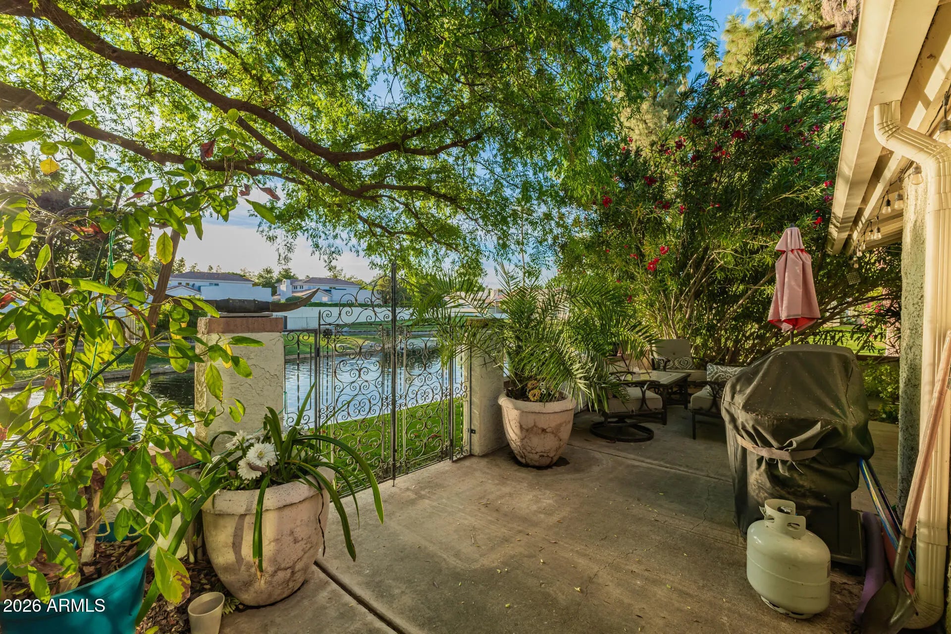 Homes in this gated community rarely come to market, and a waterfront property like this has not been available in decades. Perfectly positioned on a premium lot surrounded by water on two sides, this home offers a truly rare setting with lush, mature landscaping that creates a private, resort-like retreat. This townhome--sharing just one wall--welcomes you with dramatic 14-foot vaulted ceilings and oversized windows that fill the space with natural light and showcase the tranquil surroundings. Beautiful gray-toned wood plank porcelain tile runs throughout the entire home, creating a clean, cohesive, and high-end feel. The kitchen is a chef's delight, featuring solid stone countertops and stainless steel appliances. Step outside to enjoy two private patios, each offering serene water From your heated spa, perfect for relaxing in complete privacy. Additional upgrades include a roof and AC unit both replaced approximately three years ago, as well as luxury porcelain wood style flooring updates in 2015. The community offers resort-style amenities including a pool, spa, and golf course, making this an exceptional opportunity to own a truly special home in an extremely limited community.