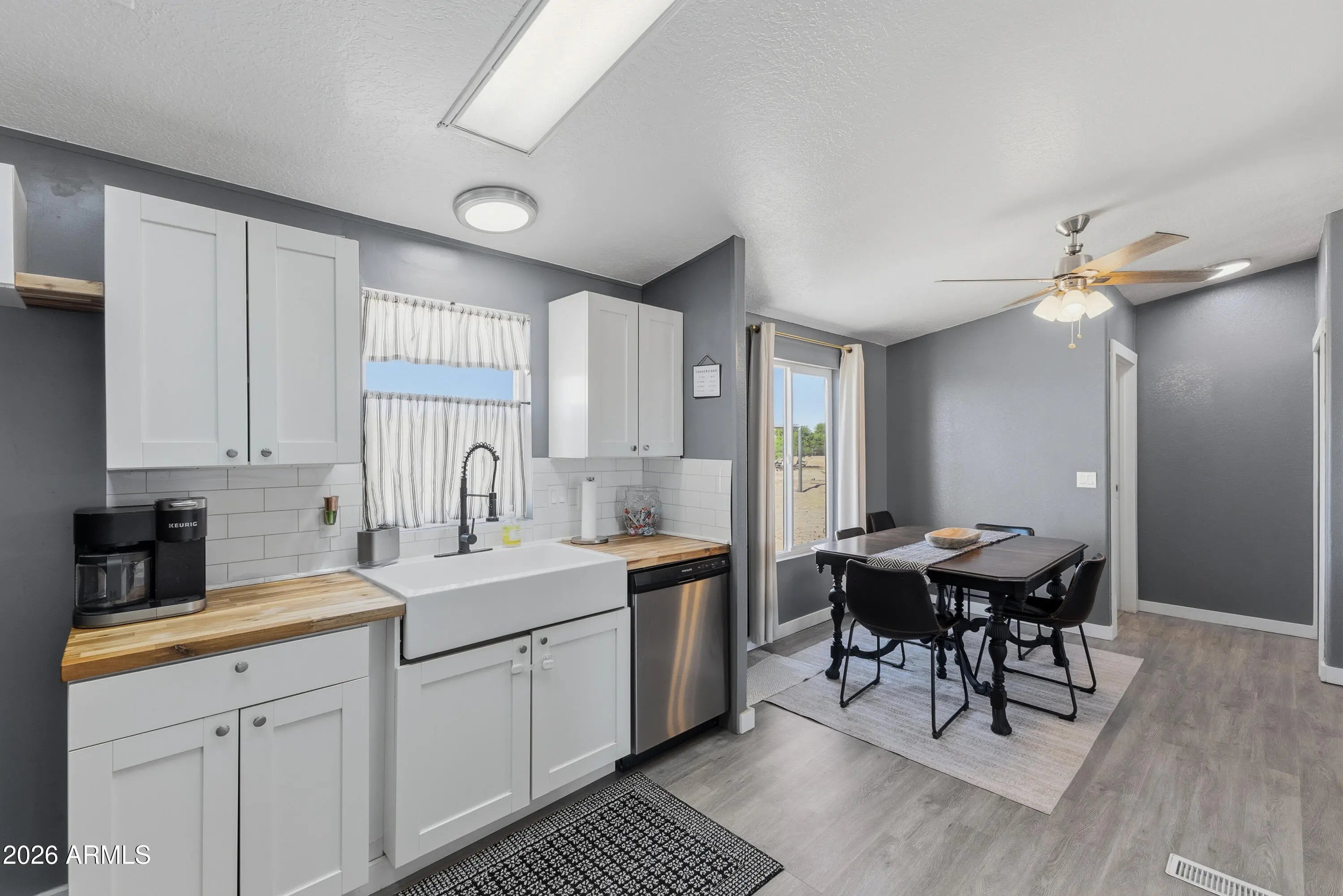 Beautiful 2.5 acre upgraded manufactured home on two separate parcels. Two primary bedrooms with large spacious bathrooms complete with walk in showers. Large living room, eat in kitchen with wood countertops, gorgeous white backsplash and a farm sink. Inside laundry room. Laminate flooring throughout house. Metal roof, shared well with great water. Country living just 15 minutes from all amenities. Absolutely the most amazing views in a great quite location. Plenty of room for all your animals. Build horse pens or an arena.