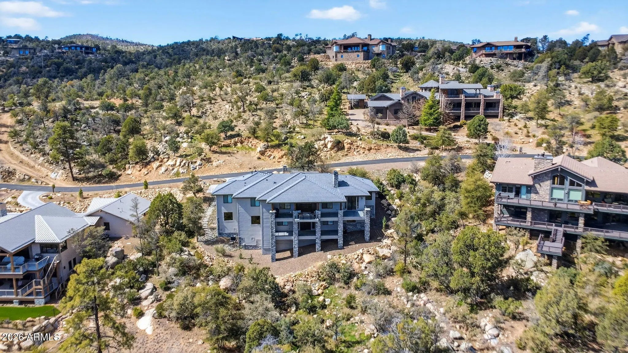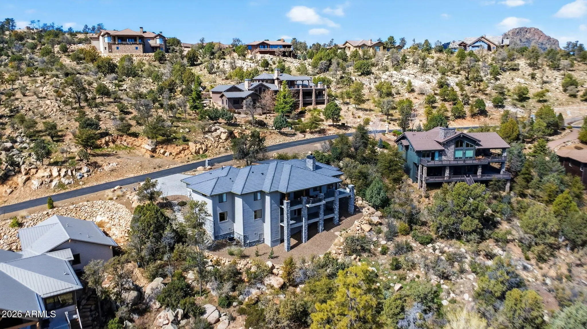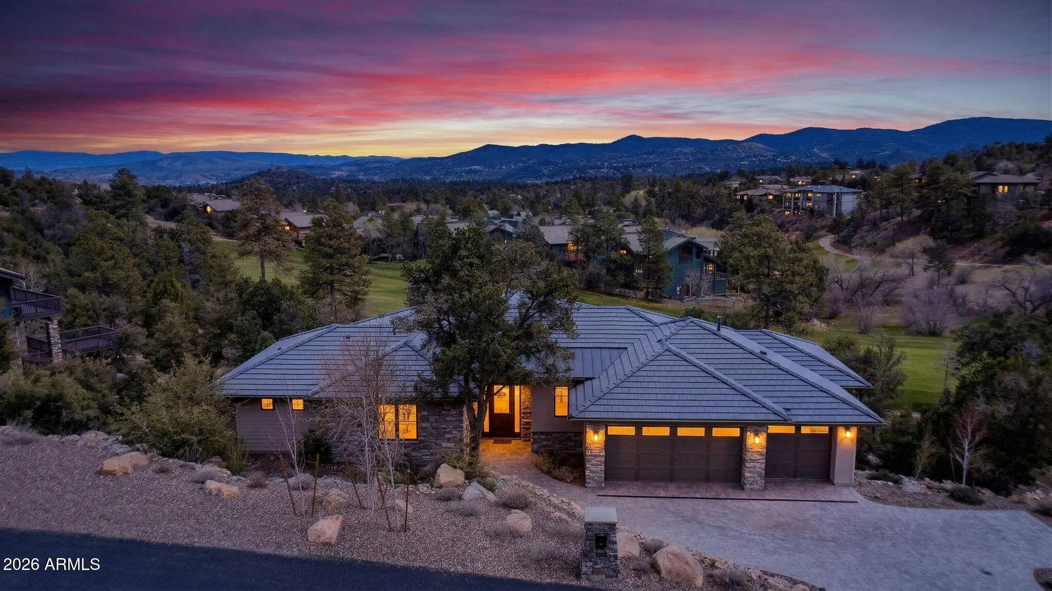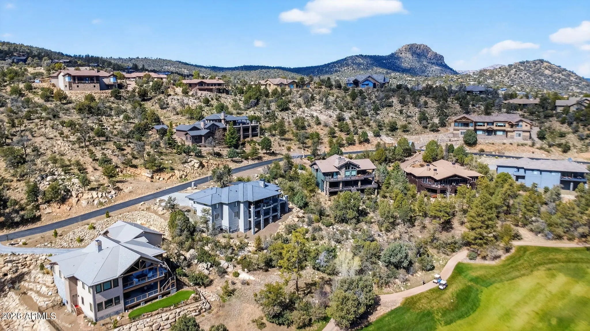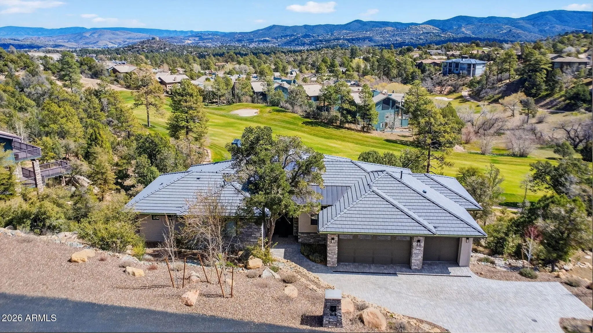 Step inside and take a deep breath -- this is the kind of home that makes you slow down to take it all in! From the double doors to the sweeping deck, every space frames the views: mountains, boulders, trees, and the peaceful sight of Hole #2 at Capital Canyon Club just below. On clear nights the sky goes dark and the Milky Way pops into view -- it feels like your own private retreat, yet downtown Prescott and its energy are just a short drive away. This house was built elegantly for everyday comfort and for sharing good times. The main level offers a Primary Bedroom plus two more bedrooms with walk-in closets, and a cozy den/bonus living area for main level living. Downstairs, you'll find two more bedrooms with walk-in closets and a family room -- great for all to enjoy. Both levels are brighten by lots of natural light and their own large decks, giving you a place to step outside and enjoy the outdoors at all times. Heating and cooling are zoned for extra comfort. If you love to cook, this kitchen will make you smile: Wolf dual-fuel range, pot filler, big island that seats four, built-in wine cooler, Bosch dishwasher, disposal and a large walk-in pantry that with enough outlets for all your appliances. Quartzite and quartz counters finish the space beautifully. The primary suite is a calm, spa-like spot with his-and-hers vanities, a soaking tub, and a generous shower. You will love the tiled walls and chandelier over the free standing tub. Thoughtful touches like motion-sensor lights under the floating vanities and custom closet organizers make daily life easier. Practical things were handled with care: three oversized garage bays with natural light, built-in storage, epoxy flooring and a French drain; a roomy laundry with utility sink and cabinets; two large storage rooms that could be adapted for an elevator. The community is Firewise and the home was built to meet those standards -- HOA inspections keep the neighborhood compliant with the Firewise requirements. Club membership at Capital Canyon Club is optional and the clubhouse is a short distance away. This home whispers calm, elegance, nature home where you can watch wildlife, host friends on a deck for sunset, and still be close to Prescott's shops and restaurants -- this is the one for you.