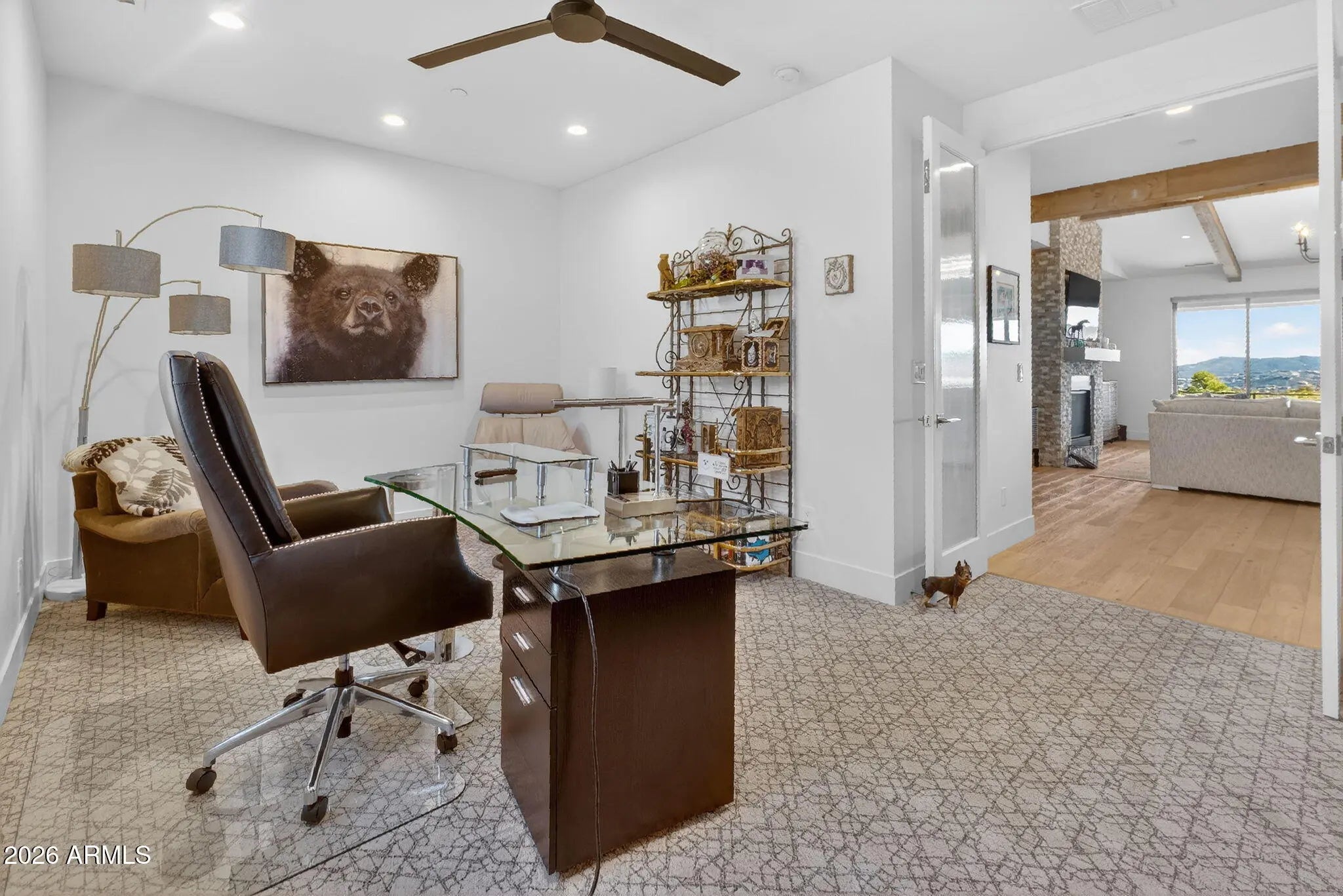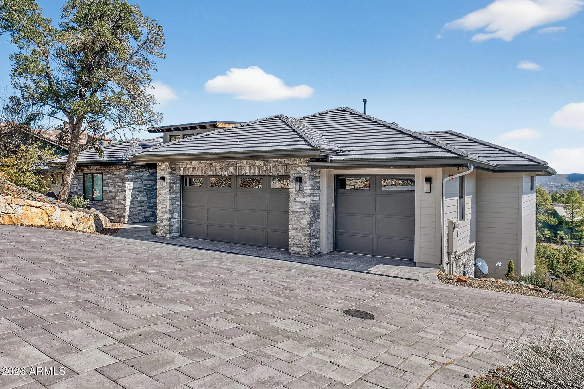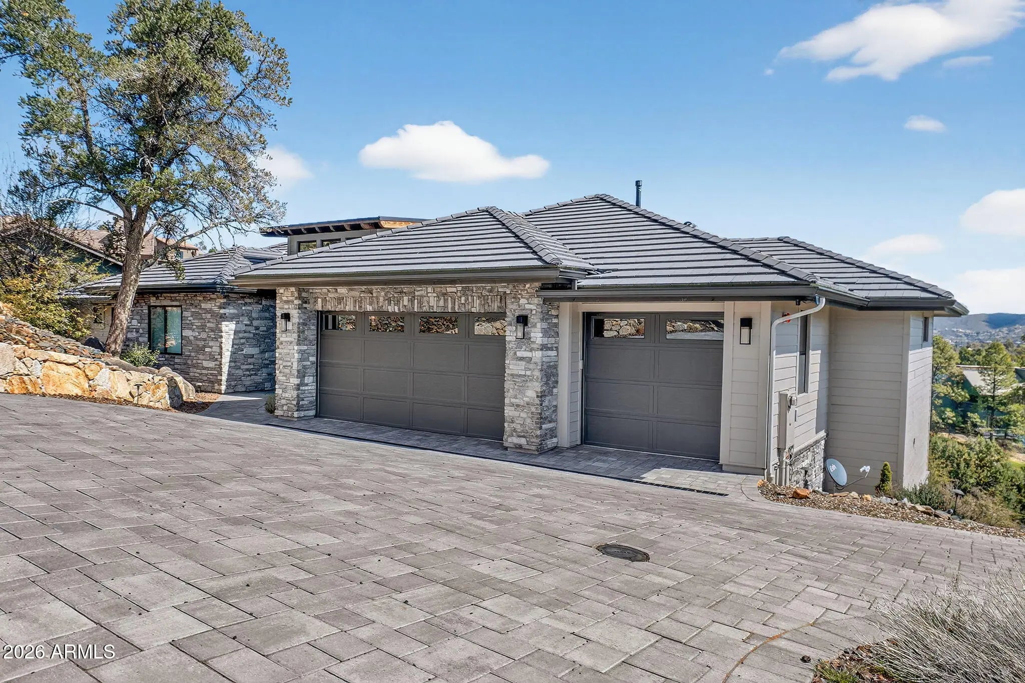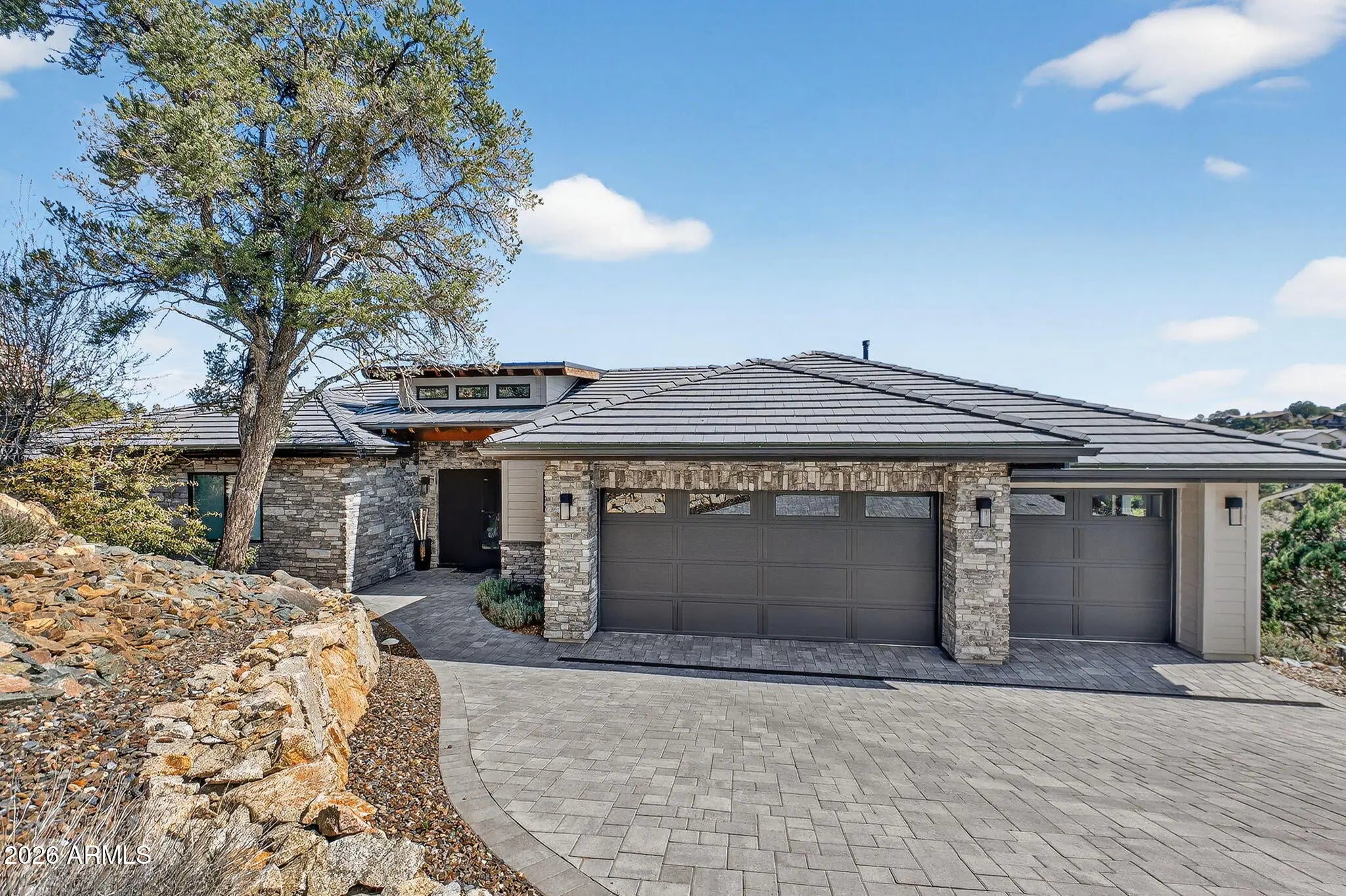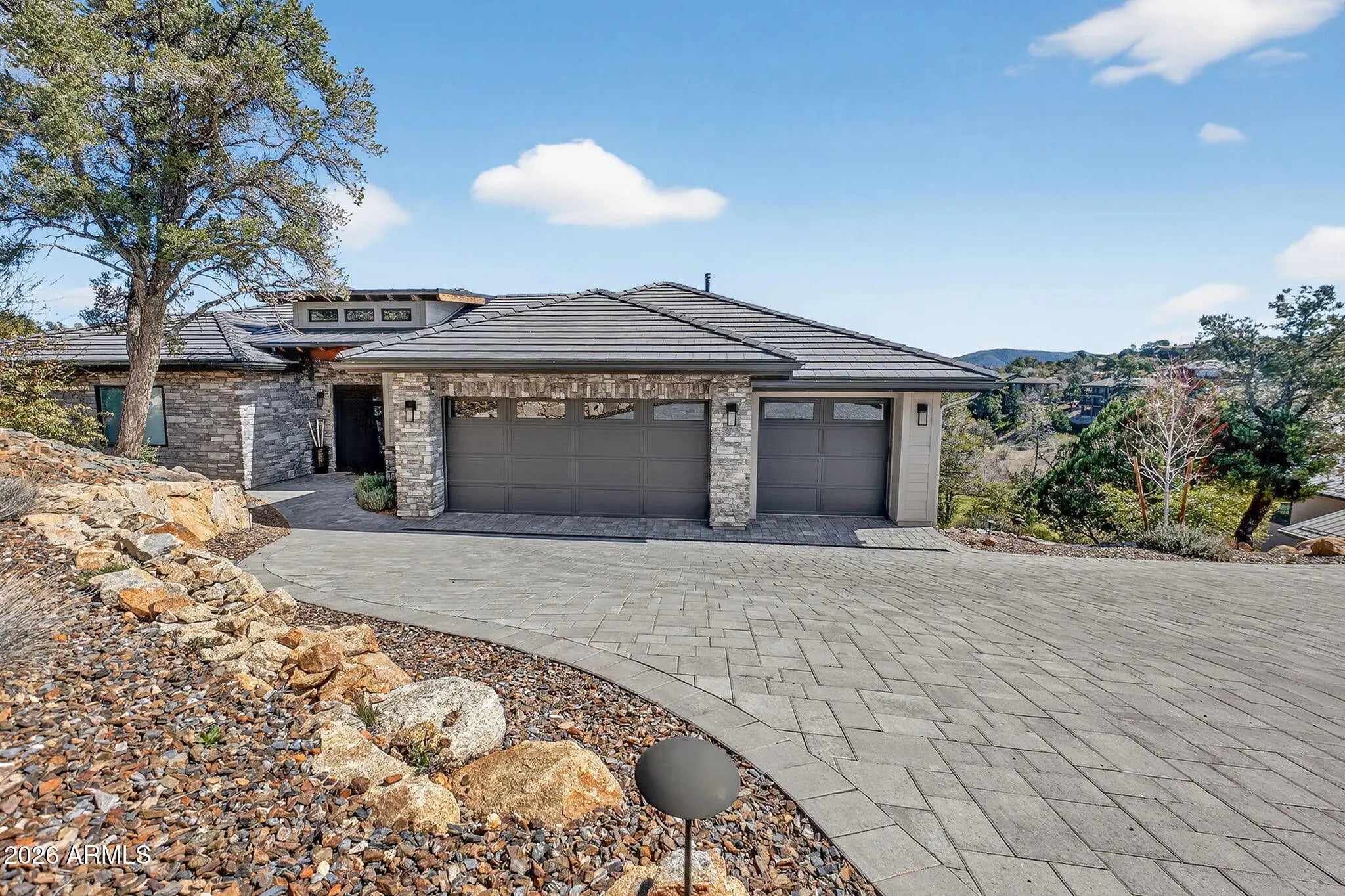 Step inside and take a deep breath -- this is the kind of home that makes you slow down to take it all in! From the double doors to the sweeping deck, every space frames the views: mountains, boulders, trees, and the peaceful sight of Hole #2 at Capital Canyon Club just below. On clear nights the sky goes dark and the Milky Way pops into view -- it feels like your own private retreat, yet downtown Prescott and its energy are just a short drive away. This house was built elegantly for everyday comfort and for sharing good times. The main level offers a Primary Bedroom plus two more bedrooms with walk-in closets, and a cozy den/bonus living area for main level living. Downstairs, you'll find two more bedrooms with walk-in closets and a family room -- great for all to enjoy. Both levels are brighten by lots of natural light and their own large decks, giving you a place to step outside and enjoy the outdoors at all times. Heating and cooling are zoned for extra comfort. If you love to cook, this kitchen will make you smile: Wolf dual-fuel range, pot filler, big island that seats four, built-in wine cooler, Bosch dishwasher, disposal and a large walk-in pantry that with enough outlets for all your appliances. Quartzite and quartz counters finish the space beautifully. The primary suite is a calm, spa-like spot with his-and-hers vanities, a soaking tub, and a generous shower. You will love the tiled walls and chandelier over the free standing tub. Thoughtful touches like motion-sensor lights under the floating vanities and custom closet organizers make daily life easier. Practical things were handled with care: three oversized garage bays with natural light, built-in storage, epoxy flooring and a French drain; a roomy laundry with utility sink and cabinets; two large storage rooms that could be adapted for an elevator. The community is Firewise and the home was built to meet those standards -- HOA inspections keep the neighborhood compliant with the Firewise requirements. Club membership at Capital Canyon Club is optional and the clubhouse is a short distance away. This home whispers calm, elegance, nature home where you can watch wildlife, host friends on a deck for sunset, and still be close to Prescott's shops and restaurants -- this is the one for you.