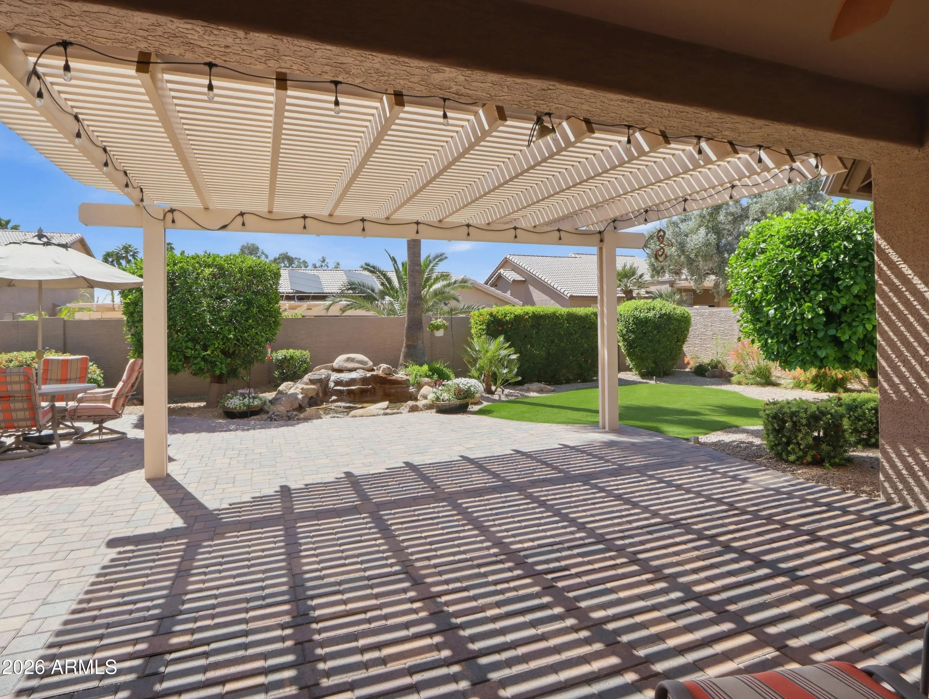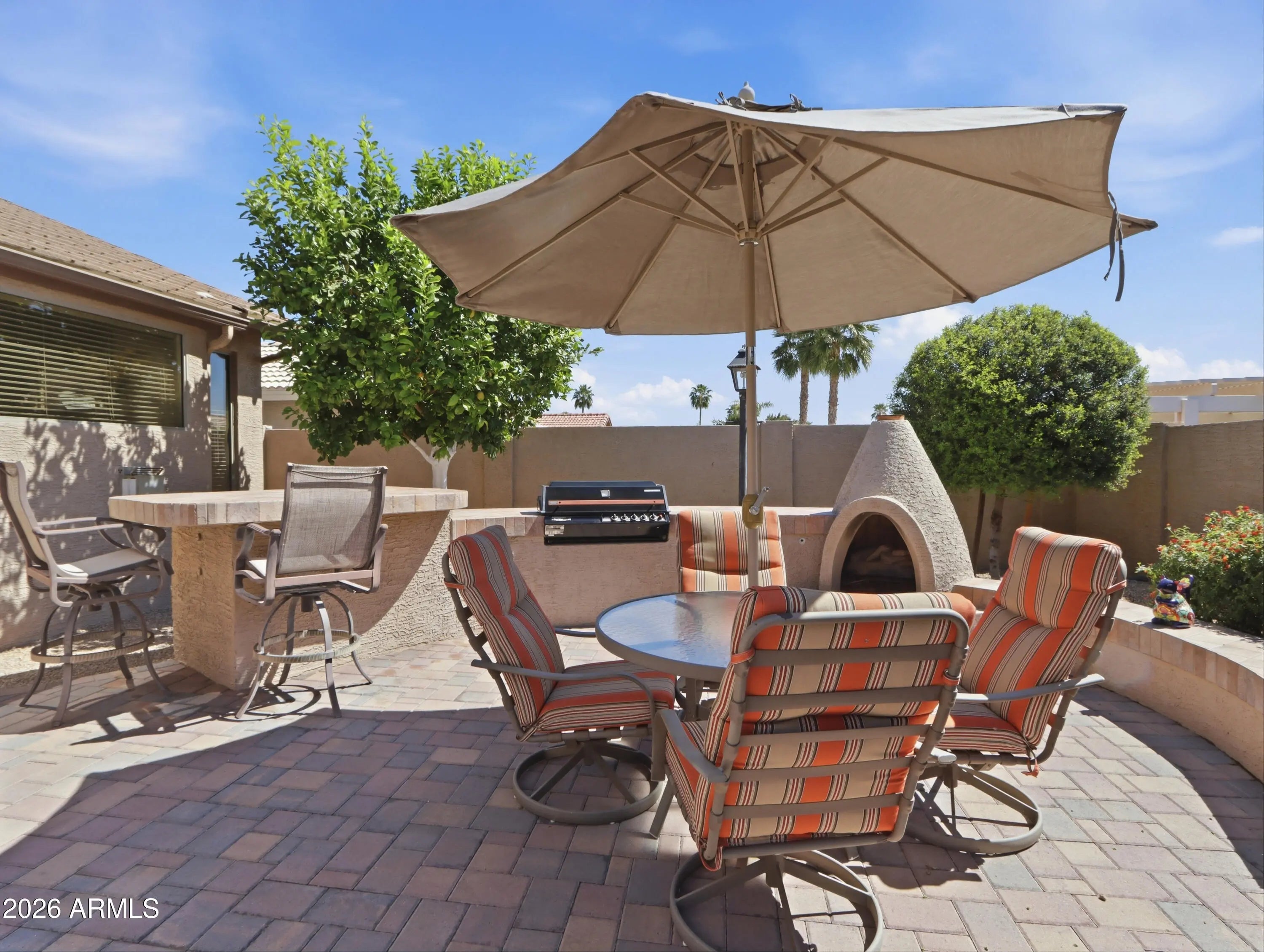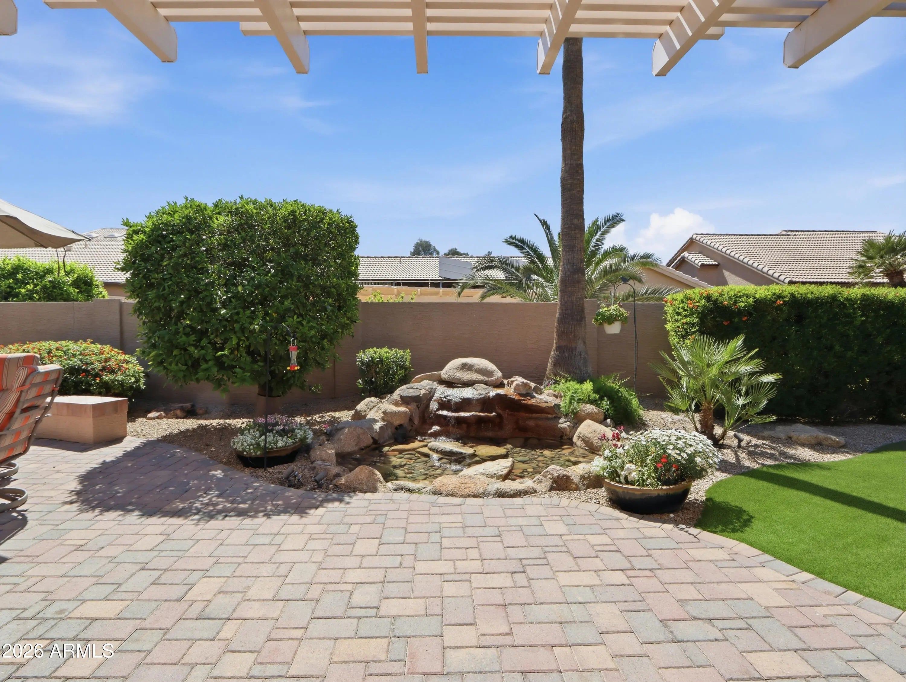 This exceptional three-bedroom Sonoma model in Eagles Nest at PebbleCreek blends elegance, comfort, and resort-style living. A striking front elevation, paver driveway, and welcoming entry lead to light-filled interiors with soaring ceilings and seamless indoor-outdoor flow. The updated kitchen features granite countertops, refreshed cabinetry, and ample storage, opening to spacious living areas with a custom rock-accented fireplace and walls of glass. The private primary suite offers a sitting area, spa-inspired bath, and walk-in closet, while two additional bedrooms add flexibility. Outside, a south-facing backyard oasis features a paver patio, water feature, BBQ, outdoor fireplace, and mature citrus trees--perfect for relaxing or entertaining. This particular Sonoma model presents a rare opportunity to own an exceptional home in the highly sought-after Eagles Nest at PebbleCreek, an award-winning resort community. Thoughtfully upgraded and meticulously maintained, this residence offers the perfect blend of refined comfort and effortless resort-style living. From the moment you arrive, the striking front elevation sets the tone for what awaits. Elegant driveway pavers, a spacious three-car garage, and a welcoming entryway create a memorable first impression. Step inside to soaring ceilings and an abundance of natural light that immediately draws your eye through the home to the beautifully designed, resort-style backyard beyond. The grand living space seamlessly blends indoor and outdoor living, opening to expansive views of the south-facing backyard--your own private tropical oasis. Anchored by a stunning water feature, the setting evokes a sense of tranquility and offers a peaceful retreat right at home. The expansive covered patio serves as a true centerpiece, ideal for relaxing, dining, or entertaining while enjoying Arizona's year-round sunshine. As the day winds down, illuminate the gas lanterns and gather around the outdoor fireplace to take in breathtaking sunset views--creating the perfect setting for cozy desert evenings. Inside, fresh interior paint, modern lighting, and ceiling fans throughout create a stylish, truly move-in-ready environment. The thoughtfully updated kitchen features refreshed cabinetry, granite countertops, and abundant storage, all within an open layout that flows effortlessly into the main living area--perfect for both everyday living and entertaining. The adjacent family room is filled with natural light from tall glass doors that open to the patio, offering a warm and inviting space for gatherings. A gas fireplace with custom rock accents serves as a beautiful focal point, enhancing the home's cozy and welcoming ambiance. The luxurious primary suite is a true retreat, complete with a comfortable sitting area and oversized windows with plantation shutters. The spa-inspired ensuite bath features a large tile-surround shower, dual-sink vanity, a dedicated makeup space, and a custom walk-in closet with extensive built-ins--delivering both elegance and functionality. The second bedroom is generously sized with its own walk-in closet, while the third bedroom offers flexible space ideal for guests, hobbies, or a home office. Both are conveniently served by a well-appointed hallway bath with a tub. Step outside once more to the resort-style backyard--truly the showstopper of the home. With ideal southern exposure, the extended custom paver patio, tranquil water feature, and mature, fruit-bearing citrus trees--including lemon, orange, and grapefruit--create a setting that is as beautiful as it is enjoyable. A built-in bar and BBQ grill elevate the outdoor experience, making it perfect for entertaining or simply unwinding in your own private retreat. Additional highlights include a three-car garage with dedicated golf cart parking, built-in storage cabinetry, and a workbench--ideal for hobbies or projects. Rain gutters add an extra layer of convenience and peace of mind. Beyond the home itself, enjoy a friendly and welcoming neighborhood that fosters connection, activity, and the very best of resort-style living.